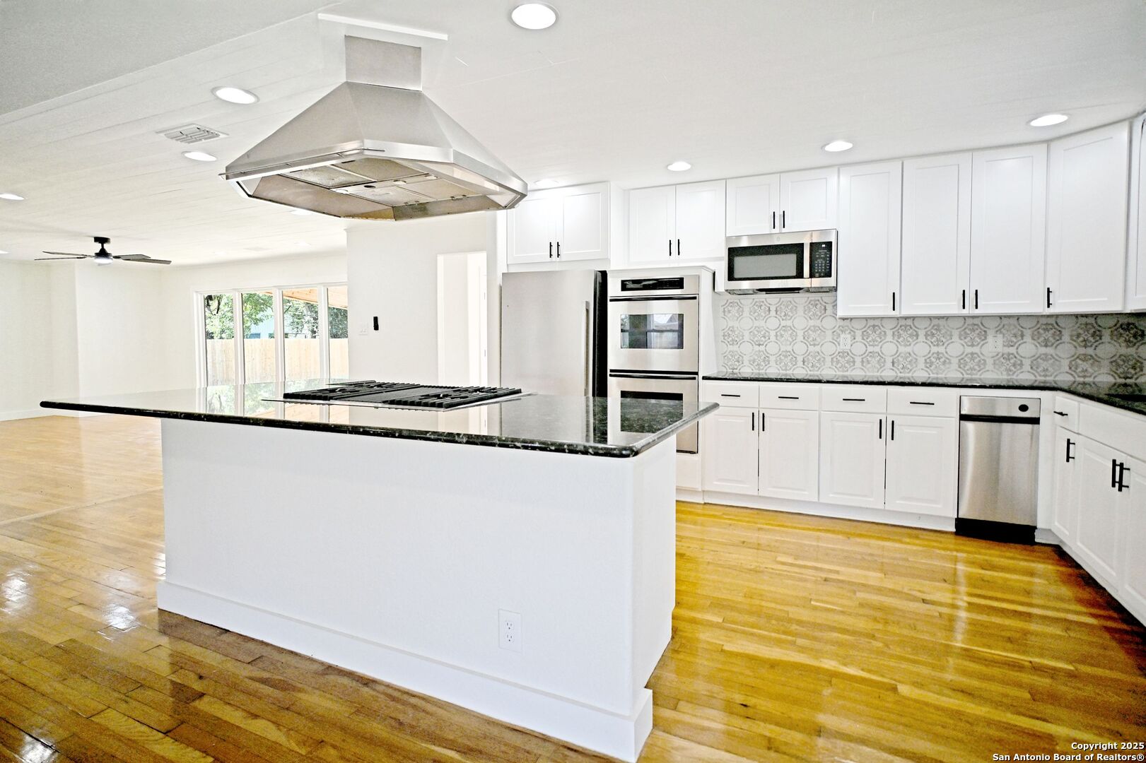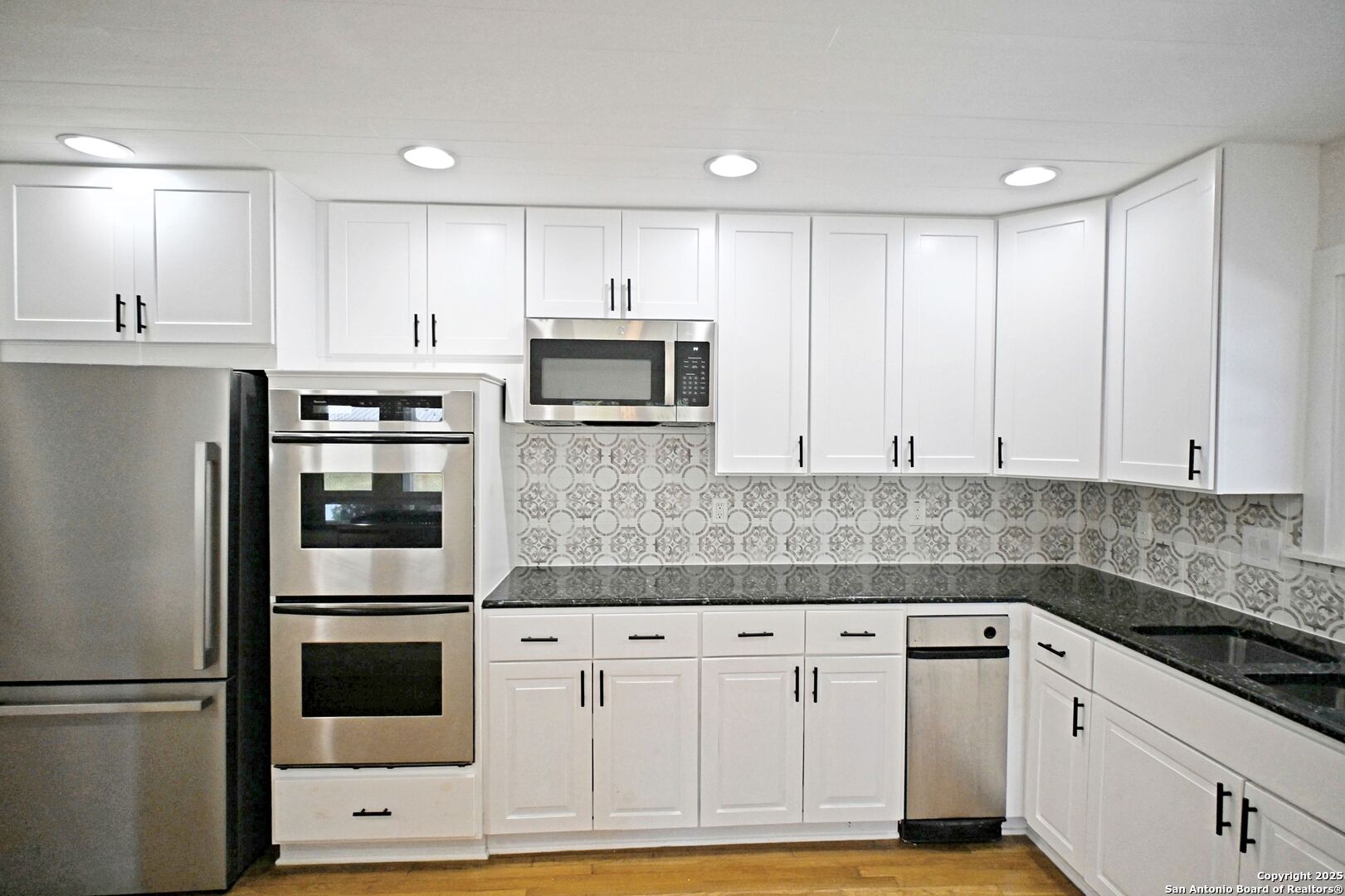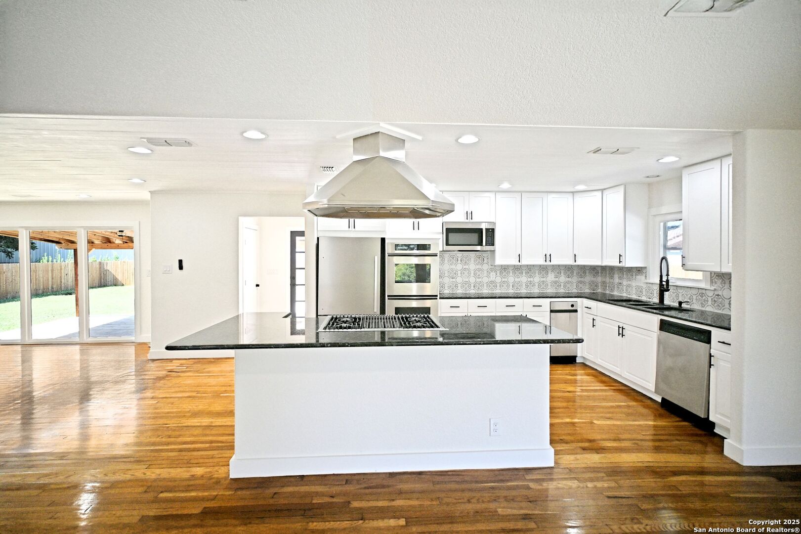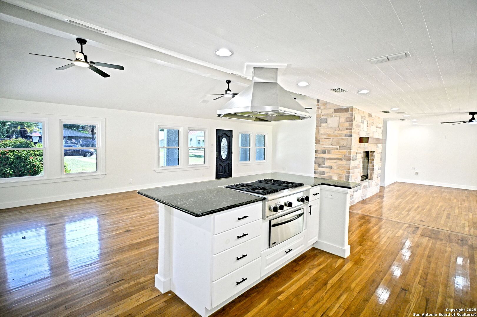 Walk on up along the paved path to this beautifully updated 2 bed/2 bath mid-century home with front covered porch. Be at awe at the marvelously polished hardwood flooring that cascades throughout the living space floor plan. Cozy up to the wood burning double sided masonry fireplace maximizing indoor space comfort. The stylish island kitchen features gas range cooktop, overhead vent hood, stainless steel appliances, and decorative tile backsplash. 1 of the 2 bedrooms comes with carpeting and down the hall from those bedrooms is a full bath with scalloped designed tile in the shower/tub combo. Enter into the primary bedroom suite with luxurious bathroom, tiled walk-in shower, and walk-in closet with built-in shelving. Relax outside in the spacious backyard and enjoy the views from the wooden covered back porch. This property is within minutes of the bustling Downtown New Braunfels and many local amenities. Some photos are virtually staged.