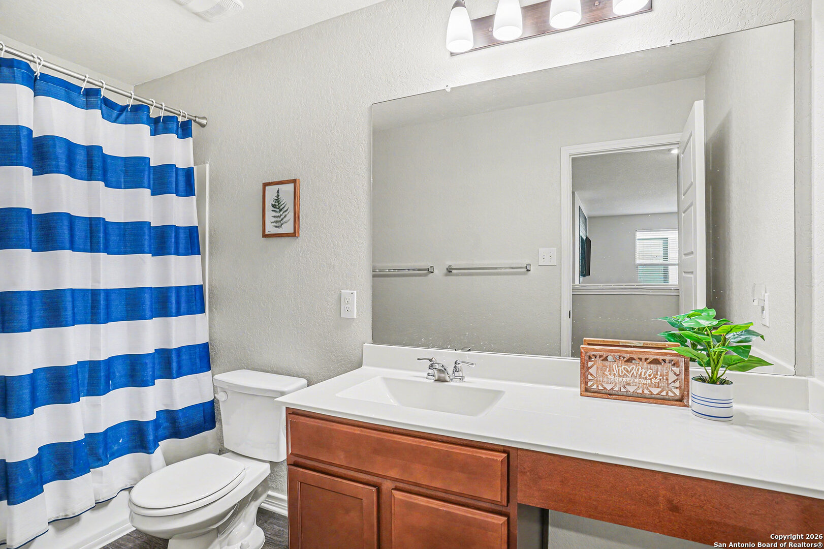 Welcome to this captivating two-story home located in the desirable Escondido North subdivision. Step inside to an inviting open floor plan enhanced by luxury vinyl plank flooring that flows seamlessly throughout the main living areas. The kitchen is designed for both function and style, featuring solid countertops, an extended breakfast bar ideal for casual dining, and a walk-in pantry for ample storage. Upstairs, you will find three generously sized bedrooms, including a spacious primary suite with a walk-in closet and a private connecting bath complete with an enclosed water closet and a tub and shower combination. A versatile loft-style area provides the perfect space for a home office, game room, or additional living area. Outside, unwind in the ample backyard that overlooks a peaceful green belt, offering both privacy and scenic views. Conveniently situated in Converse with easy access to Loop 1604, I-10, schools, shopping, dining, and everyday amenities, this home offers comfort, functionality, and an ideal location.
