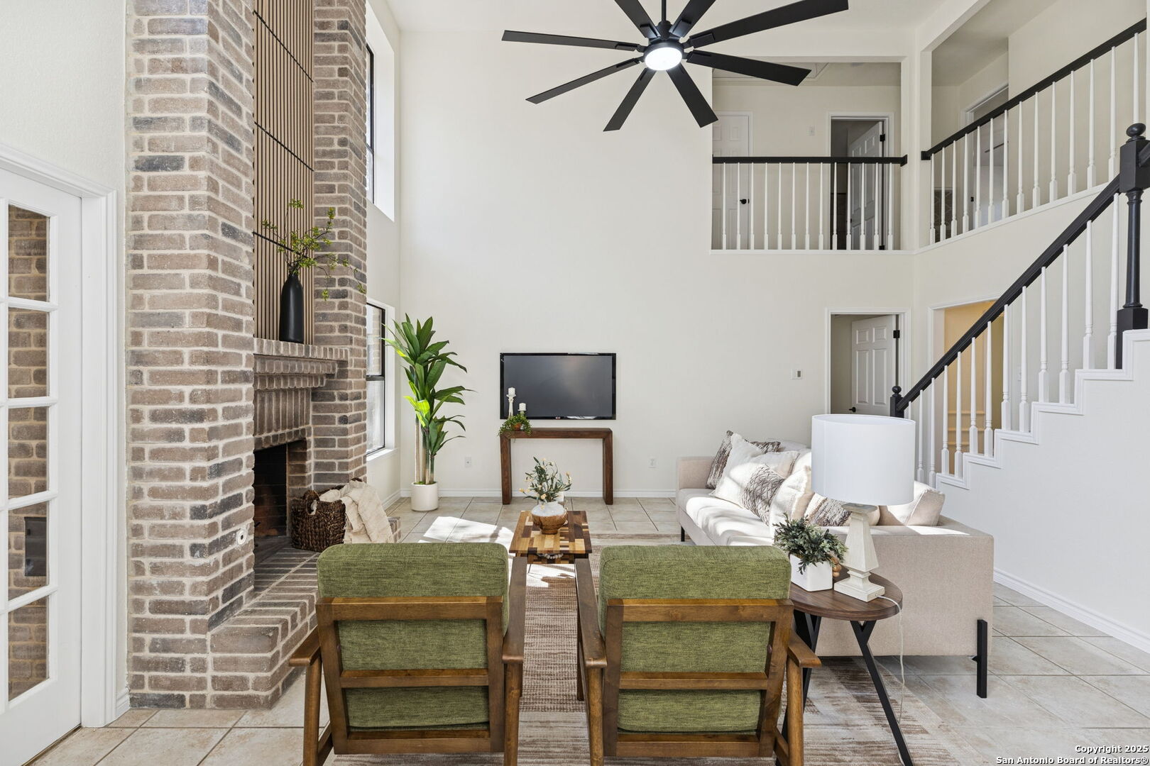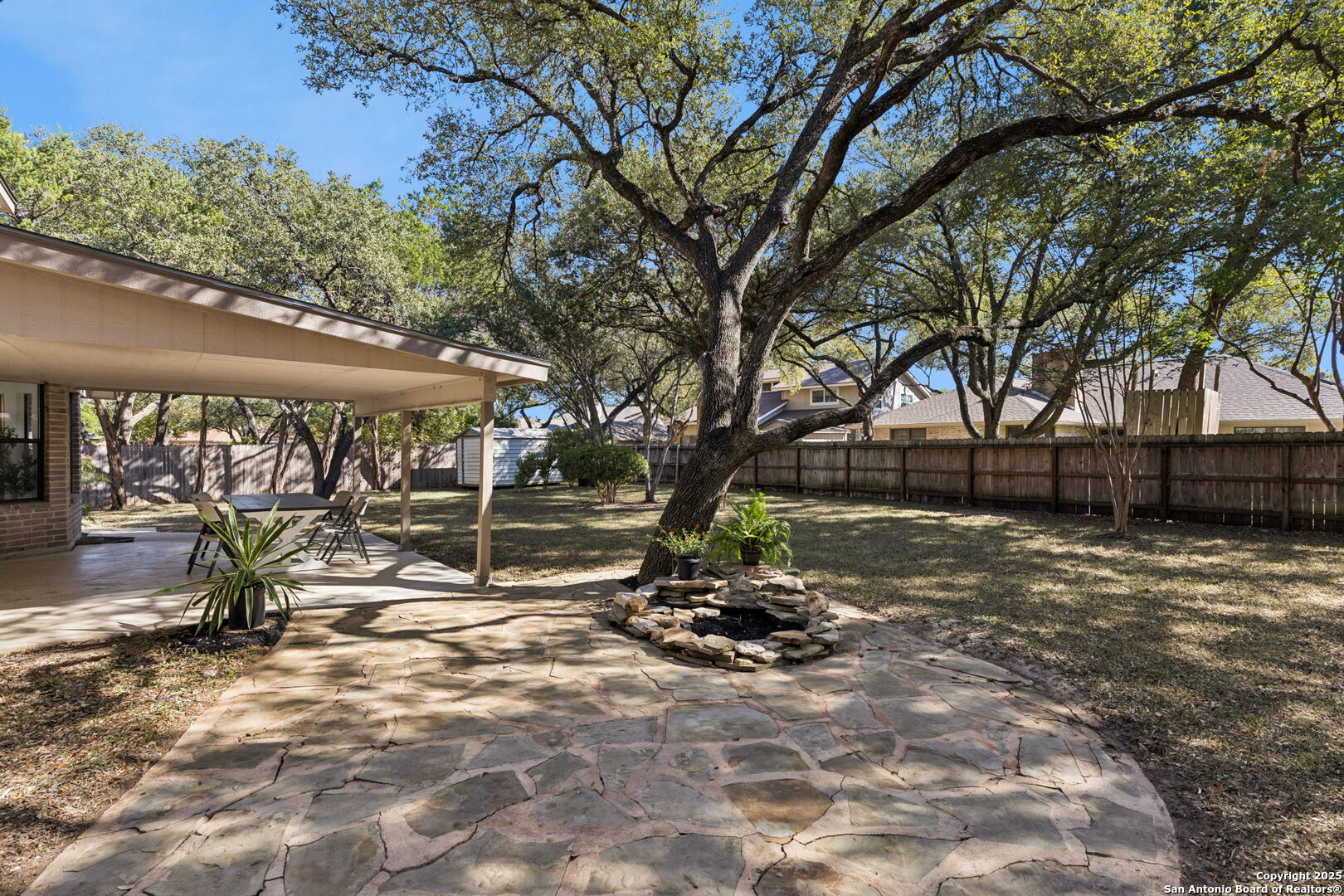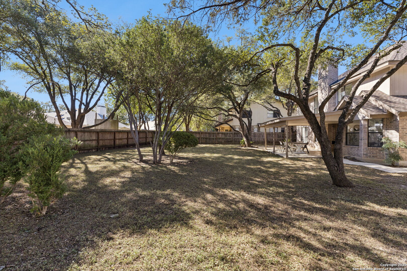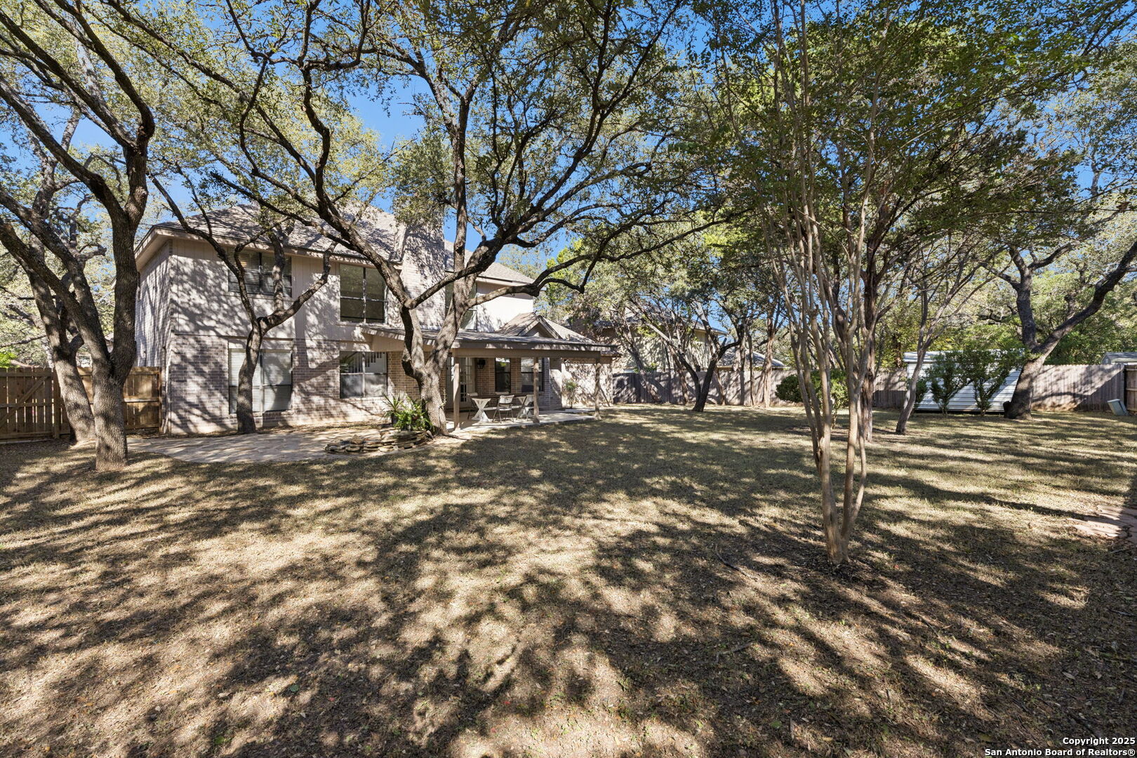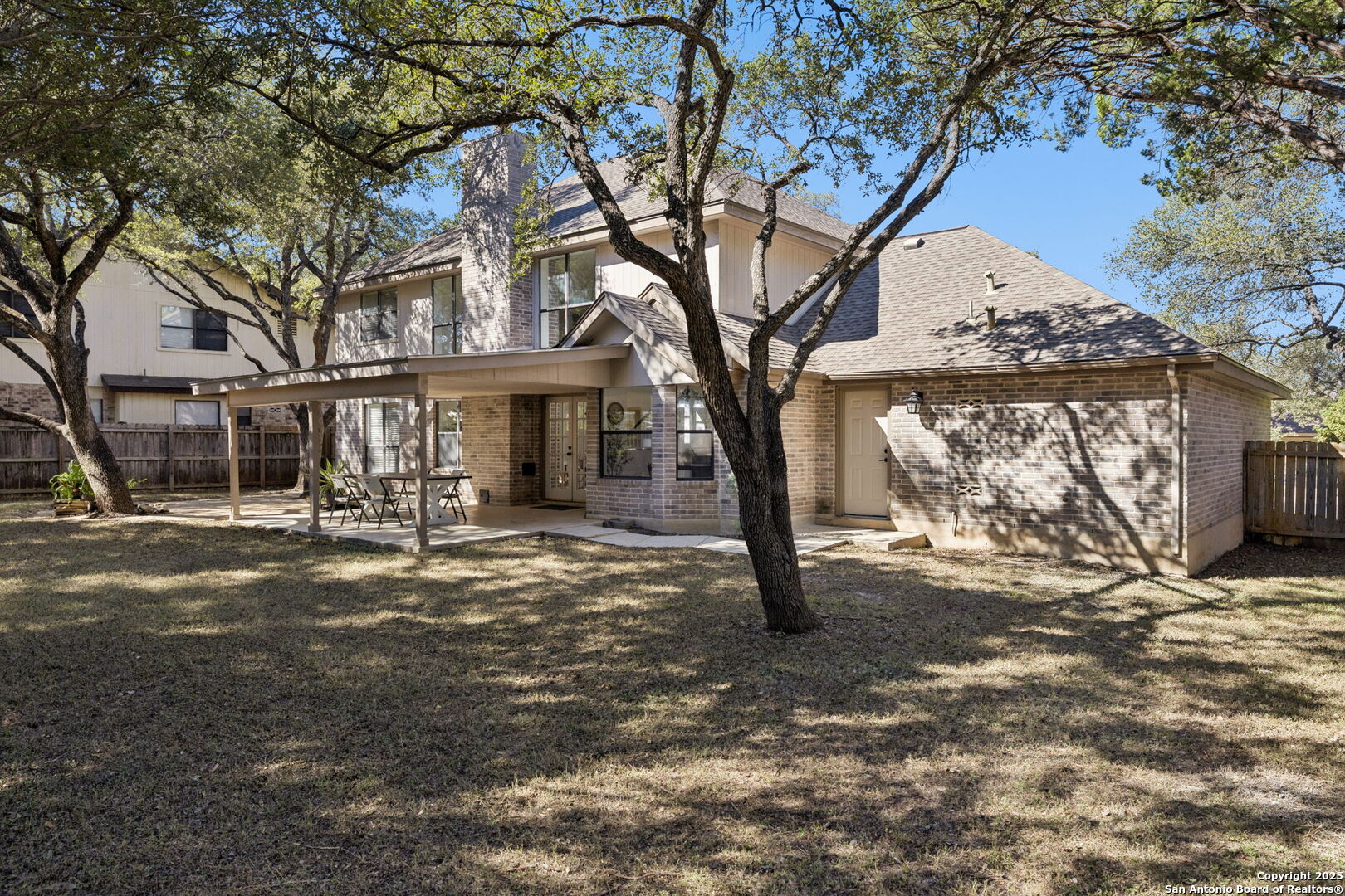 OPEN HOUSE SUN 11/23 2-4pm. Rare opportunity inside the loop of 1604! This beautifully renovated home in the heart of Woods of Shavano is truly move-in ready and filled with a balance of charm and modern updates. From the moment you arrive, you'll be drawn to the stately curb appeal, mature trees, professional landscaping, and the peaceful cul-de-sac setting. Inside, soaring ceilings, gleaming wood and tile floors, and fresh paint set a warm, inviting tone throughout. The dramatic family room features a floor-to-ceiling brick fireplace with gas starter, accented by a sleek slat-wall design, while the adjacent kitchen shines with quartz countertops, a deep sink, freshly painted cabinetry, and ample storage. The front of the home offers flexible formal living and dining spaces perfect for entertaining or a home office setup. The spacious owner's suite is conveniently located on the main level and features a completely updated bath with double vanity, soaking tub, walk-in shower, and generous closet. Upstairs, new plush carpet complements three additional bedrooms, a remodeled full bath, and a cozy nook ideal for reading, gaming, or extra storage. Step outside to a large covered patio overlooking a flat, private backyard shaded by mature trees-ideal for relaxing or entertaining. Even the garage has been freshly painted and provides additional storage. Every inch of this home has been thoughtfully refreshed and maintained, combining comfort, style, and convenience in one perfect package. Schedule your private showing today and see why this one stands out in Woods of Shavano!