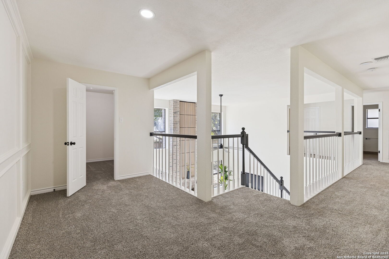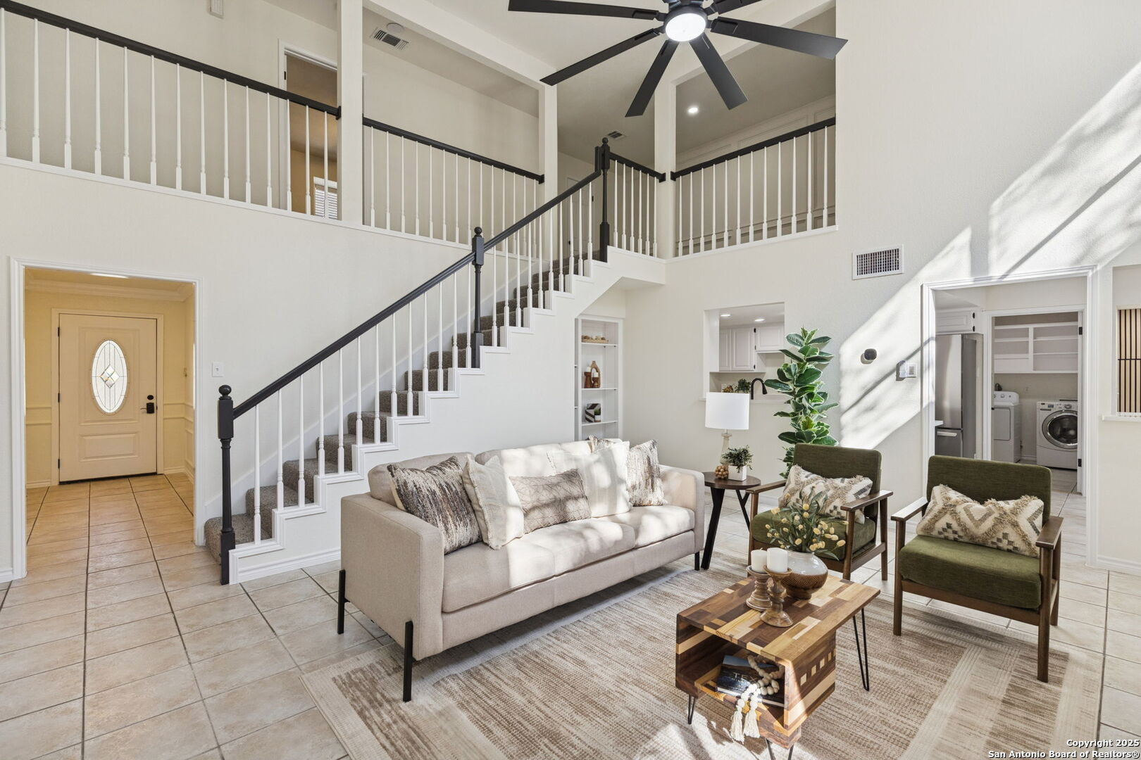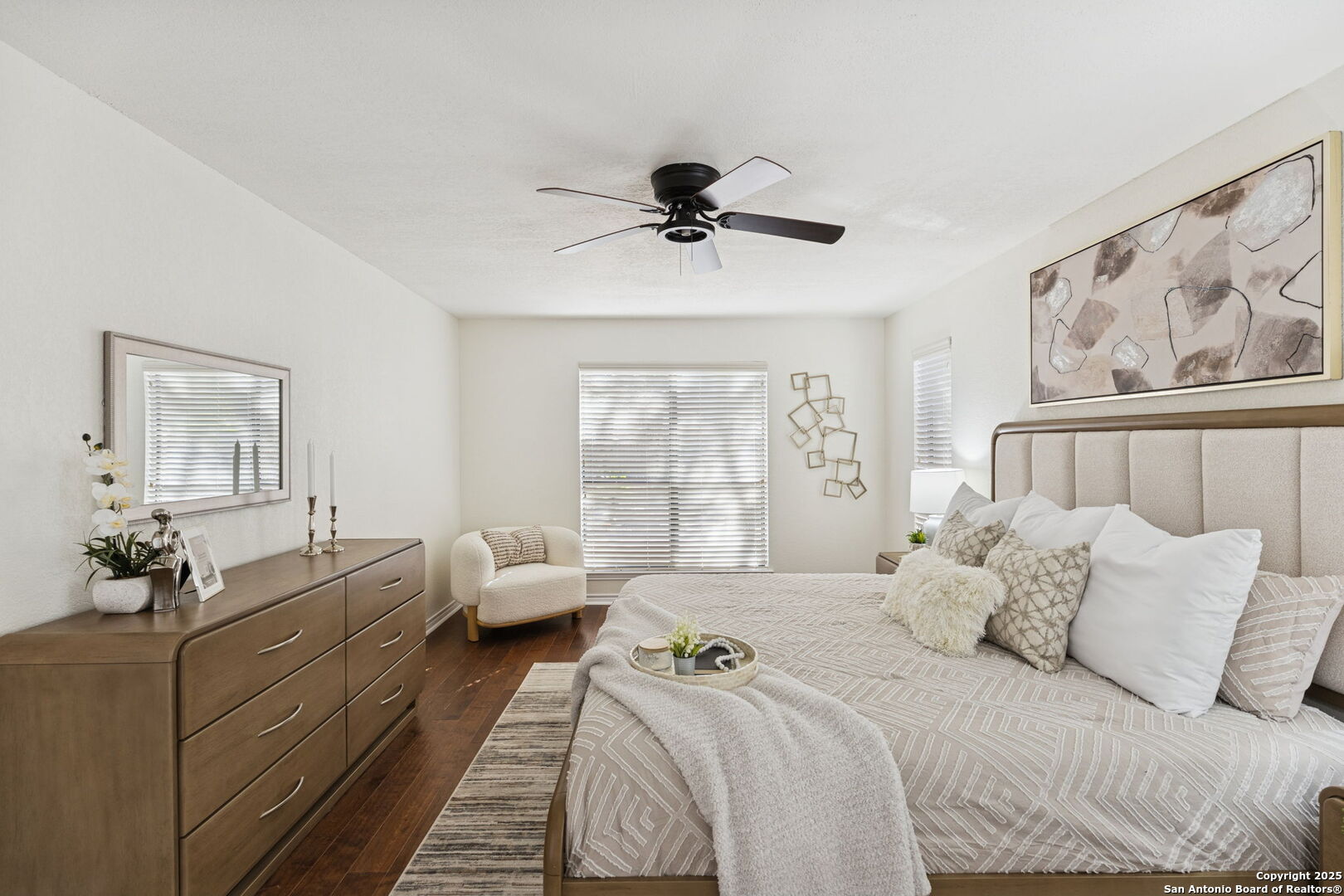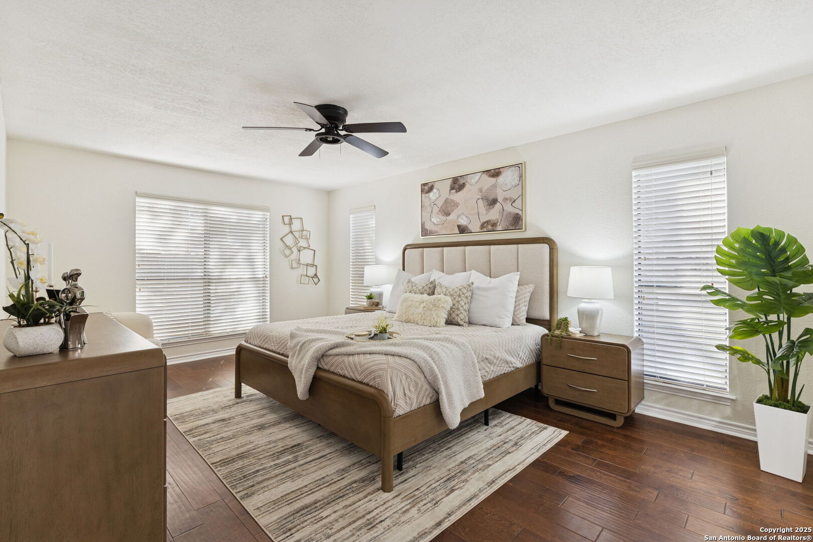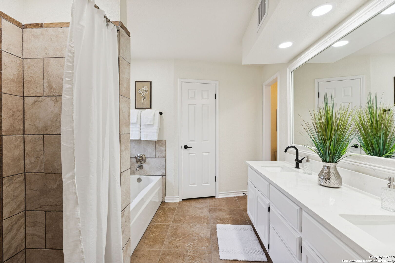 OPEN HOUSE SUN 11/23 2-4pm. Rare opportunity inside the loop of 1604! This beautifully renovated home in the heart of Woods of Shavano is truly move-in ready and filled with a balance of charm and modern updates. From the moment you arrive, you'll be drawn to the stately curb appeal, mature trees, professional landscaping, and the peaceful cul-de-sac setting. Inside, soaring ceilings, gleaming wood and tile floors, and fresh paint set a warm, inviting tone throughout. The dramatic family room features a floor-to-ceiling brick fireplace with gas starter, accented by a sleek slat-wall design, while the adjacent kitchen shines with quartz countertops, a deep sink, freshly painted cabinetry, and ample storage. The front of the home offers flexible formal living and dining spaces perfect for entertaining or a home office setup. The spacious owner's suite is conveniently located on the main level and features a completely updated bath with double vanity, soaking tub, walk-in shower, and generous closet. Upstairs, new plush carpet complements three additional bedrooms, a remodeled full bath, and a cozy nook ideal for reading, gaming, or extra storage. Step outside to a large covered patio overlooking a flat, private backyard shaded by mature trees-ideal for relaxing or entertaining. Even the garage has been freshly painted and provides additional storage. Every inch of this home has been thoughtfully refreshed and maintained, combining comfort, style, and convenience in one perfect package. Schedule your private showing today and see why this one stands out in Woods of Shavano!