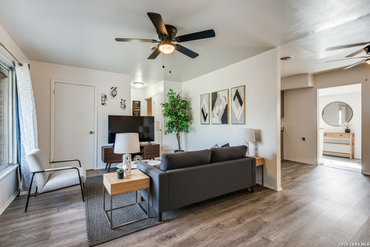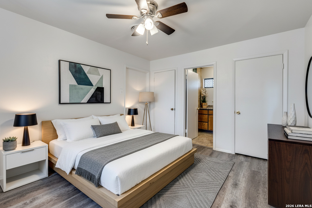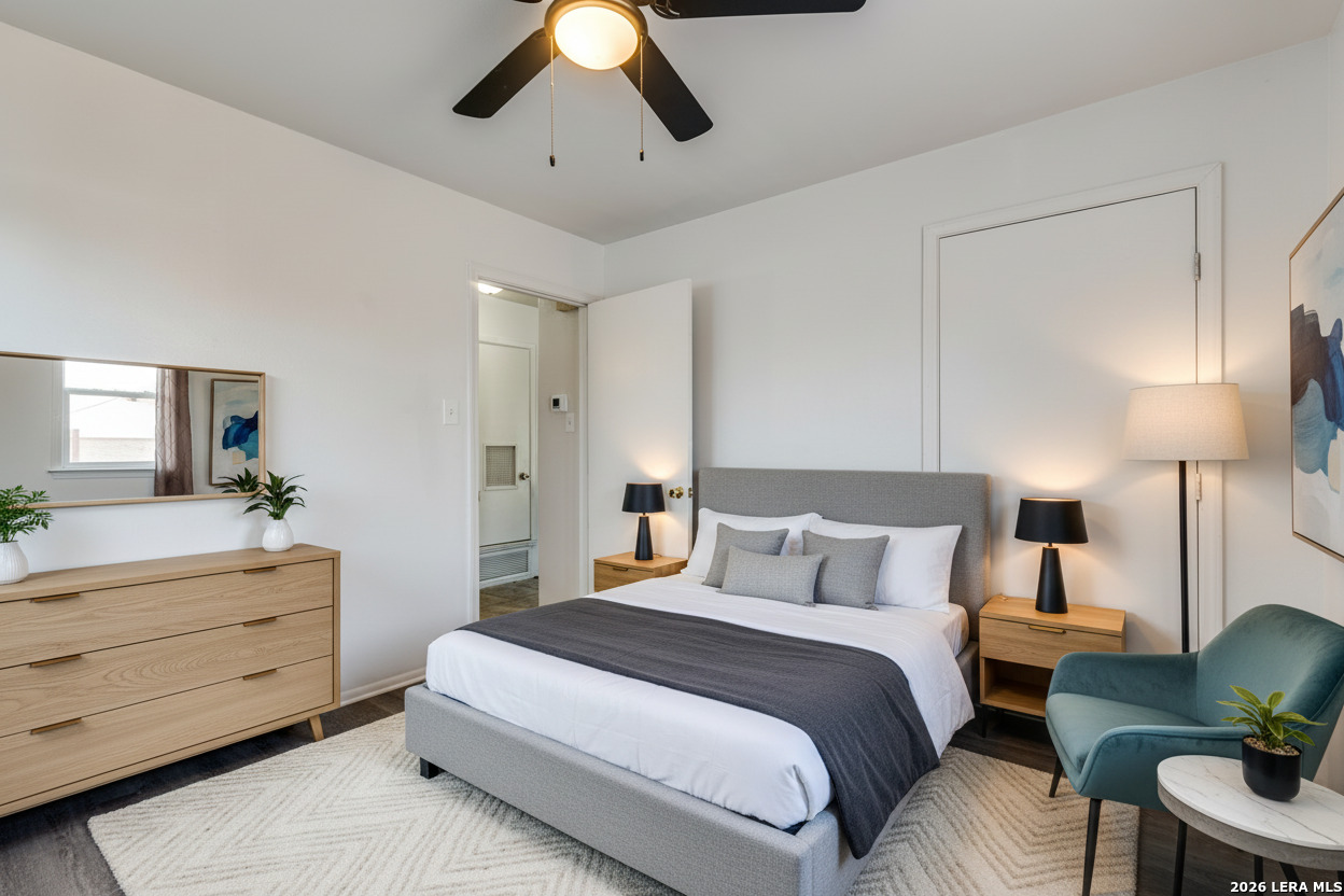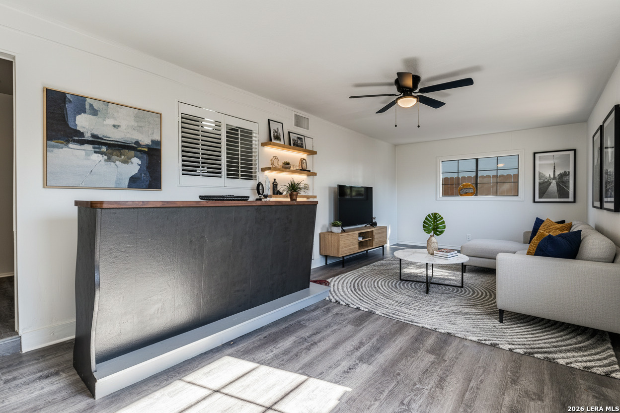 Welcome to this beautifully cared-for home in Glenoaks Park, where peacocks freely roam and add to the neighborhood's charm. The thoughtfully designed floor plan offers comfort and functionality, enhanced by fresh paint and new flooring throughout. Recent upgrades include a metal roof, brand-new 2025 HVAC system, double-pane windows, updated ceiling fans, and modern light fixtures. A versatile flex space at the back features a built-in bar and tabletop-perfect for entertaining, a home office, or a hobby room. Enjoy the serene backyard with a covered patio, ideal for relaxing outdoors, along with a spacious storage shed for added convenience. Centrally located with quick access to Loop 410, I-10, the Medical Center, Wurzbach Parkway, and more. An excellent opportunity for a 1031 exchange, owner-occupant, or investment property-this is one you won't want to miss!