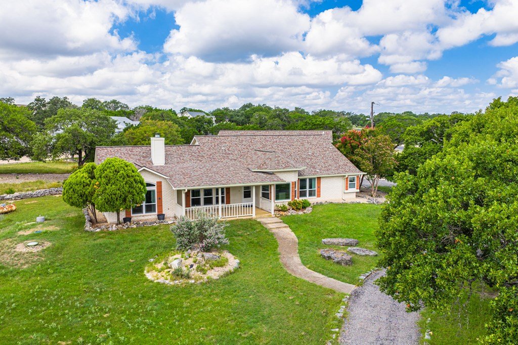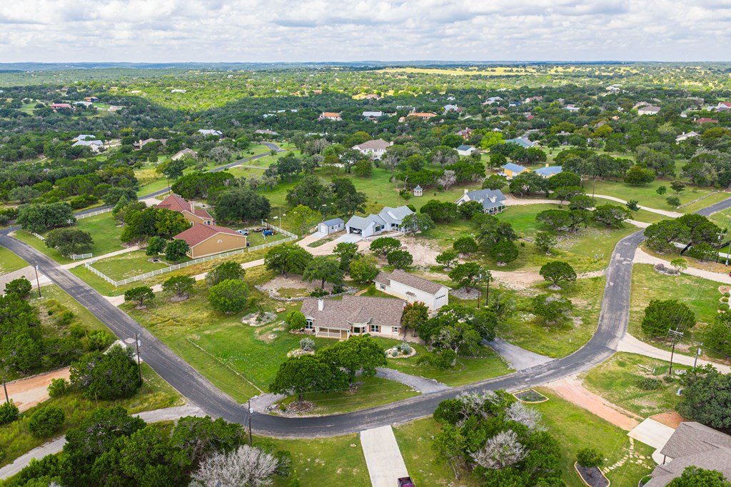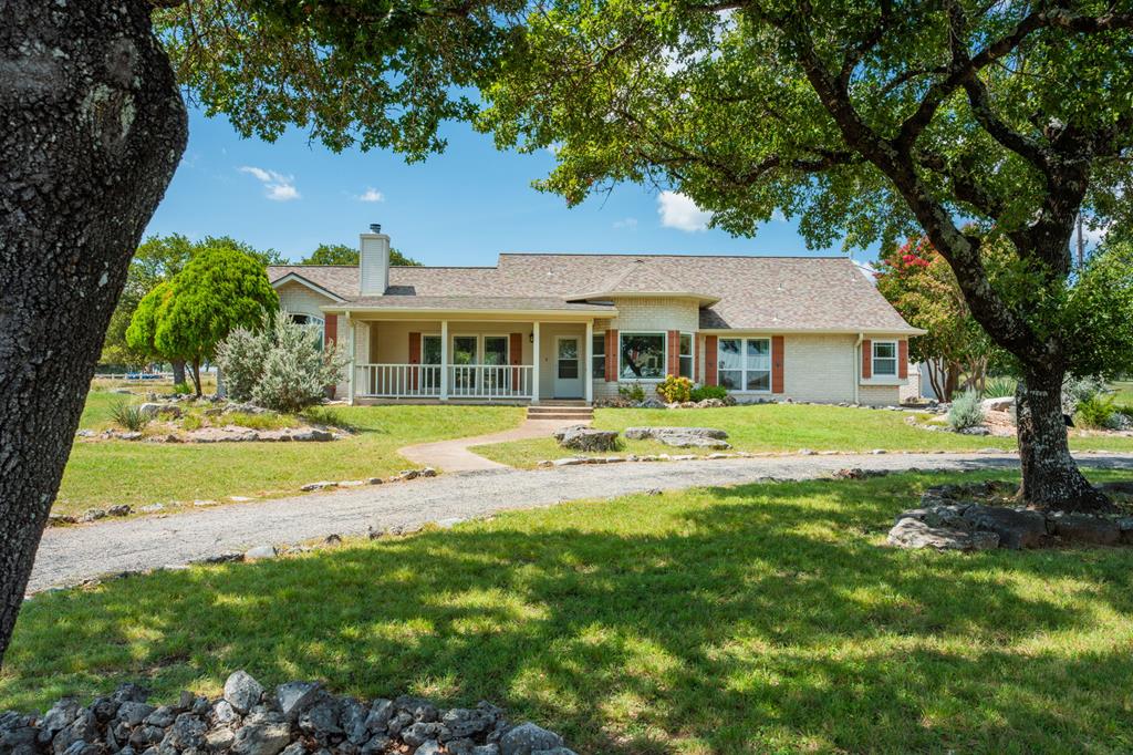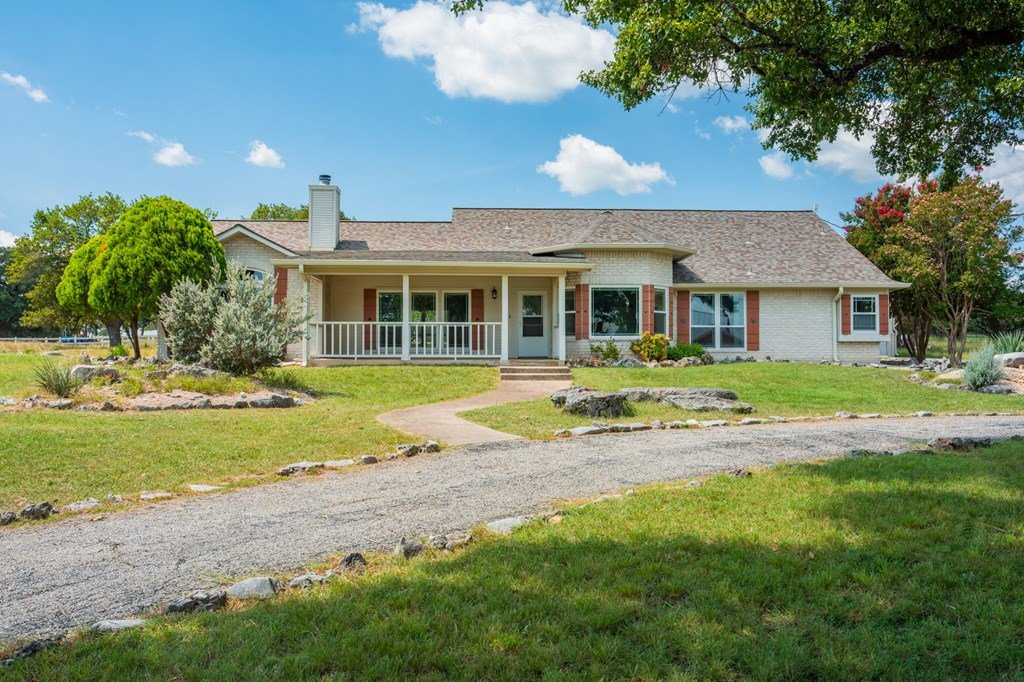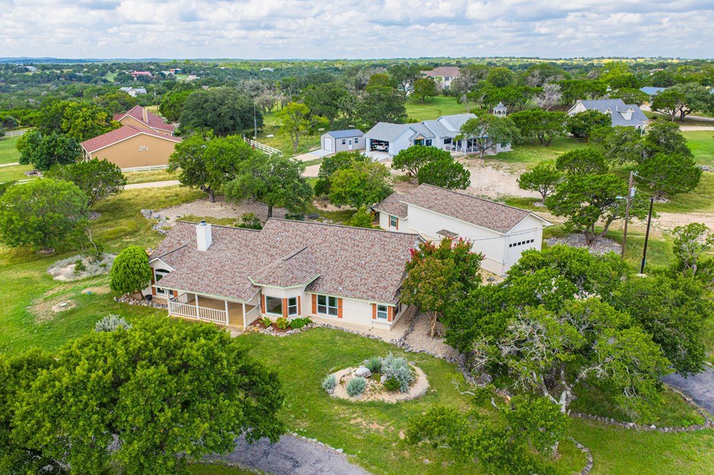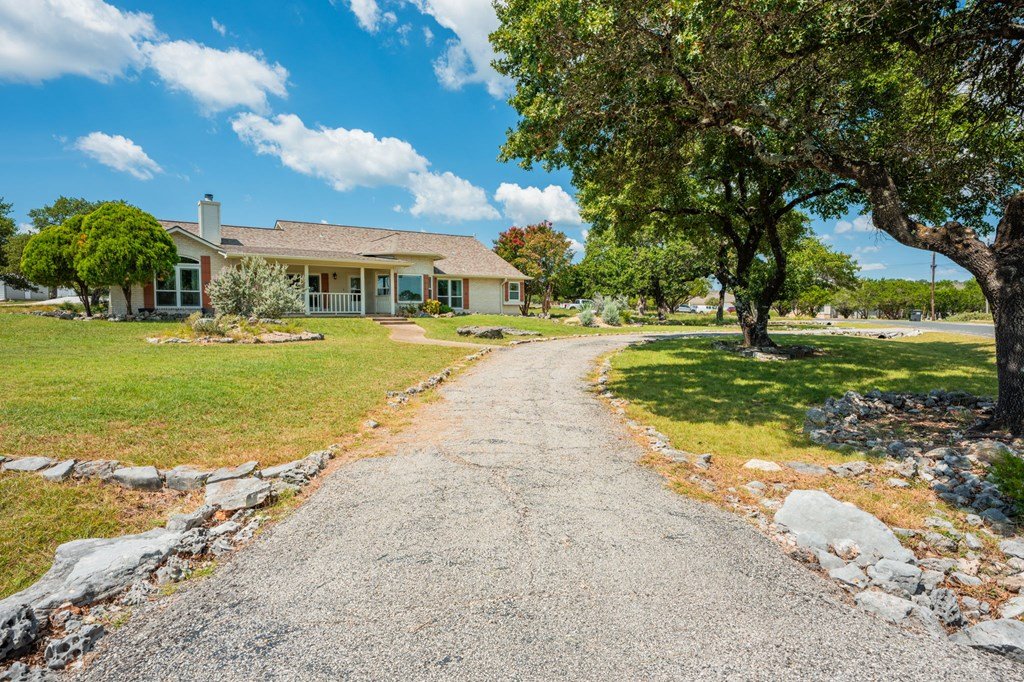 Discover this charming 3-bedroom, 2-bath home with 1,965 sq. ft. on a spacious .83-acre corner lot in Highlands Ranch. A welcoming circle drive & large front porch invite you into relaxed Hill Country living. Inside, vaulted ceilings enhance the open living & dining areas, while the eat-in kitchen offers space for everyday meals. The split floor plan provides privacy with guest bedrooms & an updated guest bath, while the primary suite features an ensuite bath & walk-in closet. Updates include a new front door & screen door, new windows & Bali shades. Oversized rooms are a highlight, from the great room & bedrooms to the laundry. The attached garage offers convenience with a front extension, workbench & sink. A true standout is the RV barn - built to house a 40-ft coach, boat, storage, or workshop - with 2 entrances, a 13 ft roll-up door & front storage. Architecturally designed to complement the home, it adds both function & style. This property combines thoughtful design, unique amenities & exceptional value. Call today to schedule your private showing and see all that this home has to offer!