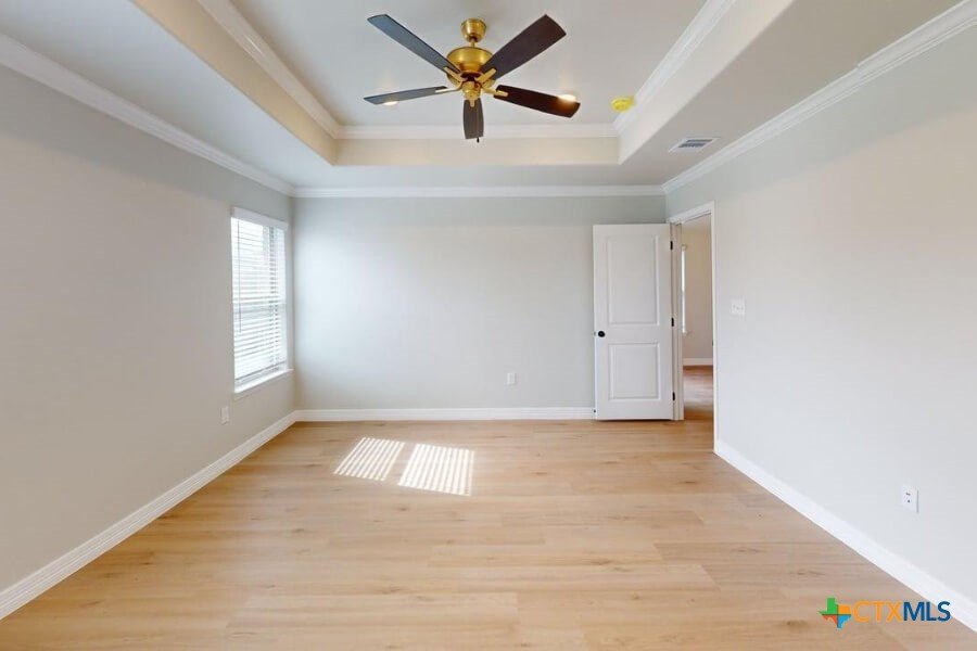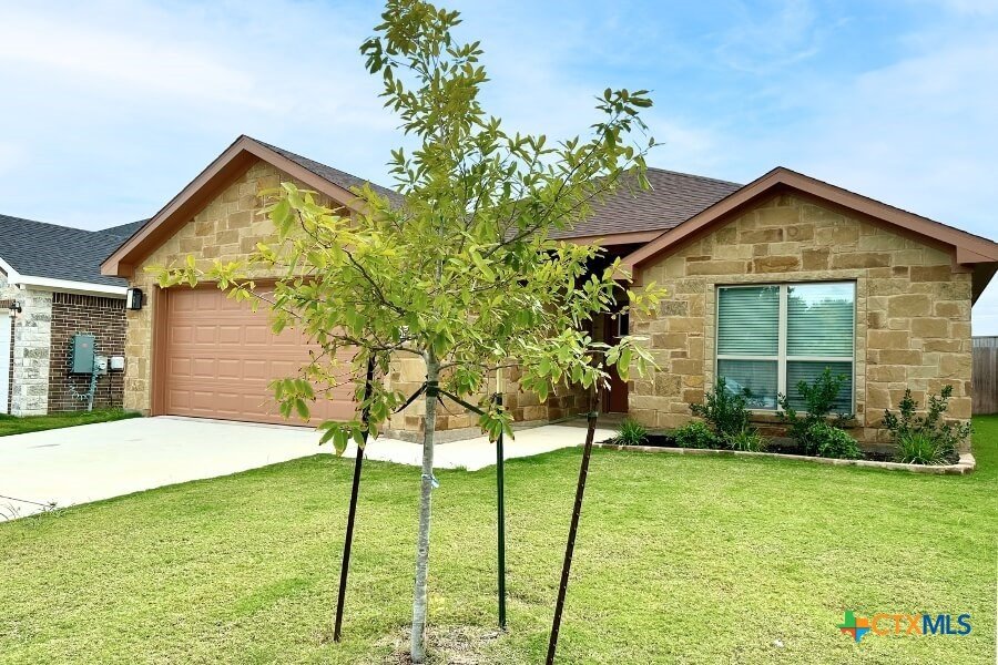 Welcome to a world of exceptional living, backed by a ten year structural integrity warranty. This masterpiece boasts a four-sided brick/stone exterior, crowned by a 25-year shingle roof. Revel in abundant natural light through energy-efficient low-e double-paned windows, while an advanced 14 S.E.E.R high-efficiency HVAC system ensures your comfort year-round. Inside, a central kitchen island unites the living and dining areas, complemented by designer backsplash, stone countertops, and custom cabinets. Modern convenience thrives with a walk-in pantry, built-in microwave with vent, and a garbage disposal. Architectural finesse is evident in bull nose corners, 2" faux wood blinds, ceiling fans, and crown molding, while vinyl plank graces wet areas. Your sanctuary awaits in the master suite with a lavish master bath featuring a double vanity and a sleek shower-only design. Outside, the landscape thrives with 16 pallets of Bermuda sod, embraced by a privacy fence and nurtured by a meticulous sprinkler system. A garage door opener adds the finishing touch to this exquisite dwelling.