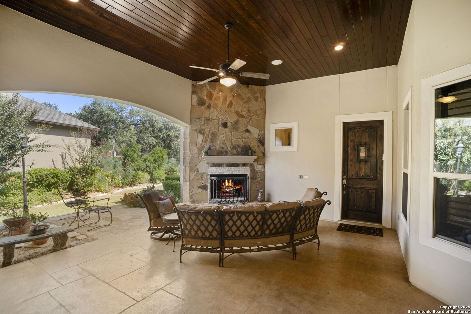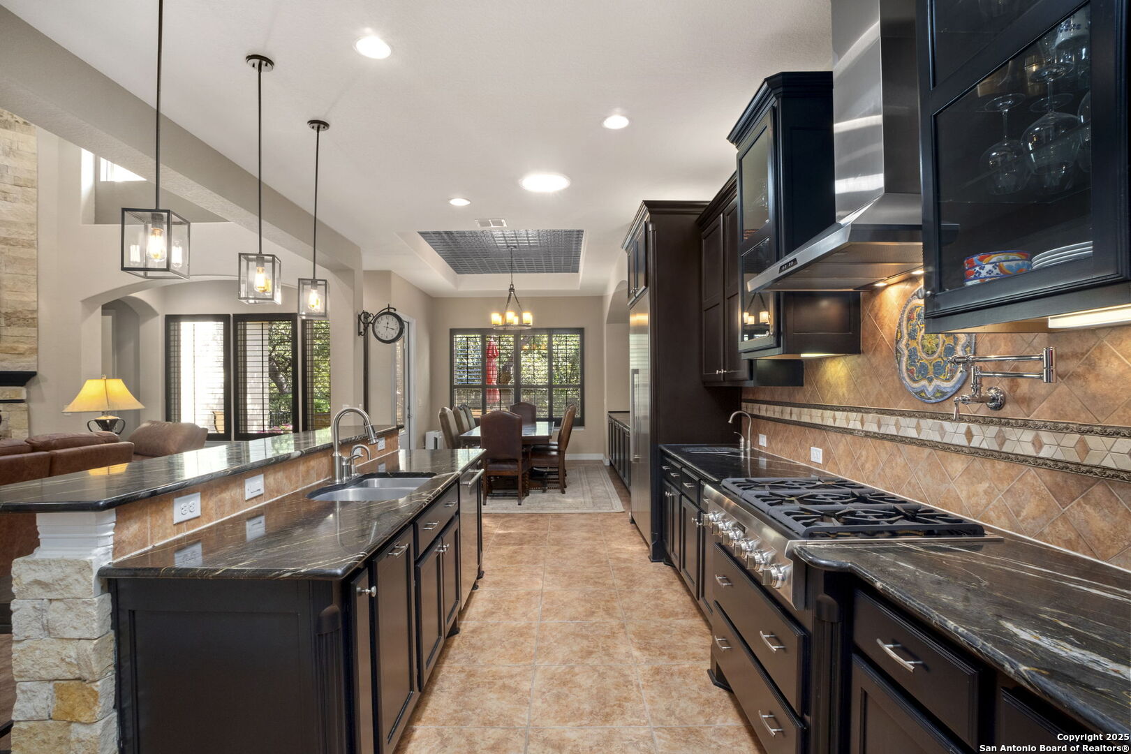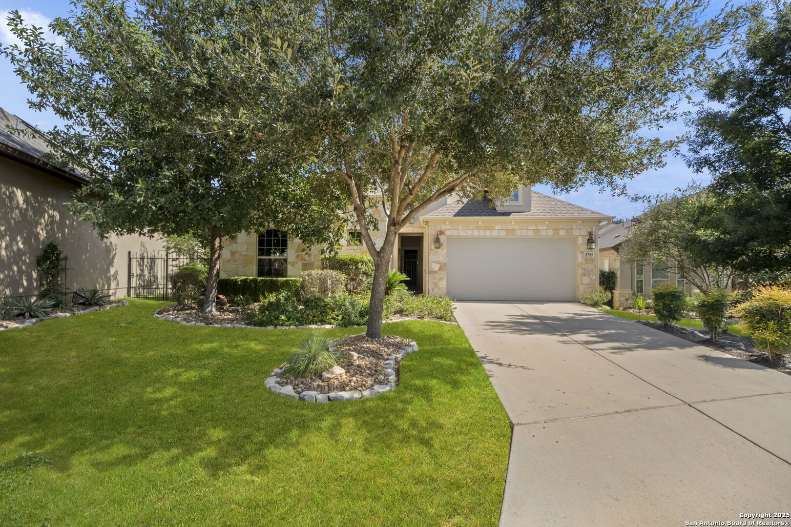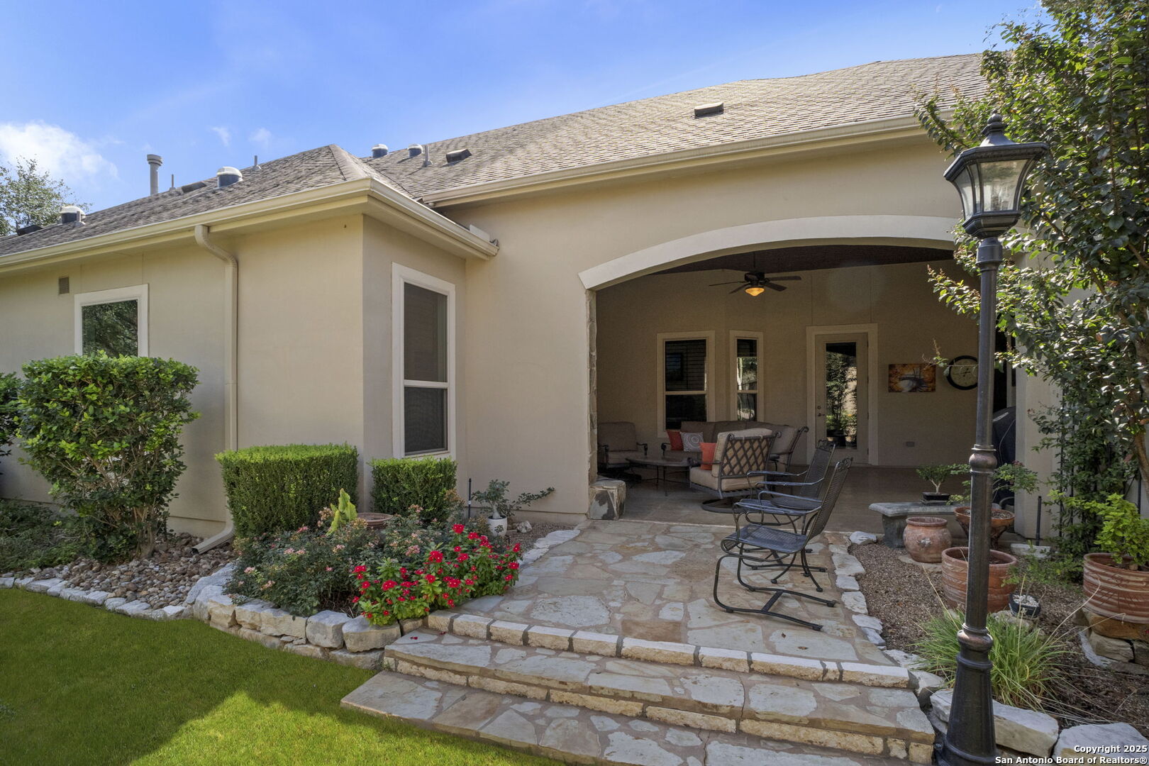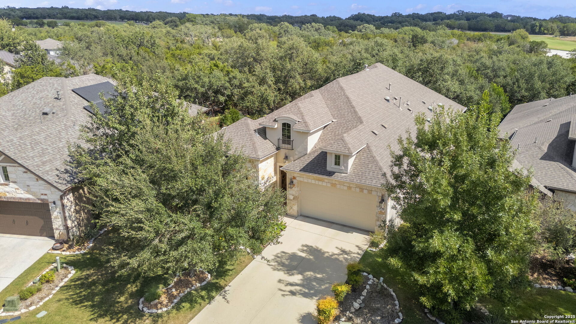 Welcome to this exceptional 3-bedroom home with a private casita, versatile flex space, and upscale finishes throughout, located in the highly sought-after gated community of Amorosa in Cibolo Canyons. Nestled on a premium greenbelt lot with live oak trees and direct access to the scenic walking trails, this single-story residence offers the perfect balance of comfort, style, and functionality. Step inside to discover an open-concept interior with soaring ceilings, skylights, and thoughtfully selected timeless finishes throughout. The main home includes two bedrooms with a flexible space ideal for a home office, study, or secondary lounge-tailored to meet your modern lifestyle needs. The heart of the home is a chef's gourmet kitchen, showcasing granite countertops throughout, custom cabinetry, built-in buffet and a spacious pantry. Thermador appliances, including a built-in refrigerator, 6-burner gas range, and new dishwasher (installed September 2025). The large oven provides space for your cooking and baking creations along with a built-in microwave, and an expansive center island with bar seating-perfect for entertaining. Natural light pours in from skylights and the adjacent dining area, framed by large windows overlooking the tranquil backyard. The inviting living room centers around a striking stone fireplace, ideal for cozy evenings or hosting gatherings. The spacious primary suite is a luxurious retreat, featuring tray ceilings, a spa-inspired walk-in shower, dual granite-top vanities, and an oversized walk-in custom-designed closet. Separate from the main living areas, connected by another large, covered courtyard with an outdoor stone fireplace, the private casita awaits, including a full bath, bar sink, space for refrigerator or wine cooler, and a custom-built Murphy bed-perfect for multi-generational living, guests, or a private studio. Enjoy relaxing on your back deck overlooking the beautifully landscaped backyard with live oak trees, shaded serenity, and direct access to the community trail system. Just beyond the native greenbelt lies the lush fairways of the TPC golf course, enhancing the peaceful setting. Landscaping is maintained by the HOA, allowing for a low-maintenance lifestyle and more time to enjoy the community's top-tier amenities. Residents of Cibolo Canyons have access to two amenity centers: Amenity Center 1: Lazy river, splash pad, Olympic-size pool, soccer field, playground, fitness center, meeting facilities, and on-site HOA staff. Amenity Center 2 (Amorosa): Olympic-size pool, splash pad, fitness center, BBQ grills, and clubhouse. A rare opportunity to own a home that combines thoughtful design, versatile spaces, and the serenity of golf course living-this one is truly a must-see.