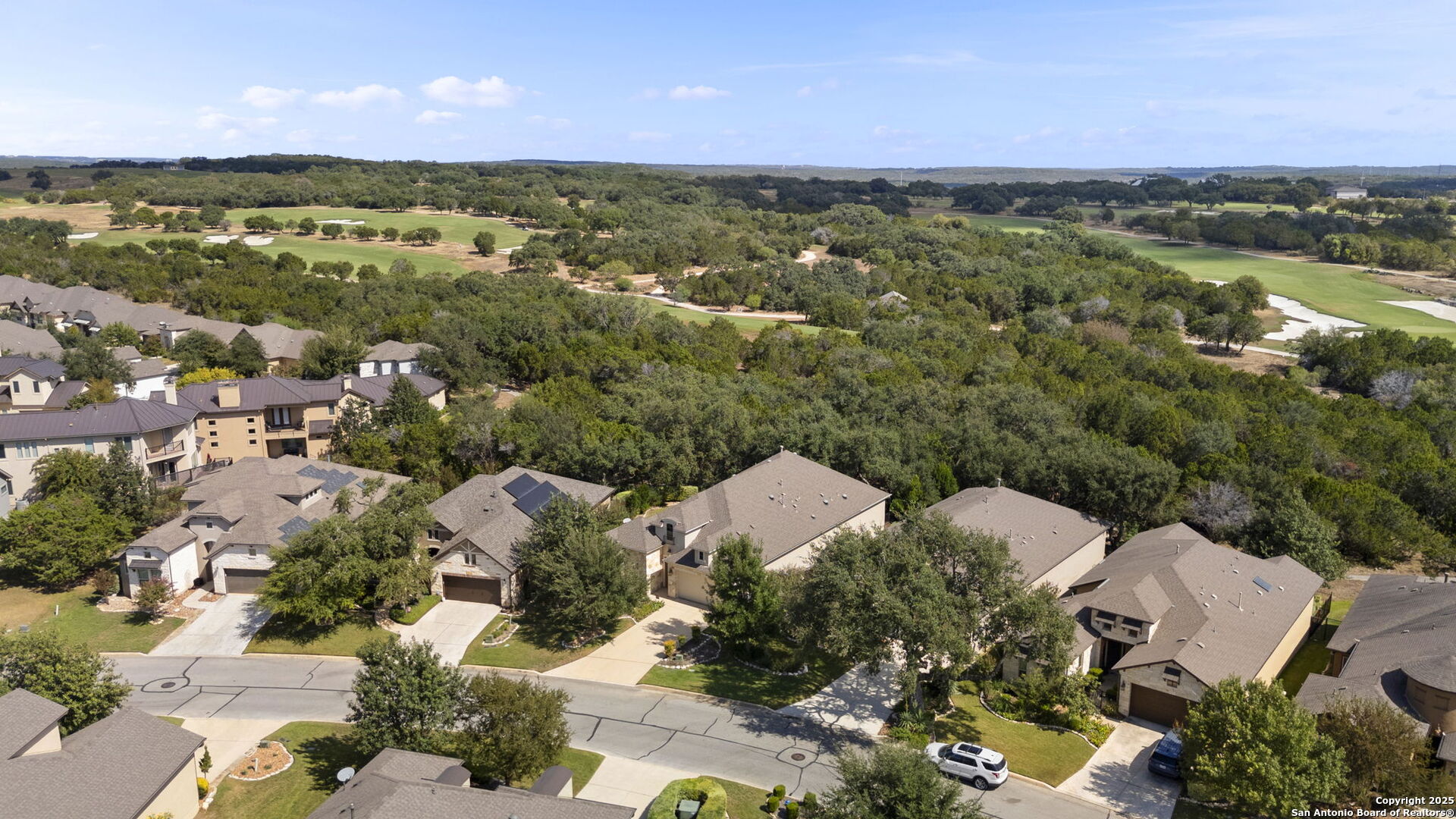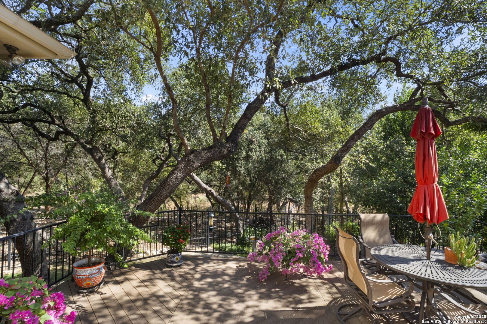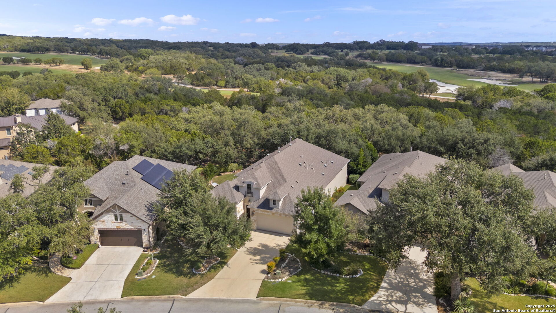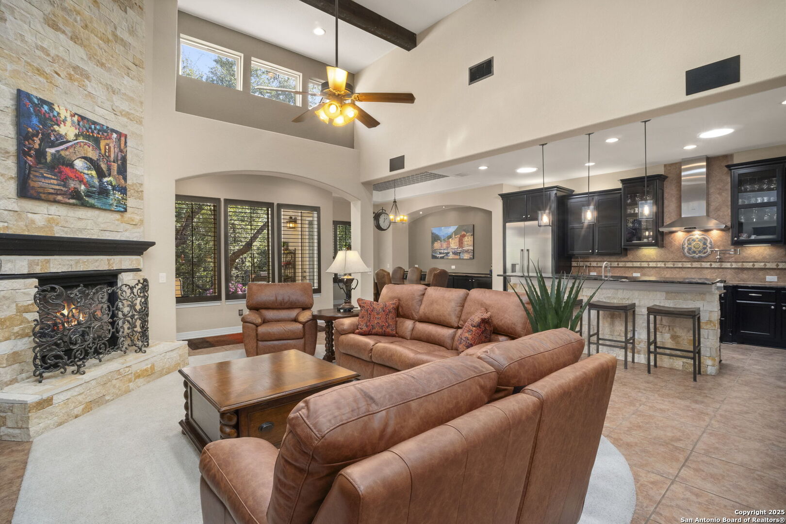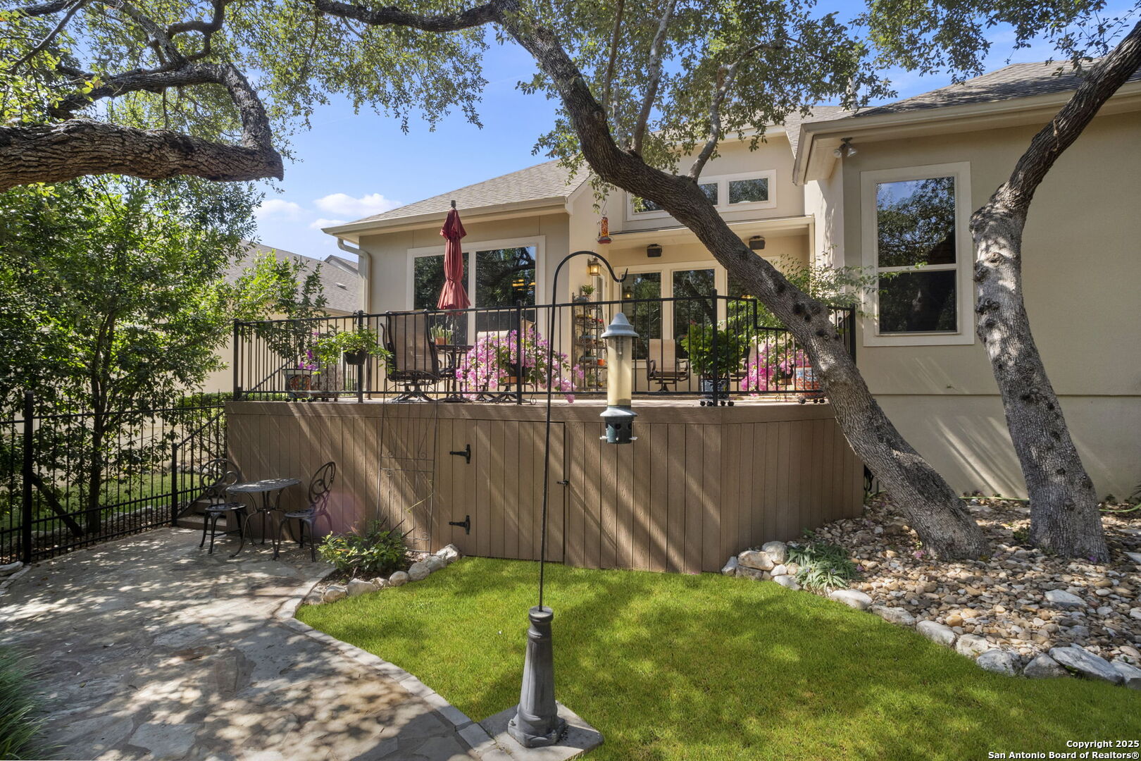 Welcome to this exceptional 3-bedroom home with a private casita, versatile flex space, and upscale finishes throughout, located in the highly sought-after gated community of Amorosa in Cibolo Canyons. Nestled on a premium greenbelt lot with live oak trees and direct access to the scenic walking trails, this single-story residence offers the perfect balance of comfort, style, and functionality. Step inside to discover an open-concept interior with soaring ceilings, skylights, and thoughtfully selected timeless finishes throughout. The main home includes two bedrooms with a flexible space ideal for a home office, study, or secondary lounge-tailored to meet your modern lifestyle needs. The heart of the home is a chef's gourmet kitchen, showcasing granite countertops throughout, custom cabinetry, built-in buffet and a spacious pantry. Thermador appliances, including a built-in refrigerator, 6-burner gas range, and new dishwasher (installed September 2025). The large oven provides space for your cooking and baking creations along with a built-in microwave, and an expansive center island with bar seating-perfect for entertaining. Natural light pours in from skylights and the adjacent dining area, framed by large windows overlooking the tranquil backyard. The inviting living room centers around a striking stone fireplace, ideal for cozy evenings or hosting gatherings. The spacious primary suite is a luxurious retreat, featuring tray ceilings, a spa-inspired walk-in shower, dual granite-top vanities, and an oversized walk-in custom-designed closet. Separate from the main living areas, connected by another large, covered courtyard with an outdoor stone fireplace, the private casita awaits, including a full bath, bar sink, space for refrigerator or wine cooler, and a custom-built Murphy bed-perfect for multi-generational living, guests, or a private studio. Enjoy relaxing on your back deck overlooking the beautifully landscaped backyard with live oak trees, shaded serenity, and direct access to the community trail system. Just beyond the native greenbelt lies the lush fairways of the TPC golf course, enhancing the peaceful setting. Landscaping is maintained by the HOA, allowing for a low-maintenance lifestyle and more time to enjoy the community's top-tier amenities. Residents of Cibolo Canyons have access to two amenity centers: Amenity Center 1: Lazy river, splash pad, Olympic-size pool, soccer field, playground, fitness center, meeting facilities, and on-site HOA staff. Amenity Center 2 (Amorosa): Olympic-size pool, splash pad, fitness center, BBQ grills, and clubhouse. A rare opportunity to own a home that combines thoughtful design, versatile spaces, and the serenity of golf course living-this one is truly a must-see.