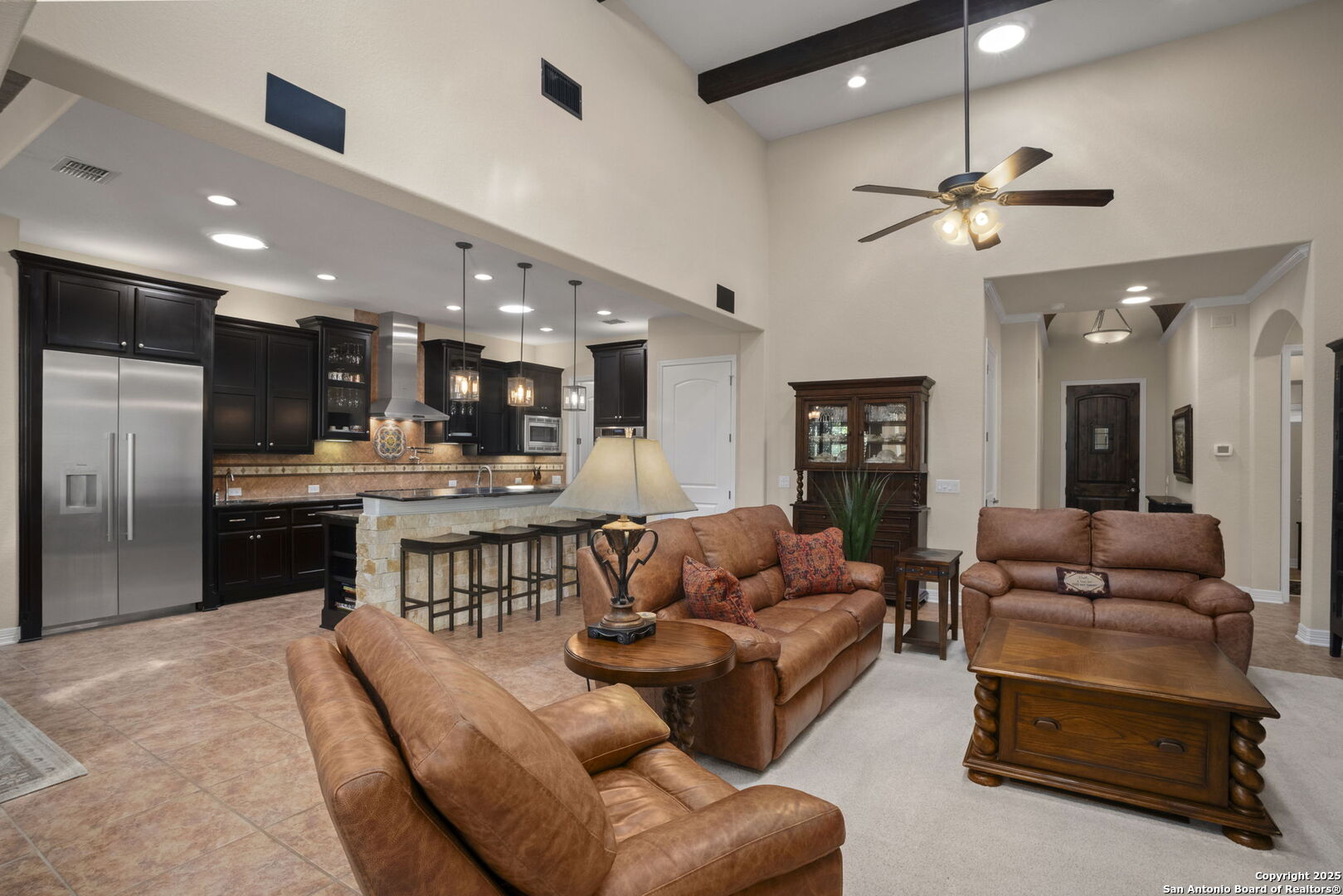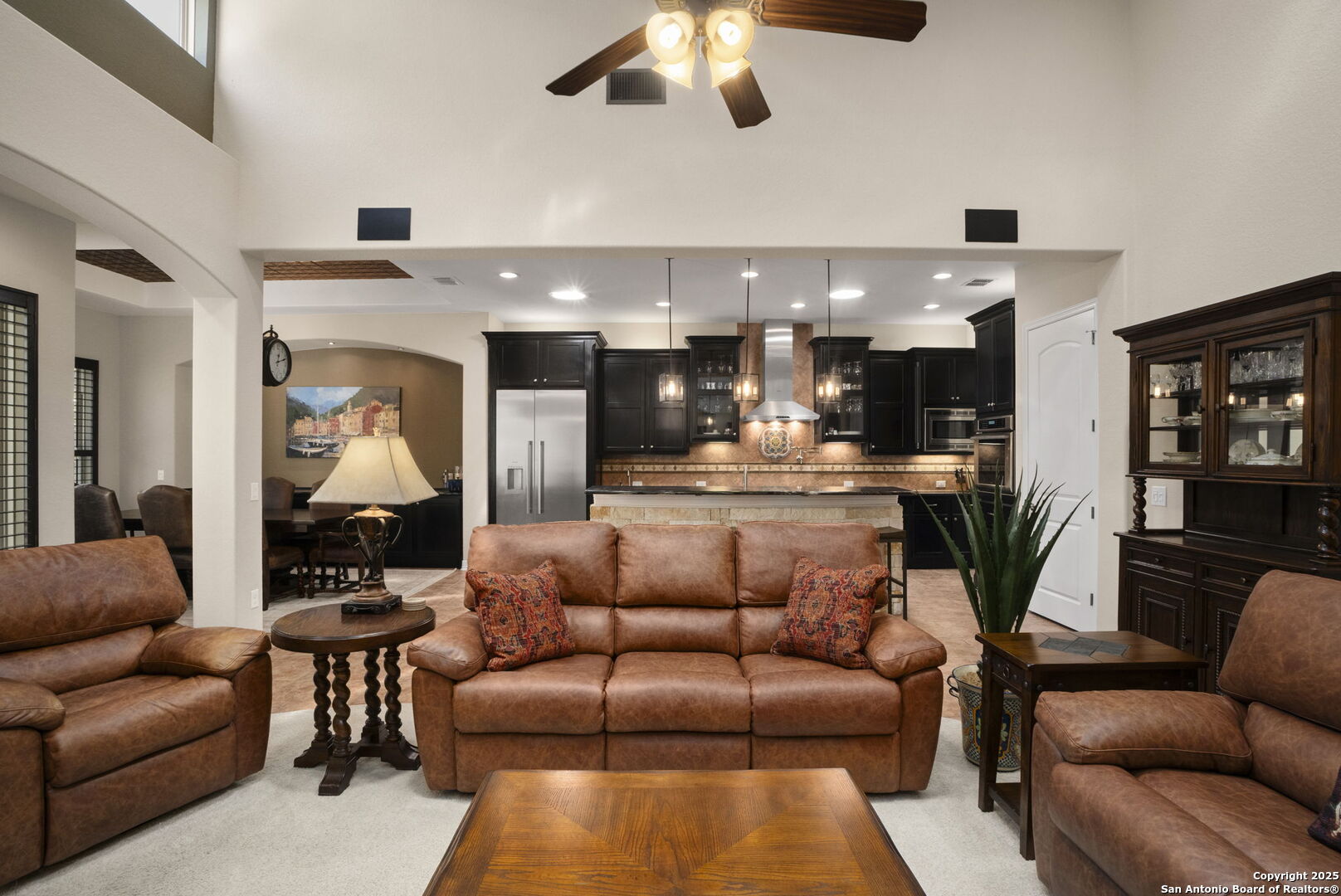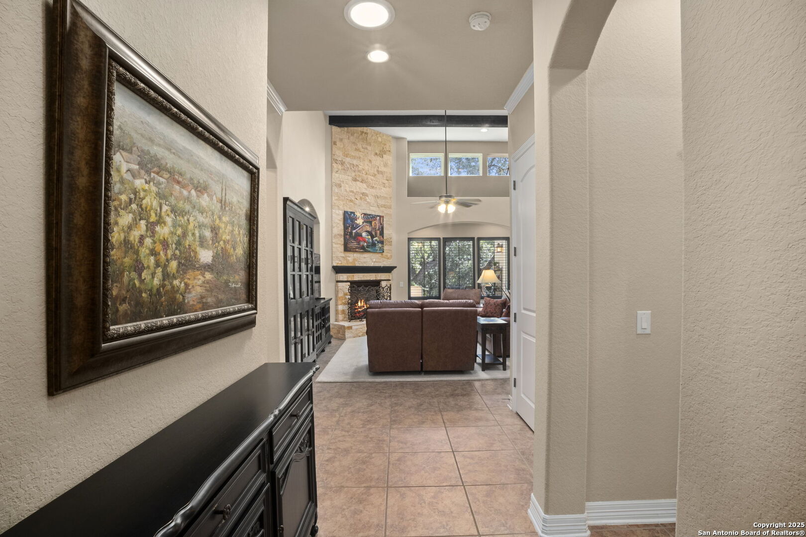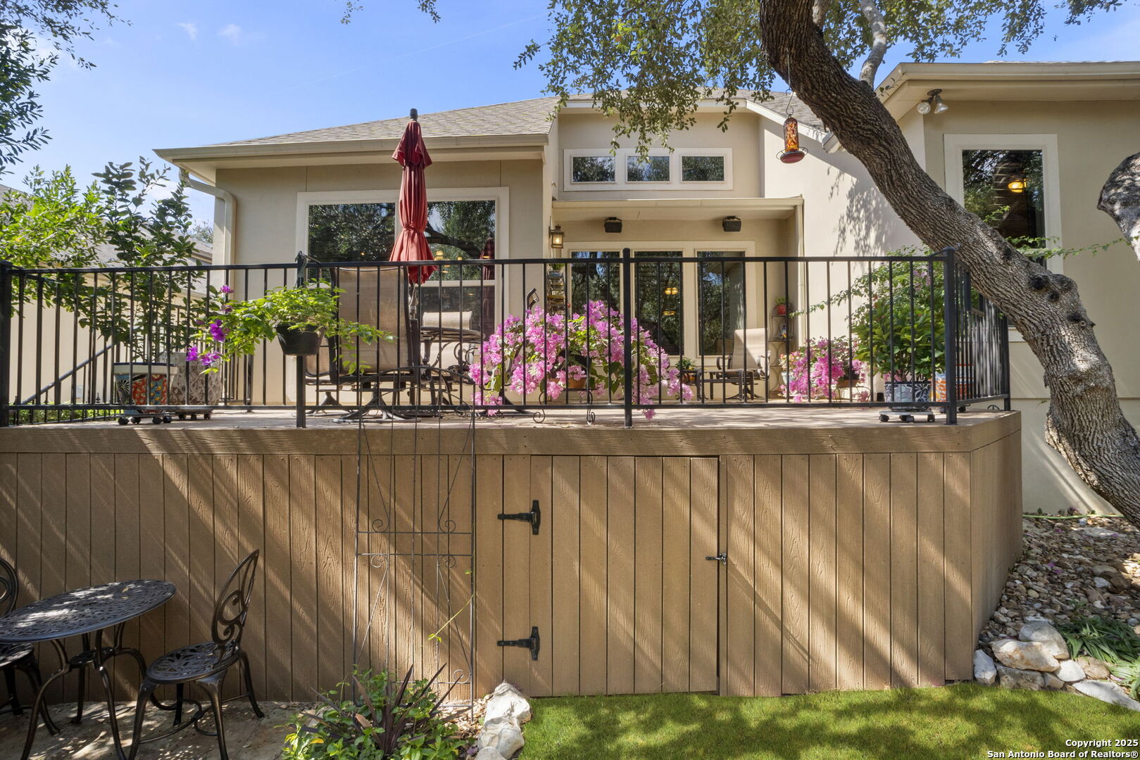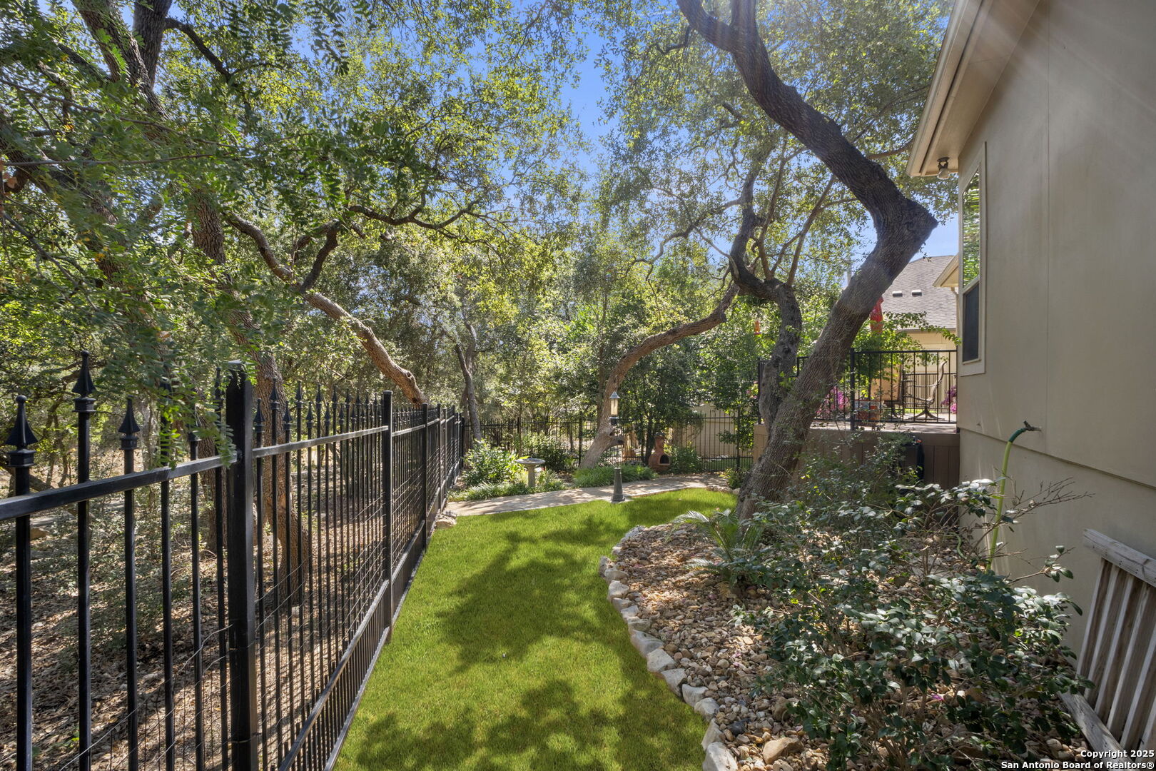 Welcome to this exceptional 3-bedroom home with a private casita, versatile flex space, and upscale finishes throughout, located in the highly sought-after gated community of Amorosa in Cibolo Canyons. Nestled on a premium greenbelt lot with live oak trees and direct access to the scenic walking trails, this single-story residence offers the perfect balance of comfort, style, and functionality. Step inside to discover an open-concept interior with soaring ceilings, skylights, and thoughtfully selected timeless finishes throughout. The main home includes two bedrooms with a flexible space ideal for a home office, study, or secondary lounge-tailored to meet your modern lifestyle needs. The heart of the home is a chef's gourmet kitchen, showcasing granite countertops throughout, custom cabinetry, built-in buffet and a spacious pantry. Thermador appliances, including a built-in refrigerator, 6-burner gas range, and new dishwasher (installed September 2025). The large oven provides space for your cooking and baking creations along with a built-in microwave, and an expansive center island with bar seating-perfect for entertaining. Natural light pours in from skylights and the adjacent dining area, framed by large windows overlooking the tranquil backyard. The inviting living room centers around a striking stone fireplace, ideal for cozy evenings or hosting gatherings. The spacious primary suite is a luxurious retreat, featuring tray ceilings, a spa-inspired walk-in shower, dual granite-top vanities, and an oversized walk-in custom-designed closet. Separate from the main living areas, connected by another large, covered courtyard with an outdoor stone fireplace, the private casita awaits, including a full bath, bar sink, space for refrigerator or wine cooler, and a custom-built Murphy bed-perfect for multi-generational living, guests, or a private studio. Enjoy relaxing on your back deck overlooking the beautifully landscaped backyard with live oak trees, shaded serenity, and direct access to the community trail system. Just beyond the native greenbelt lies the lush fairways of the TPC golf course, enhancing the peaceful setting. Landscaping is maintained by the HOA, allowing for a low-maintenance lifestyle and more time to enjoy the community's top-tier amenities. Residents of Cibolo Canyons have access to two amenity centers: Amenity Center 1: Lazy river, splash pad, Olympic-size pool, soccer field, playground, fitness center, meeting facilities, and on-site HOA staff. Amenity Center 2 (Amorosa): Olympic-size pool, splash pad, fitness center, BBQ grills, and clubhouse. A rare opportunity to own a home that combines thoughtful design, versatile spaces, and the serenity of golf course living-this one is truly a must-see.