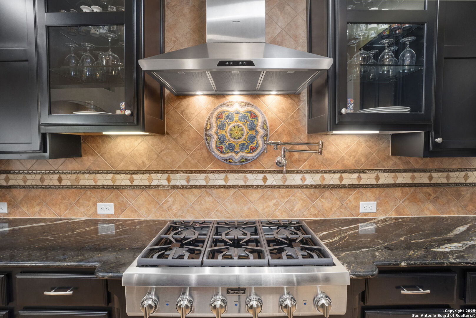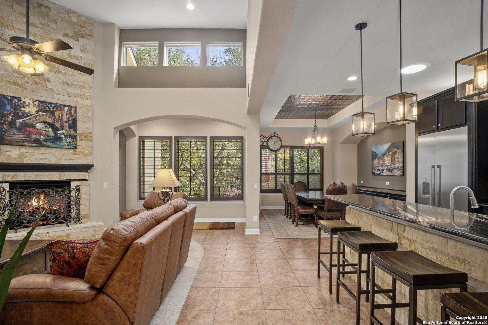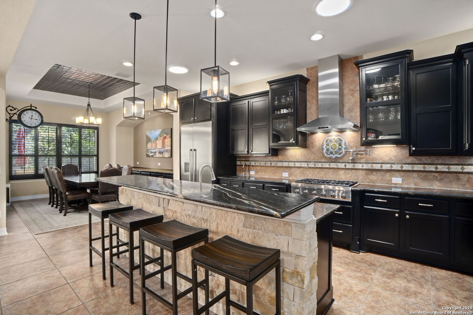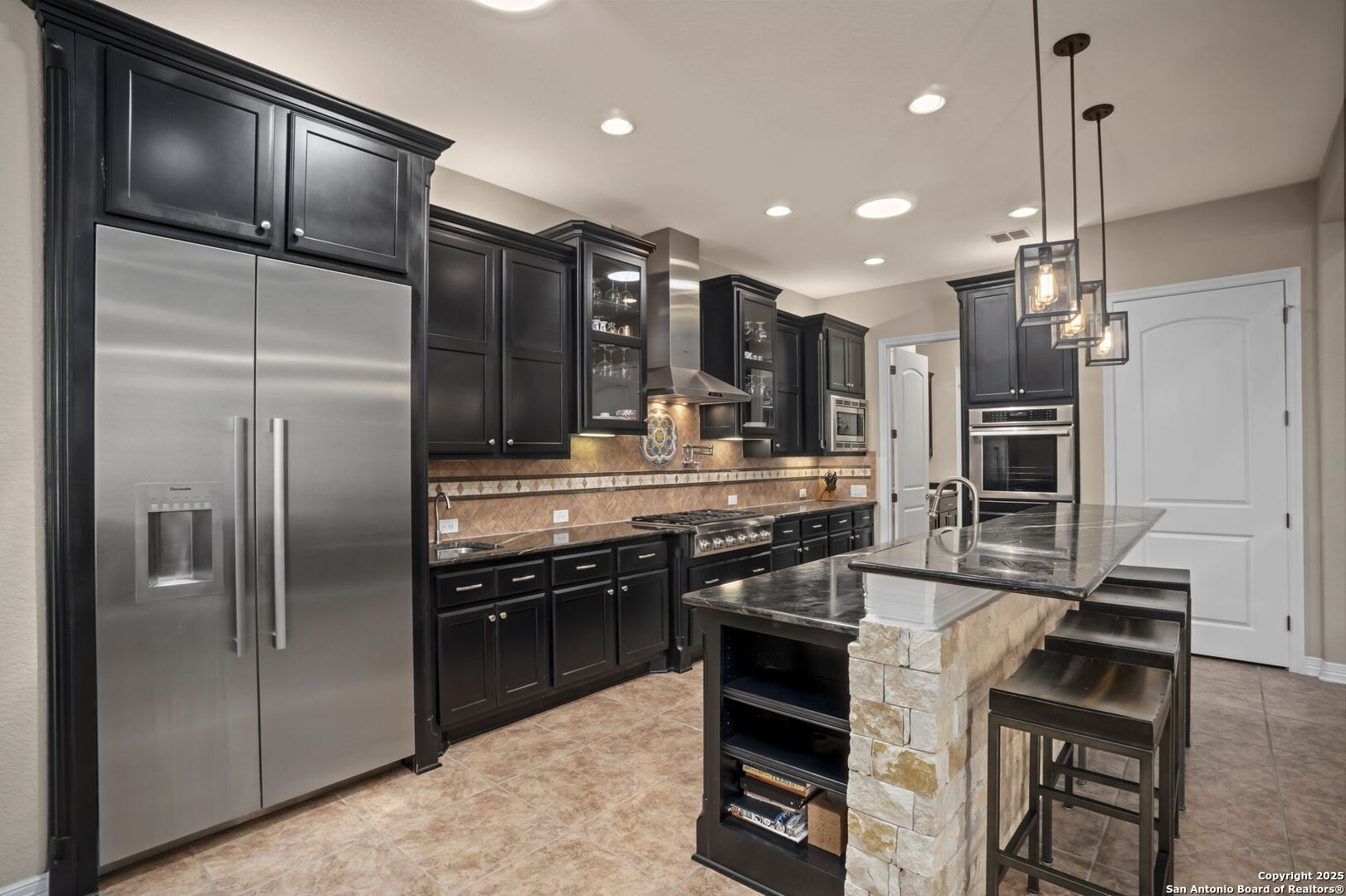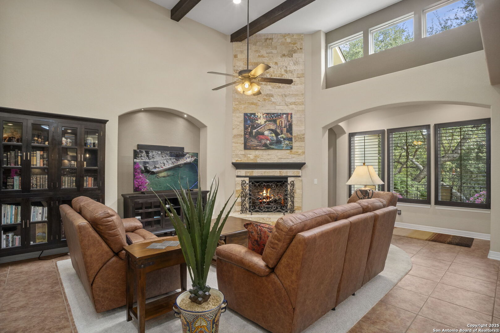 Welcome to this exceptional 3-bedroom home with a private casita, versatile flex space, and upscale finishes throughout, located in the highly sought-after gated community of Amorosa in Cibolo Canyons. Nestled on a premium greenbelt lot with live oak trees and direct access to the scenic walking trails, this single-story residence offers the perfect balance of comfort, style, and functionality. Step inside to discover an open-concept interior with soaring ceilings, skylights, and thoughtfully selected timeless finishes throughout. The main home includes two bedrooms with a flexible space ideal for a home office, study, or secondary lounge-tailored to meet your modern lifestyle needs. The heart of the home is a chef's gourmet kitchen, showcasing granite countertops throughout, custom cabinetry, built-in buffet and a spacious pantry. Thermador appliances, including a built-in refrigerator, 6-burner gas range, and new dishwasher (installed September 2025). The large oven provides space for your cooking and baking creations along with a built-in microwave, and an expansive center island with bar seating-perfect for entertaining. Natural light pours in from skylights and the adjacent dining area, framed by large windows overlooking the tranquil backyard. The inviting living room centers around a striking stone fireplace, ideal for cozy evenings or hosting gatherings. The spacious primary suite is a luxurious retreat, featuring tray ceilings, a spa-inspired walk-in shower, dual granite-top vanities, and an oversized walk-in custom-designed closet. Separate from the main living areas, connected by another large, covered courtyard with an outdoor stone fireplace, the private casita awaits, including a full bath, bar sink, space for refrigerator or wine cooler, and a custom-built Murphy bed-perfect for multi-generational living, guests, or a private studio. Enjoy relaxing on your back deck overlooking the beautifully landscaped backyard with live oak trees, shaded serenity, and direct access to the community trail system. Just beyond the native greenbelt lies the lush fairways of the TPC golf course, enhancing the peaceful setting. Landscaping is maintained by the HOA, allowing for a low-maintenance lifestyle and more time to enjoy the community's top-tier amenities. Residents of Cibolo Canyons have access to two amenity centers: Amenity Center 1: Lazy river, splash pad, Olympic-size pool, soccer field, playground, fitness center, meeting facilities, and on-site HOA staff. Amenity Center 2 (Amorosa): Olympic-size pool, splash pad, fitness center, BBQ grills, and clubhouse. A rare opportunity to own a home that combines thoughtful design, versatile spaces, and the serenity of golf course living-this one is truly a must-see.