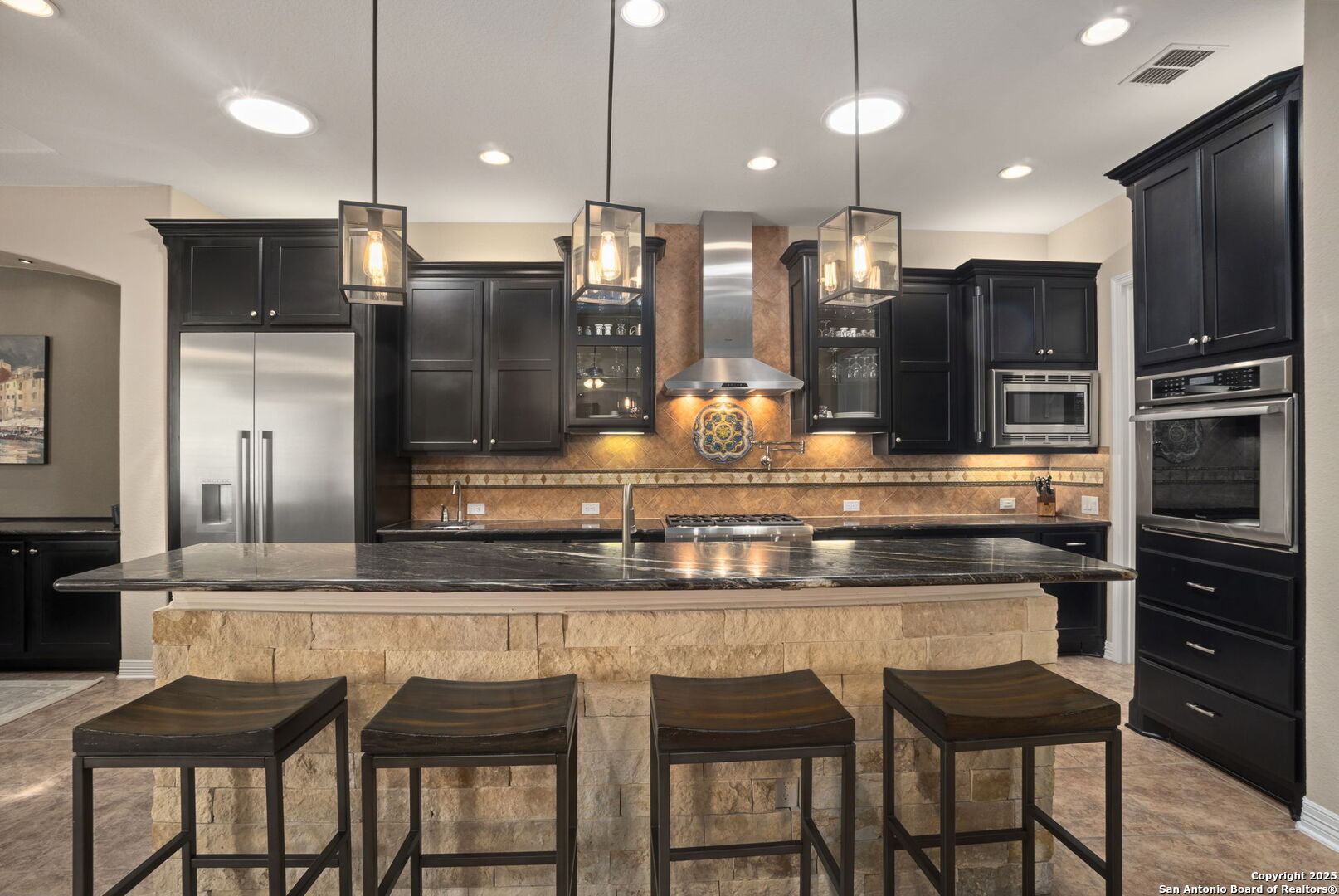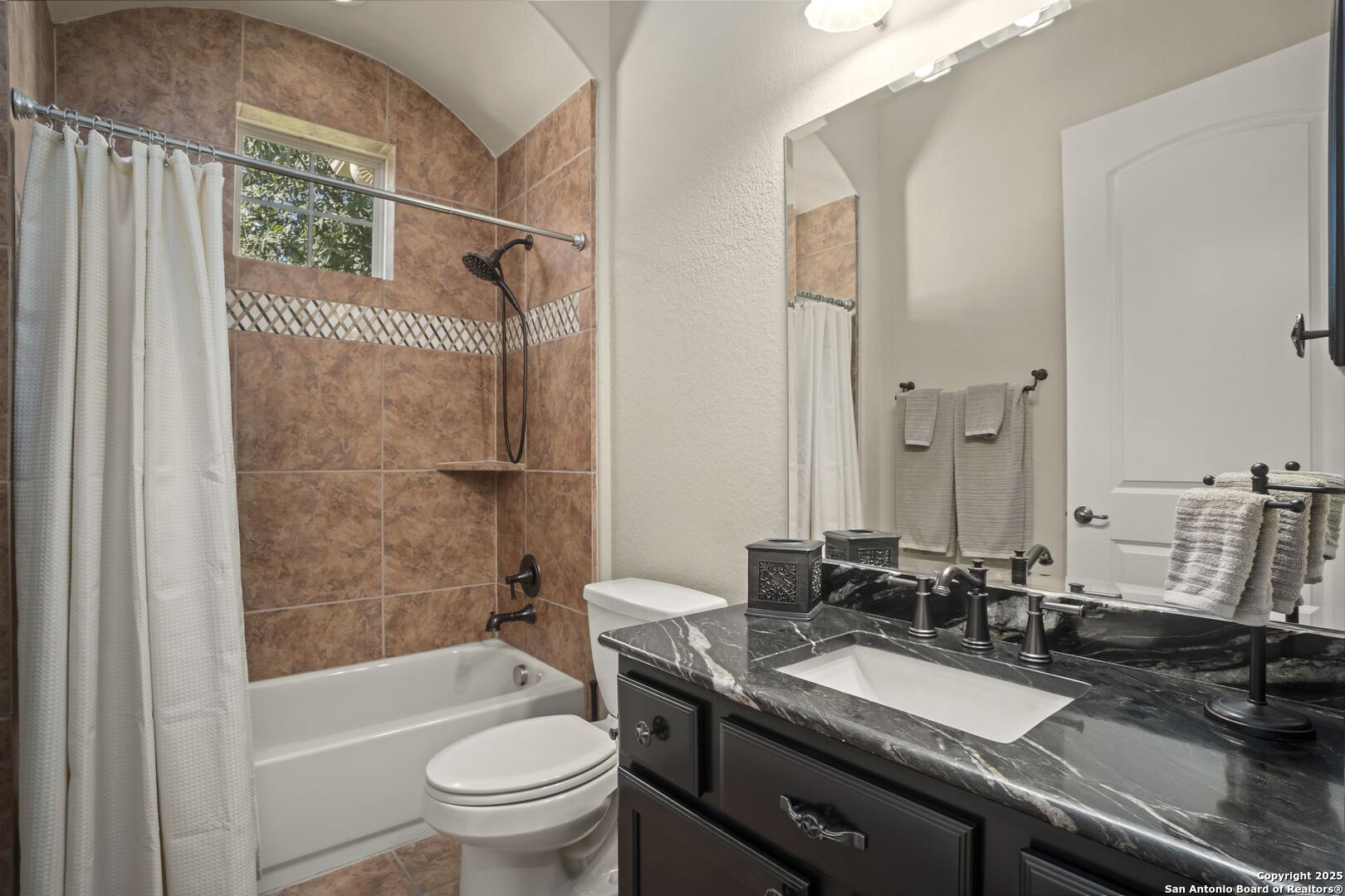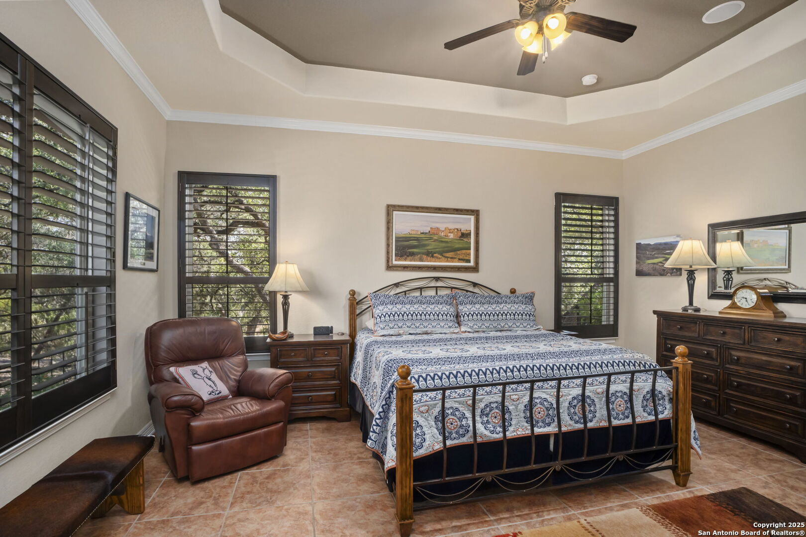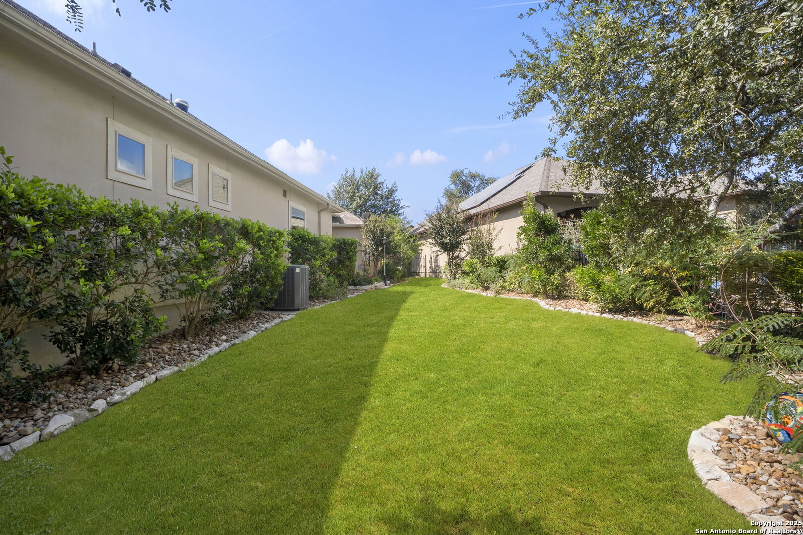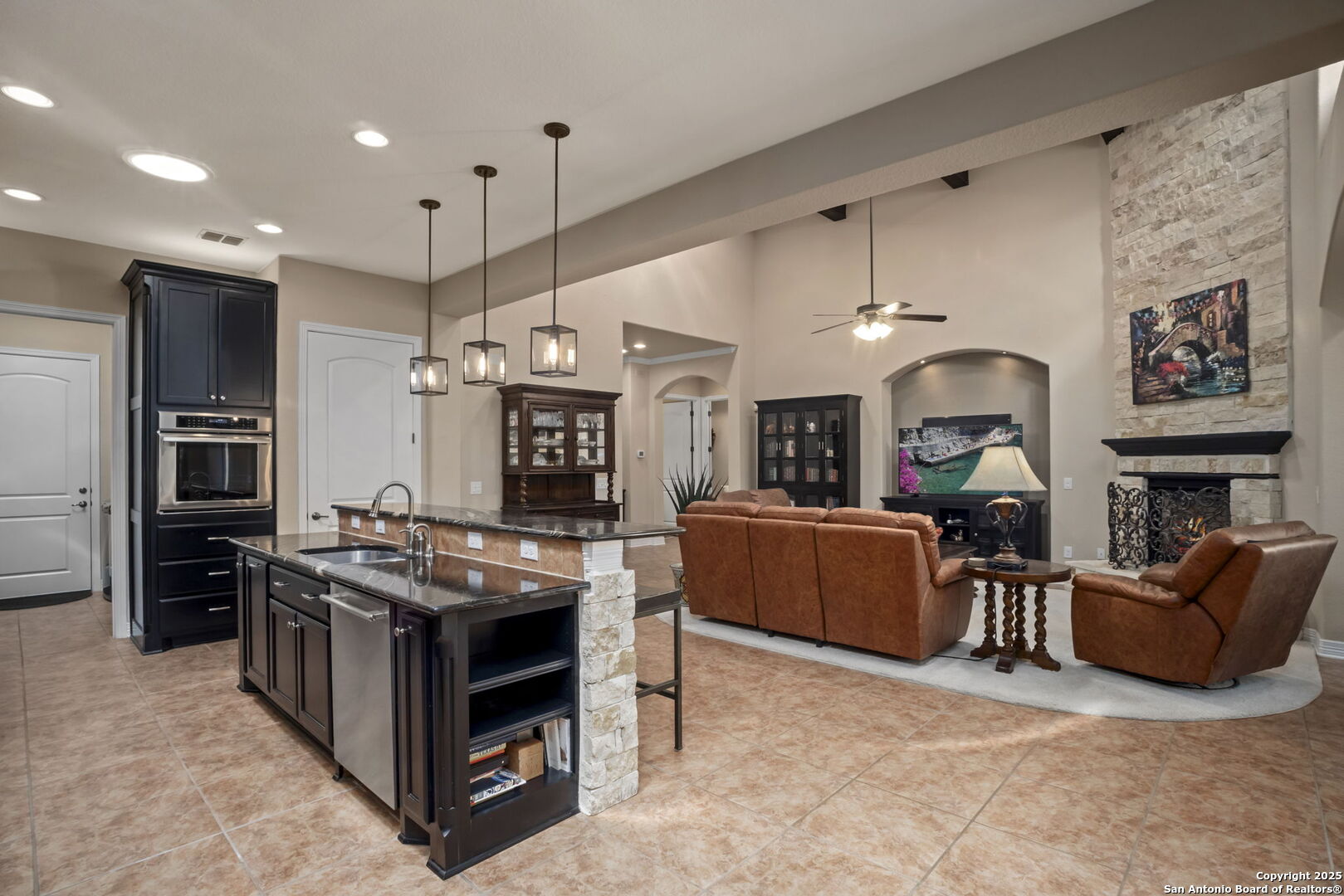 Welcome to this exceptional 3-bedroom home with a private casita, versatile flex space, and upscale finishes throughout, located in the highly sought-after gated community of Amorosa in Cibolo Canyons. Nestled on a premium greenbelt lot with live oak trees and direct access to the scenic walking trails, this single-story residence offers the perfect balance of comfort, style, and functionality. Step inside to discover an open-concept interior with soaring ceilings, skylights, and thoughtfully selected timeless finishes throughout. The main home includes two bedrooms with a flexible space ideal for a home office, study, or secondary lounge-tailored to meet your modern lifestyle needs. The heart of the home is a chef's gourmet kitchen, showcasing granite countertops throughout, custom cabinetry, built-in buffet and a spacious pantry. Thermador appliances, including a built-in refrigerator, 6-burner gas range, and new dishwasher (installed September 2025). The large oven provides space for your cooking and baking creations along with a built-in microwave, and an expansive center island with bar seating-perfect for entertaining. Natural light pours in from skylights and the adjacent dining area, framed by large windows overlooking the tranquil backyard. The inviting living room centers around a striking stone fireplace, ideal for cozy evenings or hosting gatherings. The spacious primary suite is a luxurious retreat, featuring tray ceilings, a spa-inspired walk-in shower, dual granite-top vanities, and an oversized walk-in custom-designed closet. Separate from the main living areas, connected by another large, covered courtyard with an outdoor stone fireplace, the private casita awaits, including a full bath, bar sink, space for refrigerator or wine cooler, and a custom-built Murphy bed-perfect for multi-generational living, guests, or a private studio. Enjoy relaxing on your back deck overlooking the beautifully landscaped backyard with live oak trees, shaded serenity, and direct access to the community trail system. Just beyond the native greenbelt lies the lush fairways of the TPC golf course, enhancing the peaceful setting. Landscaping is maintained by the HOA, allowing for a low-maintenance lifestyle and more time to enjoy the community's top-tier amenities. Residents of Cibolo Canyons have access to two amenity centers: Amenity Center 1: Lazy river, splash pad, Olympic-size pool, soccer field, playground, fitness center, meeting facilities, and on-site HOA staff. Amenity Center 2 (Amorosa): Olympic-size pool, splash pad, fitness center, BBQ grills, and clubhouse. A rare opportunity to own a home that combines thoughtful design, versatile spaces, and the serenity of golf course living-this one is truly a must-see.