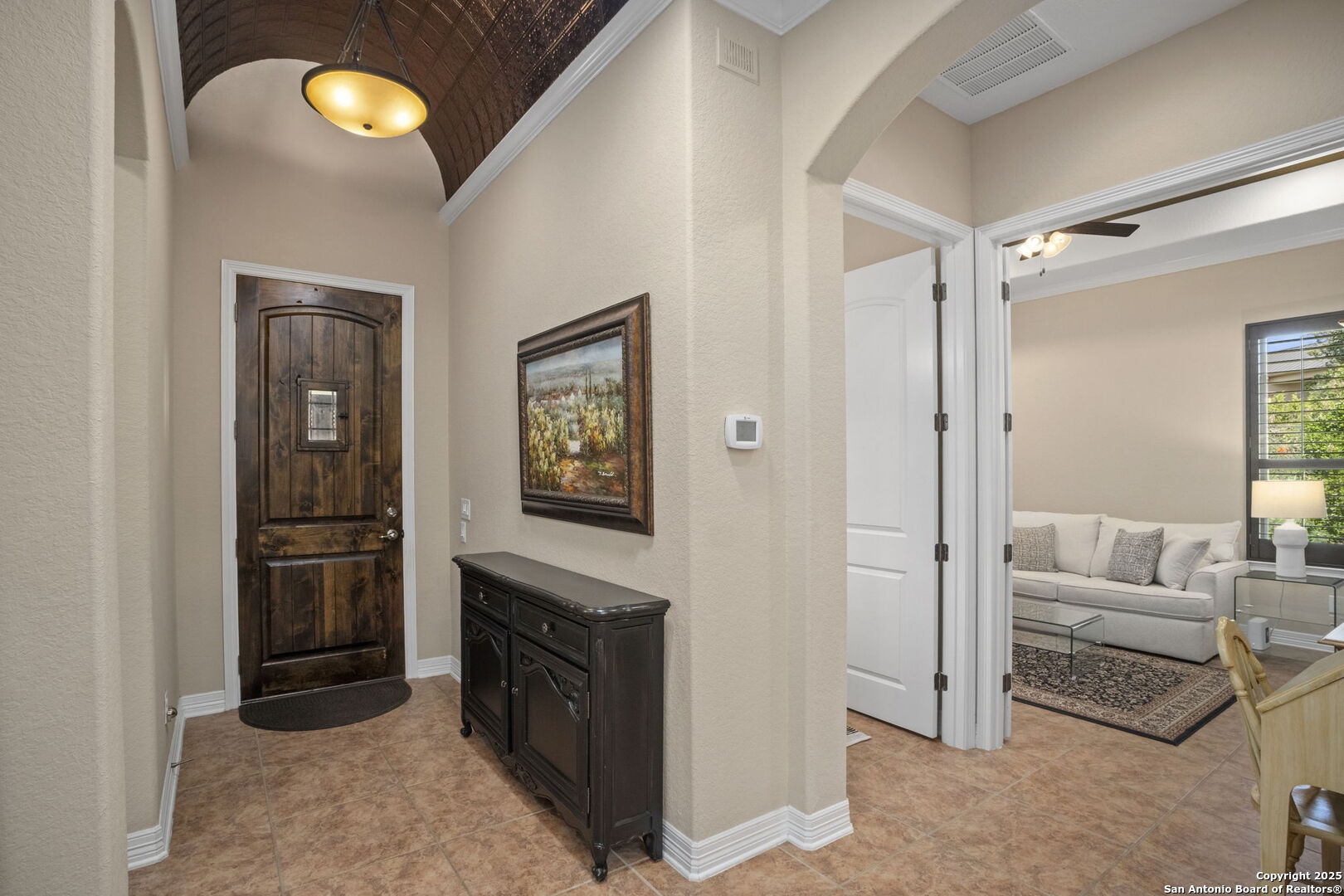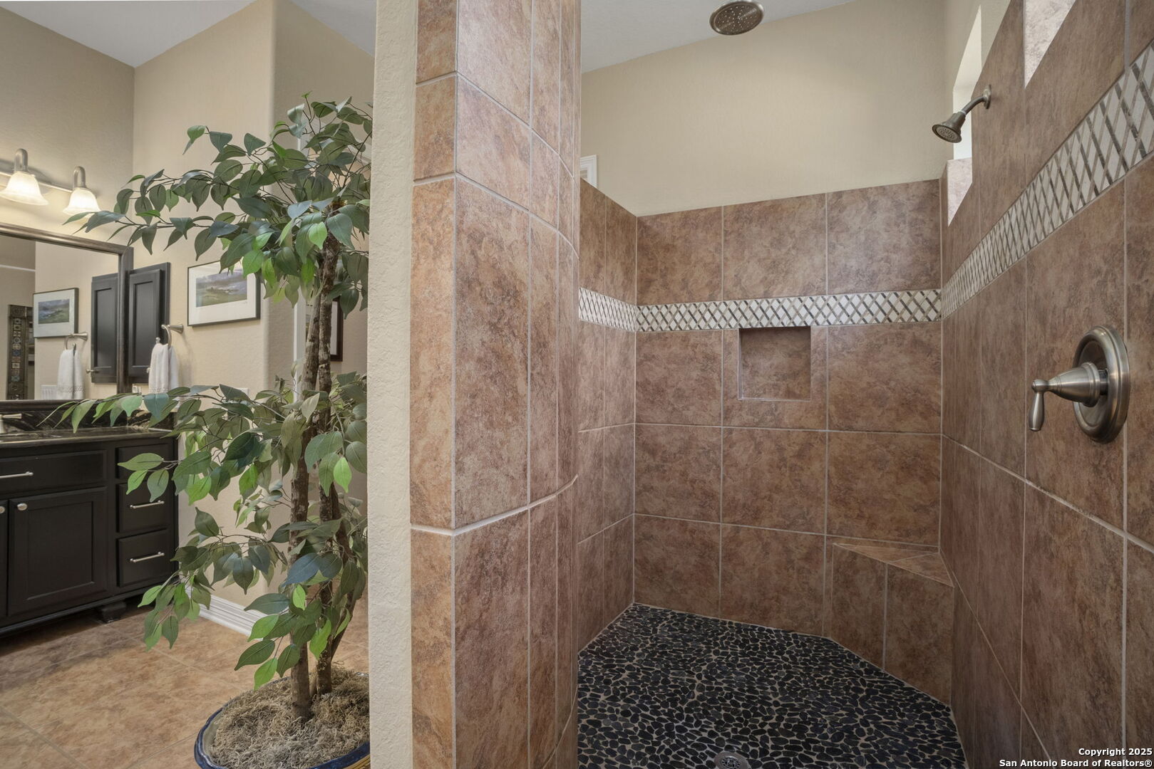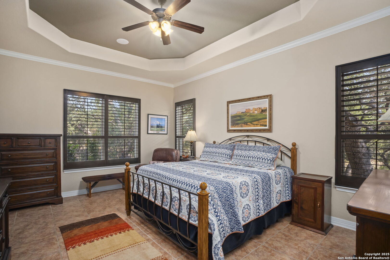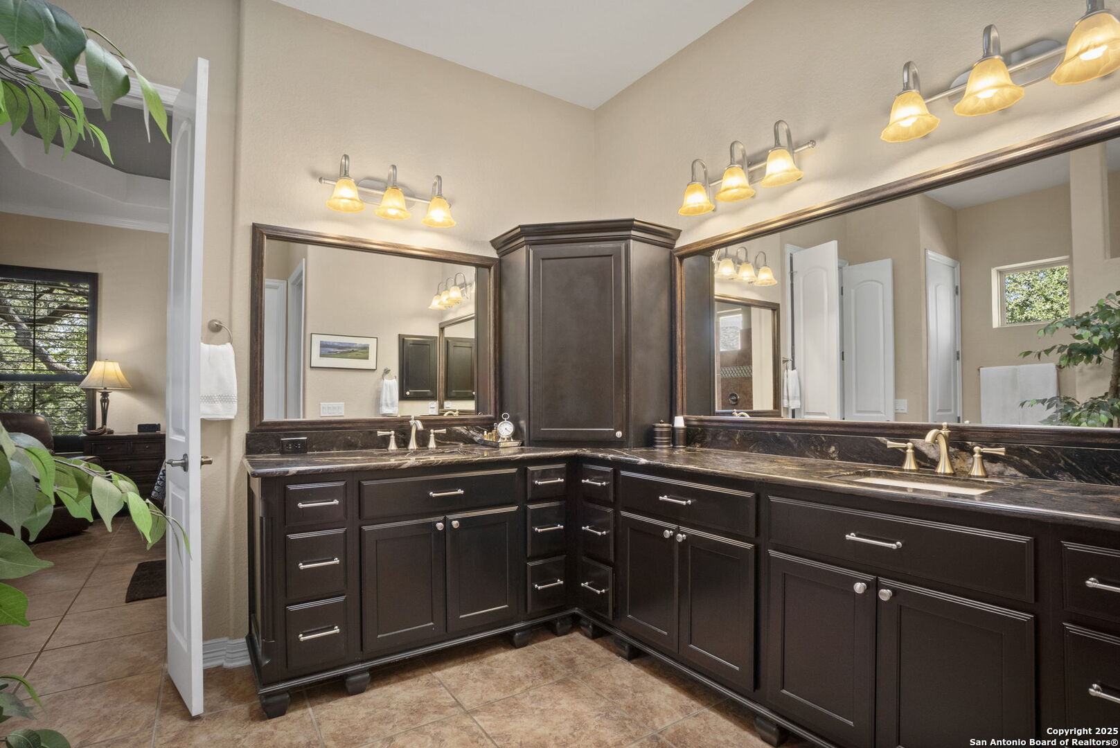Welcome to this exceptional 3-bedroom home with a private casita, versatile flex space, and upscale finishes throughout, located in the highly sought-after gated community of Amorosa in Cibolo Canyons. Nestled on a premium greenbelt lot with live oak trees and direct access to the scenic walking trails, this single-story residence offers the perfect balance of comfort, style, and functionality. Step inside to discover an open-concept interior with soaring ceilings, skylights, and thoughtfully selected timeless finishes throughout. The main home includes two bedrooms with a flexible space ideal for a home office, study, or secondary lounge-tailored to meet your modern lifestyle needs. The heart of the home is a chef's gourmet kitchen, showcasing granite countertops throughout, custom cabinetry, built-in buffet and a spacious pantry. Thermador appliances, including a built-in refrigerator, 6-burner gas range, and new dishwasher (installed September 2025). The large oven provides space for your cooking and baking creations along with a built-in microwave, and an expansive center island with bar seating-perfect for entertaining. Natural light pours in from skylights and the adjacent dining area, framed by large windows overlooking the tranquil backyard. The inviting living room centers around a striking stone fireplace, ideal for cozy evenings or hosting gatherings. The spacious primary suite is a luxurious retreat, featuring tray ceilings, a spa-inspired walk-in shower, dual granite-top vanities, and an oversized walk-in custom-designed closet. Separate from the main living areas, connected by another large, covered courtyard with an outdoor stone fireplace, the private casita awaits, including a full bath, bar sink, space for refrigerator or wine cooler, and a custom-built Murphy bed-perfect for multi-generational living, guests, or a private studio. Enjoy relaxing on your back deck overlooking the beautifully landscaped backyard with live oak trees, shaded serenity, and direct access to the community trail system. Just beyond the native greenbelt lies the lush fairways of the TPC golf course, enhancing the peaceful setting. Landscaping is maintained by the HOA, allowing for a low-maintenance lifestyle and more time to enjoy the community's top-tier amenities. Residents of Cibolo Canyons have access to two amenity centers: Amenity Center 1: Lazy river, splash pad, Olympic-size pool, soccer field, playground, fitness center, meeting facilities, and on-site HOA staff. Amenity Center 2 (Amorosa): Olympic-size pool, splash pad, fitness center, BBQ grills, and clubhouse. A rare opportunity to own a home that combines thoughtful design, versatile spaces, and the serenity of golf course living-this one is truly a must-see.