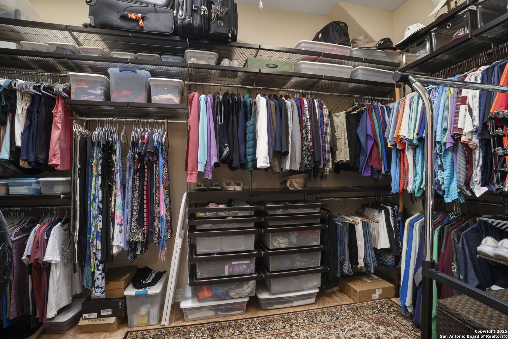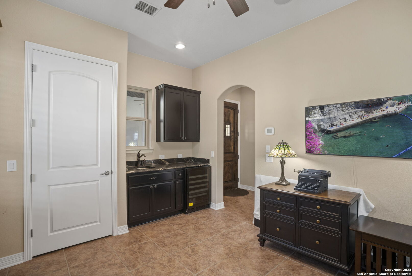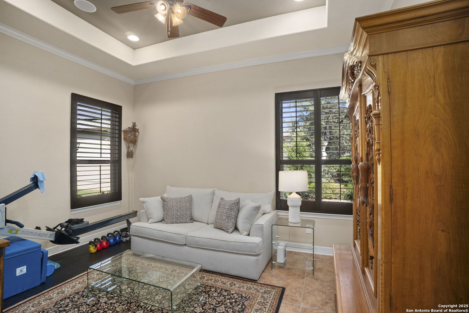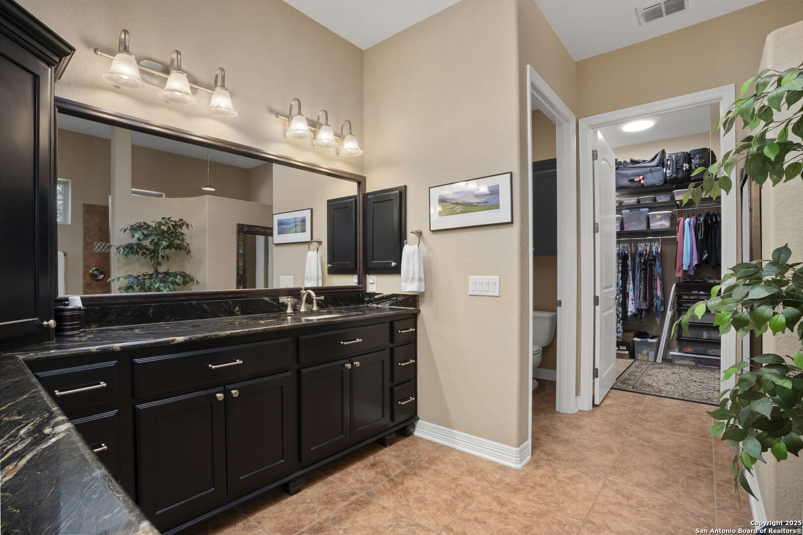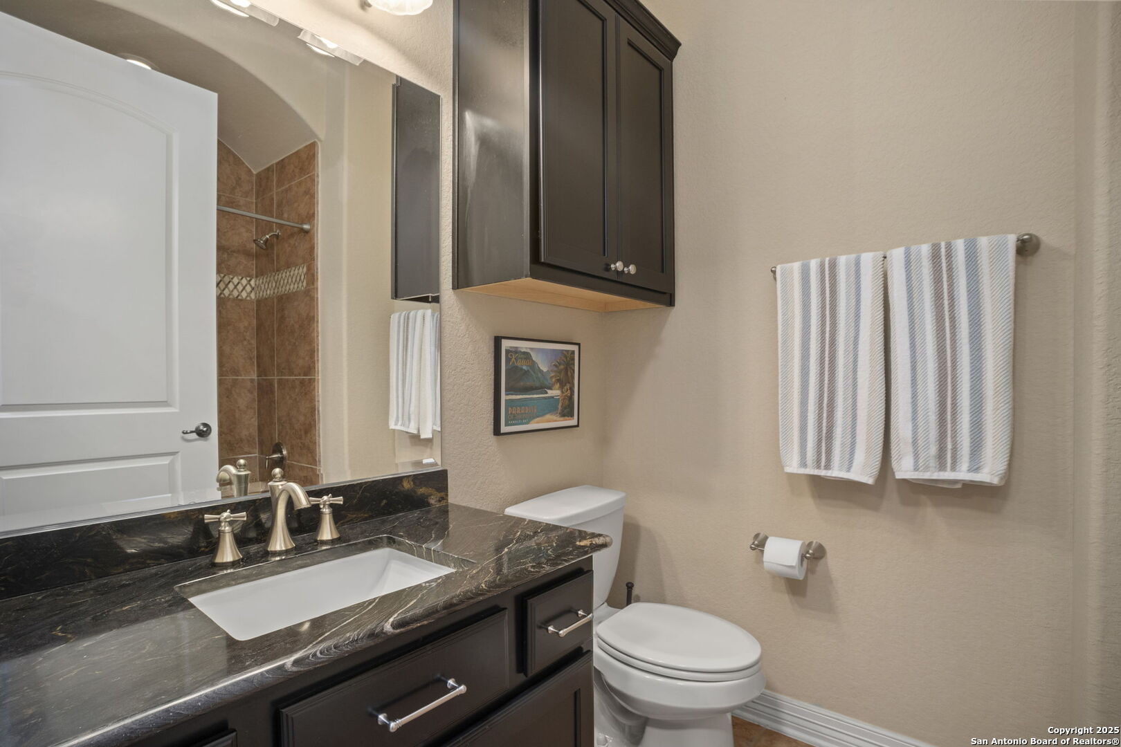 Welcome to this exceptional 3-bedroom home with a private casita, versatile flex space, and upscale finishes throughout, located in the highly sought-after gated community of Amorosa in Cibolo Canyons. Nestled on a premium greenbelt lot with live oak trees and direct access to the scenic walking trails, this single-story residence offers the perfect balance of comfort, style, and functionality. Step inside to discover an open-concept interior with soaring ceilings, skylights, and thoughtfully selected timeless finishes throughout. The main home includes two bedrooms with a flexible space ideal for a home office, study, or secondary lounge-tailored to meet your modern lifestyle needs. The heart of the home is a chef's gourmet kitchen, showcasing granite countertops throughout, custom cabinetry, built-in buffet and a spacious pantry. Thermador appliances, including a built-in refrigerator, 6-burner gas range, and new dishwasher (installed September 2025). The large oven provides space for your cooking and baking creations along with a built-in microwave, and an expansive center island with bar seating-perfect for entertaining. Natural light pours in from skylights and the adjacent dining area, framed by large windows overlooking the tranquil backyard. The inviting living room centers around a striking stone fireplace, ideal for cozy evenings or hosting gatherings. The spacious primary suite is a luxurious retreat, featuring tray ceilings, a spa-inspired walk-in shower, dual granite-top vanities, and an oversized walk-in custom-designed closet. Separate from the main living areas, connected by another large, covered courtyard with an outdoor stone fireplace, the private casita awaits, including a full bath, bar sink, space for refrigerator or wine cooler, and a custom-built Murphy bed-perfect for multi-generational living, guests, or a private studio. Enjoy relaxing on your back deck overlooking the beautifully landscaped backyard with live oak trees, shaded serenity, and direct access to the community trail system. Just beyond the native greenbelt lies the lush fairways of the TPC golf course, enhancing the peaceful setting. Landscaping is maintained by the HOA, allowing for a low-maintenance lifestyle and more time to enjoy the community's top-tier amenities. Residents of Cibolo Canyons have access to two amenity centers: Amenity Center 1: Lazy river, splash pad, Olympic-size pool, soccer field, playground, fitness center, meeting facilities, and on-site HOA staff. Amenity Center 2 (Amorosa): Olympic-size pool, splash pad, fitness center, BBQ grills, and clubhouse. A rare opportunity to own a home that combines thoughtful design, versatile spaces, and the serenity of golf course living-this one is truly a must-see.