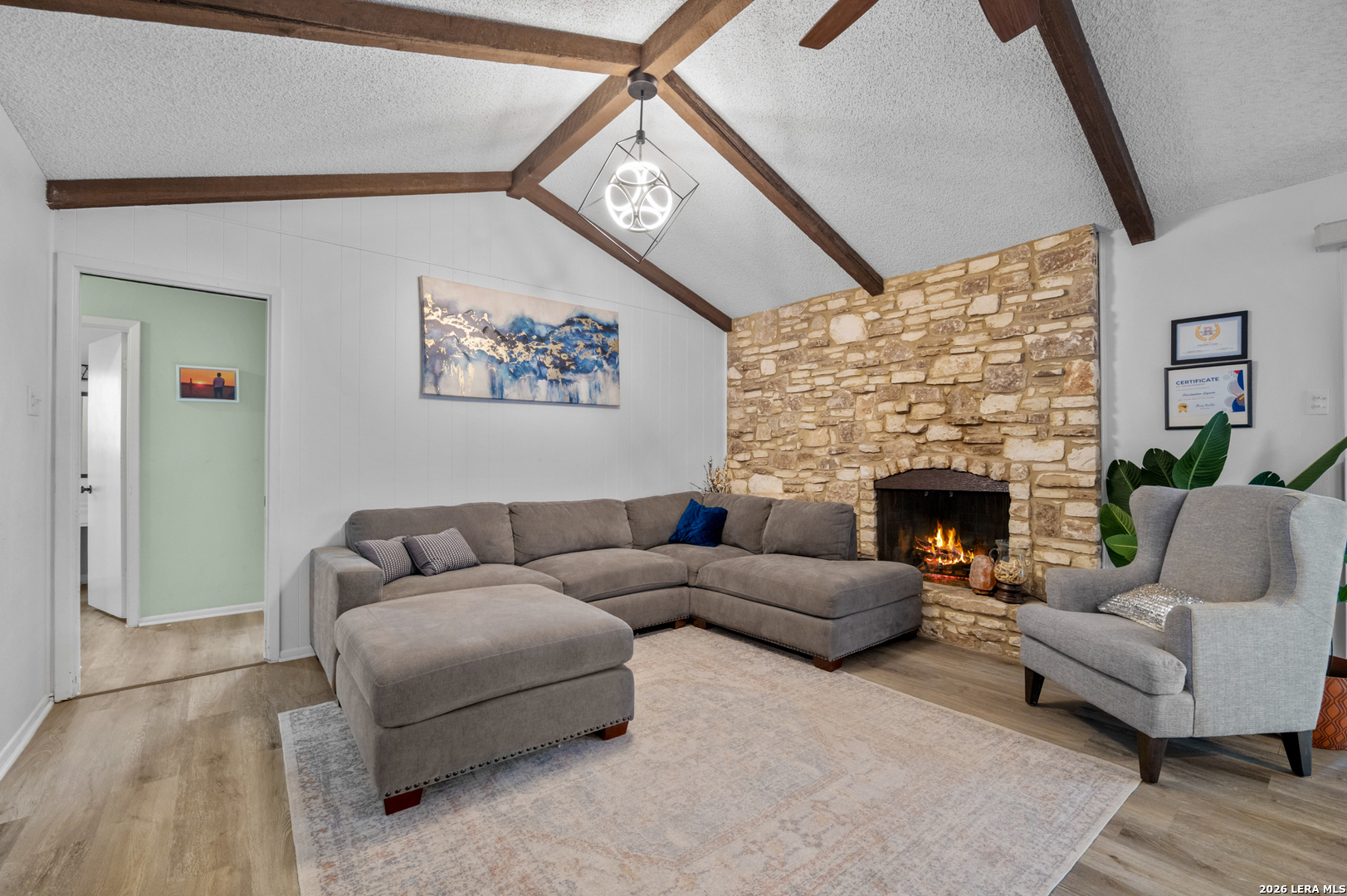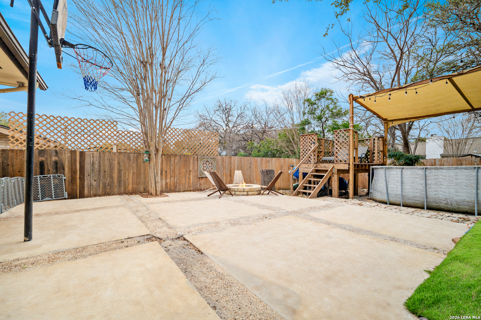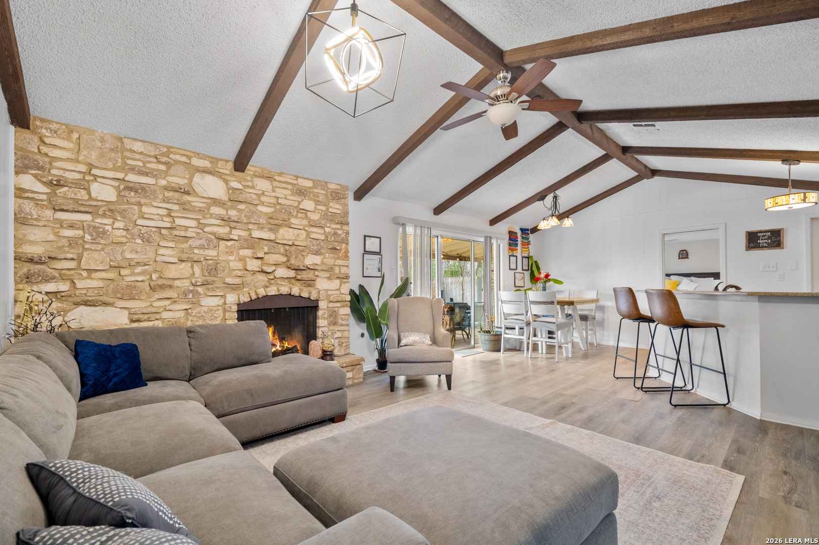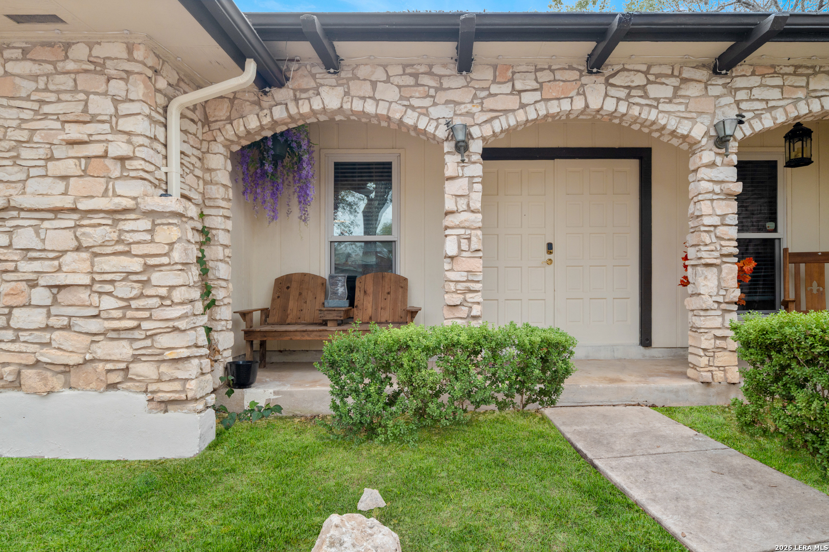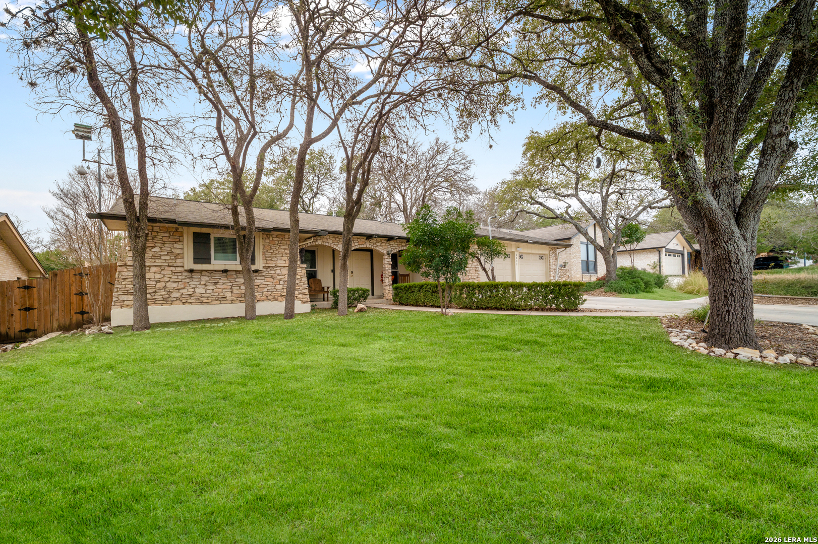 Welcome to this beautifully maintained 3 bedroom home located in University Oaks. PRIME LOCATION - This home is only 5 minutes away from La Cantera/Rim area, minutes away from the medical center, many shops & restaurants and only 20 minutes from downtown!!! This home features a striking rock exterior and a spacious covered front sitting porch. Inside, you'll find a dedicated study and a separate dining room, ideal for both work and entertaining. The expansive family room showcases an exposed beam ceiling and a stunning rock fireplace, creating a warm and inviting atmosphere. The updated kitchen is equipped with Silestone countertops, custom cabinetry with soft-close drawers, two pantries, and elegant Kichler lighting fixtures. The split primary suite includes a sitting area and offers privacy and comfort. A sliding glass door opens to a covered patio overlooking a beautiful backyard with an above ground pool perfect for outdoor enjoyment. The garage includes additional storage cabinets and a utility sink for added convenience. Recent updates include a roof replacement in 2017 and Andersen window replacements in 2014. Schedule your showing today and take advantage of living in one of the best established areas in San Antonio!