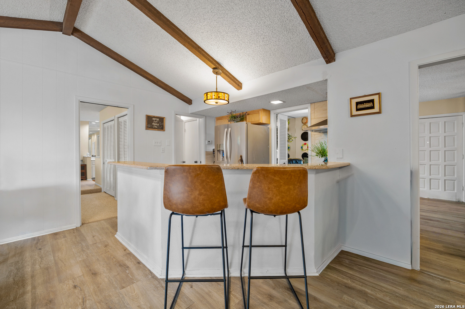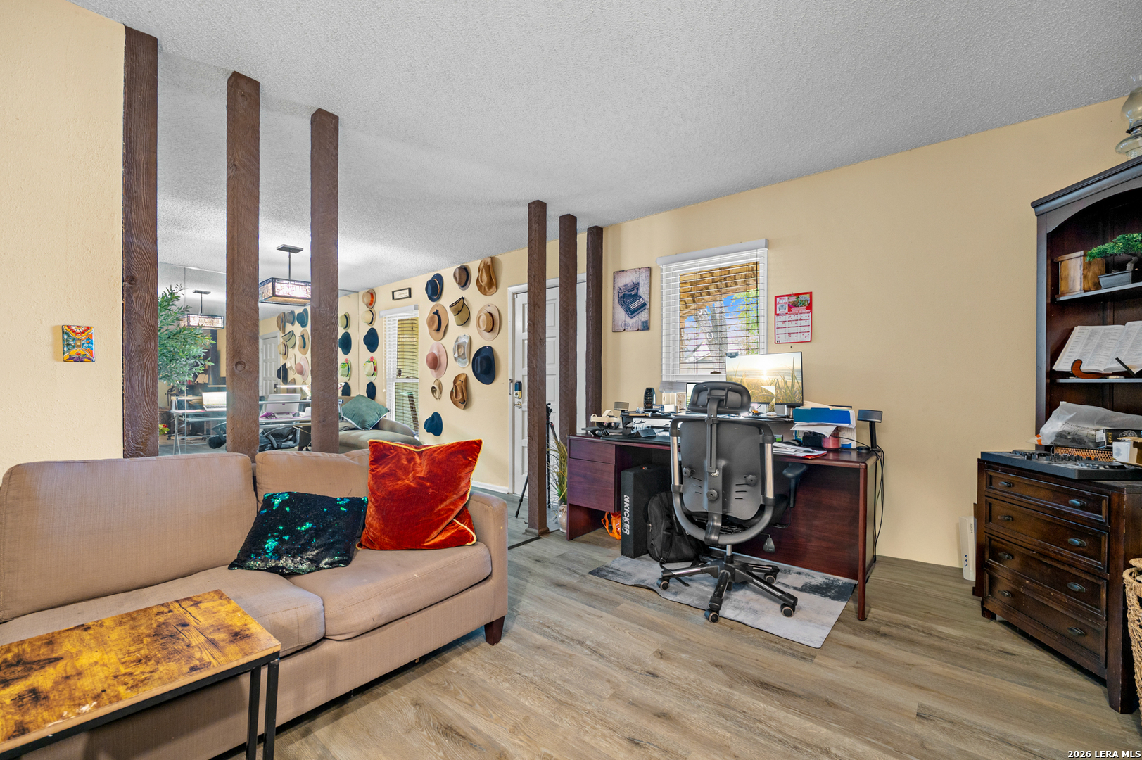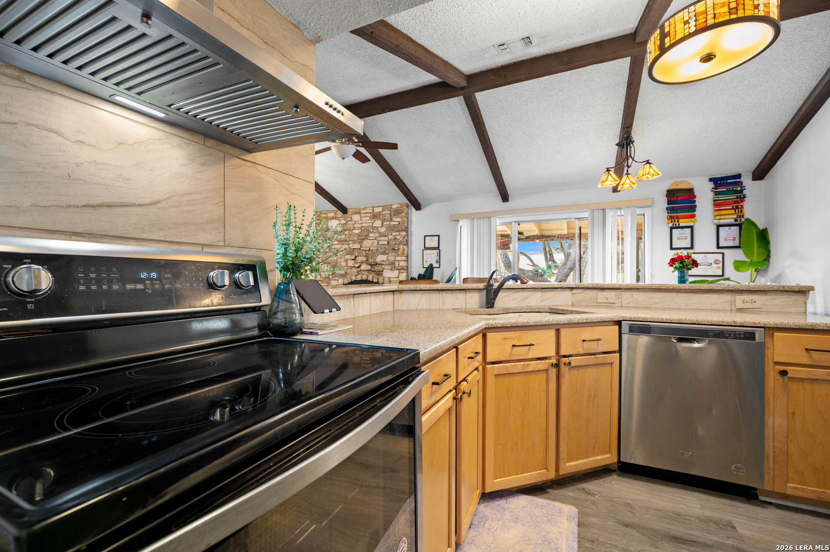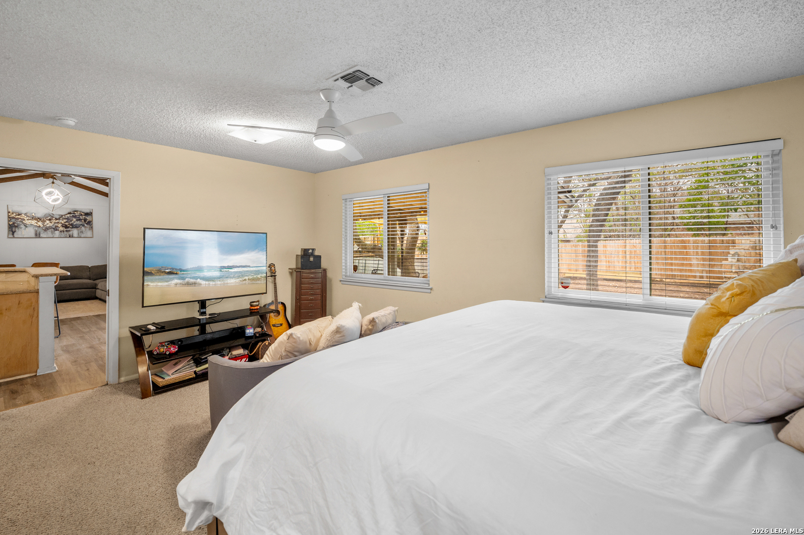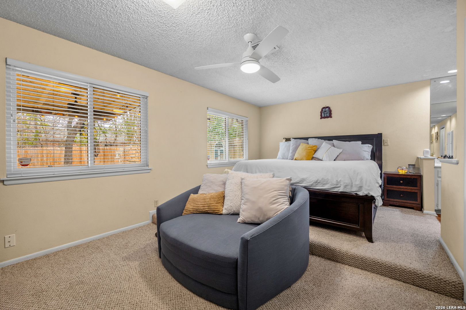 Welcome to this beautifully maintained 3 bedroom home located in University Oaks. PRIME LOCATION - This home is only 5 minutes away from La Cantera/Rim area, minutes away from the medical center, many shops & restaurants and only 20 minutes from downtown!!! This home features a striking rock exterior and a spacious covered front sitting porch. Inside, you'll find a dedicated study and a separate dining room, ideal for both work and entertaining. The expansive family room showcases an exposed beam ceiling and a stunning rock fireplace, creating a warm and inviting atmosphere. The updated kitchen is equipped with Silestone countertops, custom cabinetry with soft-close drawers, two pantries, and elegant Kichler lighting fixtures. The split primary suite includes a sitting area and offers privacy and comfort. A sliding glass door opens to a covered patio overlooking a beautiful backyard with an above ground pool perfect for outdoor enjoyment. The garage includes additional storage cabinets and a utility sink for added convenience. Recent updates include a roof replacement in 2017 and Andersen window replacements in 2014. Schedule your showing today and take advantage of living in one of the best established areas in San Antonio!