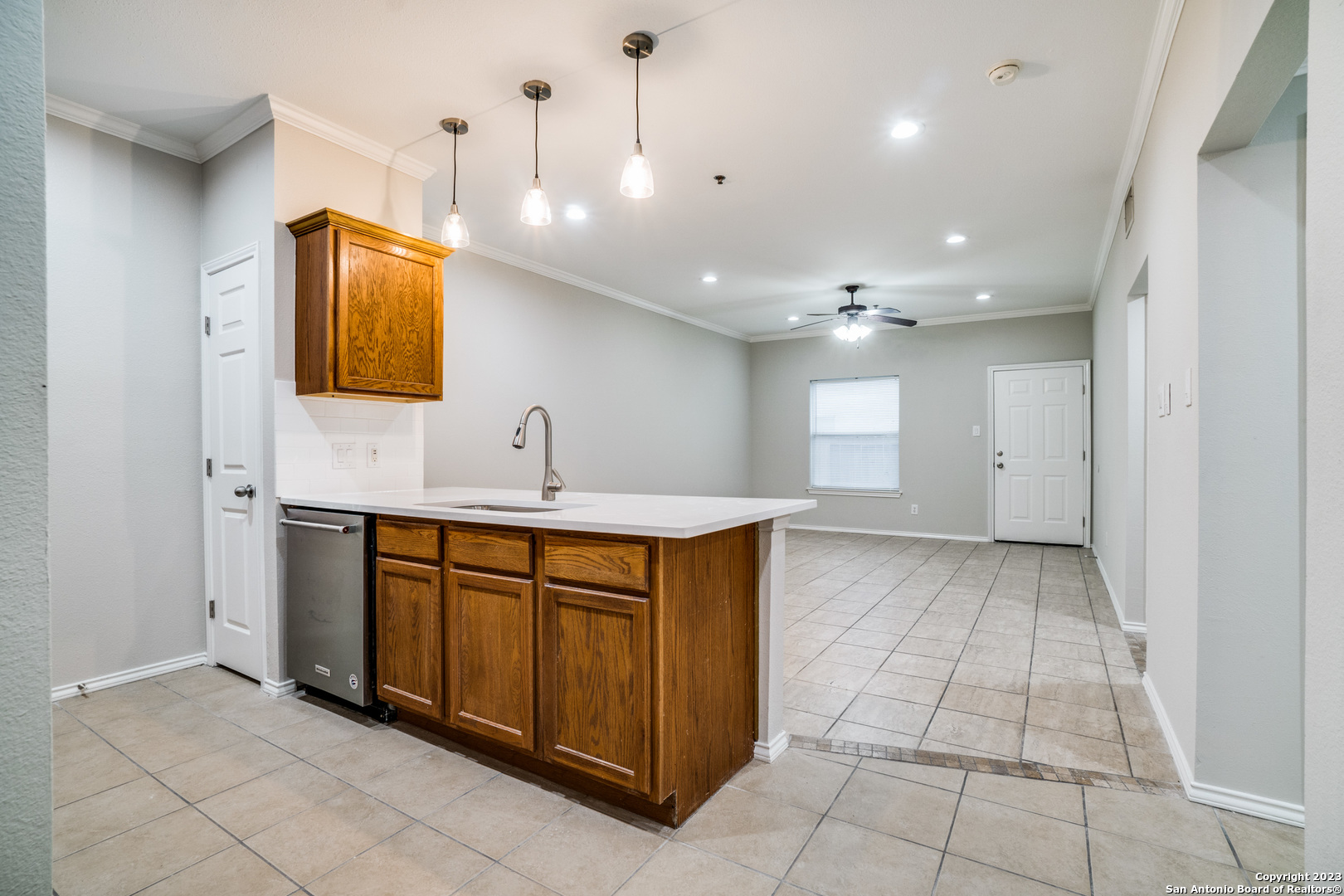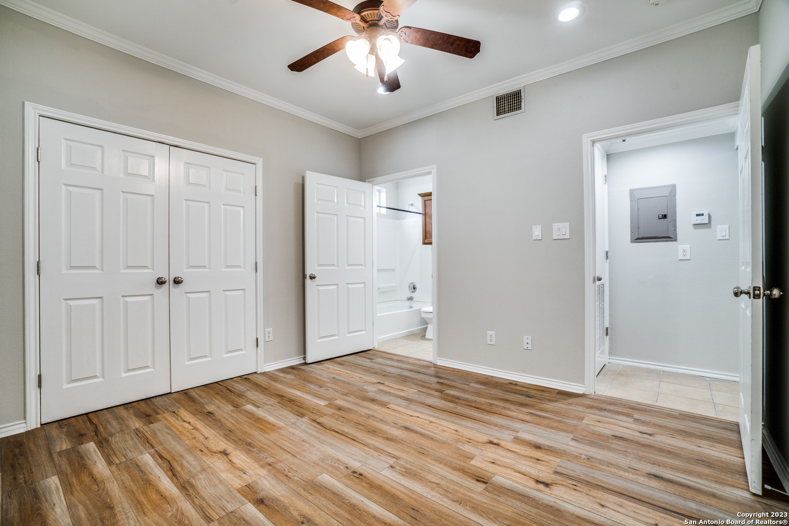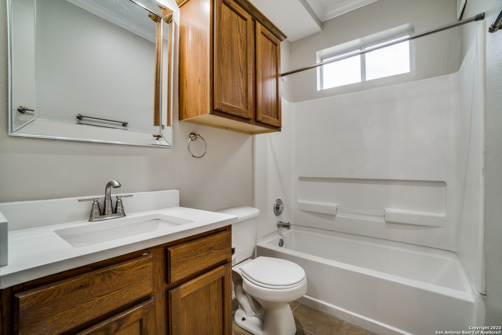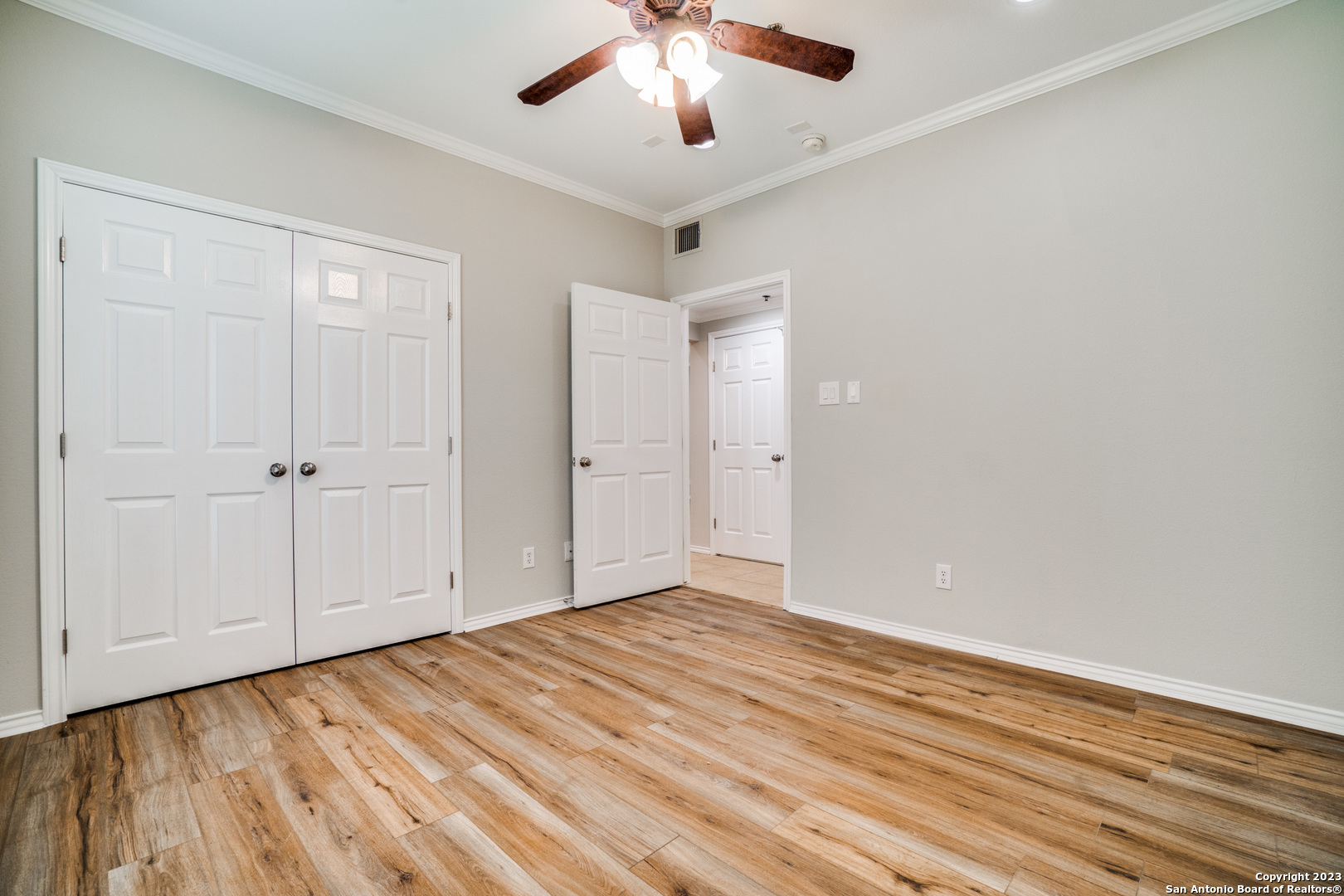 Charming 2-bedroom, 2-bathroom downstairs unit boasting 1,100 sq ft of comfortable living space. Freshly painted throughout, this home features high ceilings and stylish tile/vinyl wood-look flooring (no carpet) for a sleek, modern feel. The contemporary kitchen shines with quartz countertops and brand-new stainless steel refrigerator, dishwasher, and range. Enjoy a welcoming living area with ceiling fans and a convenient washer/dryer hookup. A small yard adds outdoor enjoyment, while ample parking provides ease for residents and guests. Ideal location moments from SA Medical Center, USAA, UTSA, and nearby shopping, with quick access to IH-10 and Loop 410. Move-in ready in a fantastic area-don't miss this bright, inviting home.
