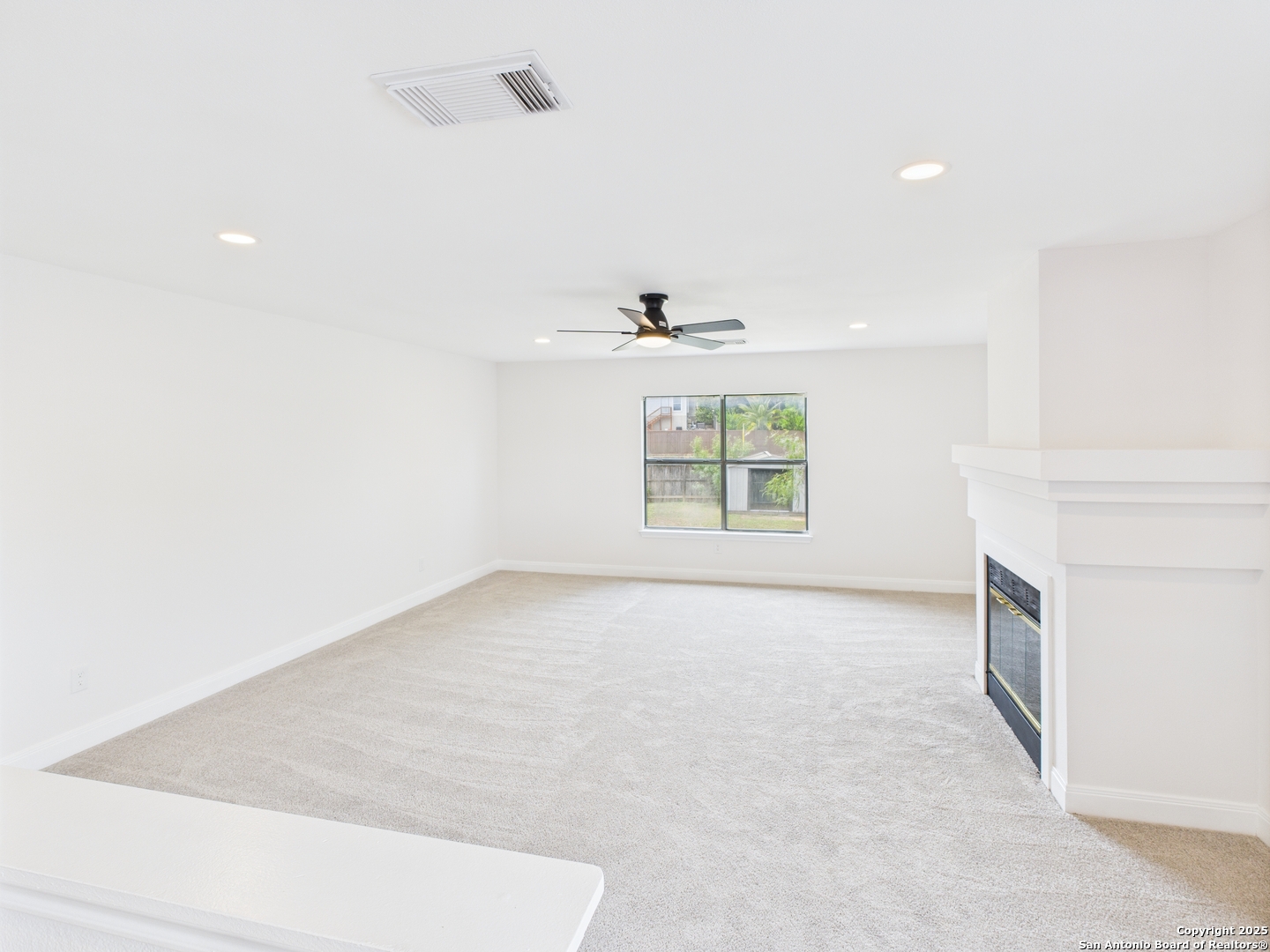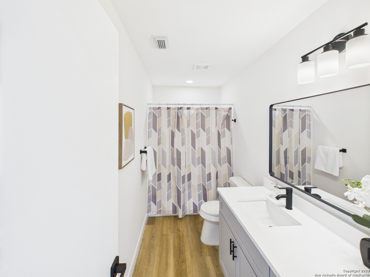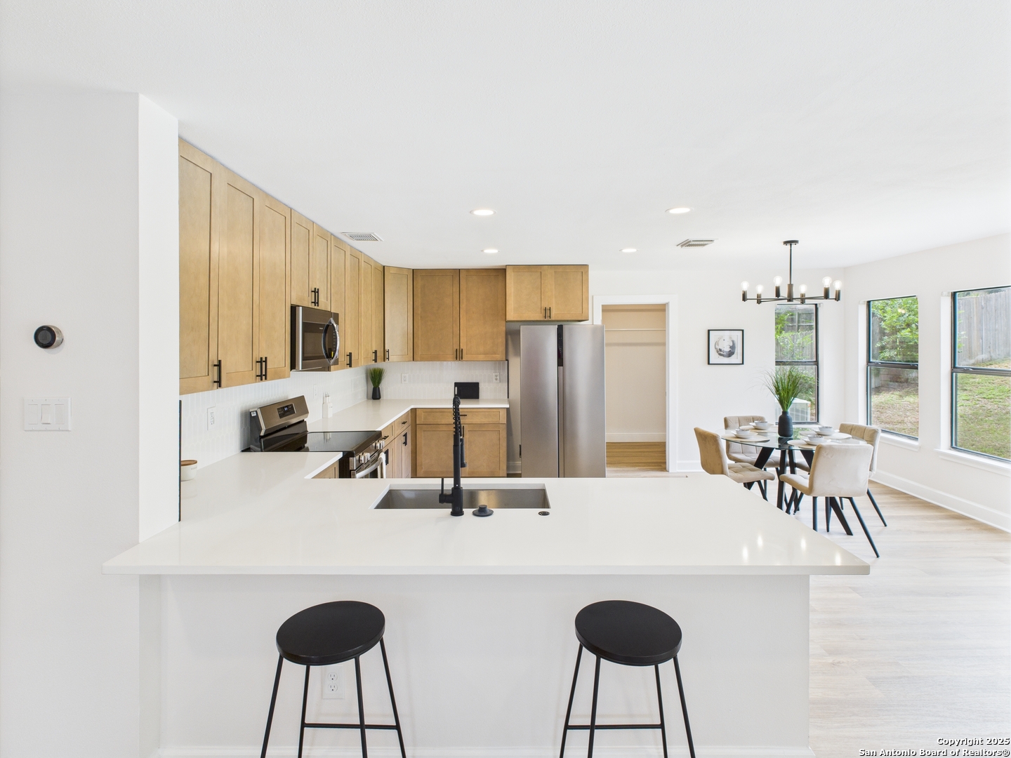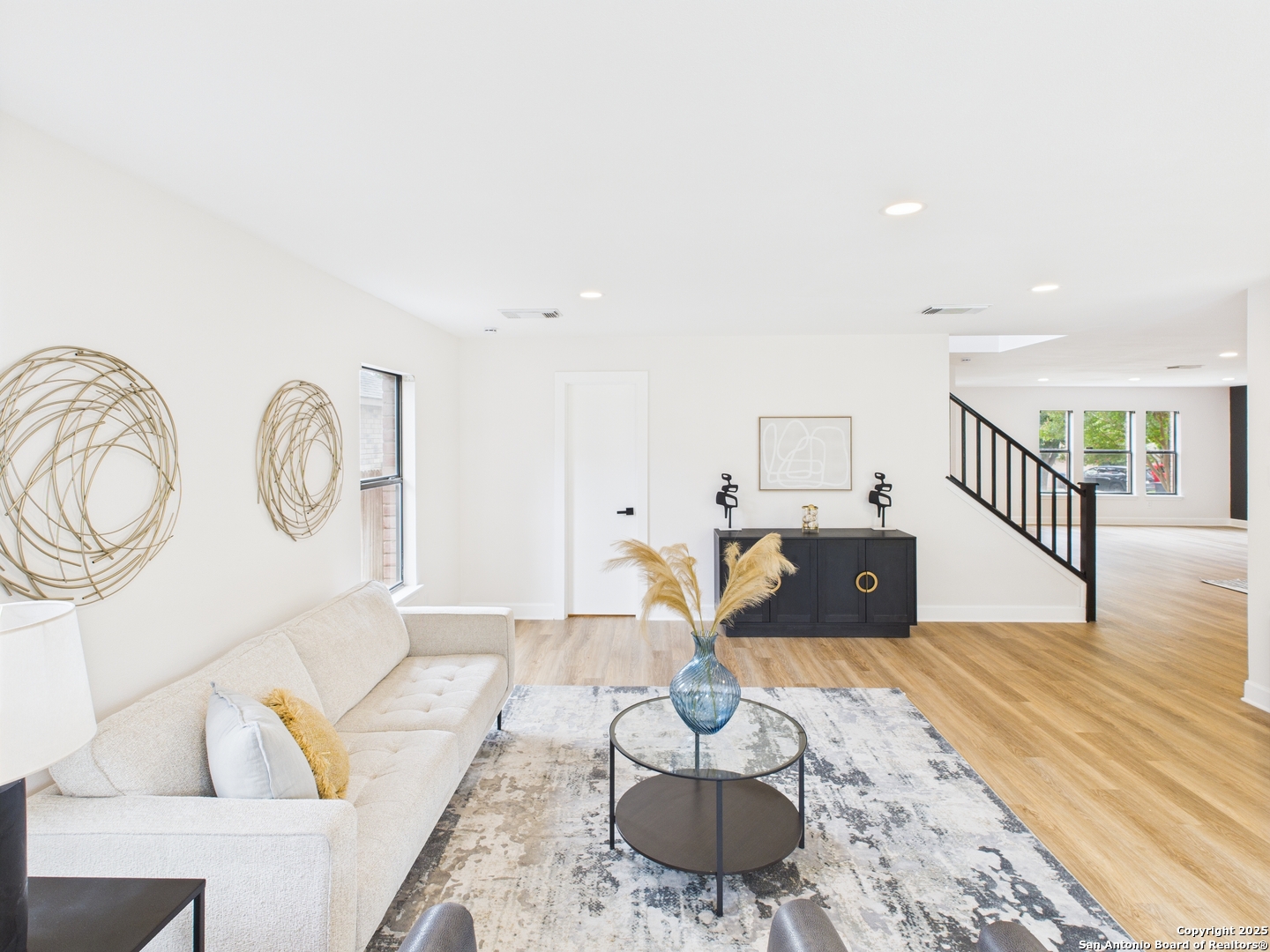 This beautifully updated 4-bedroom, 2.5-bath home is move-in ready and filled with modern upgrades. The open floor plan features fresh paint, recessed lighting, and new luxury vinyl plank flooring throughout the main level. The remodeled kitchen boasts custom cabinetry, quartz countertops, stainless steel appliances, and a farmhouse sink with matte black finishes. Upstairs, the spacious primary suite offers plush carpet, abundant natural light, and a spa-inspired bath with a dual vanity and frameless glass shower. With a second living area, cozy fireplace, and a large fenced backyard surrounded by mature trees, this home combines comfort, style, and functionality-all in a great neighborhood close to schools, shopping, dining, and major highways.