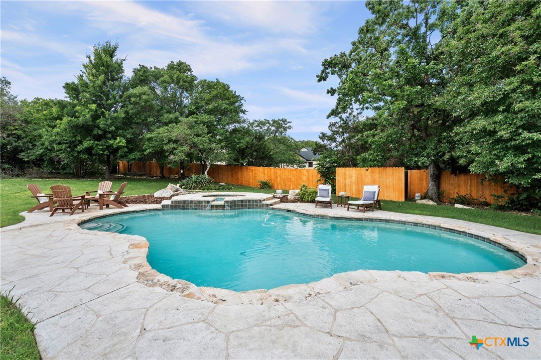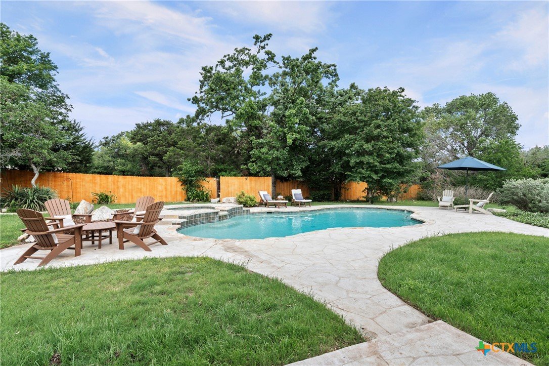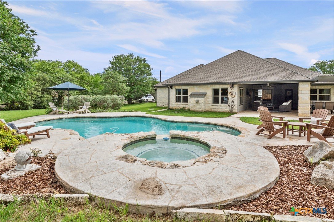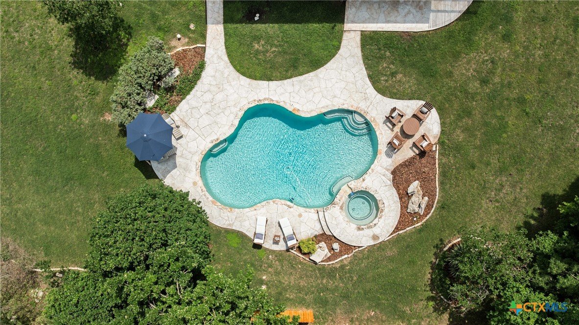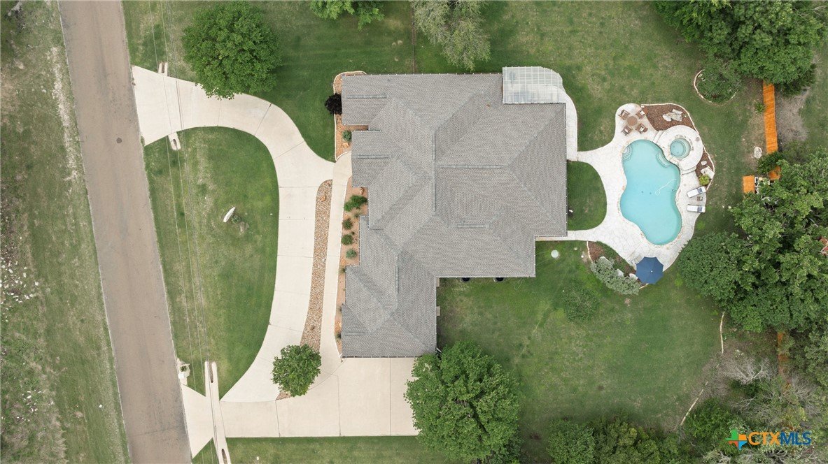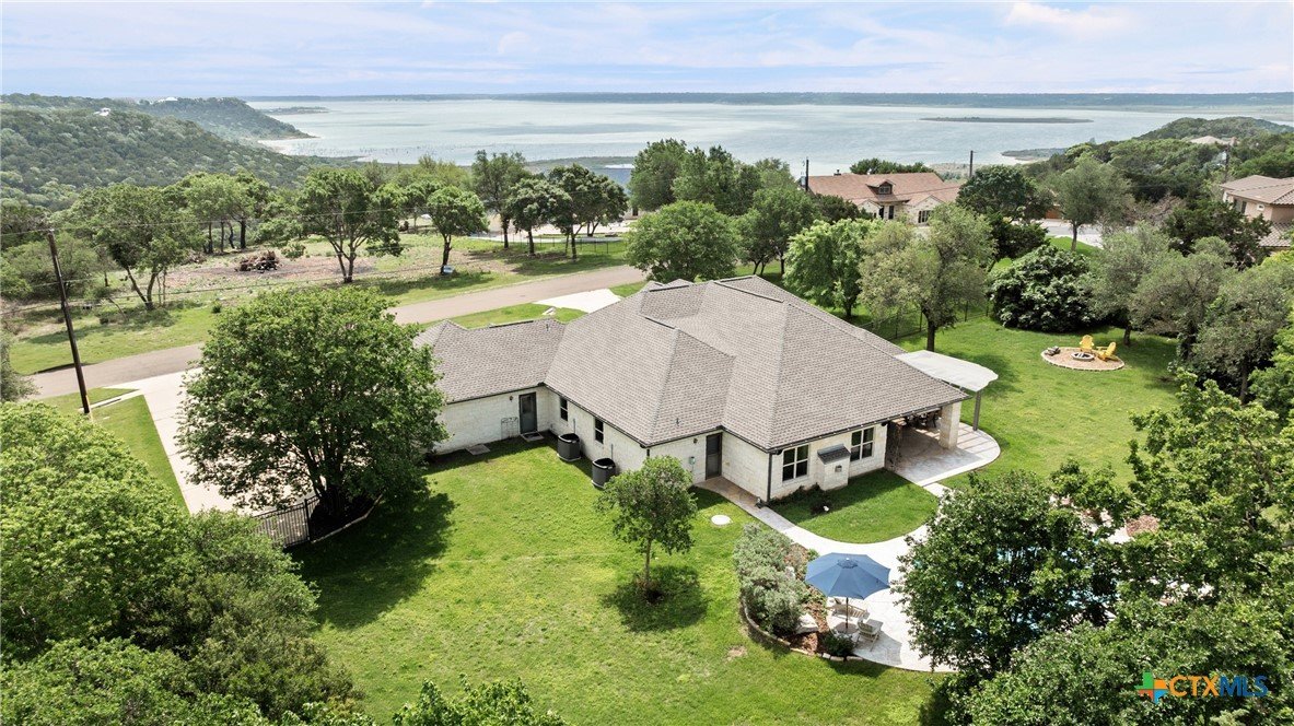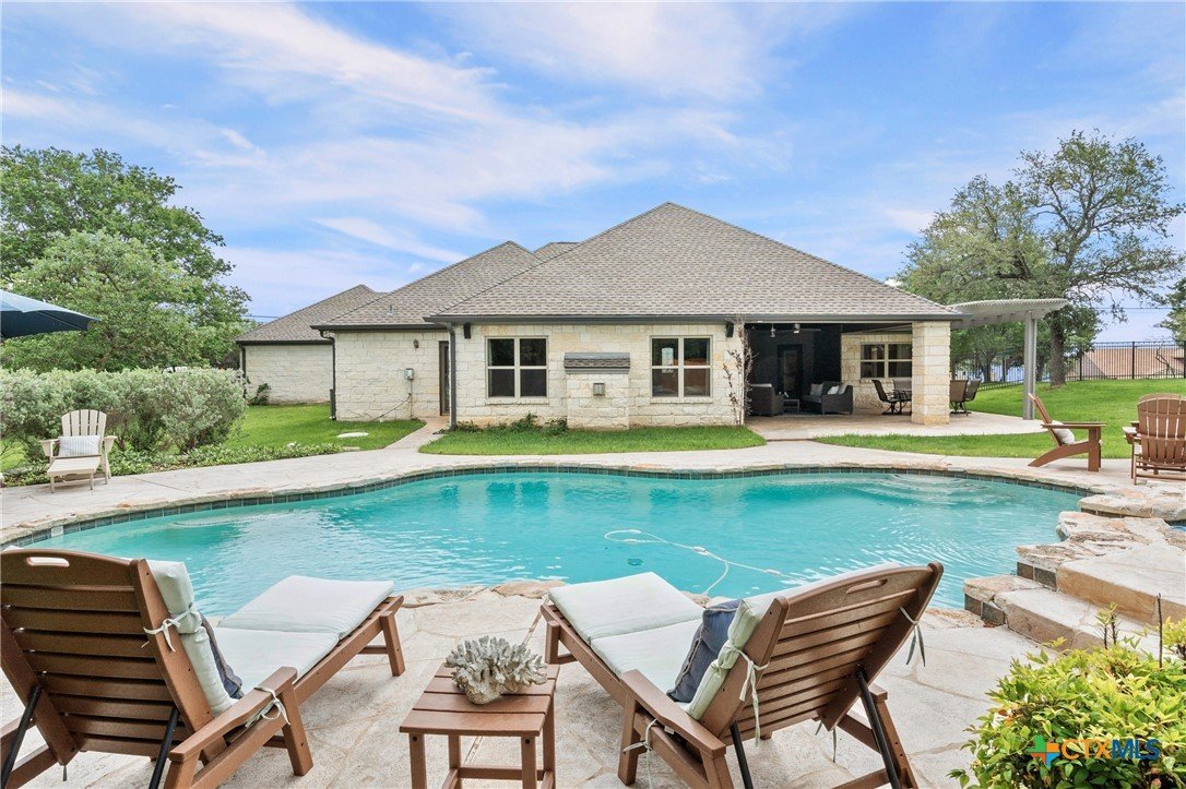 Experience refined living in this luxury 4 bedroom, 3 bathroom estate with over 2,600 square feet in one of the most desirable areas near Stillhouse Hollow Lake. From the moment you arrive, the exceptional curb appeal sets the tone featuring a fully landscaped, lush yard with mature trees and stunning natural stone construction perfectly positioned to capture spectacular lake views right from the front porch. Step inside to a thoughtfully designed open floorplan with two spacious living areas and two dining spaces, ideal for both everyday living and upscale entertaining. A formal dining room provides a sophisticated setting for gatherings. The family room is a true showpiece complete with a gas log fireplace including designer herringbone tile surround overlooking a private backyard oasis. The modern kitchen is loaded with high end upgrades, including a powered island with breakfast bar, granite countertops, double built-in ovens, gas cooktop, and custom lighted cabinetry. Designed for privacy, the split floorplan features a luxurious primary suite with a private sitting area, direct access to the covered patio, and dual walk-in closets. The spa inspired en suite bathroom boasts a walk-in double shower with bench seat, granite topped soaking tub, and dual vanities, creating a true retreat. Three additional generously sized guest bedrooms and two full baths provide comfort and flexibility for family or guests. Step outside to your backyard resort-style escape featuring an extended covered patio, a cozy firepit, and a sparkling pool with spa, perfect for relaxing or entertaining year round. Ideally located just minutes from Dana Peak Park, enjoy easy access to boating, camping, hiking and biking trails, and a family friendly beach area. Plus, a convenient commute to Fort Hood makes this home as practical as it is luxurious. This is more than a home. It’s a lifestyle property offering space, upgrades, lake views, and high end finishes in a prime Central Texas location.