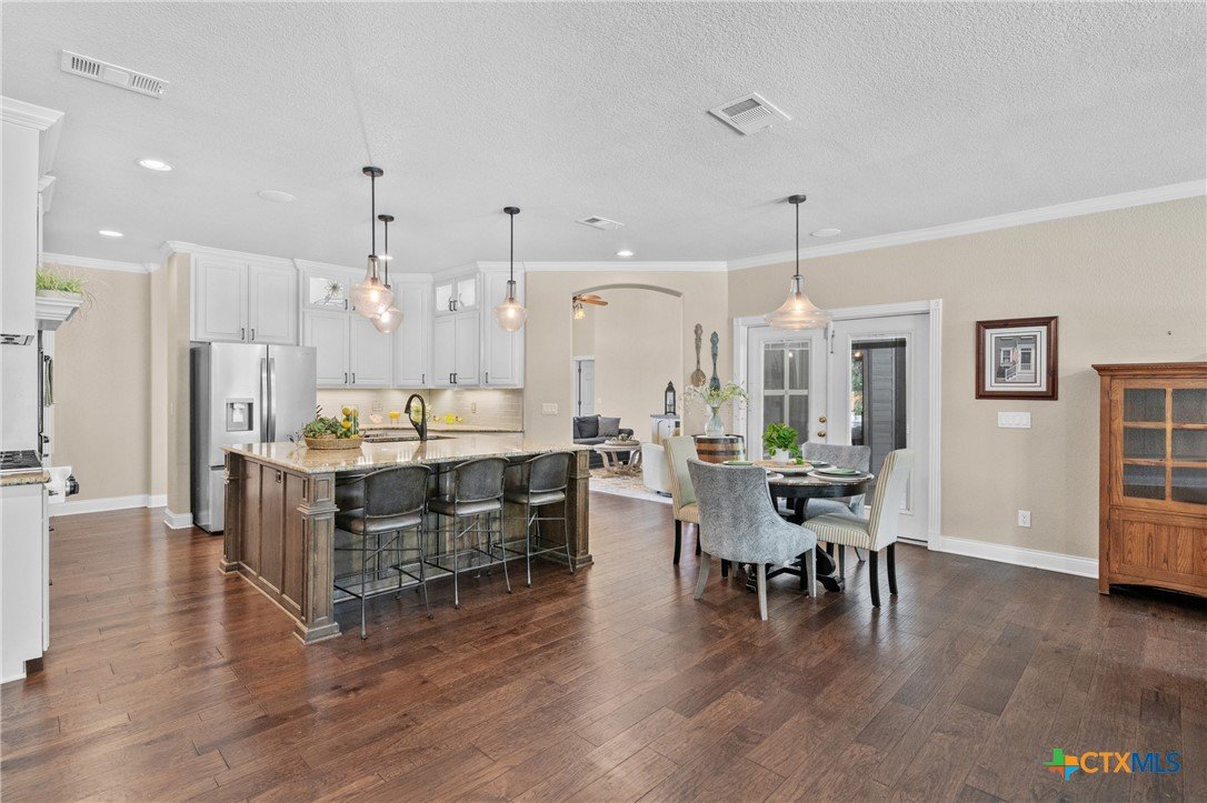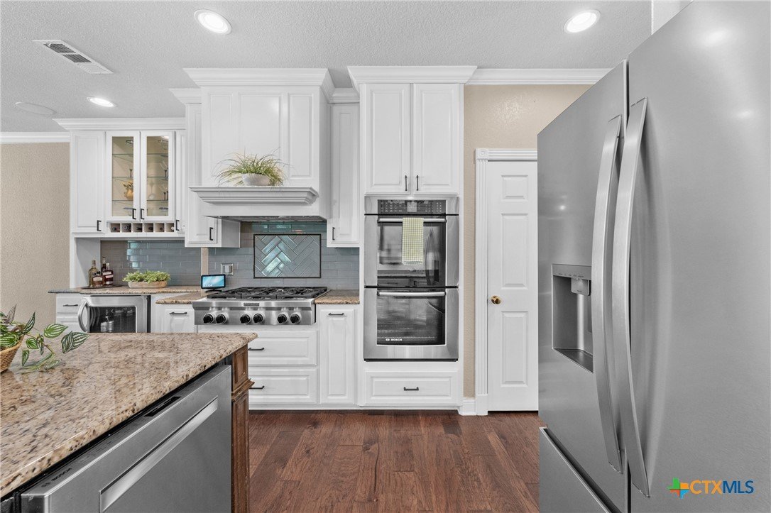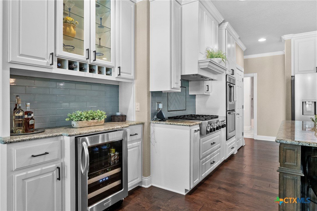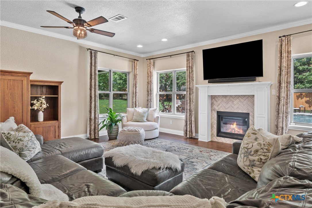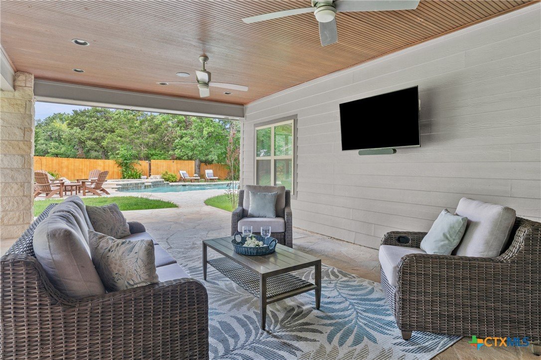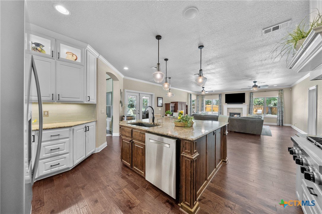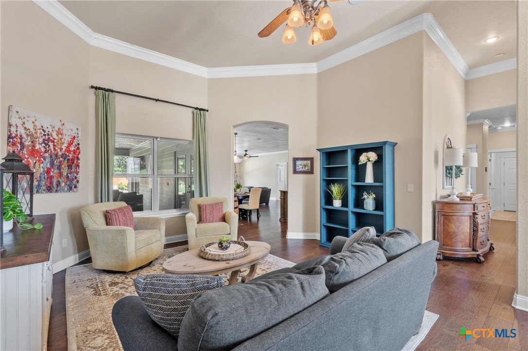 Experience refined living in this luxury 4 bedroom, 3 bathroom estate with over 2,600 square feet in one of the most desirable areas near Stillhouse Hollow Lake. From the moment you arrive, the exceptional curb appeal sets the tone featuring a fully landscaped, lush yard with mature trees and stunning natural stone construction perfectly positioned to capture spectacular lake views right from the front porch. Step inside to a thoughtfully designed open floorplan with two spacious living areas and two dining spaces, ideal for both everyday living and upscale entertaining. A formal dining room provides a sophisticated setting for gatherings. The family room is a true showpiece complete with a gas log fireplace including designer herringbone tile surround overlooking a private backyard oasis. The modern kitchen is loaded with high end upgrades, including a powered island with breakfast bar, granite countertops, double built-in ovens, gas cooktop, and custom lighted cabinetry. Designed for privacy, the split floorplan features a luxurious primary suite with a private sitting area, direct access to the covered patio, and dual walk-in closets. The spa inspired en suite bathroom boasts a walk-in double shower with bench seat, granite topped soaking tub, and dual vanities, creating a true retreat. Three additional generously sized guest bedrooms and two full baths provide comfort and flexibility for family or guests. Step outside to your backyard resort-style escape featuring an extended covered patio, a cozy firepit, and a sparkling pool with spa, perfect for relaxing or entertaining year round. Ideally located just minutes from Dana Peak Park, enjoy easy access to boating, camping, hiking and biking trails, and a family friendly beach area. Plus, a convenient commute to Fort Hood makes this home as practical as it is luxurious. This is more than a home. It’s a lifestyle property offering space, upgrades, lake views, and high end finishes in a prime Central Texas location.