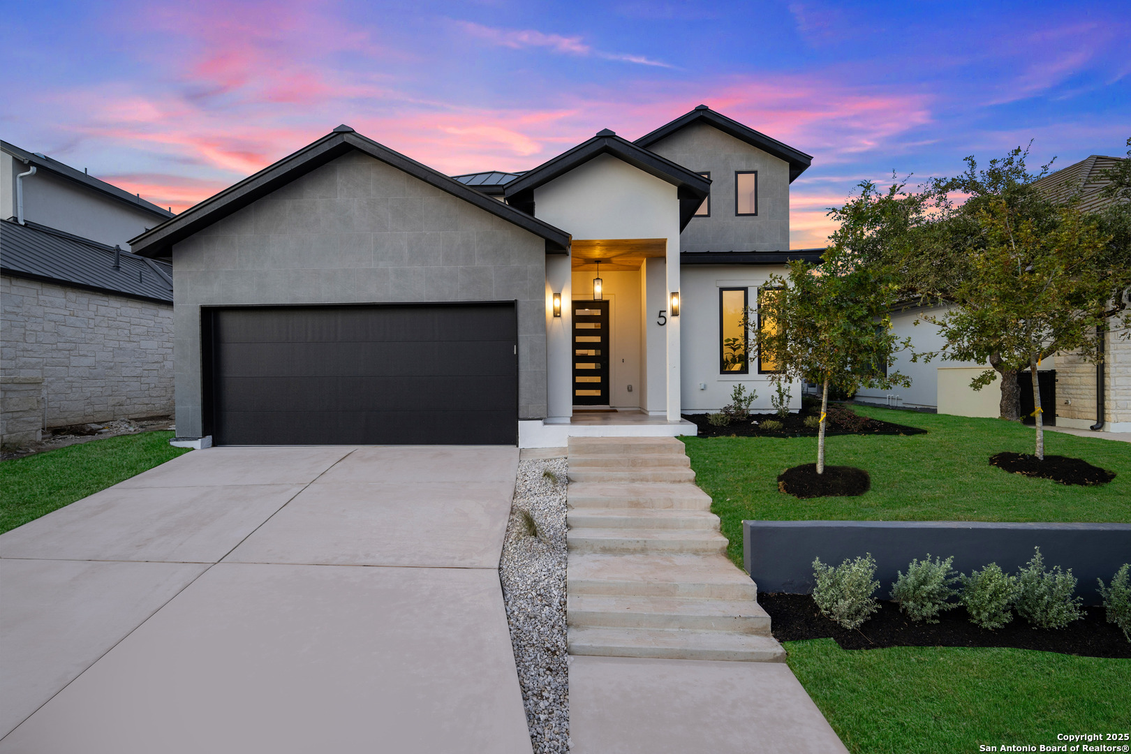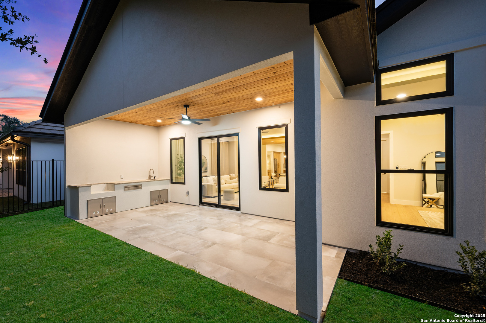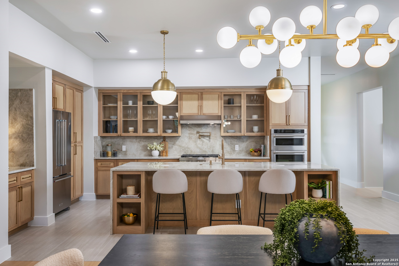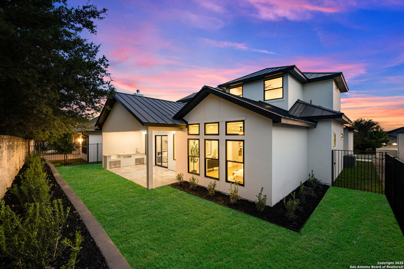 *OPEN HOUSE* SATURDAY NOV. 22nd 12PM - 3PM // Tucked behind the guarded gates of The Dominion, this brand-new modern jewel by Vergel Constructions offers a rare balance of architectural drama and low-maintenance ease. A statement in glass, stucco, and light, it's a home designed to inspire-from its soaring ceilings to its serene, lock-and-leave lifestyle. Step through the glass-lined entry into a world of light, texture, and refined minimalism. White oak flooring flows seamlessly beneath 10-foot ceilings and expansive modern windows, creating an atmosphere both airy and elegant. The open living area, framed by sliding glass doors, connects effortlessly to a private outdoor retreat complete with lush landscaping, a built-in kitchen and sleek tile patio-perfect for intimate gatherings or evening entertaining. At the heart of the home, a chef's kitchen commands attention with Taj Mahal Quartzite countertops, a waterfall-edge island, matching backsplash and a pot filler. White oak cabinetry with glass fronts, Visual Comfort lighting, and brass accents add a touch of warmth and glamour, while the KitchenAid appliance suite-featuring a six-burner gas range, built-in refrigerator, and coffee bar with mini fridge-blends function with design precision. Anchored beneath a statement chandelier, the dining room unfolds as a moment of quiet grandeur. The open-concept design creates a seamless transition between kitchen and living spaces, perfect for evenings that linger over fine wine and conversation. The primary suite is a sanctuary of serenity, graced by floor-to-ceiling windows framing the hilltops. Its spa-inspired ensuite showcases a soaking tub, walk-in shower with large-format tile, double vanities with custom white oak cabinetry, and a designer-lit vanity-all leading to an impressive walk-in closet. Upstairs, discover a thoughtfully designed second living area with built-in cabinetry and extra storage, along with two spacious bedrooms and two full baths, ideal for guests or family. With its stucco exterior, standing-seam metal roof, and meticulously designed interiors, this residence embodies luxury, craftsmanship, and contemporary ease-all within one of San Antonio's most prestigious guard-gated communities.