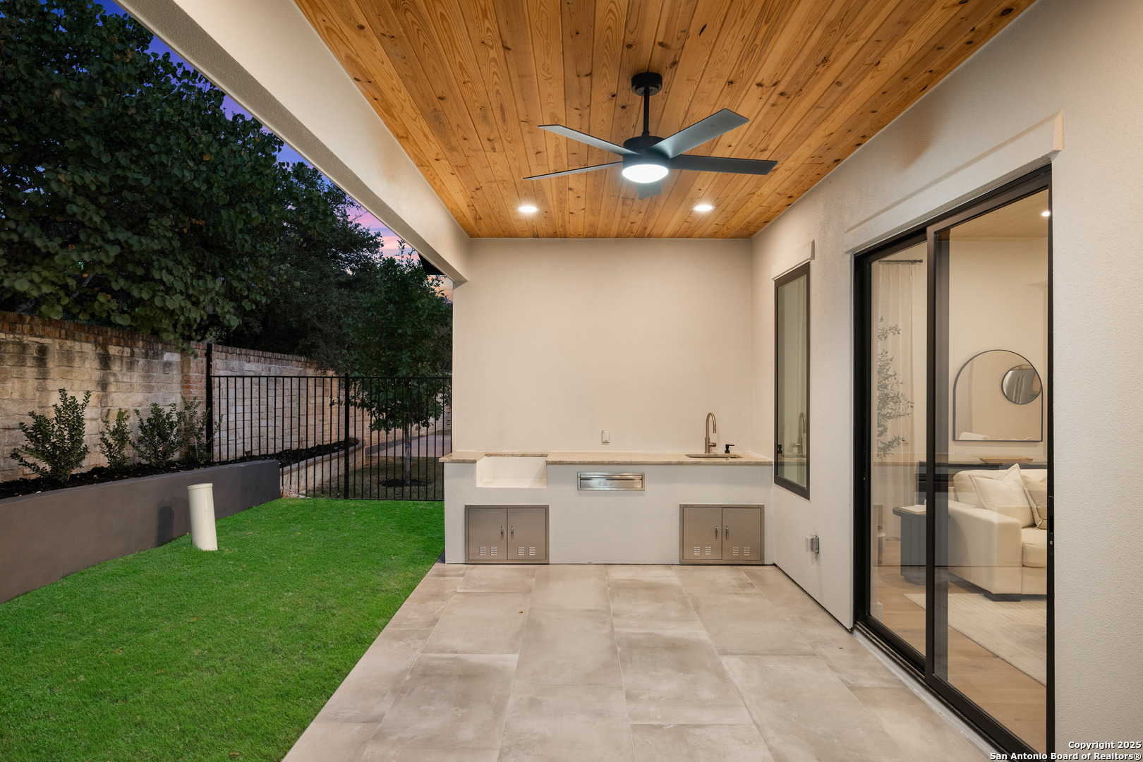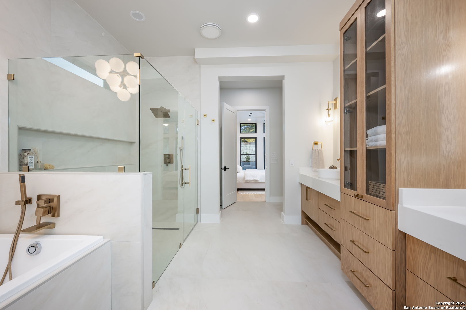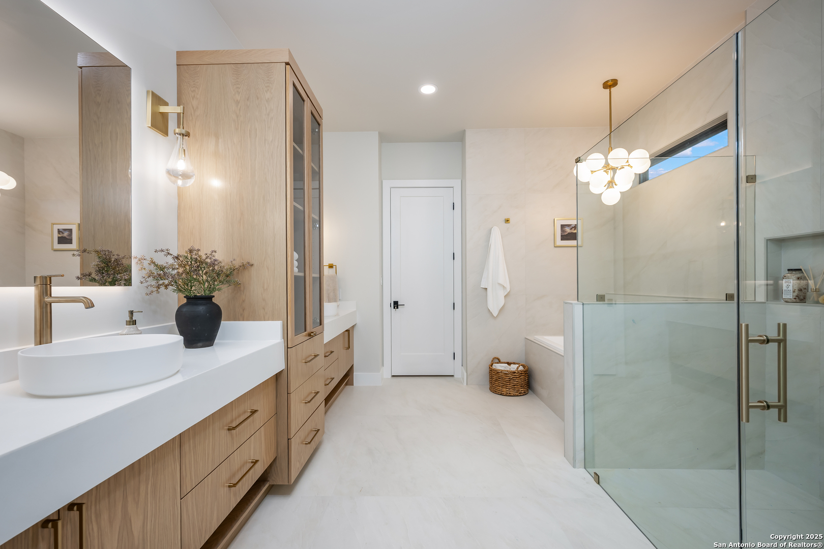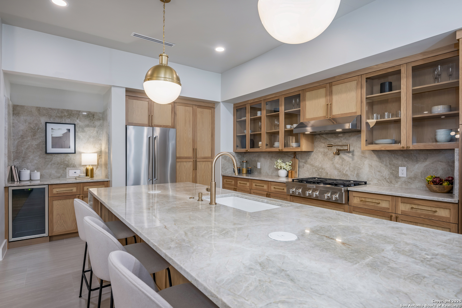 *OPEN HOUSE* SATURDAY NOV. 22nd 12PM - 3PM // Tucked behind the guarded gates of The Dominion, this brand-new modern jewel by Vergel Constructions offers a rare balance of architectural drama and low-maintenance ease. A statement in glass, stucco, and light, it's a home designed to inspire-from its soaring ceilings to its serene, lock-and-leave lifestyle. Step through the glass-lined entry into a world of light, texture, and refined minimalism. White oak flooring flows seamlessly beneath 10-foot ceilings and expansive modern windows, creating an atmosphere both airy and elegant. The open living area, framed by sliding glass doors, connects effortlessly to a private outdoor retreat complete with lush landscaping, a built-in kitchen and sleek tile patio-perfect for intimate gatherings or evening entertaining. At the heart of the home, a chef's kitchen commands attention with Taj Mahal Quartzite countertops, a waterfall-edge island, matching backsplash and a pot filler. White oak cabinetry with glass fronts, Visual Comfort lighting, and brass accents add a touch of warmth and glamour, while the KitchenAid appliance suite-featuring a six-burner gas range, built-in refrigerator, and coffee bar with mini fridge-blends function with design precision. Anchored beneath a statement chandelier, the dining room unfolds as a moment of quiet grandeur. The open-concept design creates a seamless transition between kitchen and living spaces, perfect for evenings that linger over fine wine and conversation. The primary suite is a sanctuary of serenity, graced by floor-to-ceiling windows framing the hilltops. Its spa-inspired ensuite showcases a soaking tub, walk-in shower with large-format tile, double vanities with custom white oak cabinetry, and a designer-lit vanity-all leading to an impressive walk-in closet. Upstairs, discover a thoughtfully designed second living area with built-in cabinetry and extra storage, along with two spacious bedrooms and two full baths, ideal for guests or family. With its stucco exterior, standing-seam metal roof, and meticulously designed interiors, this residence embodies luxury, craftsmanship, and contemporary ease-all within one of San Antonio's most prestigious guard-gated communities.