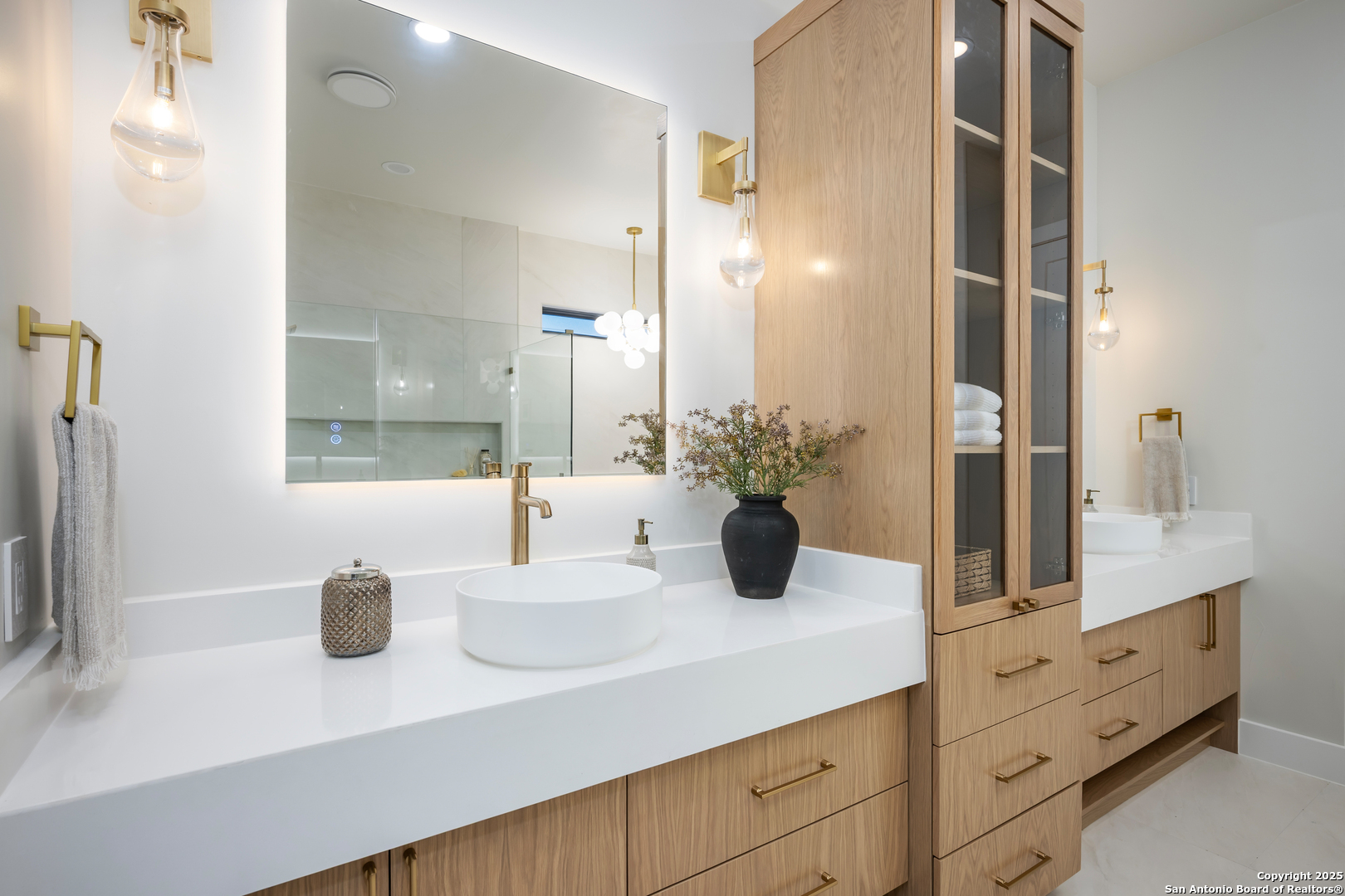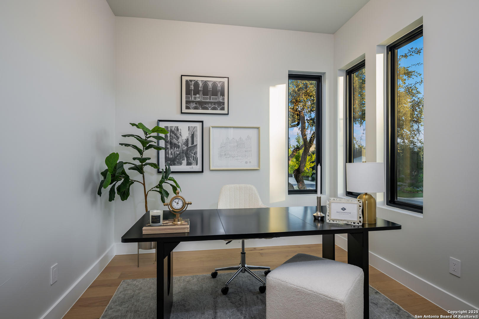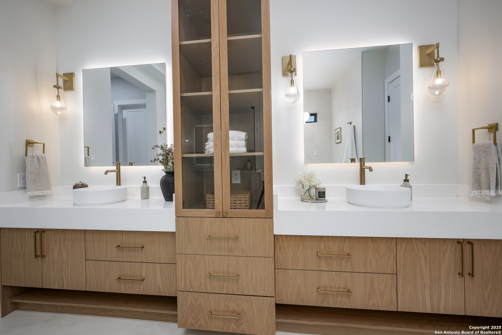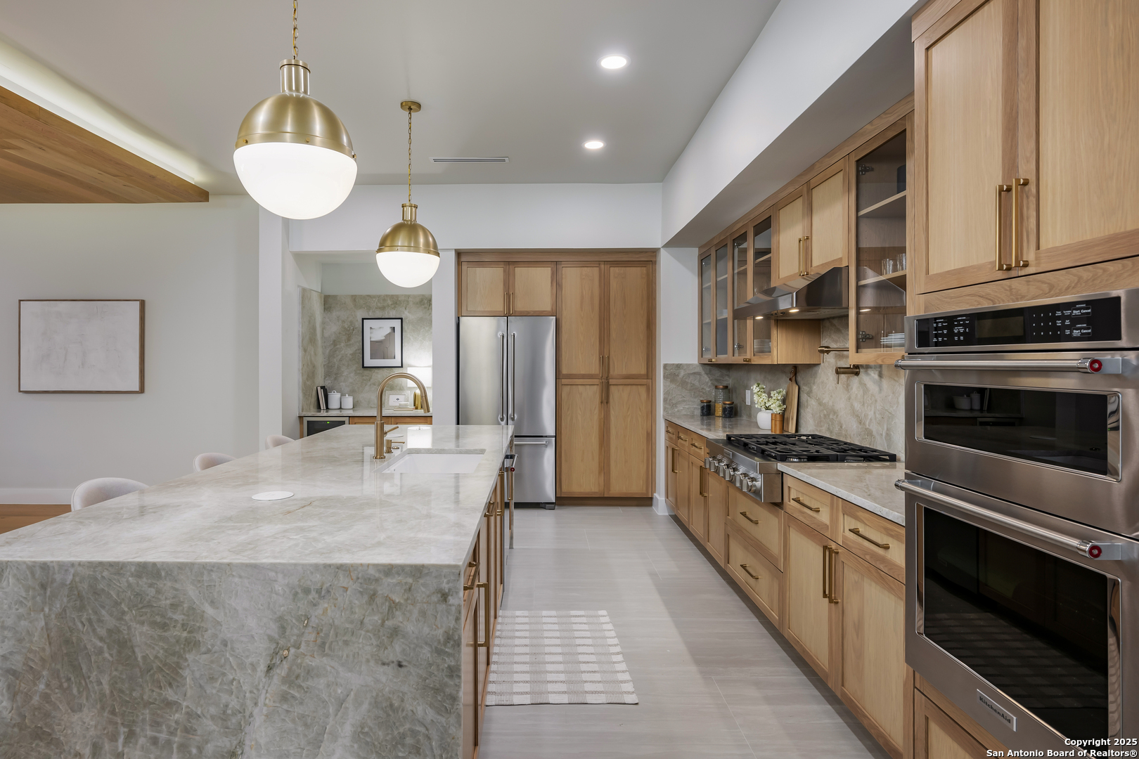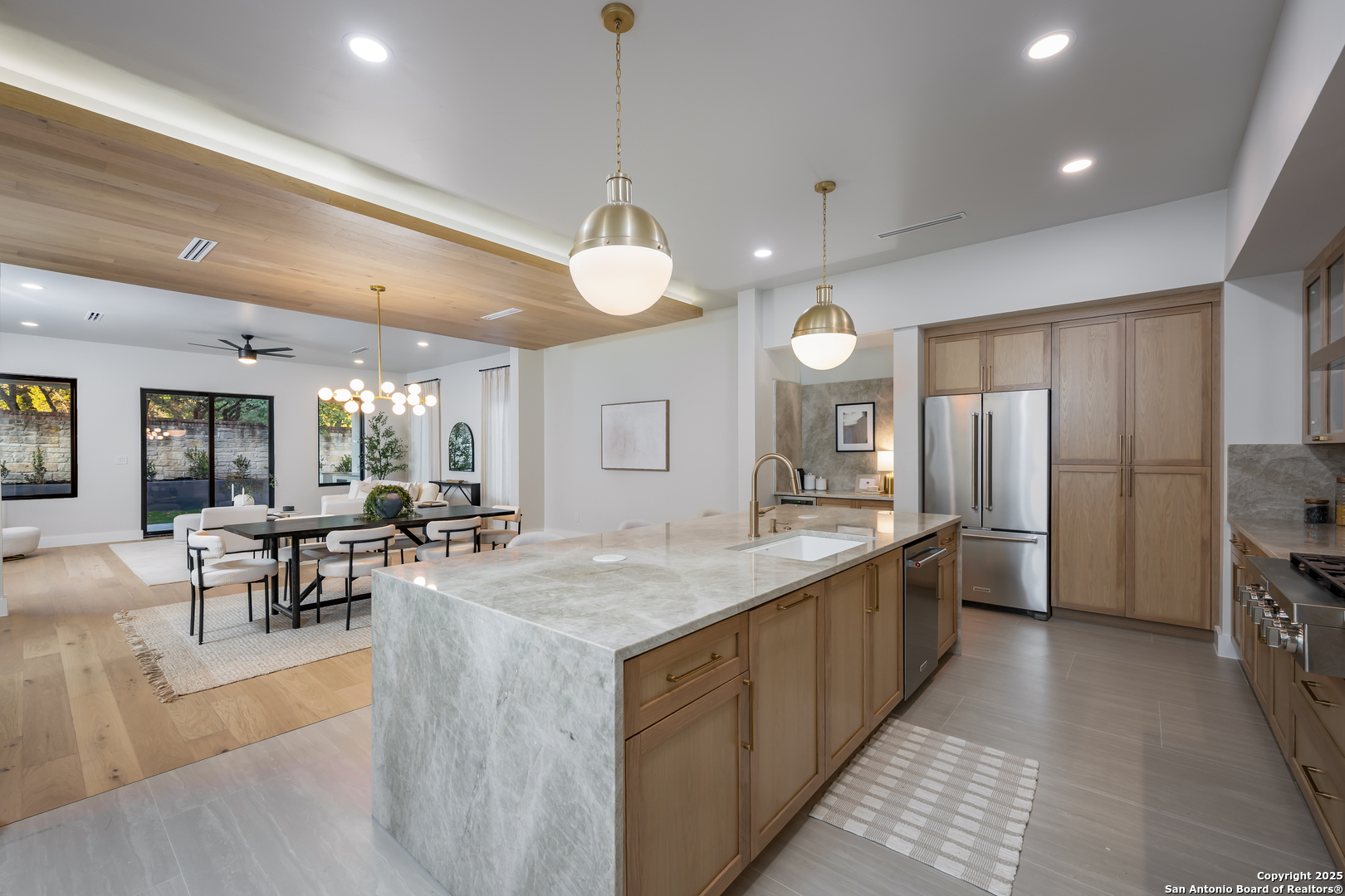 *OPEN HOUSE* SATURDAY NOV. 22nd 12PM - 3PM // Tucked behind the guarded gates of The Dominion, this brand-new modern jewel by Vergel Constructions offers a rare balance of architectural drama and low-maintenance ease. A statement in glass, stucco, and light, it's a home designed to inspire-from its soaring ceilings to its serene, lock-and-leave lifestyle. Step through the glass-lined entry into a world of light, texture, and refined minimalism. White oak flooring flows seamlessly beneath 10-foot ceilings and expansive modern windows, creating an atmosphere both airy and elegant. The open living area, framed by sliding glass doors, connects effortlessly to a private outdoor retreat complete with lush landscaping, a built-in kitchen and sleek tile patio-perfect for intimate gatherings or evening entertaining. At the heart of the home, a chef's kitchen commands attention with Taj Mahal Quartzite countertops, a waterfall-edge island, matching backsplash and a pot filler. White oak cabinetry with glass fronts, Visual Comfort lighting, and brass accents add a touch of warmth and glamour, while the KitchenAid appliance suite-featuring a six-burner gas range, built-in refrigerator, and coffee bar with mini fridge-blends function with design precision. Anchored beneath a statement chandelier, the dining room unfolds as a moment of quiet grandeur. The open-concept design creates a seamless transition between kitchen and living spaces, perfect for evenings that linger over fine wine and conversation. The primary suite is a sanctuary of serenity, graced by floor-to-ceiling windows framing the hilltops. Its spa-inspired ensuite showcases a soaking tub, walk-in shower with large-format tile, double vanities with custom white oak cabinetry, and a designer-lit vanity-all leading to an impressive walk-in closet. Upstairs, discover a thoughtfully designed second living area with built-in cabinetry and extra storage, along with two spacious bedrooms and two full baths, ideal for guests or family. With its stucco exterior, standing-seam metal roof, and meticulously designed interiors, this residence embodies luxury, craftsmanship, and contemporary ease-all within one of San Antonio's most prestigious guard-gated communities.