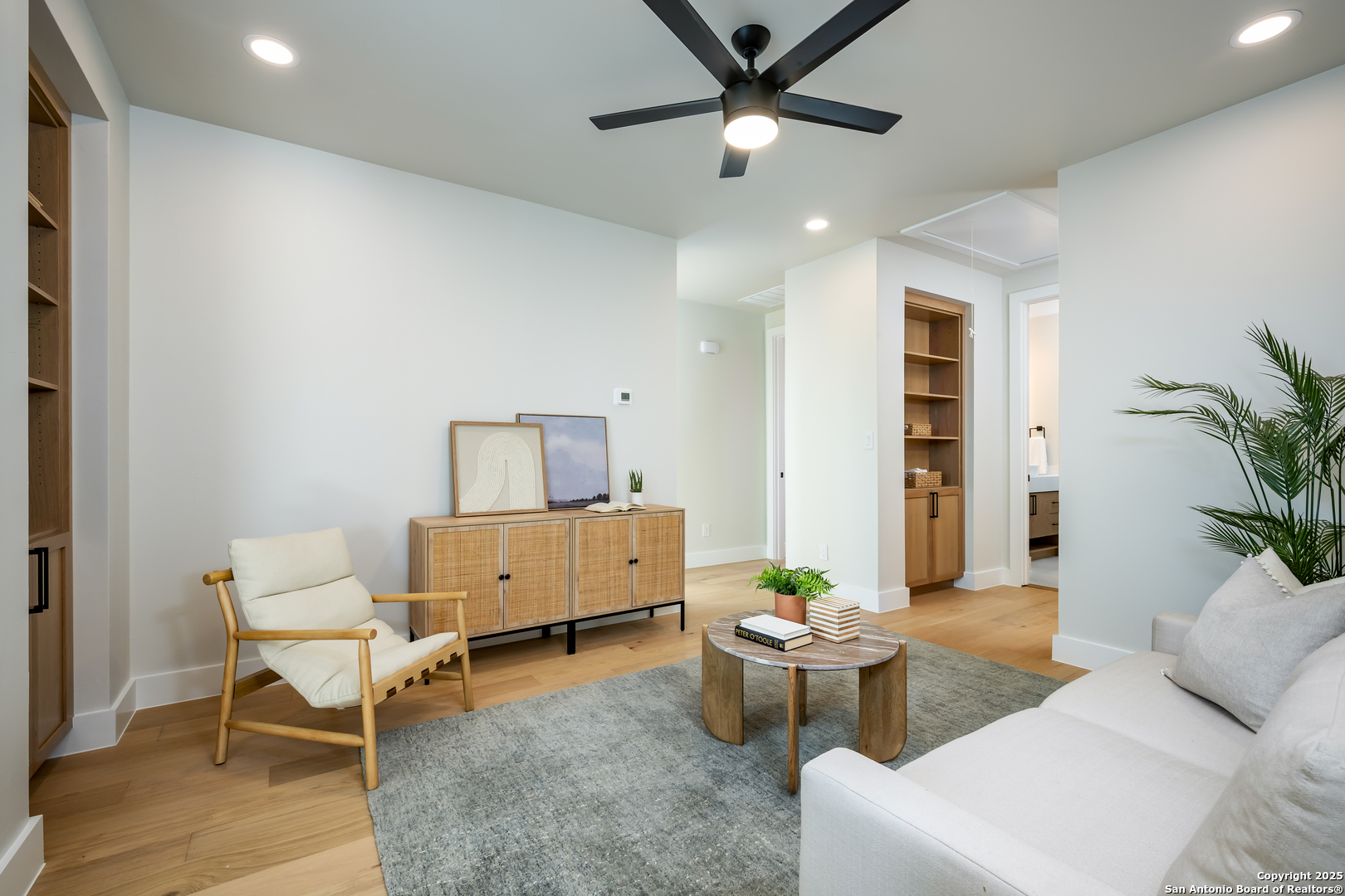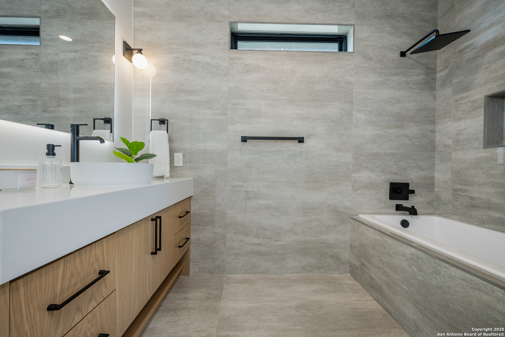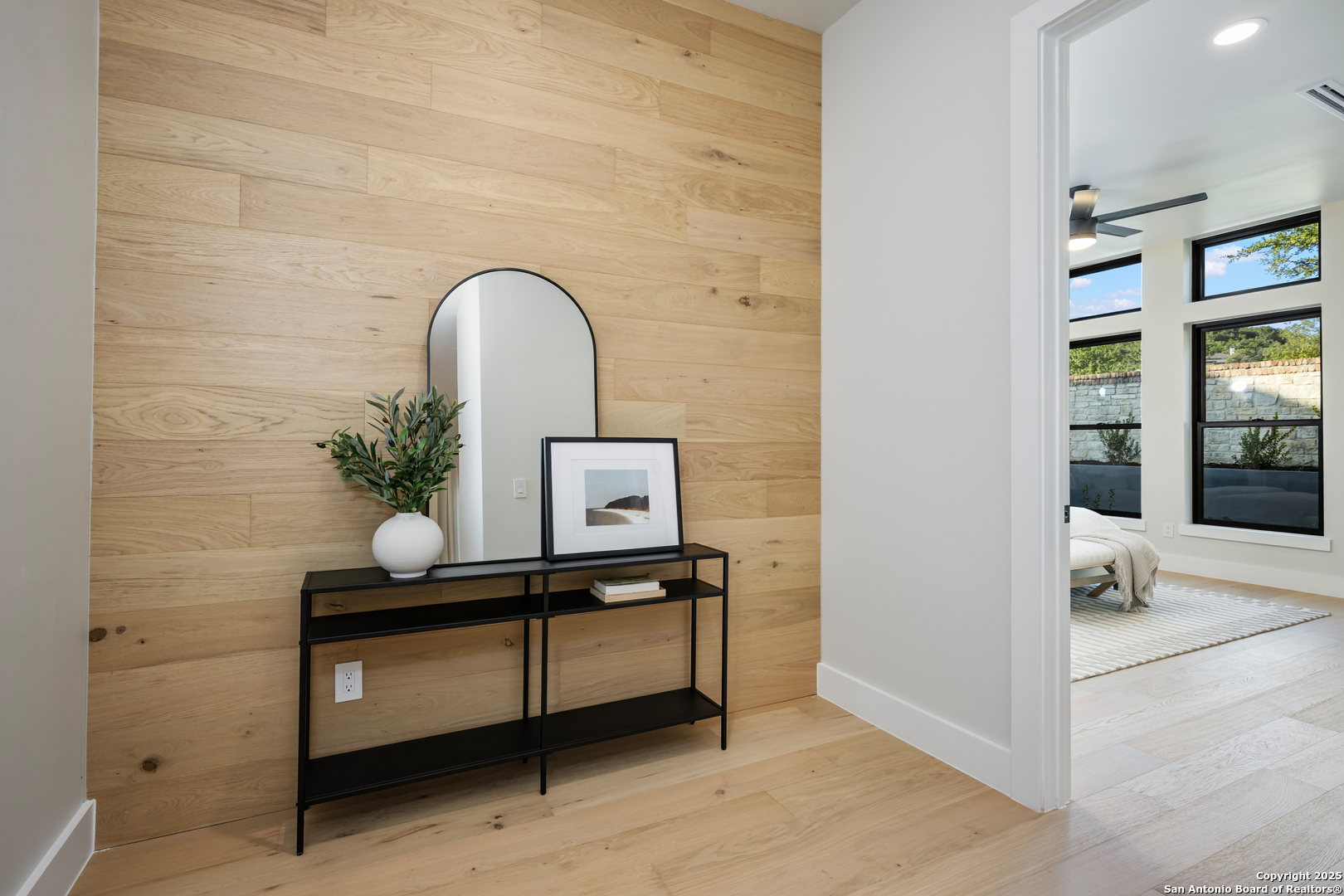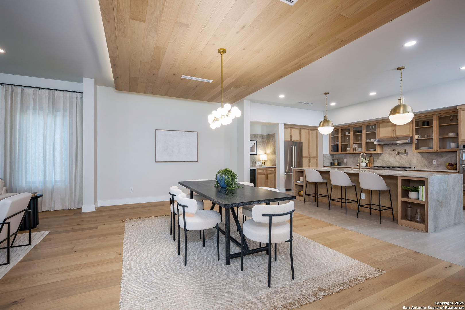 *OPEN HOUSE* SATURDAY NOV. 22nd 12PM - 3PM // Tucked behind the guarded gates of The Dominion, this brand-new modern jewel by Vergel Constructions offers a rare balance of architectural drama and low-maintenance ease. A statement in glass, stucco, and light, it's a home designed to inspire-from its soaring ceilings to its serene, lock-and-leave lifestyle. Step through the glass-lined entry into a world of light, texture, and refined minimalism. White oak flooring flows seamlessly beneath 10-foot ceilings and expansive modern windows, creating an atmosphere both airy and elegant. The open living area, framed by sliding glass doors, connects effortlessly to a private outdoor retreat complete with lush landscaping, a built-in kitchen and sleek tile patio-perfect for intimate gatherings or evening entertaining. At the heart of the home, a chef's kitchen commands attention with Taj Mahal Quartzite countertops, a waterfall-edge island, matching backsplash and a pot filler. White oak cabinetry with glass fronts, Visual Comfort lighting, and brass accents add a touch of warmth and glamour, while the KitchenAid appliance suite-featuring a six-burner gas range, built-in refrigerator, and coffee bar with mini fridge-blends function with design precision. Anchored beneath a statement chandelier, the dining room unfolds as a moment of quiet grandeur. The open-concept design creates a seamless transition between kitchen and living spaces, perfect for evenings that linger over fine wine and conversation. The primary suite is a sanctuary of serenity, graced by floor-to-ceiling windows framing the hilltops. Its spa-inspired ensuite showcases a soaking tub, walk-in shower with large-format tile, double vanities with custom white oak cabinetry, and a designer-lit vanity-all leading to an impressive walk-in closet. Upstairs, discover a thoughtfully designed second living area with built-in cabinetry and extra storage, along with two spacious bedrooms and two full baths, ideal for guests or family. With its stucco exterior, standing-seam metal roof, and meticulously designed interiors, this residence embodies luxury, craftsmanship, and contemporary ease-all within one of San Antonio's most prestigious guard-gated communities.