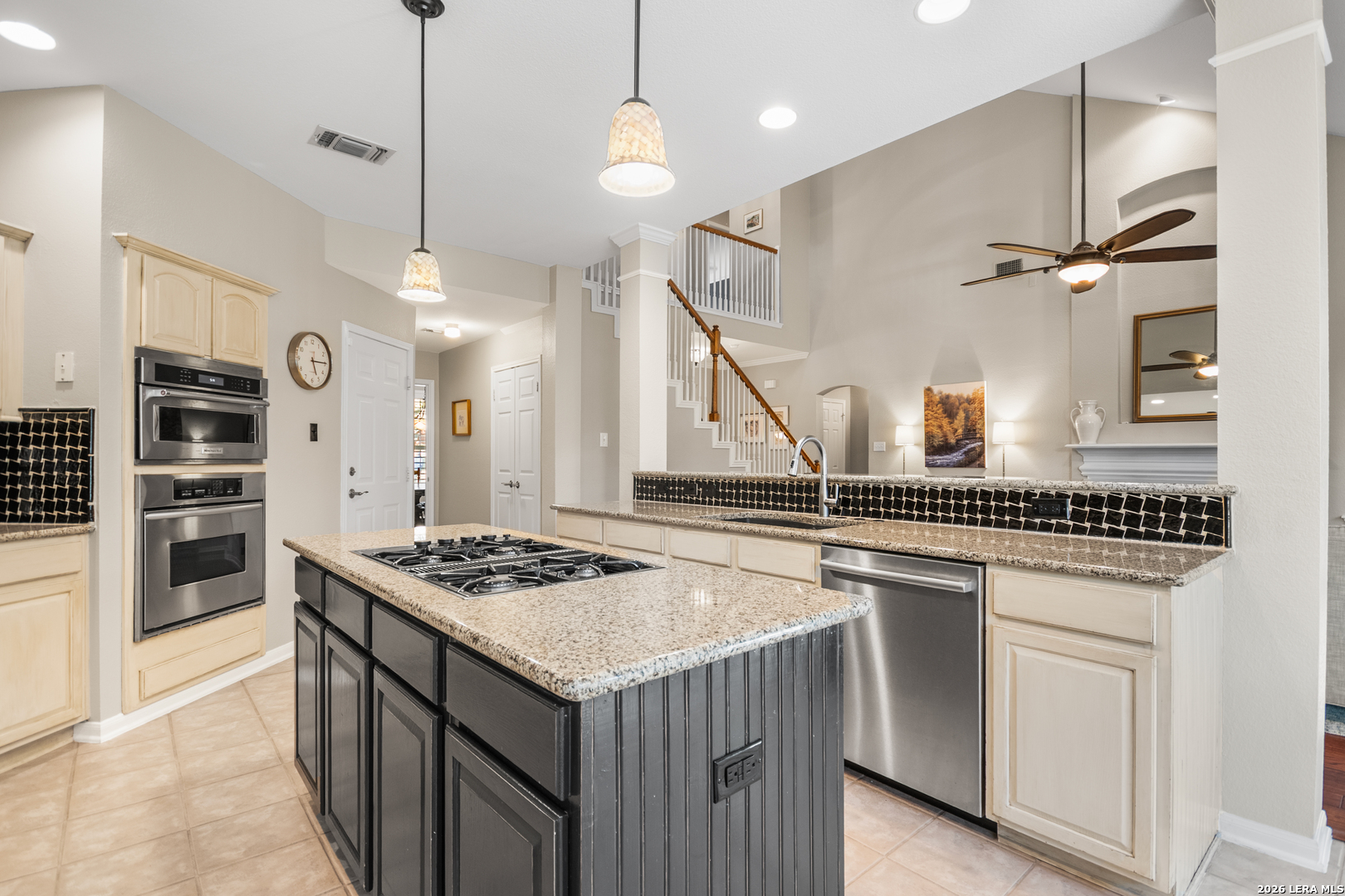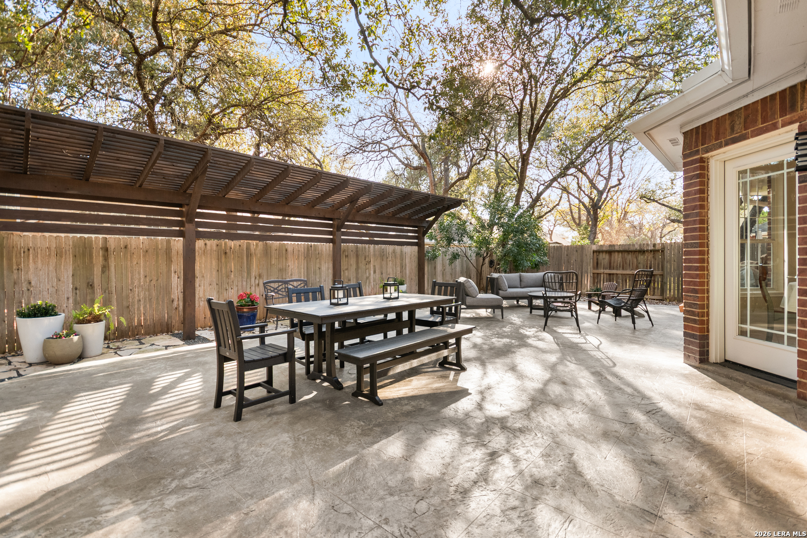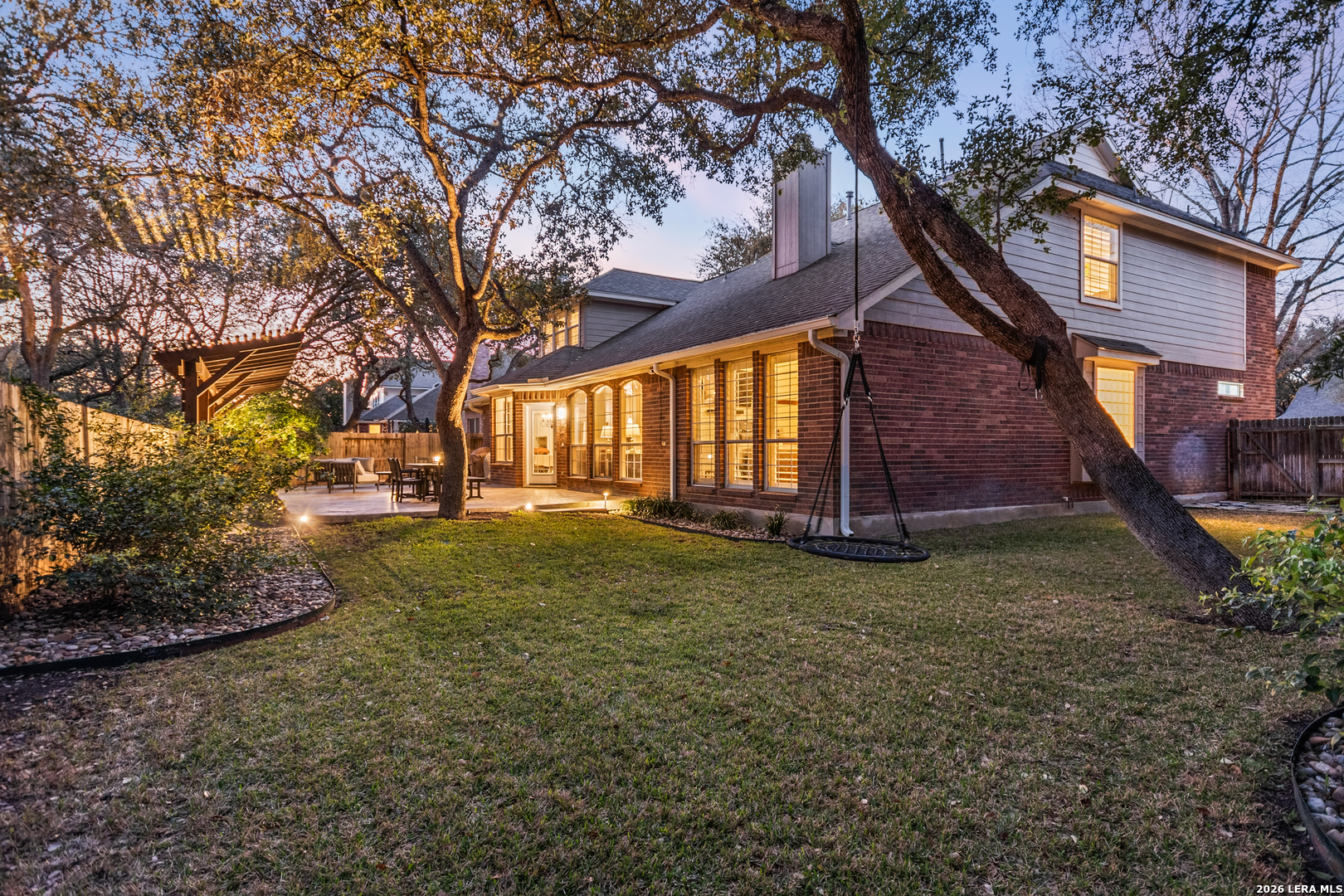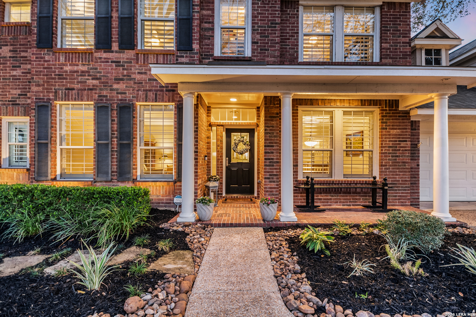 This beautifully maintained home has it all-location, space, and updates that make it move-in ready. With its classic red brick exterior, white columns, and mature trees, this home has the curb appeal you've been looking for. The spacious interior features a desirable layout, with the primary bedroom, office, and living spaces on the main floor, all with wood flooring in the social areas. The luxurious primary bedroom boasts 10-ft ceilings, creating a spacious, airy feel. The en-suite bathroom is a spa-like retreat featuring a double vanity, garden tub, and a glass-surround shower adorned with elegant travertine and stone. The chef's kitchen is a dream with three expansive countertop areas, including a large center island that provides ample workspace for meal preparation. Equipped with gas cooking, built-in appliances, and a walk-in pantry, this kitchen is perfect for both everyday cooking and entertaining. Adjacent to the kitchen, the laundry room is a practical space with a work sink, hanging area, and additional cabinetry and shelving for convenient storage. Upstairs, you'll find a sprawling loft/game room, three large bedrooms, two full baths, and generous storage space. All rooms include oversized walk-in closets. Outside, the gorgeous landscaping with mature trees and lighting enhances the ambiance, perfect for family gatherings and relaxing. The gated neighborhood is secure and peaceful, offering amenities like a pool, tennis courts, and a park, plus easy access to Salado Creek Greenway for biking and walking. This home also features recent updates like the roof, upgraded HVAC, water heaters, carpet, appliances and wood plantation shutters. The 3-car tandem garage provides ample room for vehicles and extra storage. Zoned to excellent schools and located near major highways, shopping, and dining.
