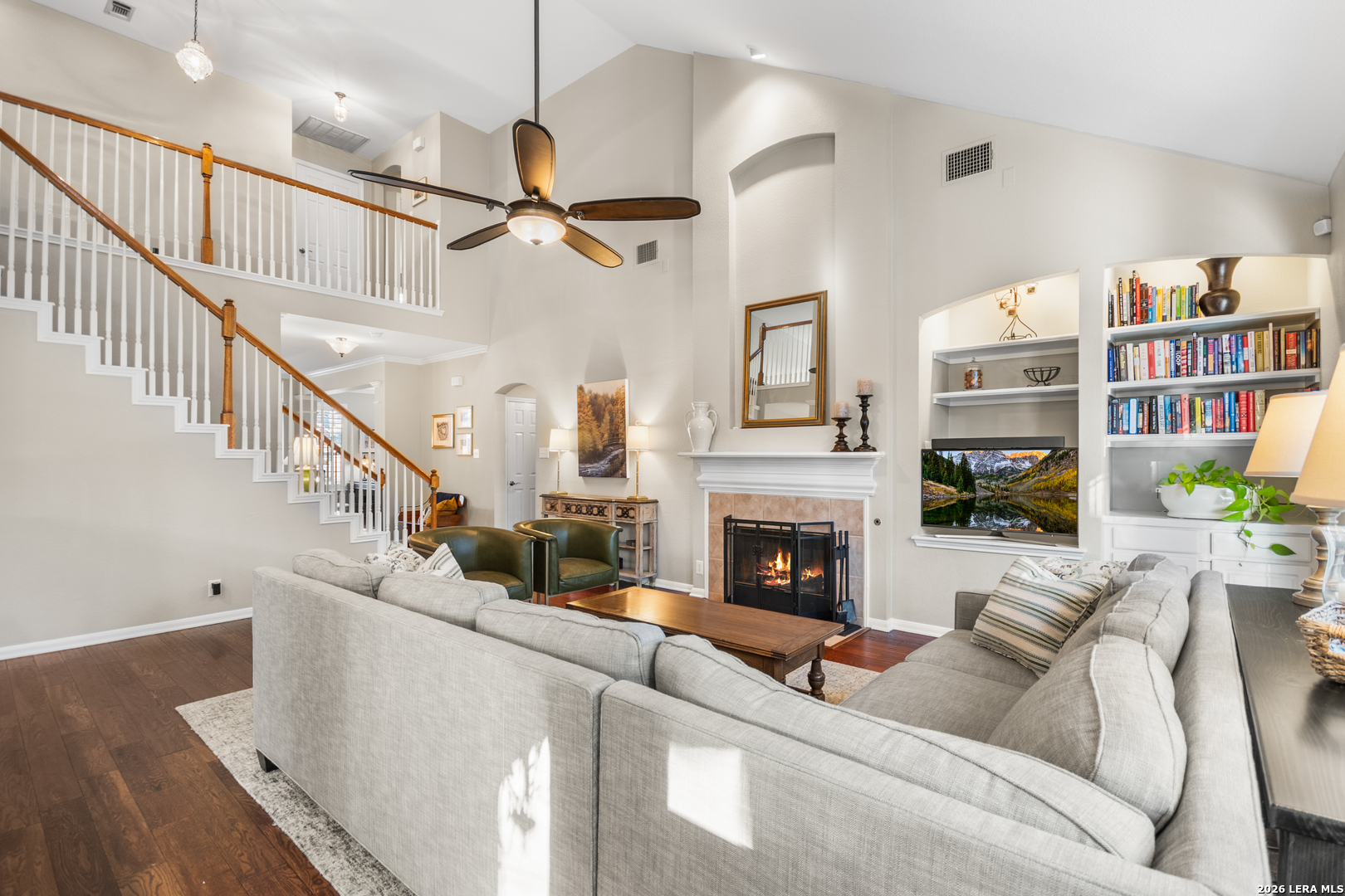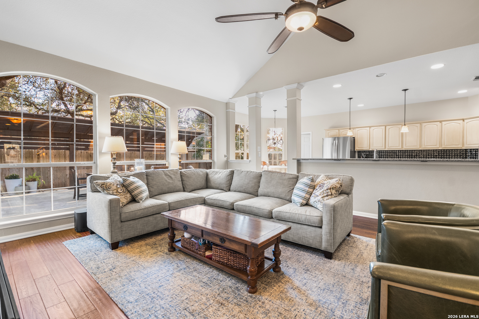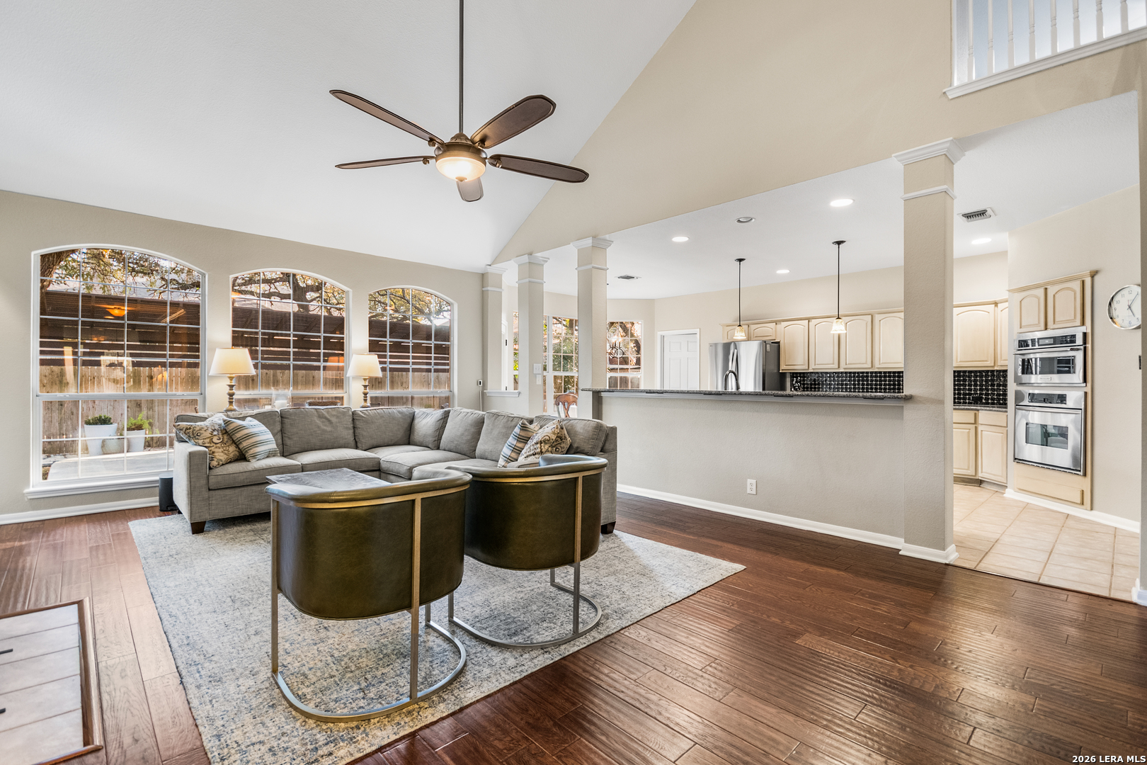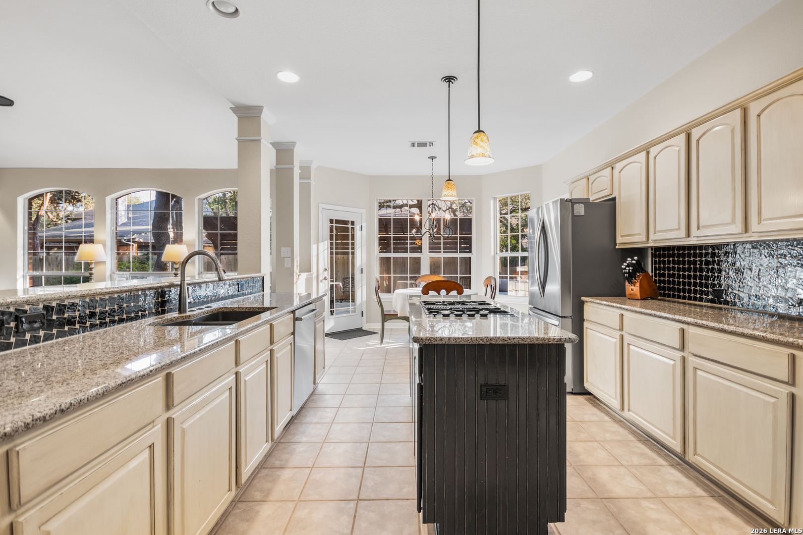 This beautifully maintained home has it all-location, space, and updates that make it move-in ready. With its classic red brick exterior, white columns, and mature trees, this home has the curb appeal you've been looking for. The spacious interior features a desirable layout, with the primary bedroom, office, and living spaces on the main floor, all with wood flooring in the social areas. The luxurious primary bedroom boasts 10-ft ceilings, creating a spacious, airy feel. The en-suite bathroom is a spa-like retreat featuring a double vanity, garden tub, and a glass-surround shower adorned with elegant travertine and stone. The chef's kitchen is a dream with three expansive countertop areas, including a large center island that provides ample workspace for meal preparation. Equipped with gas cooking, built-in appliances, and a walk-in pantry, this kitchen is perfect for both everyday cooking and entertaining. Adjacent to the kitchen, the laundry room is a practical space with a work sink, hanging area, and additional cabinetry and shelving for convenient storage. Upstairs, you'll find a sprawling loft/game room, three large bedrooms, two full baths, and generous storage space. All rooms include oversized walk-in closets. Outside, the gorgeous landscaping with mature trees and lighting enhances the ambiance, perfect for family gatherings and relaxing. The gated neighborhood is secure and peaceful, offering amenities like a pool, tennis courts, and a park, plus easy access to Salado Creek Greenway for biking and walking. This home also features recent updates like the roof, upgraded HVAC, water heaters, carpet, appliances and wood plantation shutters. The 3-car tandem garage provides ample room for vehicles and extra storage. Zoned to excellent schools and located near major highways, shopping, and dining.