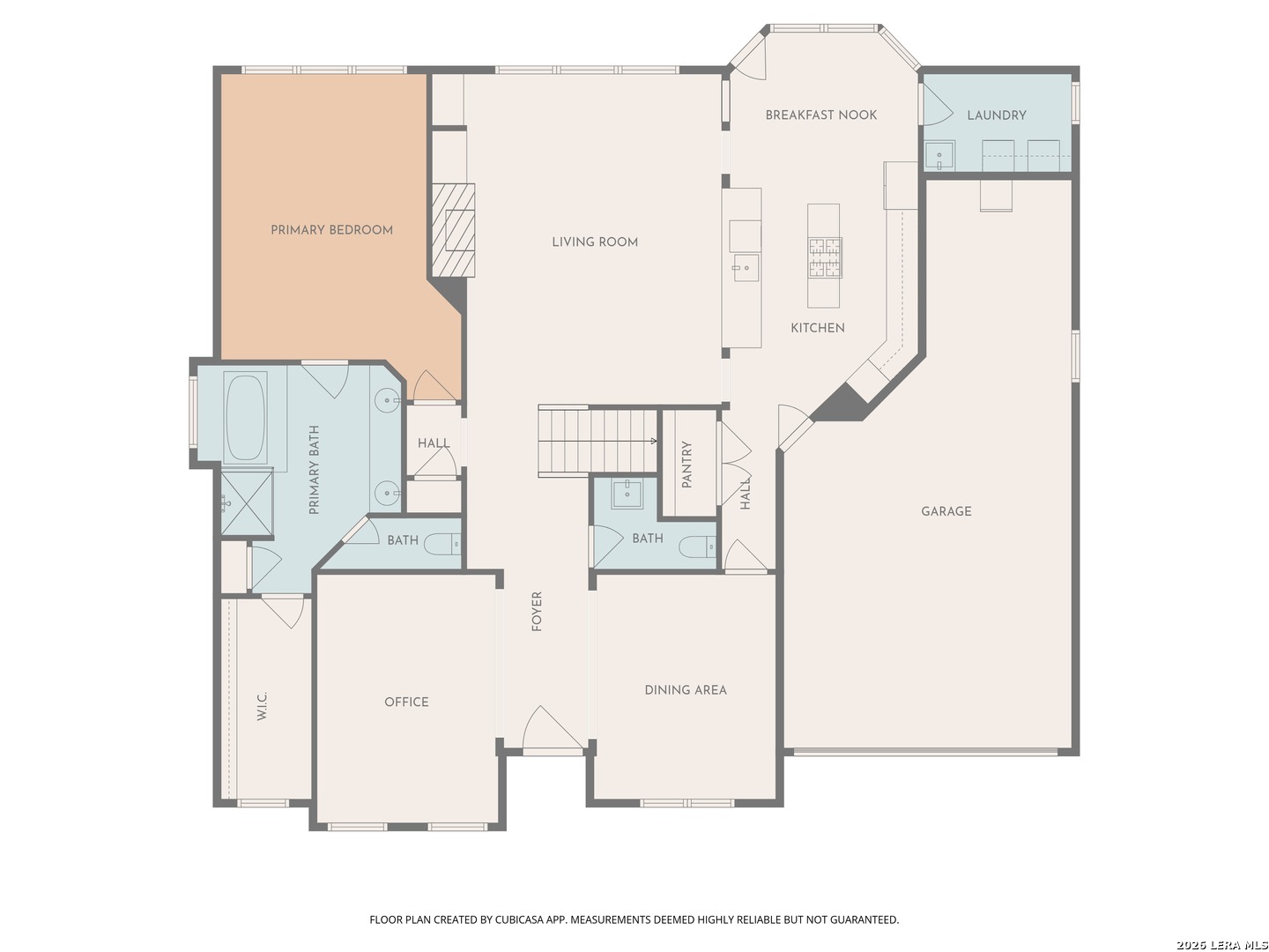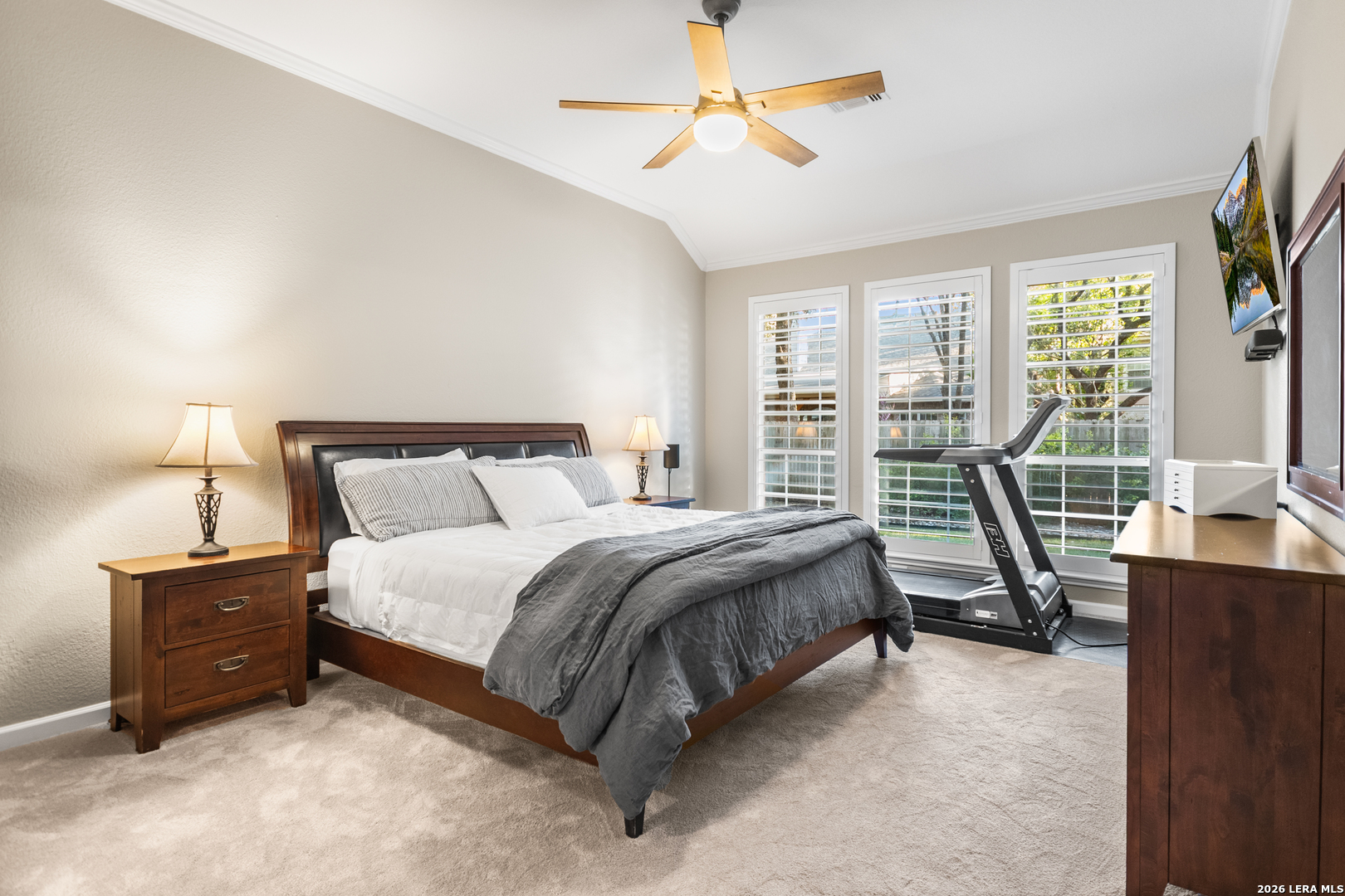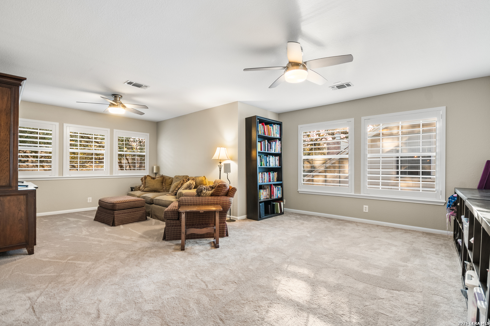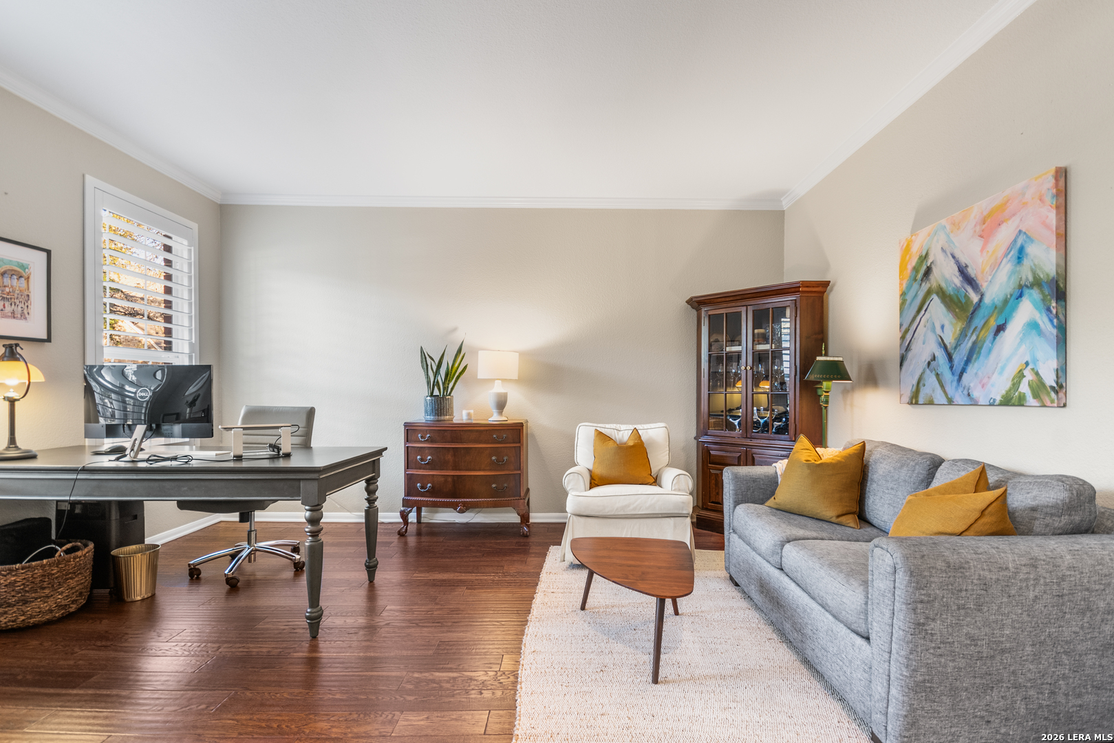 This beautifully maintained home has it all-location, space, and updates that make it move-in ready. With its classic red brick exterior, white columns, and mature trees, this home has the curb appeal you've been looking for. The spacious interior features a desirable layout, with the primary bedroom, office, and living spaces on the main floor, all with wood flooring in the social areas. The luxurious primary bedroom boasts 10-ft ceilings, creating a spacious, airy feel. The en-suite bathroom is a spa-like retreat featuring a double vanity, garden tub, and a glass-surround shower adorned with elegant travertine and stone. The chef's kitchen is a dream with three expansive countertop areas, including a large center island that provides ample workspace for meal preparation. Equipped with gas cooking, built-in appliances, and a walk-in pantry, this kitchen is perfect for both everyday cooking and entertaining. Adjacent to the kitchen, the laundry room is a practical space with a work sink, hanging area, and additional cabinetry and shelving for convenient storage. Upstairs, you'll find a sprawling loft/game room, three large bedrooms, two full baths, and generous storage space. All rooms include oversized walk-in closets. Outside, the gorgeous landscaping with mature trees and lighting enhances the ambiance, perfect for family gatherings and relaxing. The gated neighborhood is secure and peaceful, offering amenities like a pool, tennis courts, and a park, plus easy access to Salado Creek Greenway for biking and walking. This home also features recent updates like the roof, upgraded HVAC, water heaters, carpet, appliances and wood plantation shutters. The 3-car tandem garage provides ample room for vehicles and extra storage. Zoned to excellent schools and located near major highways, shopping, and dining.