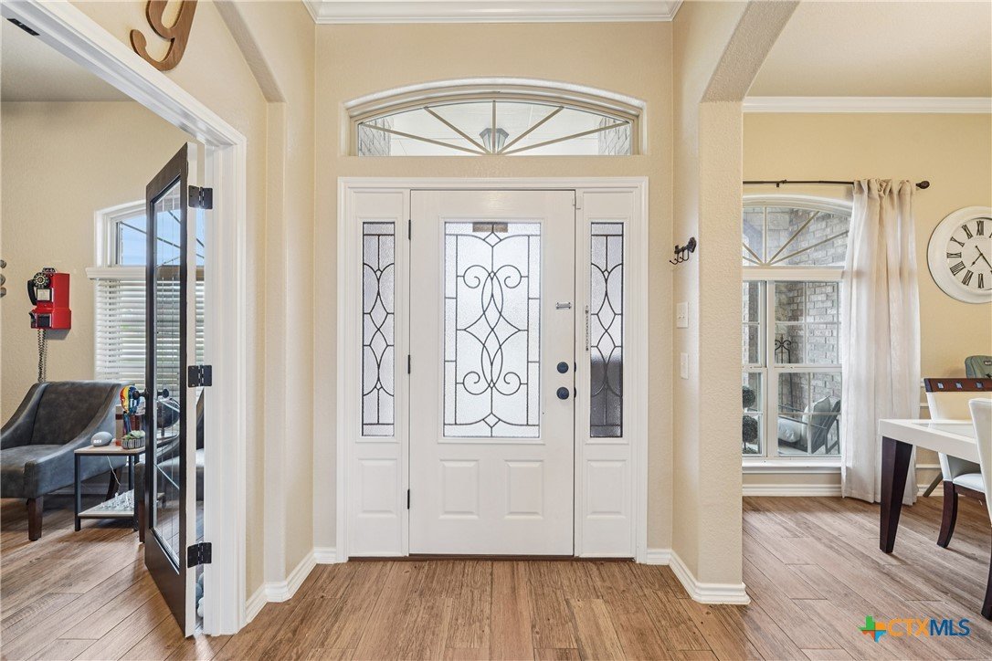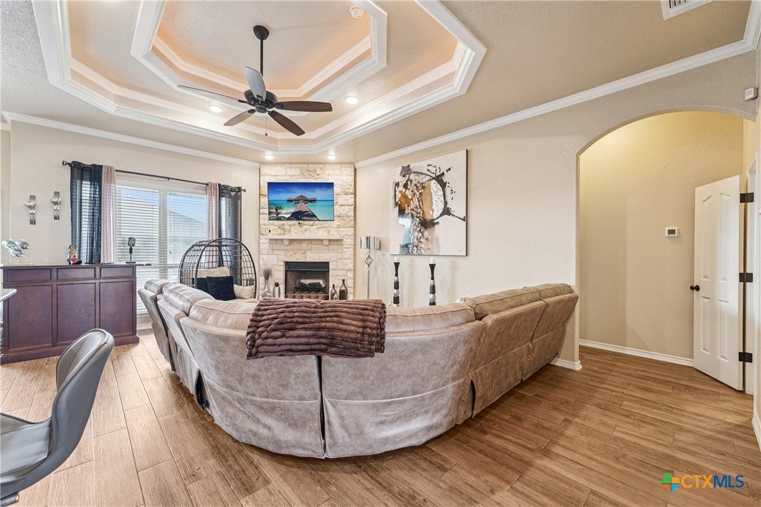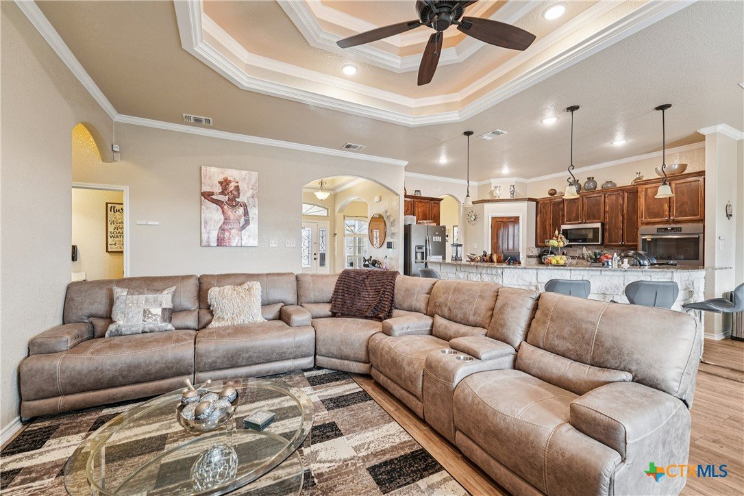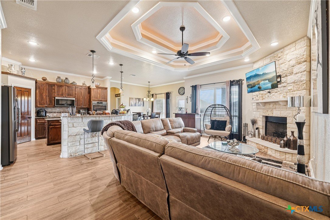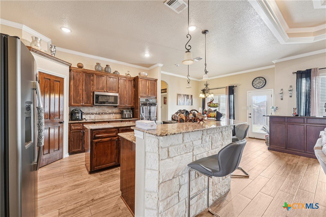 Stunning 4-bedroom, 2.5-bath home with a formal dining room and private office, thoughtfully designed for both everyday living and entertaining. The home features an open-concept main living area with a split-bedroom layout, offering space and privacy for everyone, while high ceilings, crown molding, and consistent flooring throughout create a cohesive and elegant feel. The living room is anchored by a beautiful brick electric fireplace, providing a warm focal point and flowing seamlessly into the chef’s kitchen and dining areas. The kitchen is designed to impress, featuring granite countertops, custom cabinetry, a double oven, stainless steel appliances, a breakfast bar, and a spacious walk-in pantry, all overlooking the living room and eat-in kitchen to make gatherings effortless. Just off the main living area, the private office with French doors and abundant natural light creates the perfect workspace, while the formal dining room provides additional space for hosting holidays or special occasions. The primary suite offers plush carpeting and a spacious en suite bathroom with a double vanity, jetted tub, large walk-in shower, and walk-in closets, creating a relaxing retreat. Additional bedrooms also feature high ceilings and plush carpet, providing comfort for everyone. The home continues to impress with a well-designed laundry room featuring a sink, cabinetry, and plenty of space to move comfortably, while outside you’ll find a covered back patio overlooking a private backyard, perfect for relaxing evenings or entertaining. Conveniently located near schools, restaurants, and shopping in Killeen, the home offers quick access to Fort Hood, as well as an easy drive to Temple and the scenic Texas Hill Country. With nearby access to I-35, commuting to Austin, Waco, or Dallas is simple. Schedule your private showing today! Contact Brett Swinton at Brett.swinton1atgmail.com or 254-258-2418