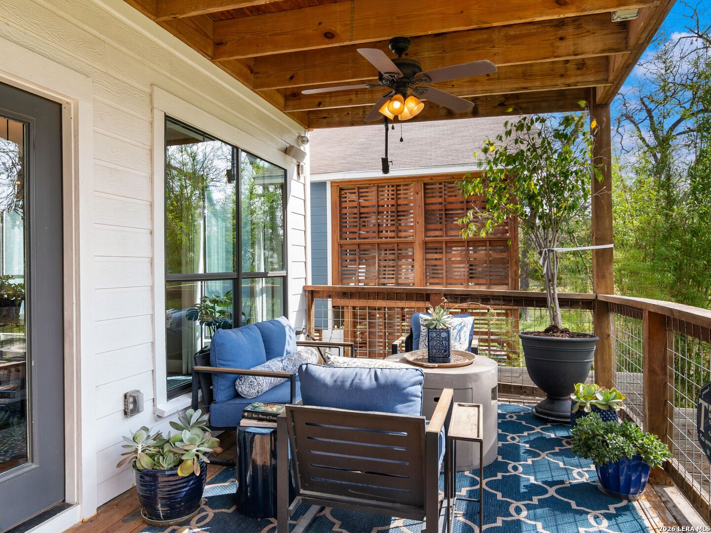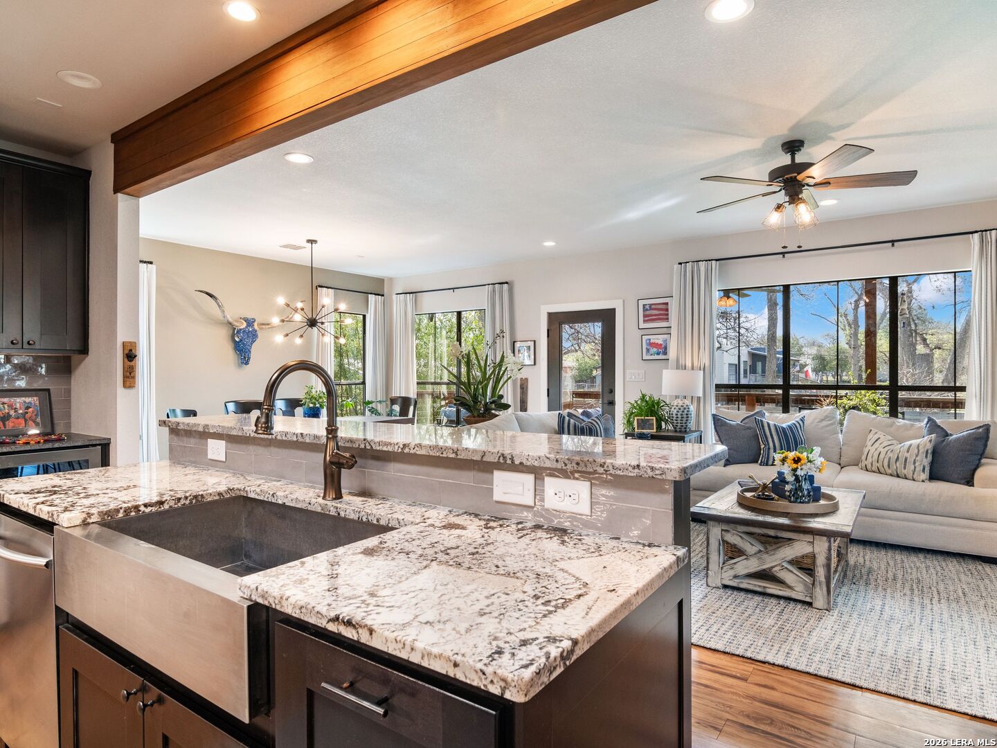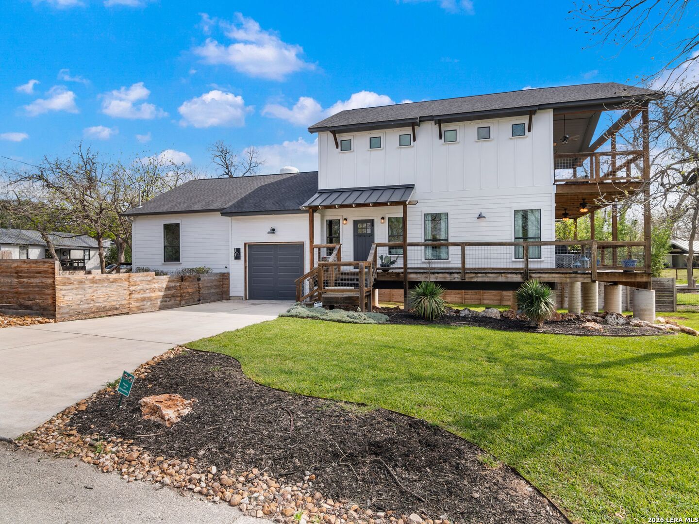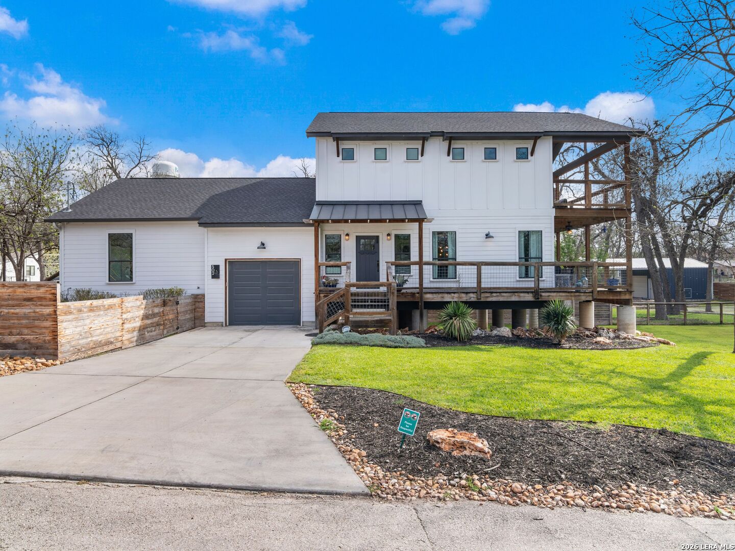 Live, Work & Entertain in Style - Downtown New Braunfels. Experience elevated downtown living in this modern luxury home, just minutes from the heart of New Braunfels. Walk, bike, or take a quick golf cart ride to the river, local hotspots, restaurants, bars, and the vibrant town square-perfect for an active, social lifestyle. Designed with both comfort and functionality in mind, this home features high-end finishes throughout and multiple indoor-outdoor living spaces, including two covered patios-ideal for hosting friends or unwinding after work. There is even a sprinkler system! The chef-inspired kitchen is the centerpiece of the home, complete with gas cooking, granite countertops, custom soft-close cabinetry, a farmhouse sink, double ovens, beverage fridge, spacious pantry, and a breakfast bar-perfect for casual mornings or entertaining nights in. Need space to work from home or generate extra income? This property offers a rare, fully equipped guest suite/apartment with its own private entrance, fenced yard, kitchen, bathroom, bedroom, and in-unit laundry. Connected by a breezeway that doubles as an ideal home office or creative studio, it's perfect for remote professionals, rental income, or hosting guests. Upstairs, you'll find two private bedrooms, each with its own en-suite bathroom, including a spacious primary retreat with its own covered patio-your personal escape. Additional highlights include an Open-concept living and oversized dining area for entertaining. Dedicated laundry room + half bath on main floor. One-car garage + additional driveway parking. Whether you're hosting, working remotely, or enjoying everything downtown has to offer, this home delivers the perfect blend of luxury, flexibility, and lifestyle.