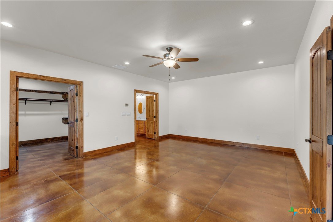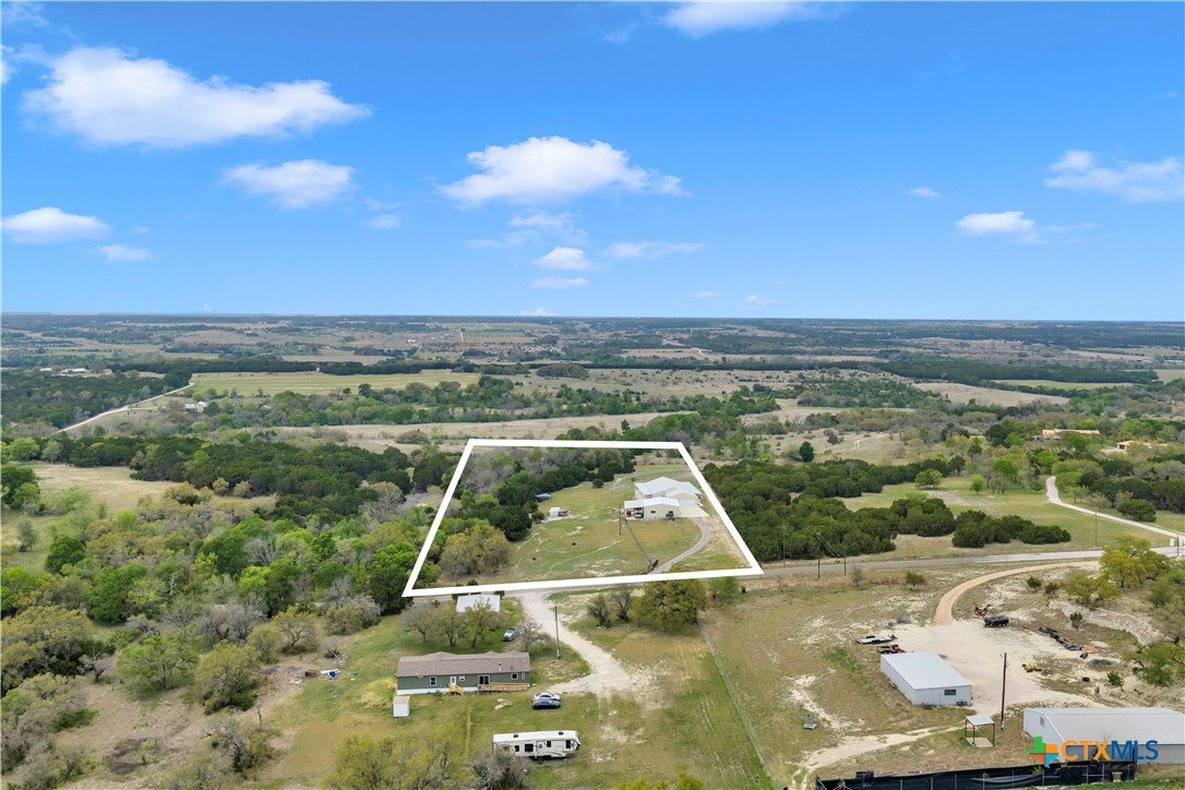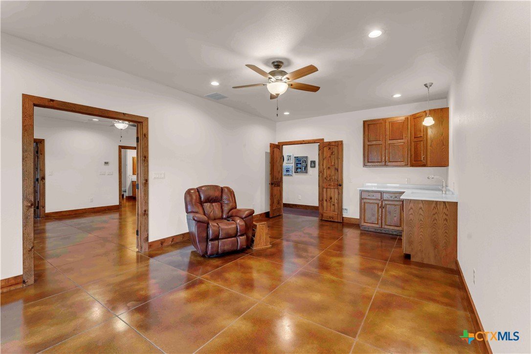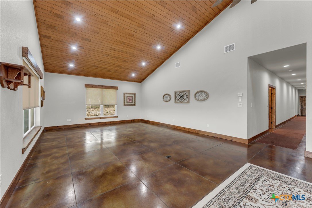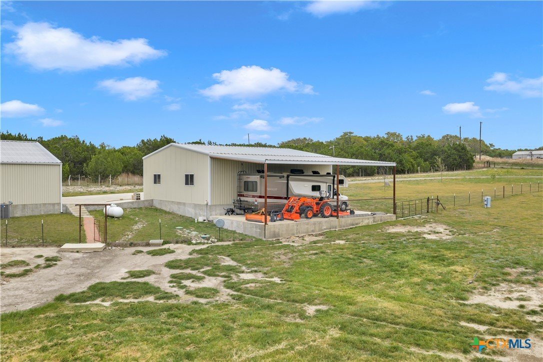 5 bed, 3 bath barndominium built in 2020 offering 3,600 sq ft on 7 ag-exempt acres with a gated entry and paved drive. The open-concept layout features high ceilings, stained concrete floors, recessed lighting, and a custom kitchen with a large granite center island, farmhouse sink, custom cabinetry, butler’s pantry, stainless steel appliances, and wood ceilings that extend into the living area. The primary suite is joined by a private office and includes dual granite vanities, a large tiled surround walk-in shower, and separate his and her walk-in closets, while a fully insulated private guest suite offers its own bath with an ADA shower/tub combo, walk-in closet, sitting area, and kitchenette. Outdoor features include a covered wraparound porch with ceiling fans, a landscaped yard with sprinkler system and fountain garden, as well as sheds, livestock pens, and a poultry coop. A detached 40x40 insulated workshop includes 50-amp service, septic hookup, and an attached covered RV slab for additional parking or storage.