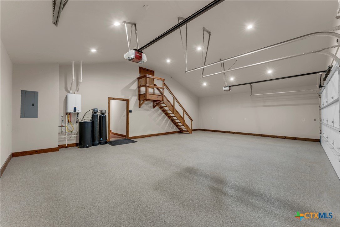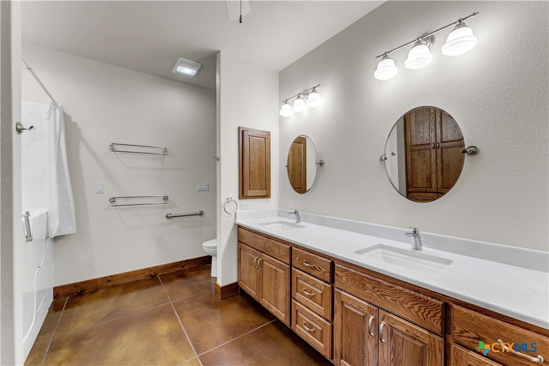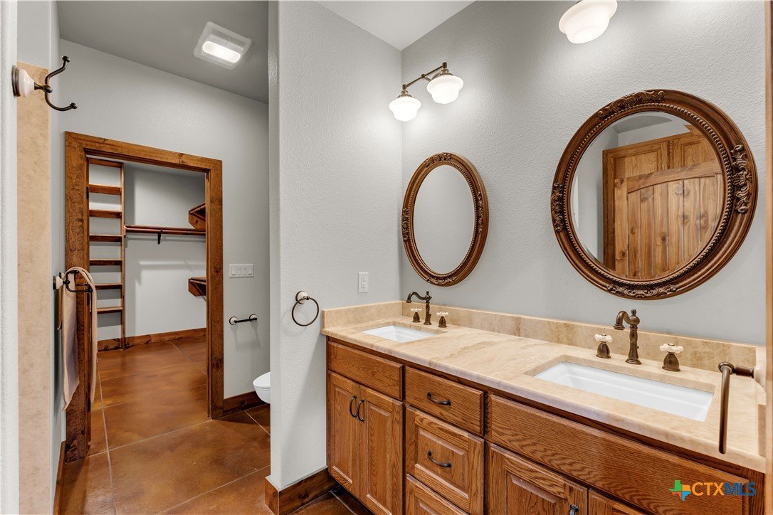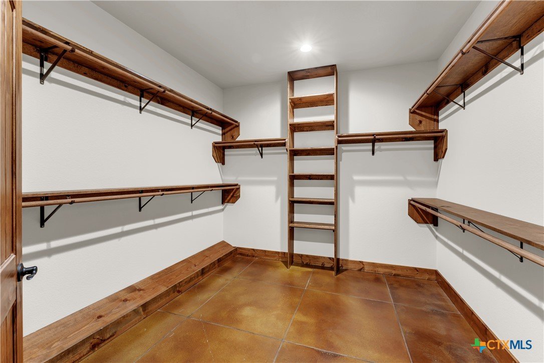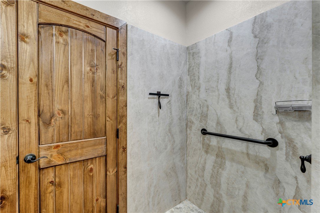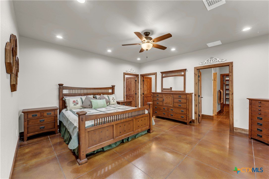 5 bed, 3 bath barndominium built in 2020 offering 3,600 sq ft on 7 ag-exempt acres with a gated entry and paved drive. The open-concept layout features high ceilings, stained concrete floors, recessed lighting, and a custom kitchen with a large granite center island, farmhouse sink, custom cabinetry, butler’s pantry, stainless steel appliances, and wood ceilings that extend into the living area. The primary suite is joined by a private office and includes dual granite vanities, a large tiled surround walk-in shower, and separate his and her walk-in closets, while a fully insulated private guest suite offers its own bath with an ADA shower/tub combo, walk-in closet, sitting area, and kitchenette. Outdoor features include a covered wraparound porch with ceiling fans, a landscaped yard with sprinkler system and fountain garden, as well as sheds, livestock pens, and a poultry coop. A detached 40x40 insulated workshop includes 50-amp service, septic hookup, and an attached covered RV slab for additional parking or storage.