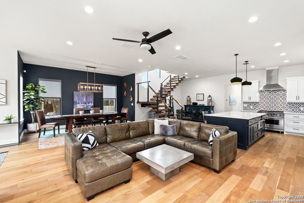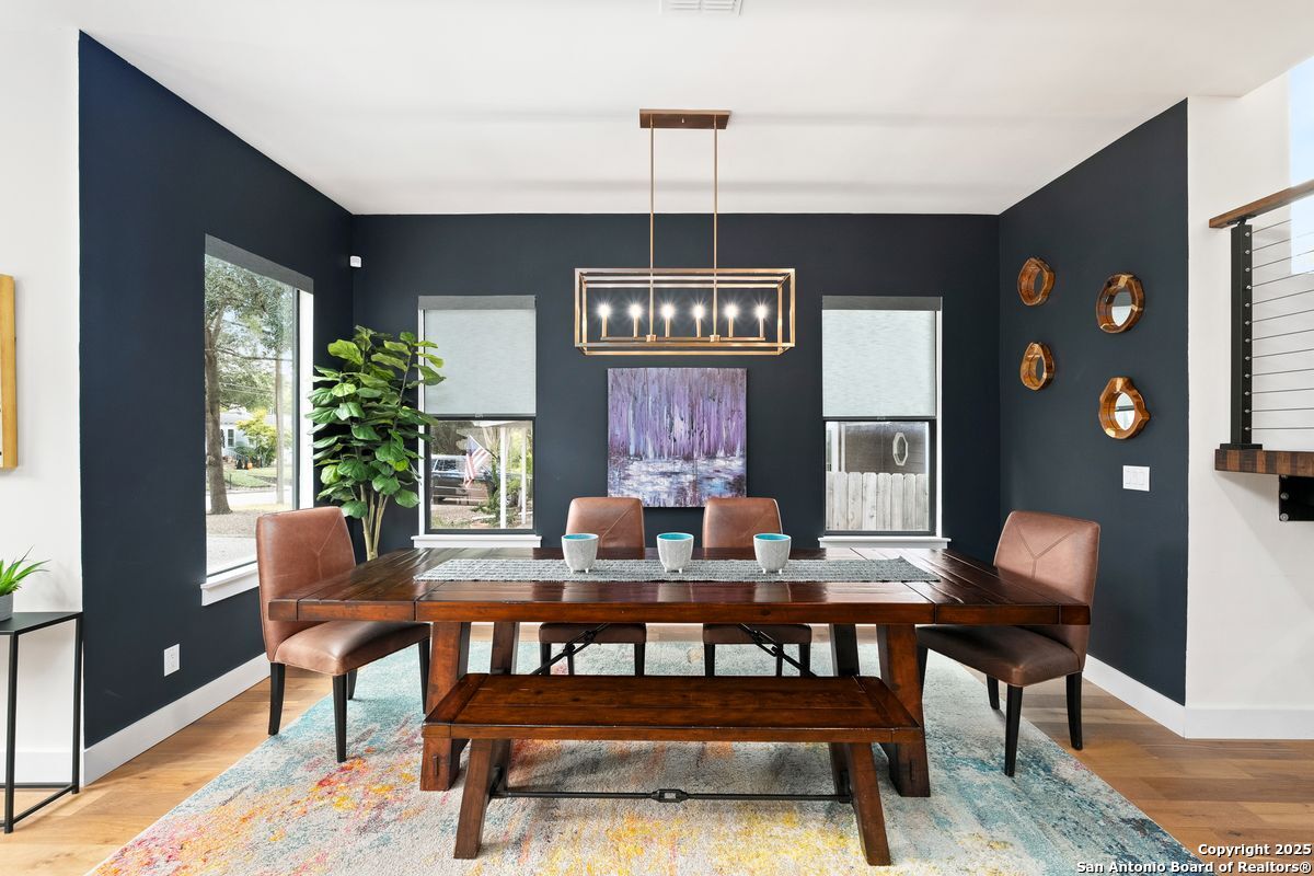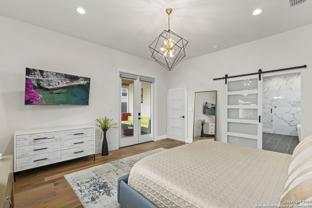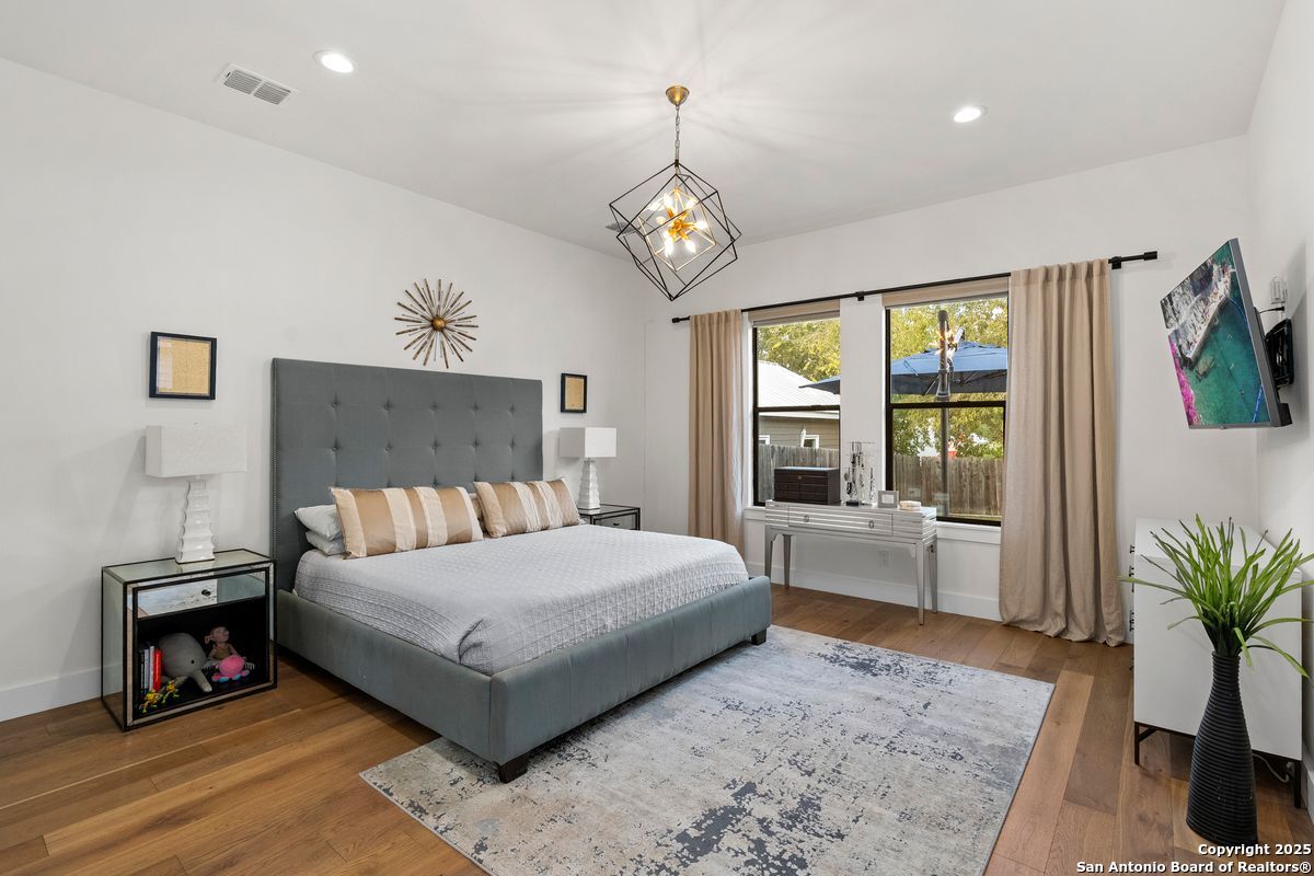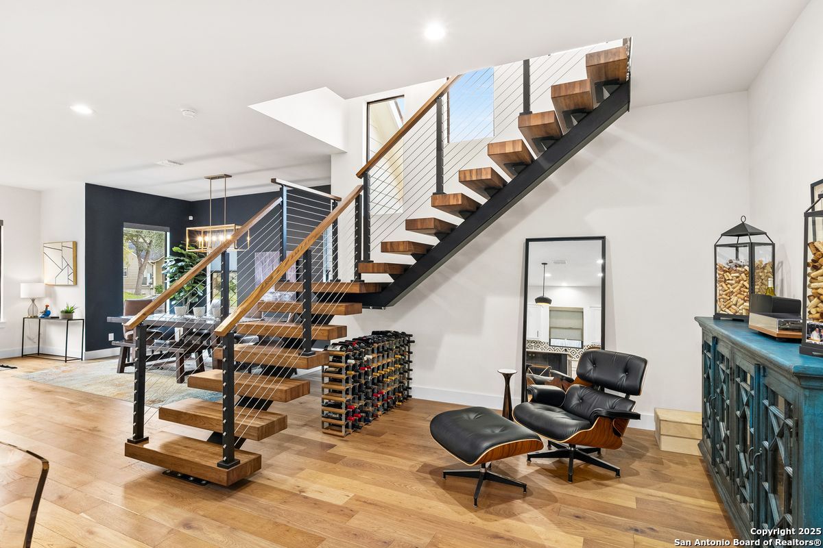 A refined residence crafted with a sophisticated, design-forward aesthetic and an effortless sense of luxury. Clean contemporary lines, an airy open-concept layout, and a stunning architectural showpiece floating wood staircase create an atmosphere that is both visually striking and elevated. The culinary kitchen serves as the heart of the home, anchored by quartz surfaces, a center island, stainless steel appliances, and designer hardware and fixtures. Light, wide-plank hardwood floors flow throughout, enhancing the home's bright, modern elegance. The main-level primary suite is a serene private retreat, offering a spa-caliber ensuite bathroom with an oversized walk-in shower, a freestanding soaking tub, dual vanities, and a generously sized boutique-style closet. Upstairs, three beautifully appointed bedrooms, two refined bathrooms, and a versatile space that can serve as a lounge, media room, or home office provide thoughtful accommodations for modern living. Outdoors, a peaceful patio overlooks a sparkling Cody pool, perfect for stylish entertaining or quiet moments of relaxation. A detached two-car garage completes this impeccably curated property.