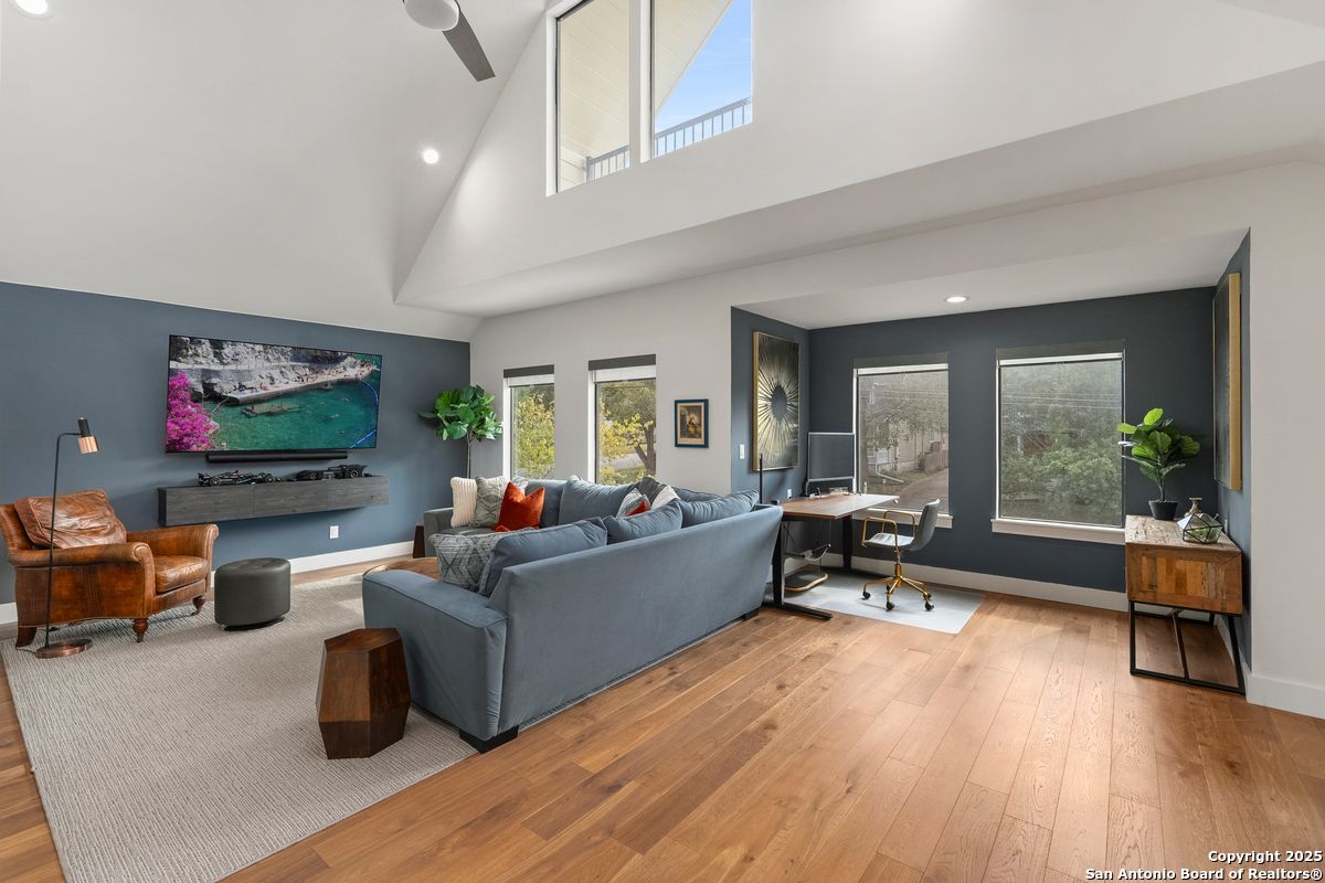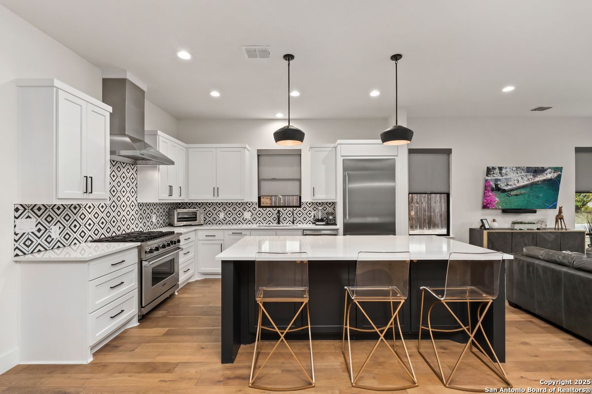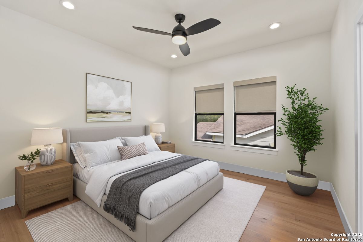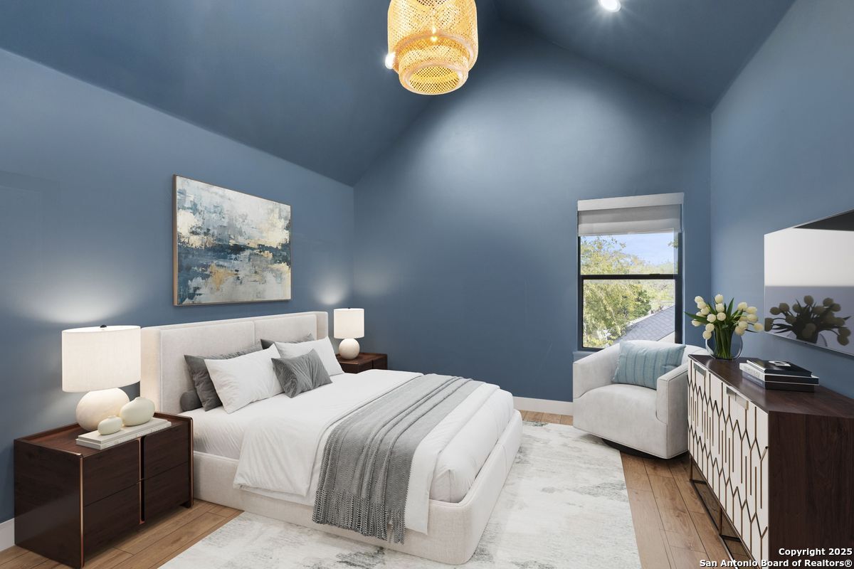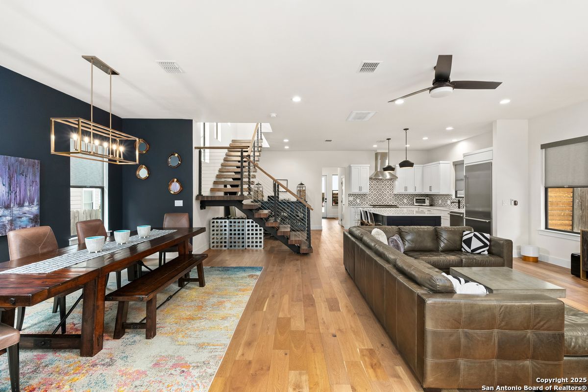 A refined residence crafted with a sophisticated, design-forward aesthetic and an effortless sense of luxury. Clean contemporary lines, an airy open-concept layout, and a stunning architectural showpiece floating wood staircase create an atmosphere that is both visually striking and elevated. The culinary kitchen serves as the heart of the home, anchored by quartz surfaces, a center island, stainless steel appliances, and designer hardware and fixtures. Light, wide-plank hardwood floors flow throughout, enhancing the home's bright, modern elegance. The main-level primary suite is a serene private retreat, offering a spa-caliber ensuite bathroom with an oversized walk-in shower, a freestanding soaking tub, dual vanities, and a generously sized boutique-style closet. Upstairs, three beautifully appointed bedrooms, two refined bathrooms, and a versatile space that can serve as a lounge, media room, or home office provide thoughtful accommodations for modern living. Outdoors, a peaceful patio overlooks a sparkling Cody pool, perfect for stylish entertaining or quiet moments of relaxation. A detached two-car garage completes this impeccably curated property.