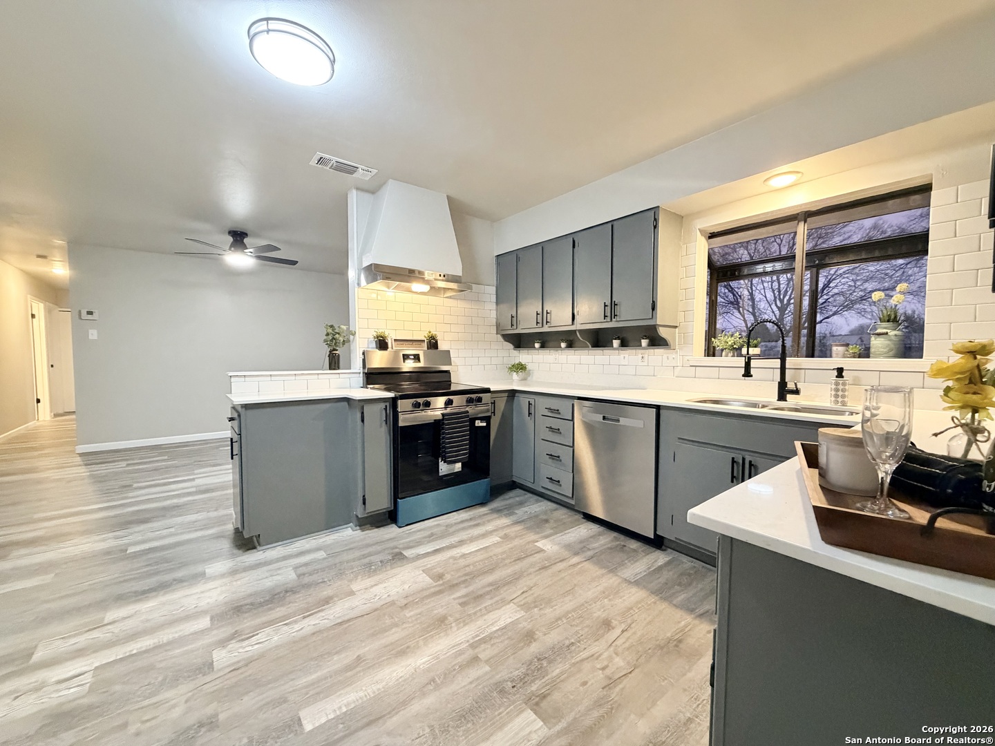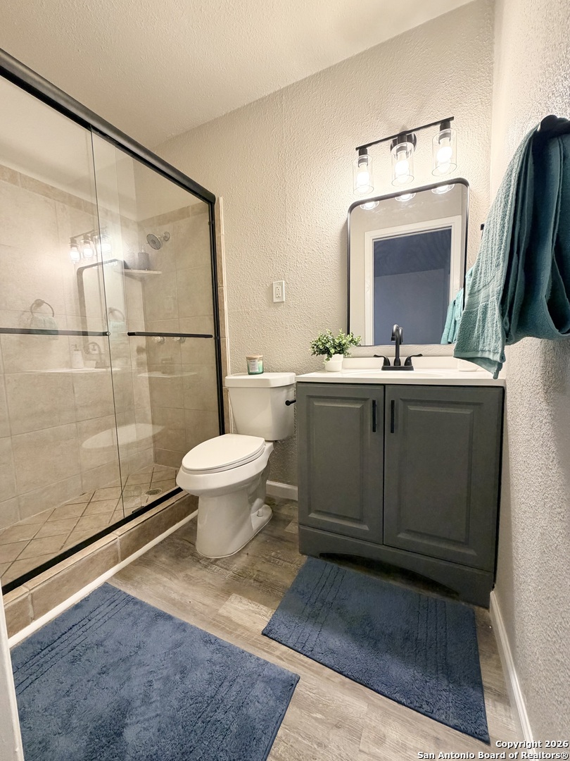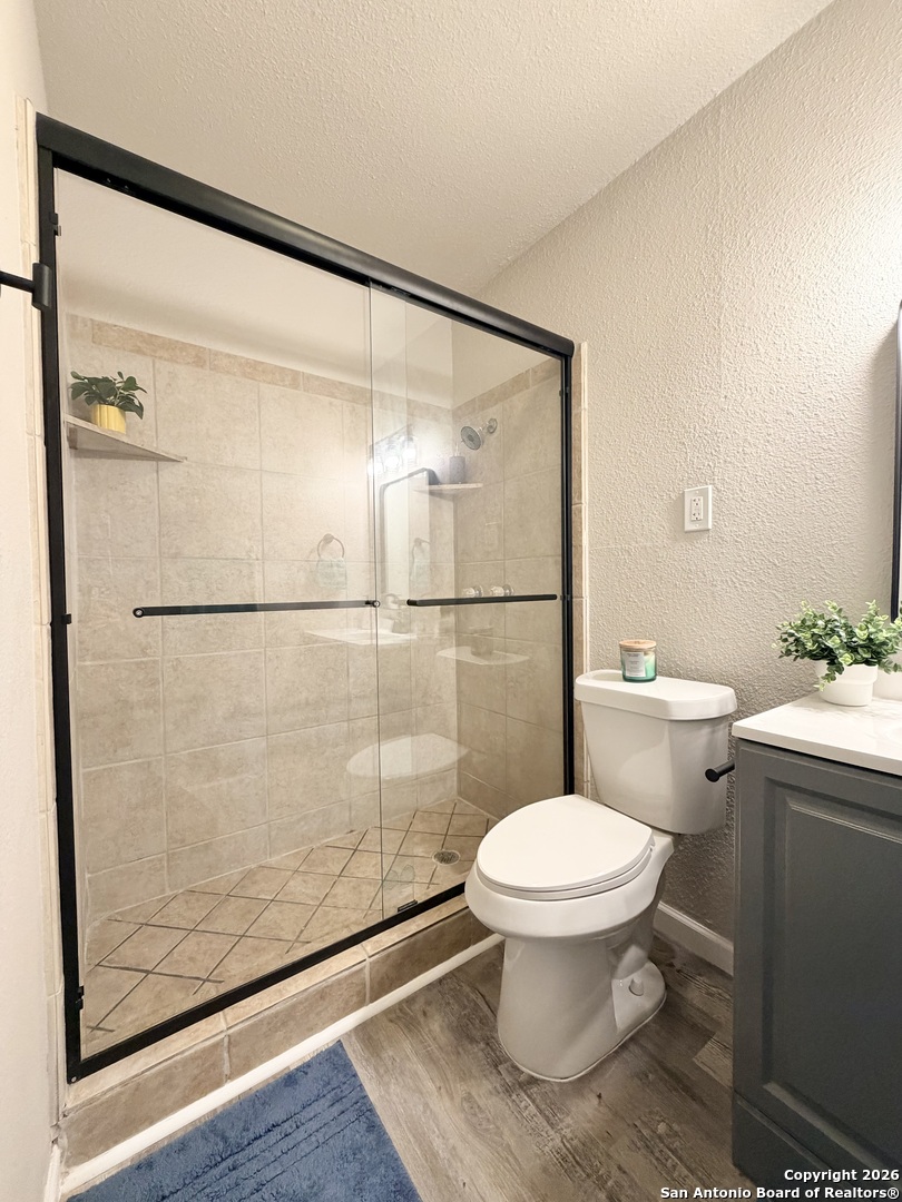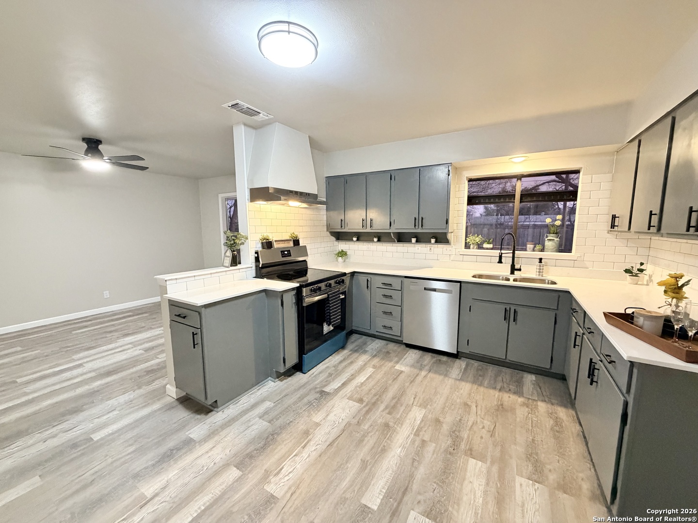 Completely refreshed & move in ready, this beautifully updated single story home offers 3 bedrooms, 2 full bathrooms & a one car garage. Thoughtful upgrades include fresh interior & exterior paint, newly painted kitchen cabinets, stunning quartz countertops, subway tile backsplash & modern hardware. Both bathrooms have been stylishly updated with new vanities, mirrors & toilets. All interior & exterior light fixtures are brand new, complemented by new ceiling fans in every bedroom & the main living area. Luxury vinyl plank flooring flows throughout the home, creating a bright, cohesive & low maintenance living space. Ideally located in NE San Antonio near I 35 & Loop 410, just minutes from Windcrest & Kirby, with convenient access to shopping, dining, parks & major commuter routes. This home shows beautifully & is ready for immediate enjoyment schedule your showing today!