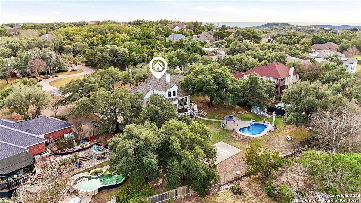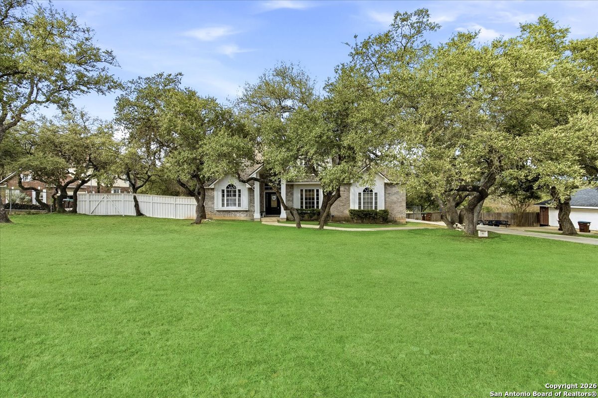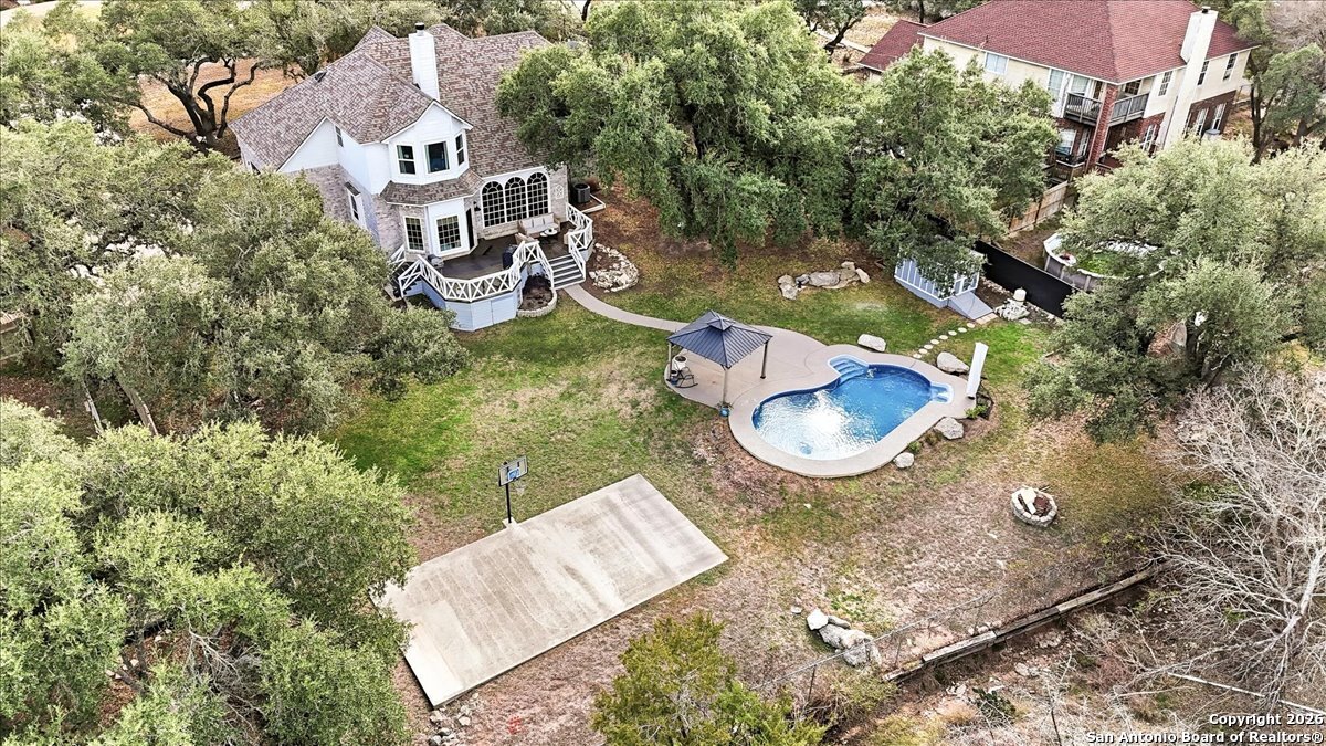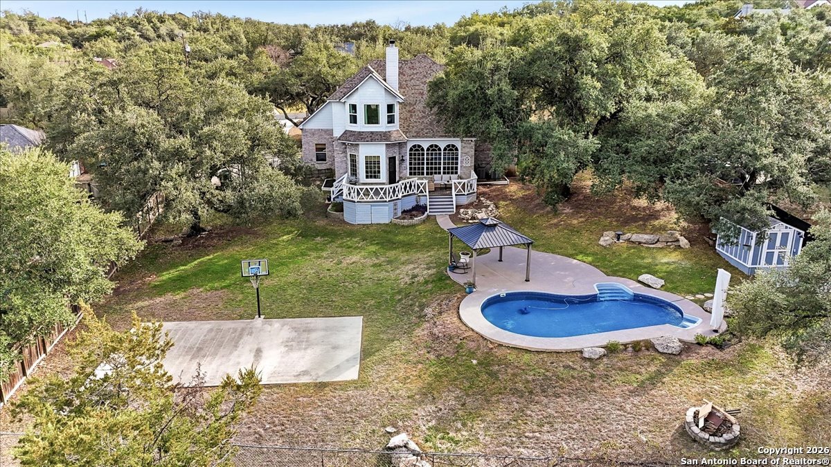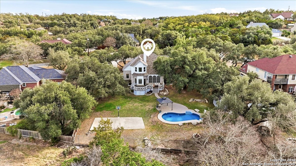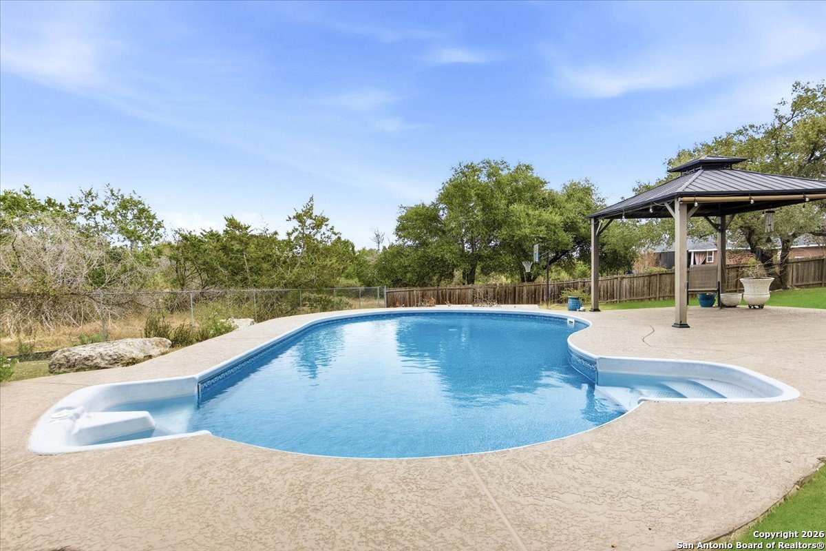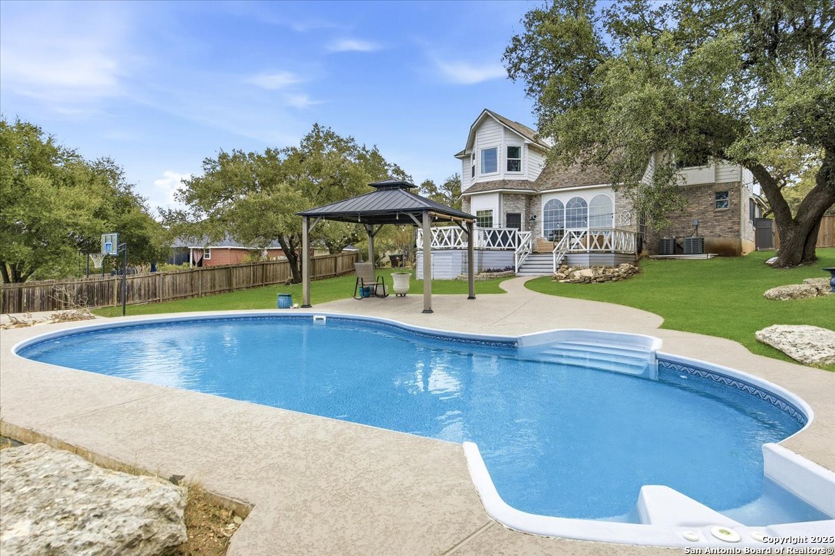 Set on a private 0.58-acre lot in prestigious Timberwood Park, this beautifully updated 4 bedroom residence offers resort-style living with a sparkling pool and expansive outdoor spaces. The open floor plan features two dining areas, a light-filled family room with vaulted ceilings and a fireplace, and walls of windows overlooking the backyard oasis. The primary suite is conveniently located on the main level. The well-appointed kitchen showcases stainless steel appliances, painted cabinetry, upgraded lighting, and granite countertops, flowing effortlessly into the main living areas. Upstairs, a spacious game room and secondary bedrooms provide flexible living and entertaining options. Recent improvements include a freshly repainted interior, updated laundry room, newly stained garage door, and a roof replaced in 2019. Outdoor living is elevated with a recently rebuilt deck overlooking the pool, mature oak trees, and a fully fenced, private backyard-ideal for entertaining or quiet relaxation. Enjoy exceptional neighborhood amenities including a 9-hole golf course, clubhouse, swimming pool, pickleball courts, catch-and-release lake, playground, and vibrant community events. Located in acclaimed Comal ISD and zoned to Pieper Middle and High School, this home delivers privacy, lifestyle, and timeless appeal.
