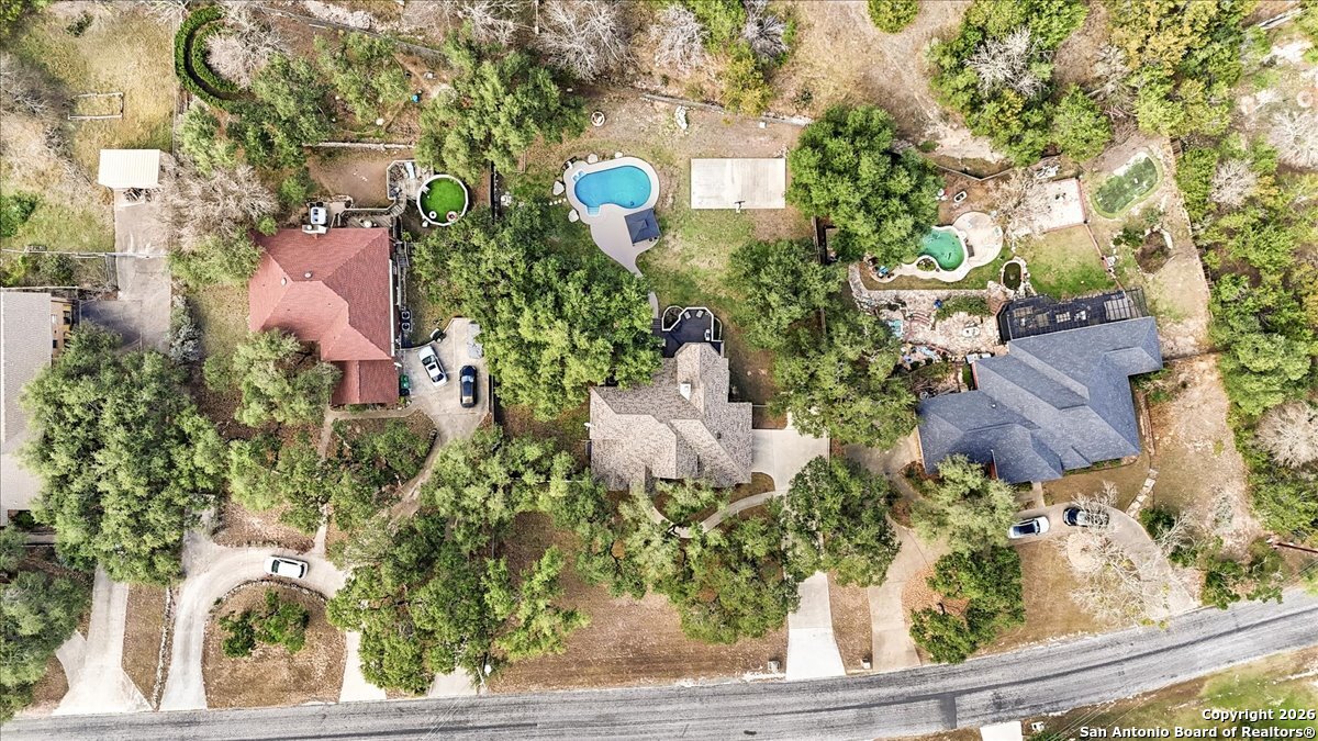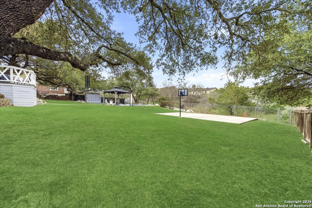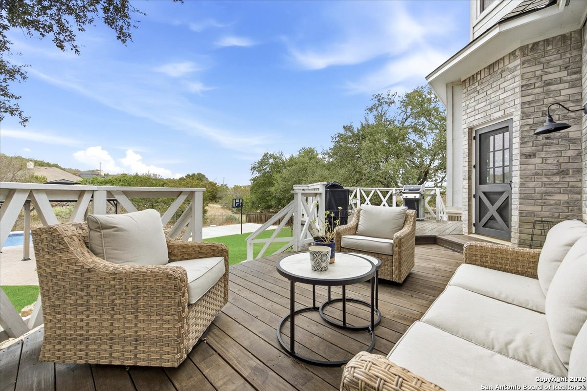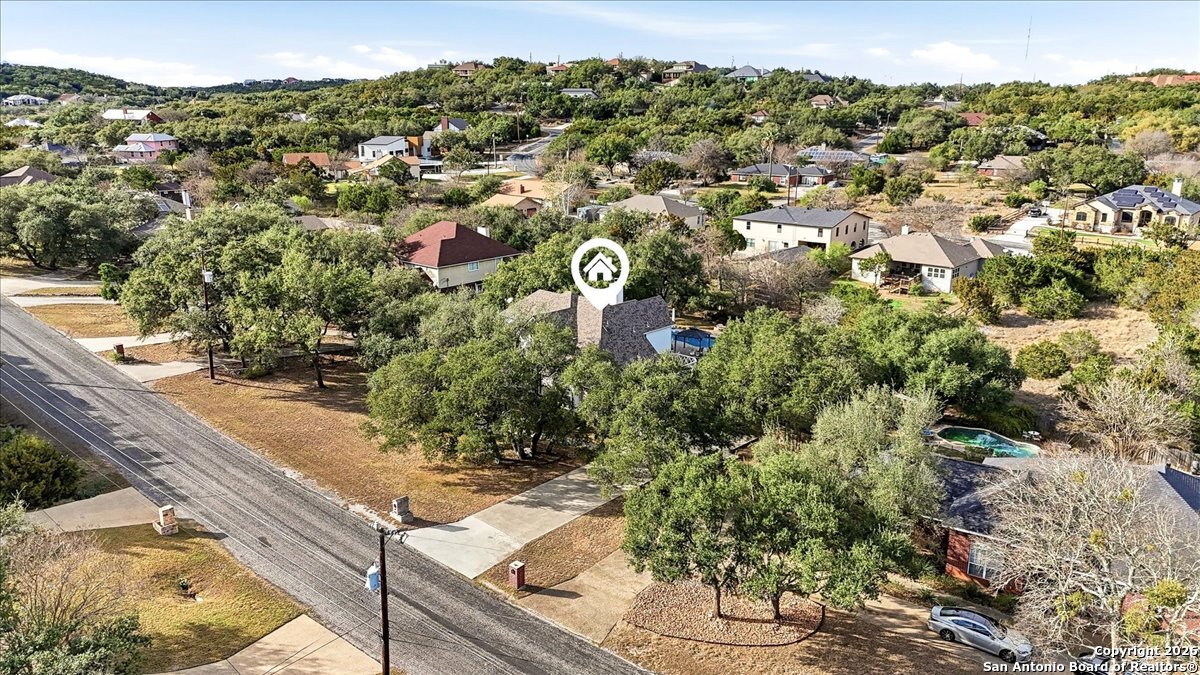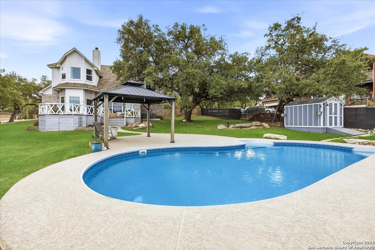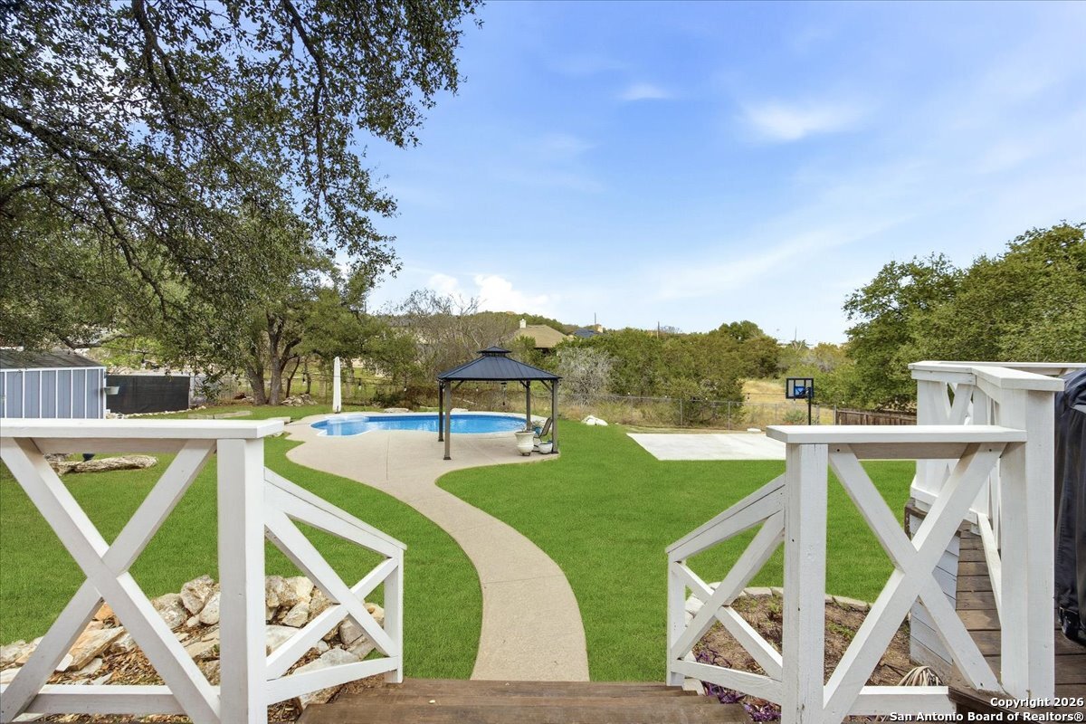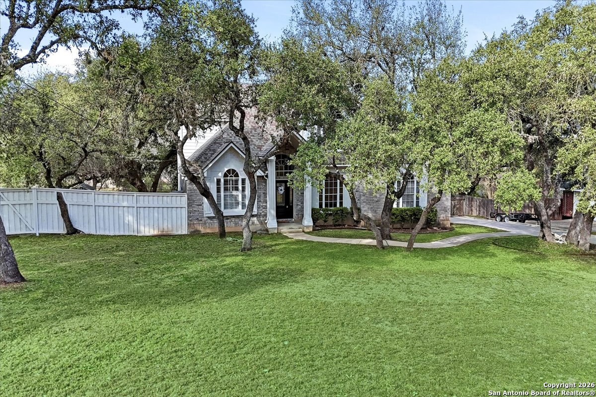 Set on a private 0.58-acre lot in prestigious Timberwood Park, this beautifully updated 4 bedroom residence offers resort-style living with a sparkling pool and expansive outdoor spaces. The open floor plan features two dining areas, a light-filled family room with vaulted ceilings and a fireplace, and walls of windows overlooking the backyard oasis. The primary suite is conveniently located on the main level. The well-appointed kitchen showcases stainless steel appliances, painted cabinetry, upgraded lighting, and granite countertops, flowing effortlessly into the main living areas. Upstairs, a spacious game room and secondary bedrooms provide flexible living and entertaining options. Recent improvements include a freshly repainted interior, updated laundry room, newly stained garage door, and a roof replaced in 2019. Outdoor living is elevated with a recently rebuilt deck overlooking the pool, mature oak trees, and a fully fenced, private backyard-ideal for entertaining or quiet relaxation. Enjoy exceptional neighborhood amenities including a 9-hole golf course, clubhouse, swimming pool, pickleball courts, catch-and-release lake, playground, and vibrant community events. Located in acclaimed Comal ISD and zoned to Pieper Middle and High School, this home delivers privacy, lifestyle, and timeless appeal.