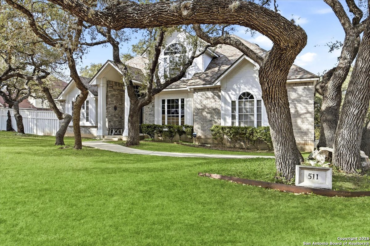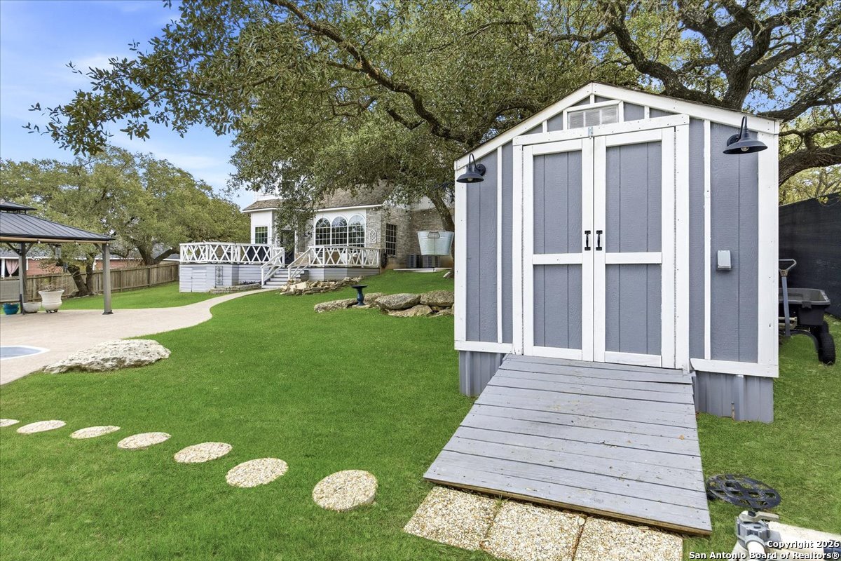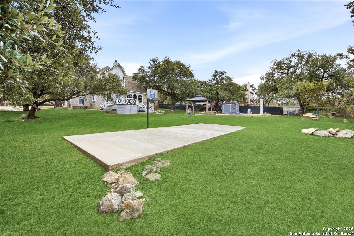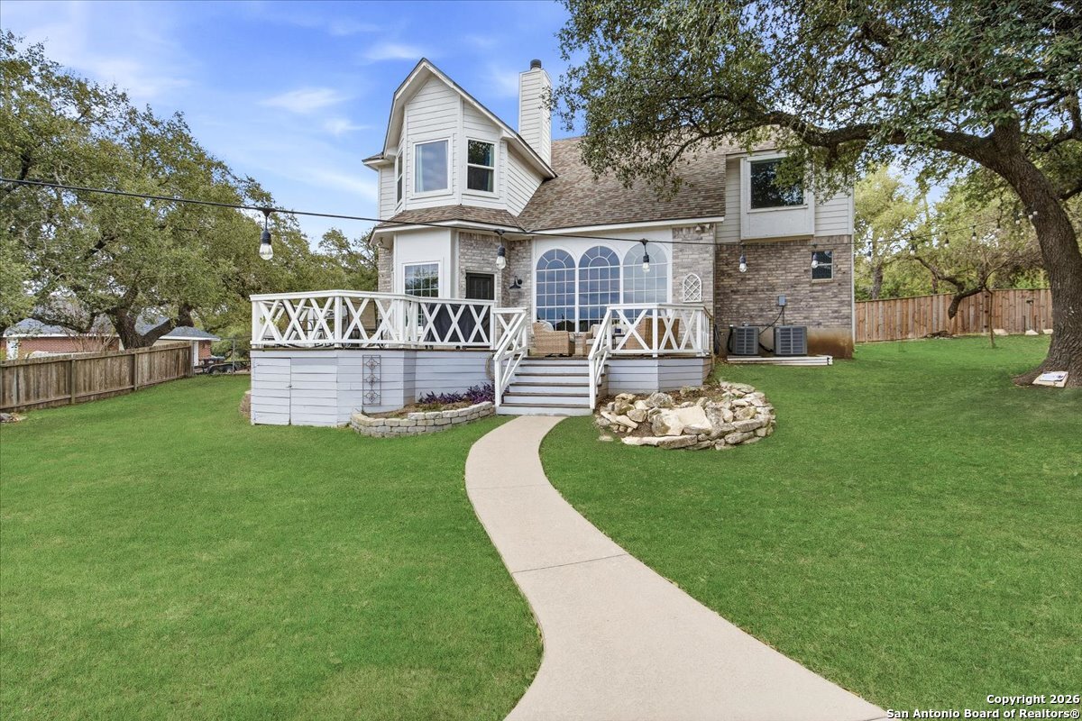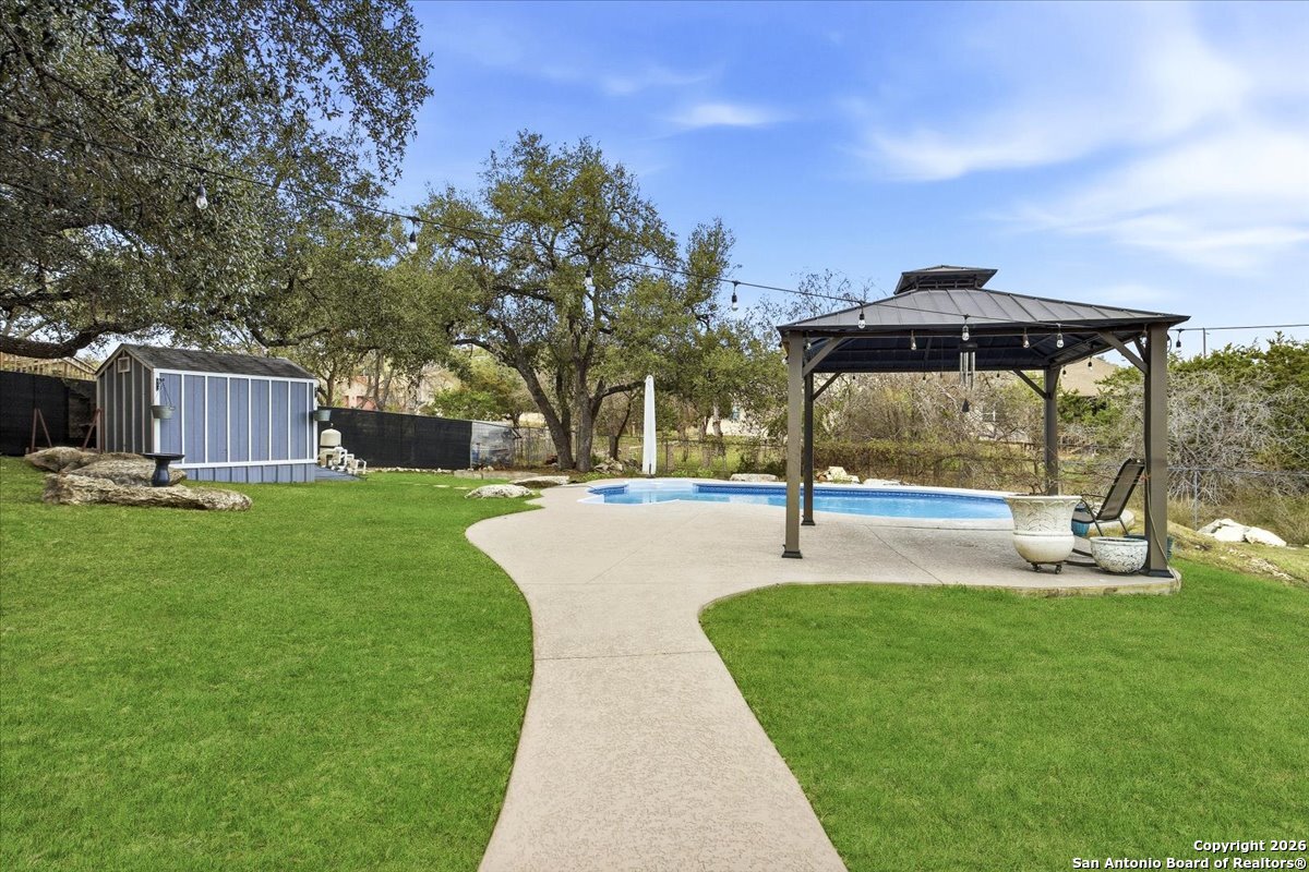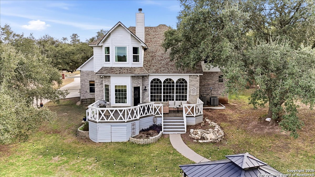 Set on a private 0.58-acre lot in prestigious Timberwood Park, this beautifully updated 4 bedroom residence offers resort-style living with a sparkling pool and expansive outdoor spaces. The open floor plan features two dining areas, a light-filled family room with vaulted ceilings and a fireplace, and walls of windows overlooking the backyard oasis. The primary suite is conveniently located on the main level. The well-appointed kitchen showcases stainless steel appliances, painted cabinetry, upgraded lighting, and granite countertops, flowing effortlessly into the main living areas. Upstairs, a spacious game room and secondary bedrooms provide flexible living and entertaining options. Recent improvements include a freshly repainted interior, updated laundry room, newly stained garage door, and a roof replaced in 2019. Outdoor living is elevated with a recently rebuilt deck overlooking the pool, mature oak trees, and a fully fenced, private backyard-ideal for entertaining or quiet relaxation. Enjoy exceptional neighborhood amenities including a 9-hole golf course, clubhouse, swimming pool, pickleball courts, catch-and-release lake, playground, and vibrant community events. Located in acclaimed Comal ISD and zoned to Pieper Middle and High School, this home delivers privacy, lifestyle, and timeless appeal.