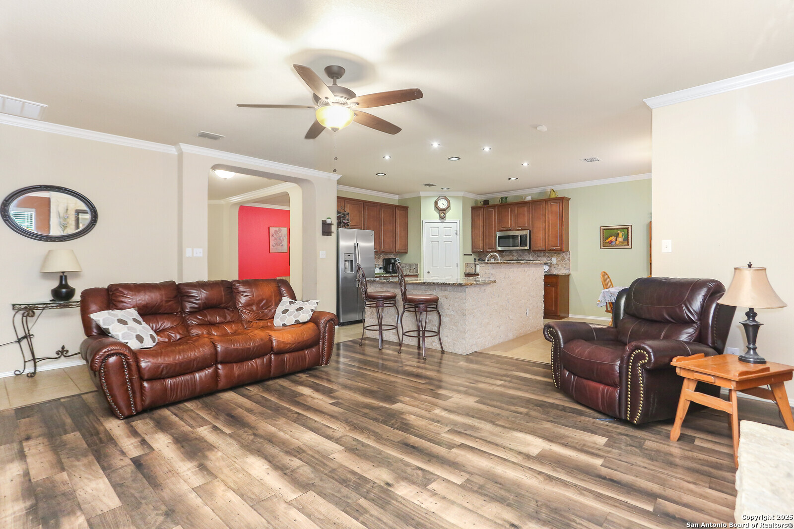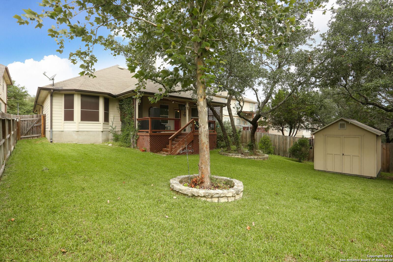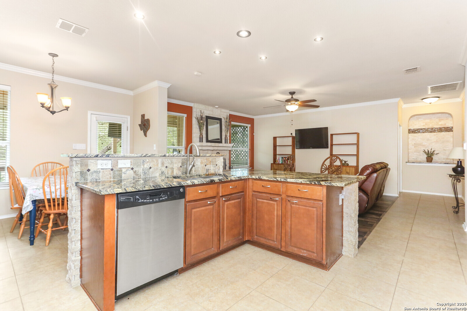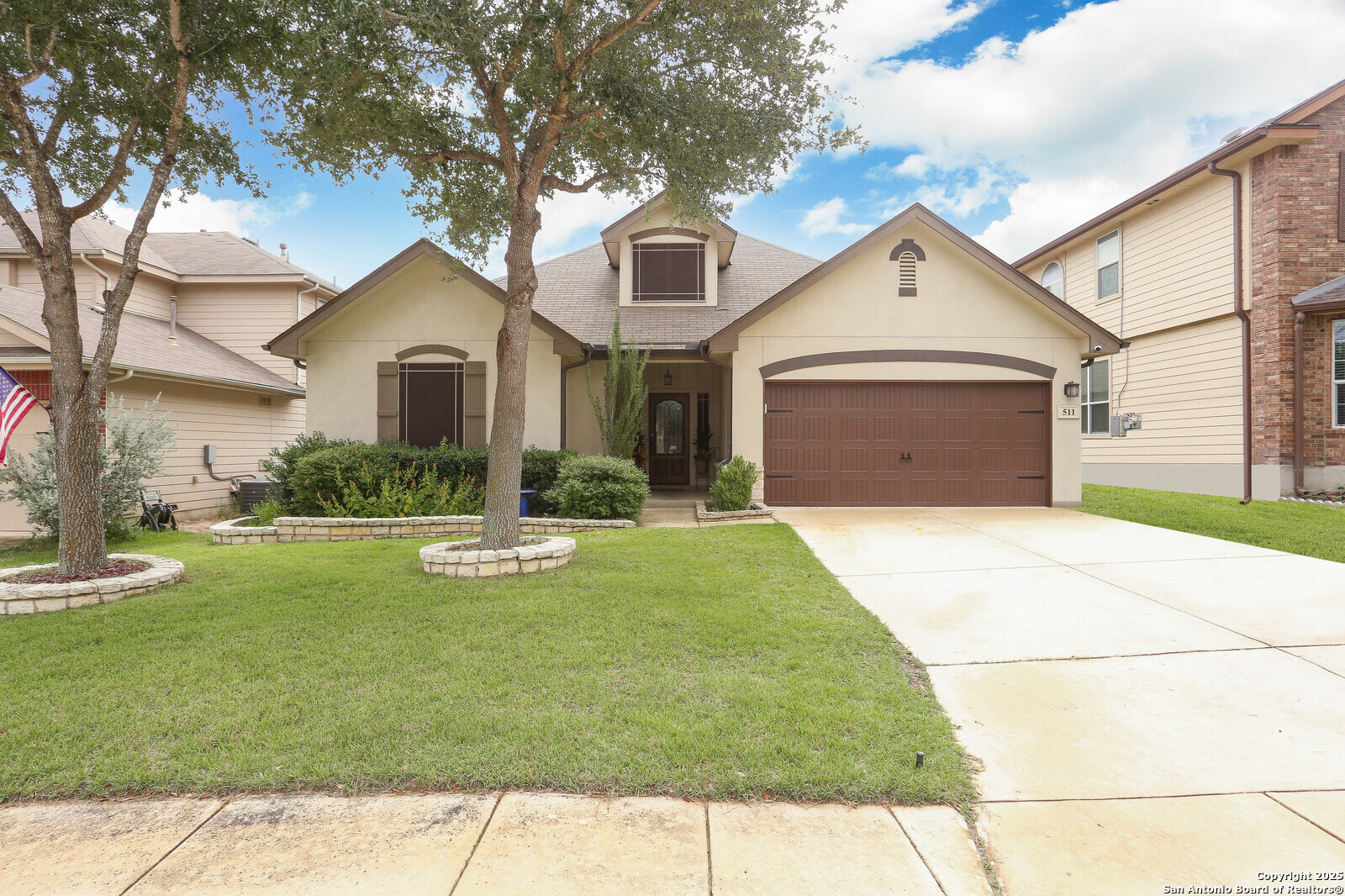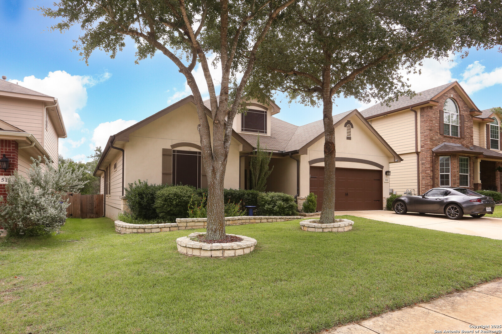 Welcome to this beautifully maintained single-story home offering the perfect blend of functionality, comfort, and style. Featuring 3 spacious bedrooms plus a versatile flex room, this home easily adapts to your needs-whether you're looking for a 4th bedroom, home office, playroom, or creative space. Upon entry, you'll find two well-sized bedrooms and a full bathroom, along with convenient storage including a coat closet and a front-facing laundry room. The open-concept kitchen and living area are ideal for hosting and everyday family life. The kitchen is a true highlight, boasting granite countertops, a gas cooktop, large island with bar seating, and a walk-in pantry. A formal dining room and separate breakfast nook offer flexibility in how you use your living space-entertain guests or convert the formal dining into a study or lounge. Large windows flood the living room with natural light, enhancing the airy and welcoming feel. Retreat to the private primary suite tucked at the rear of the home, complete with elegant tray ceilings and a charming bay window. The spa-like primary bath includes an oversized walk-in shower, dual vanities, a linen closet, and an expansive walk-in closet designed to accommodate your full wardrobe and more. Step outside to your personal oasis: an extended patio perfect for summer gatherings, a lush green lawn, a storage shed, and no rear neighbors thanks to the serene greenbelt lot-offering added privacy and a tranquil view. The neighborhood offers an incredible lifestyle with two swimming pools, basketball and tennis courts, two playgrounds, walking trails, and a large open green space for outdoor fun. The elementary school is located right within the neighborhood, making daily routines easier than ever. Plus, enjoy close proximity to Lackland AFB, SeaWorld, shopping, dining, and more! Don't miss your chance to own this versatile and well-appointed home in a community that truly has it all. Schedule your showing today!