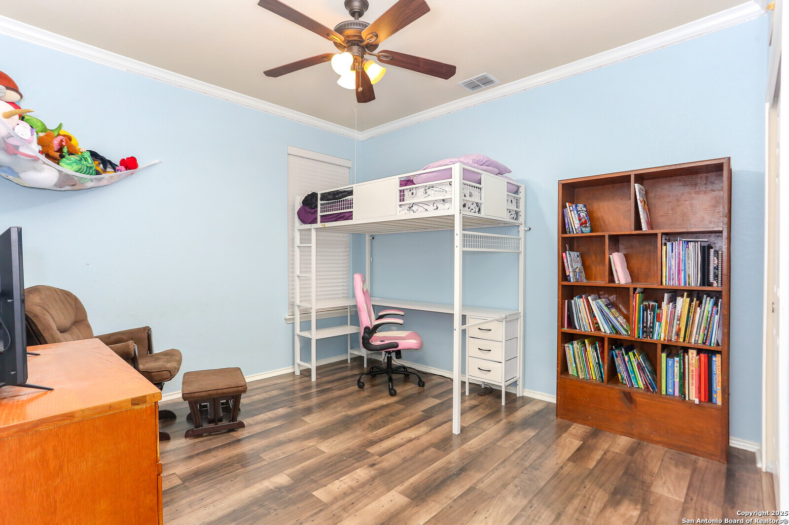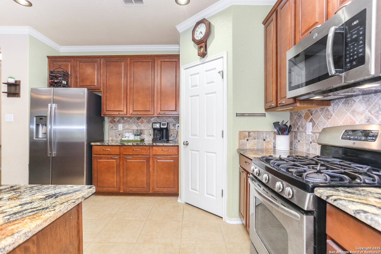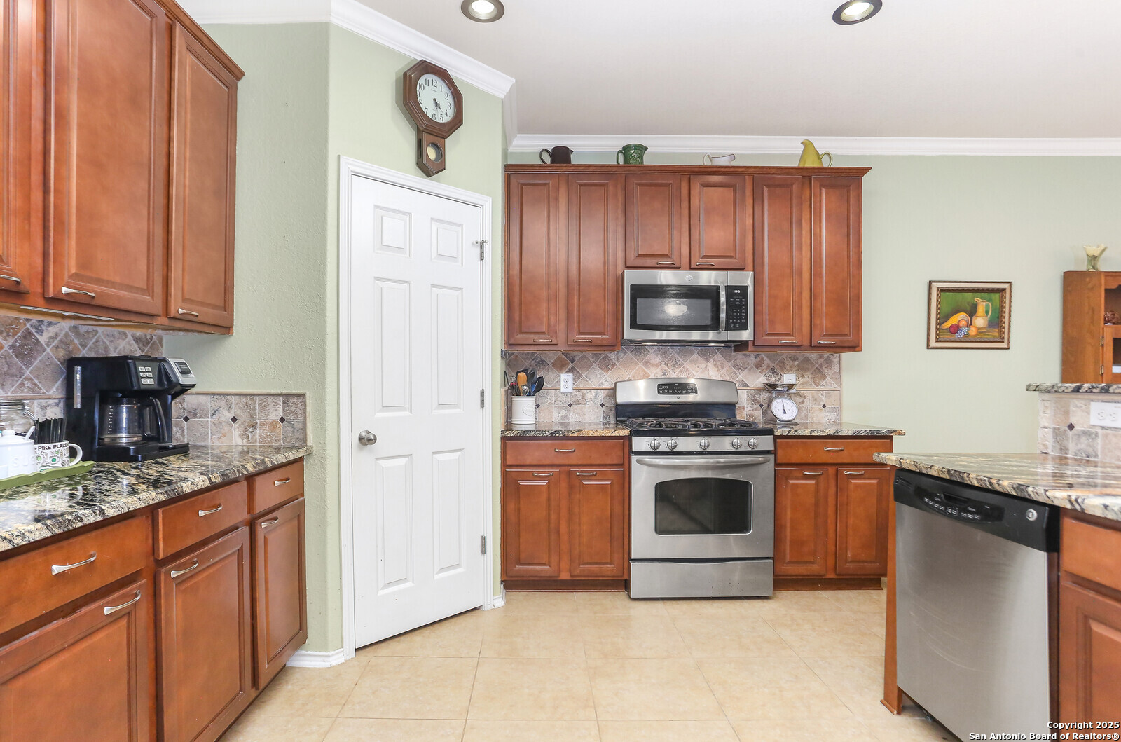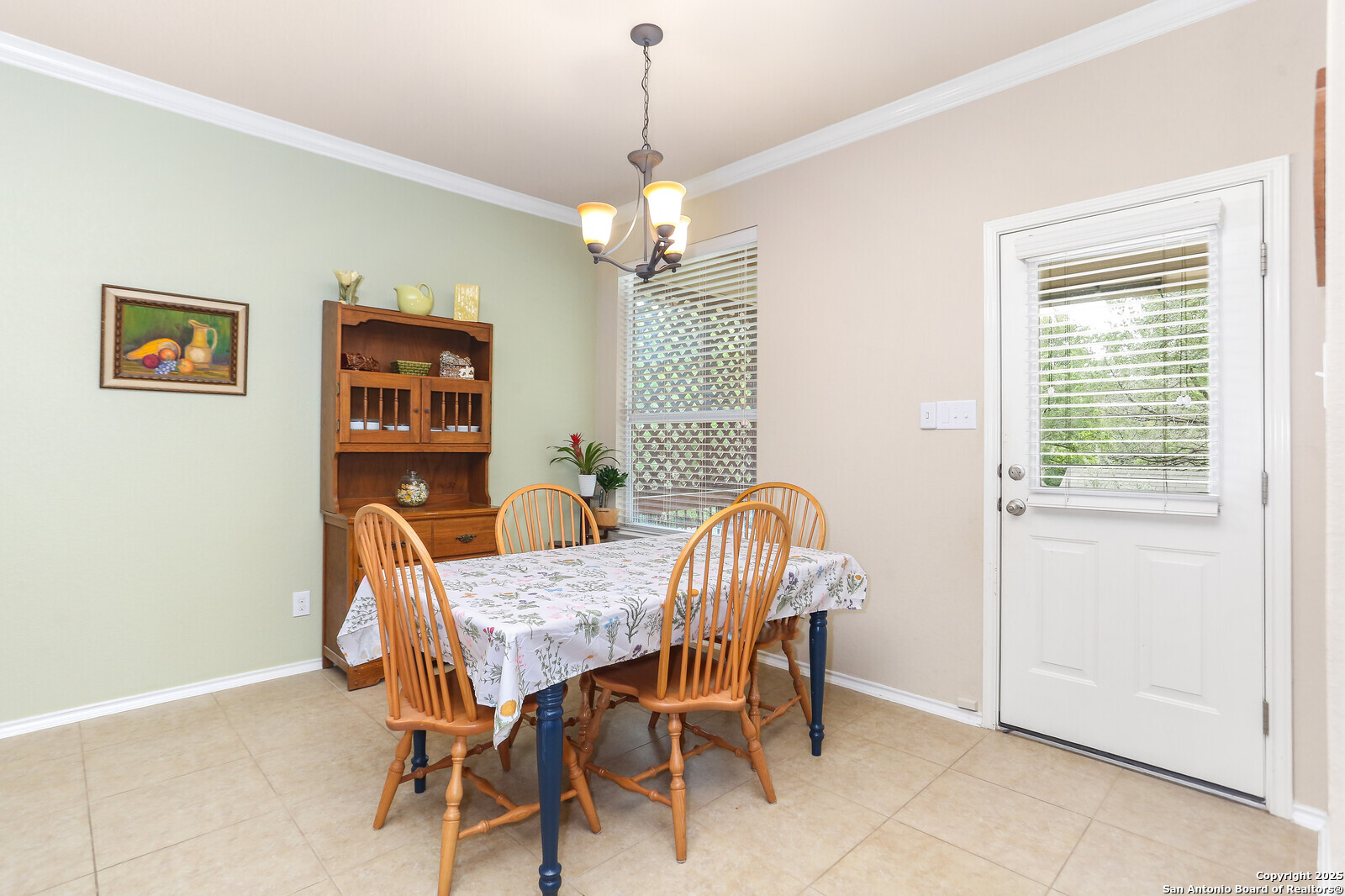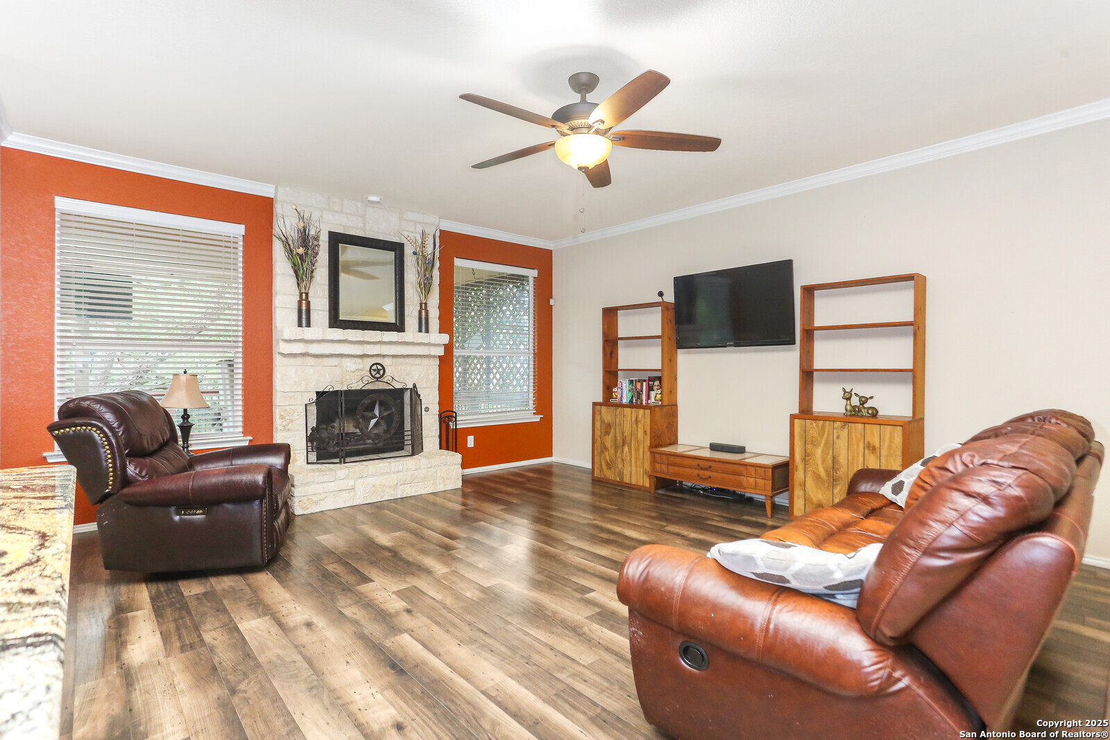 Welcome to this beautifully maintained single-story home offering the perfect blend of functionality, comfort, and style. Featuring 3 spacious bedrooms plus a versatile flex room, this home easily adapts to your needs-whether you're looking for a 4th bedroom, home office, playroom, or creative space. Upon entry, you'll find two well-sized bedrooms and a full bathroom, along with convenient storage including a coat closet and a front-facing laundry room. The open-concept kitchen and living area are ideal for hosting and everyday family life. The kitchen is a true highlight, boasting granite countertops, a gas cooktop, large island with bar seating, and a walk-in pantry. A formal dining room and separate breakfast nook offer flexibility in how you use your living space-entertain guests or convert the formal dining into a study or lounge. Large windows flood the living room with natural light, enhancing the airy and welcoming feel. Retreat to the private primary suite tucked at the rear of the home, complete with elegant tray ceilings and a charming bay window. The spa-like primary bath includes an oversized walk-in shower, dual vanities, a linen closet, and an expansive walk-in closet designed to accommodate your full wardrobe and more. Step outside to your personal oasis: an extended patio perfect for summer gatherings, a lush green lawn, a storage shed, and no rear neighbors thanks to the serene greenbelt lot-offering added privacy and a tranquil view. The neighborhood offers an incredible lifestyle with two swimming pools, basketball and tennis courts, two playgrounds, walking trails, and a large open green space for outdoor fun. The elementary school is located right within the neighborhood, making daily routines easier than ever. Plus, enjoy close proximity to Lackland AFB, SeaWorld, shopping, dining, and more! Don't miss your chance to own this versatile and well-appointed home in a community that truly has it all. Schedule your showing today!