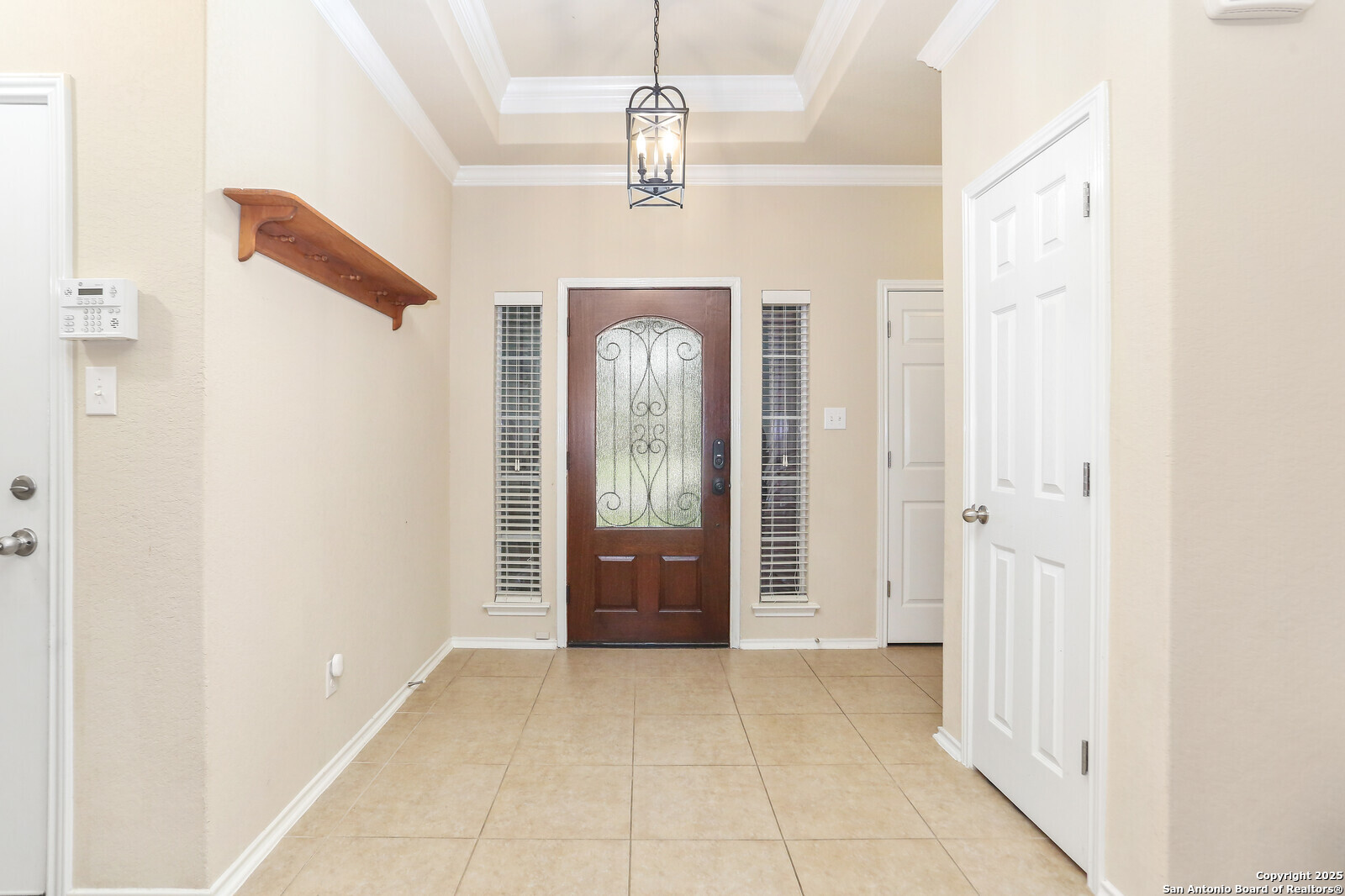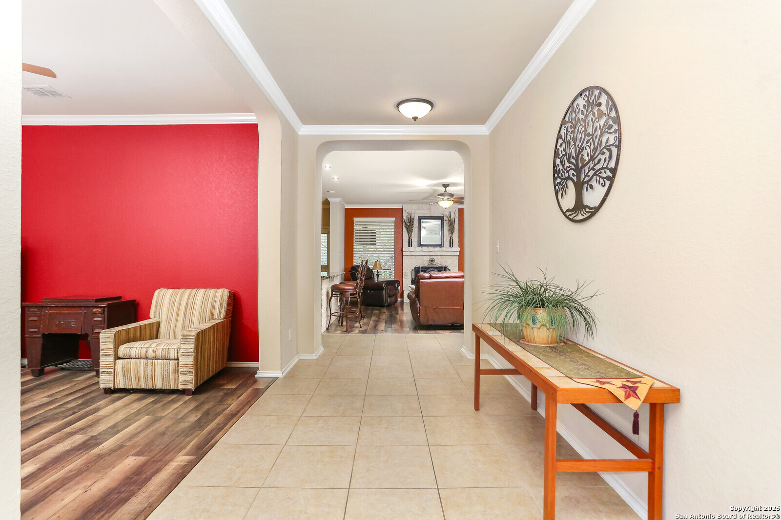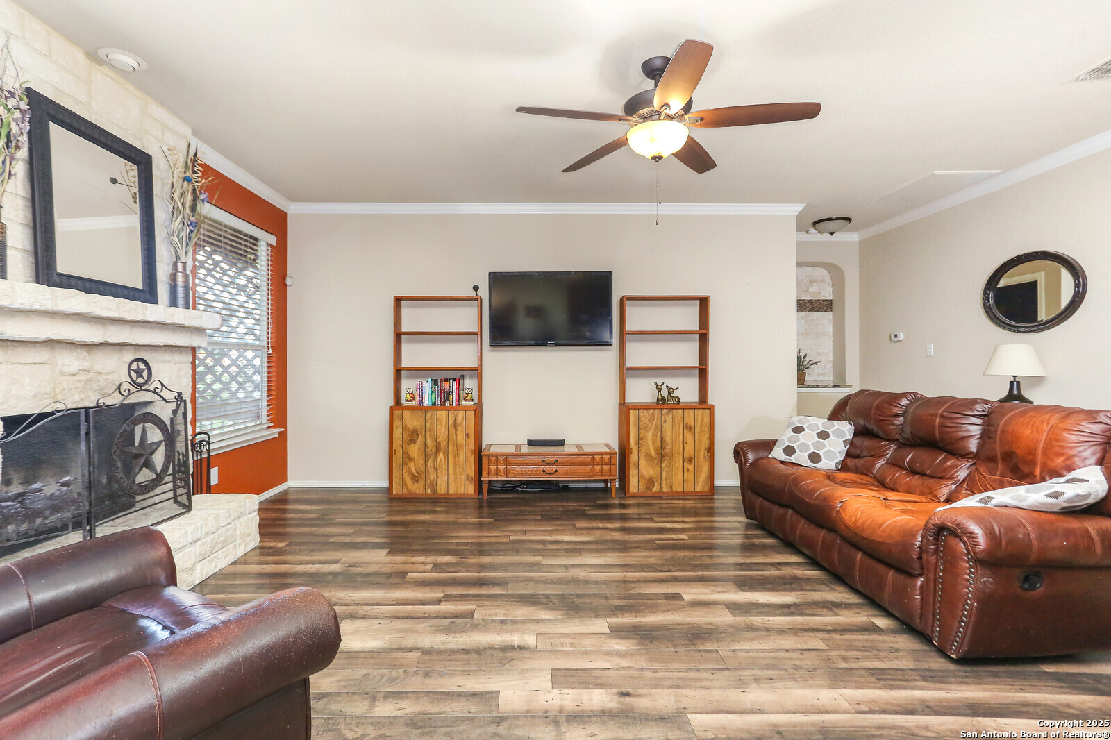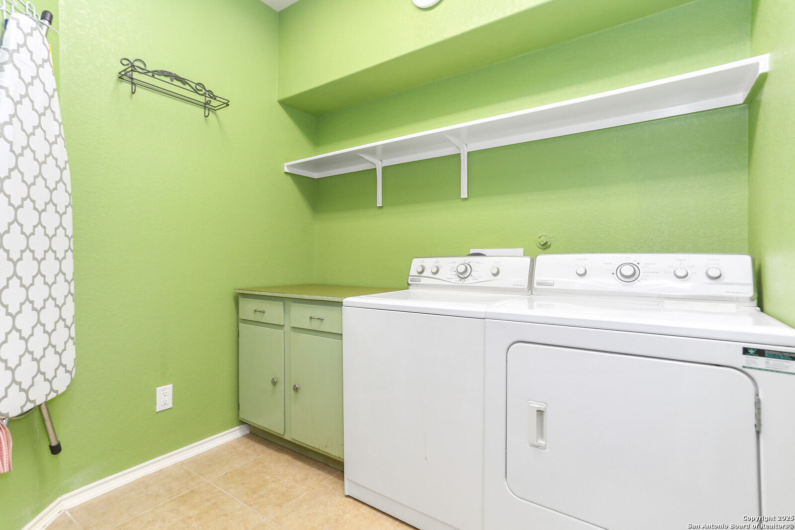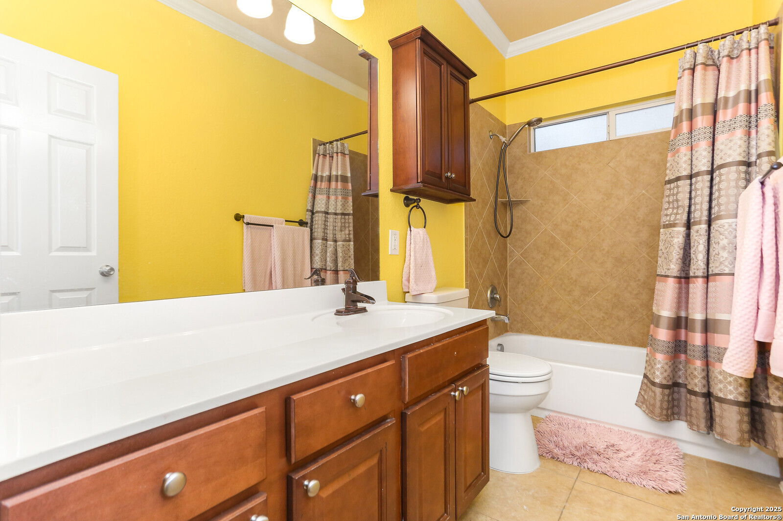Welcome to this beautifully maintained single-story home offering the perfect blend of functionality, comfort, and style. Featuring 3 spacious bedrooms plus a versatile flex room, this home easily adapts to your needs-whether you're looking for a 4th bedroom, home office, playroom, or creative space. Upon entry, you'll find two well-sized bedrooms and a full bathroom, along with convenient storage including a coat closet and a front-facing laundry room. The open-concept kitchen and living area are ideal for hosting and everyday family life. The kitchen is a true highlight, boasting granite countertops, a gas cooktop, large island with bar seating, and a walk-in pantry. A formal dining room and separate breakfast nook offer flexibility in how you use your living space-entertain guests or convert the formal dining into a study or lounge. Large windows flood the living room with natural light, enhancing the airy and welcoming feel. Retreat to the private primary suite tucked at the rear of the home, complete with elegant tray ceilings and a charming bay window. The spa-like primary bath includes an oversized walk-in shower, dual vanities, a linen closet, and an expansive walk-in closet designed to accommodate your full wardrobe and more. Step outside to your personal oasis: an extended patio perfect for summer gatherings, a lush green lawn, a storage shed, and no rear neighbors thanks to the serene greenbelt lot-offering added privacy and a tranquil view. The neighborhood offers an incredible lifestyle with two swimming pools, basketball and tennis courts, two playgrounds, walking trails, and a large open green space for outdoor fun. The elementary school is located right within the neighborhood, making daily routines easier than ever. Plus, enjoy close proximity to Lackland AFB, SeaWorld, shopping, dining, and more! Don't miss your chance to own this versatile and well-appointed home in a community that truly has it all. Schedule your showing today!