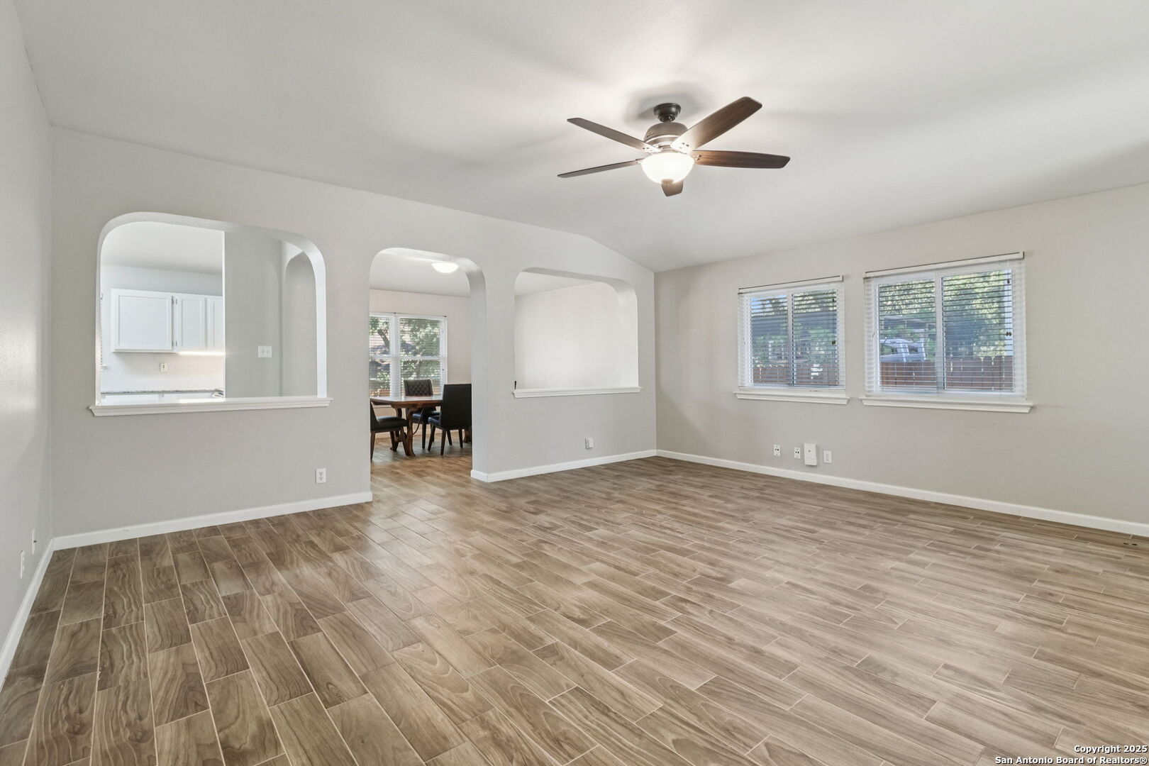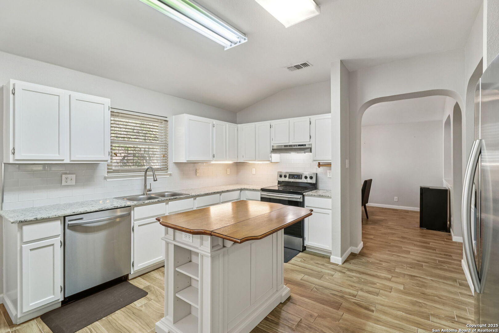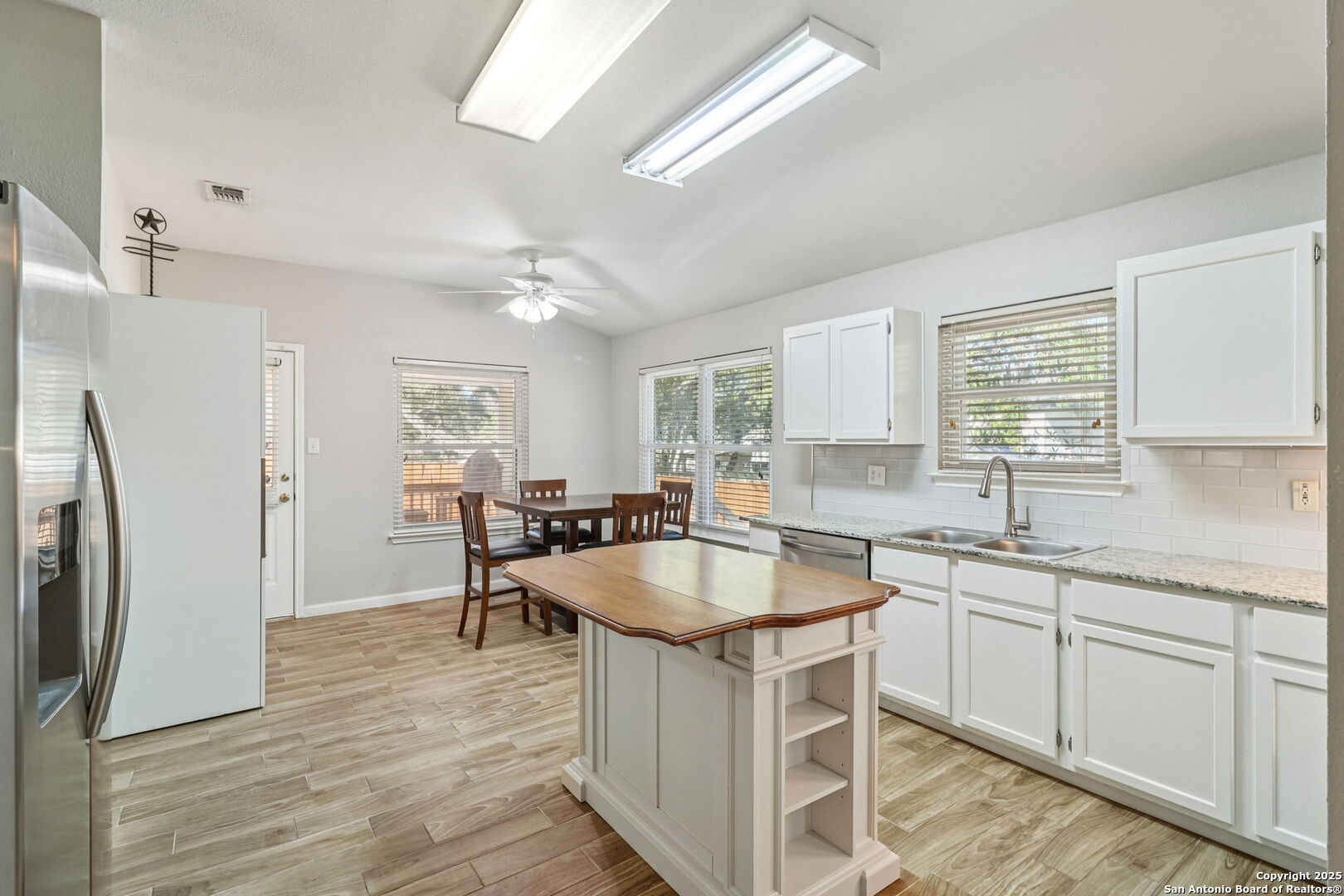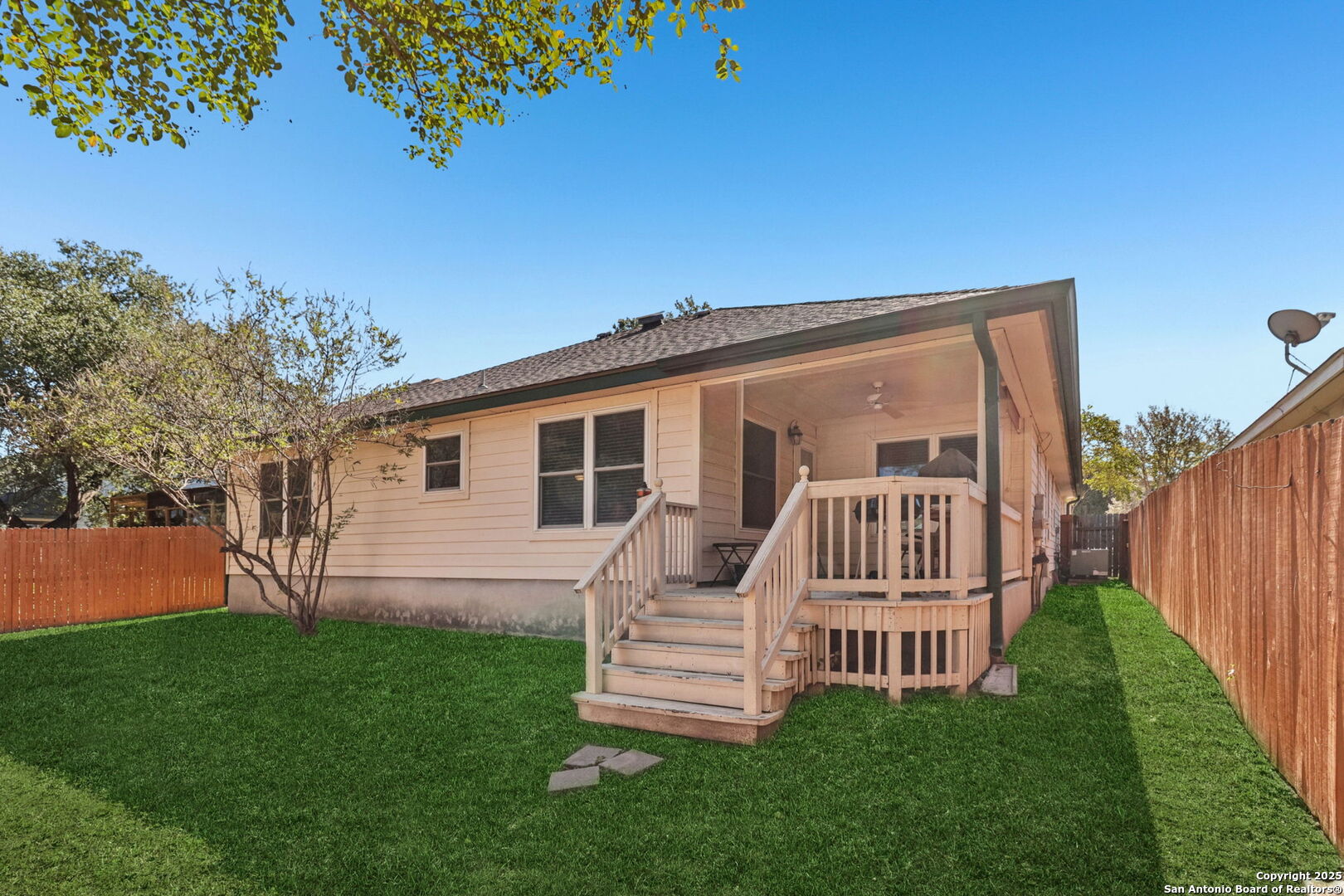 Move-in ready single-story home in the desirable Pheasant Ridge community! This 3-bedroom, 2-bath residence offers 1,948 sq ft of comfortable living space on a well-sized 0.15-acre lot. Built in 1999 and recently updated, the property features a spacious open floor plan with fresh flooring throughout, neutral paint tones, and abundant natural light.The kitchen showcases updated finishes including sleek white cabinetry, granite countertops, subway tile backsplash, and stainless-steel appliances - plus a large island with additional storage and breakfast bar seating. Adjacent dining area overlooks the backyard and opens to the living room for easy entertaining.The private primary suite includes a fully renovated bath with a dual-sink vanity, marble countertop, and an oversized walk-in shower with bench seating and modern tile surround. Secondary bedrooms offer generous closet space and share a well-maintained full bath.Enjoy outdoor living under the covered patio with ceiling fan and space for grilling or relaxing. The fenced backyard provides mature trees and room to customize for gardening or play. Roof shingles were replaced in 2022, offering peace of mind for years to come.Additional highlights include a dedicated laundry room, attached 2-car garage, and energy-efficient double-pane windows. Excellent location within the North East ISD, near Stahl Elementary (~0.4 mi), Harris Middle (~0.7 mi), and Madison High (~0.2 mi). Convenient access to Loop 1604, I-35, and US-281, with shopping at stores including HEB, dining, and parks such as McAllister Park and Friesenhahn Park just minutes away.This home offers the best of single-level living, with thoughtful updates and proximity to everyday amenities. Schedule your private showing today!
