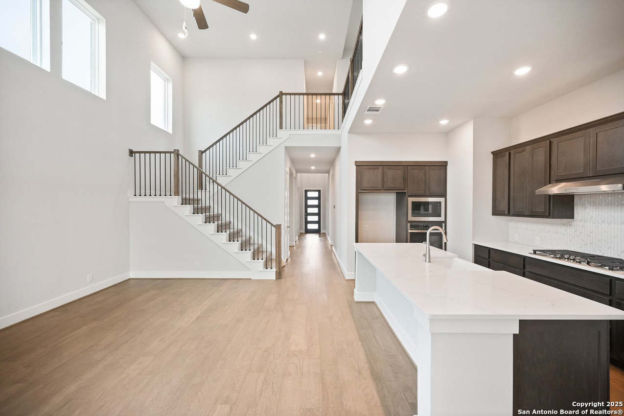 Beautiful Lotus Plan in Homestead with 5 bedrooms and 4.5 baths over 2,858 sq ft. Designer touches include freestanding tub in primary bath, bay window, upgraded outdoor living space with sliding glass doors and gas connection at patio, plus a bedroom suite downstairs. Situated in a master-planned community offering top amenities, energy efficiency, and excellent proximity to I-35, JBSA, shopping, and dining.