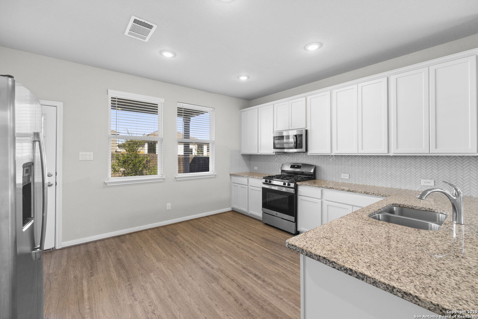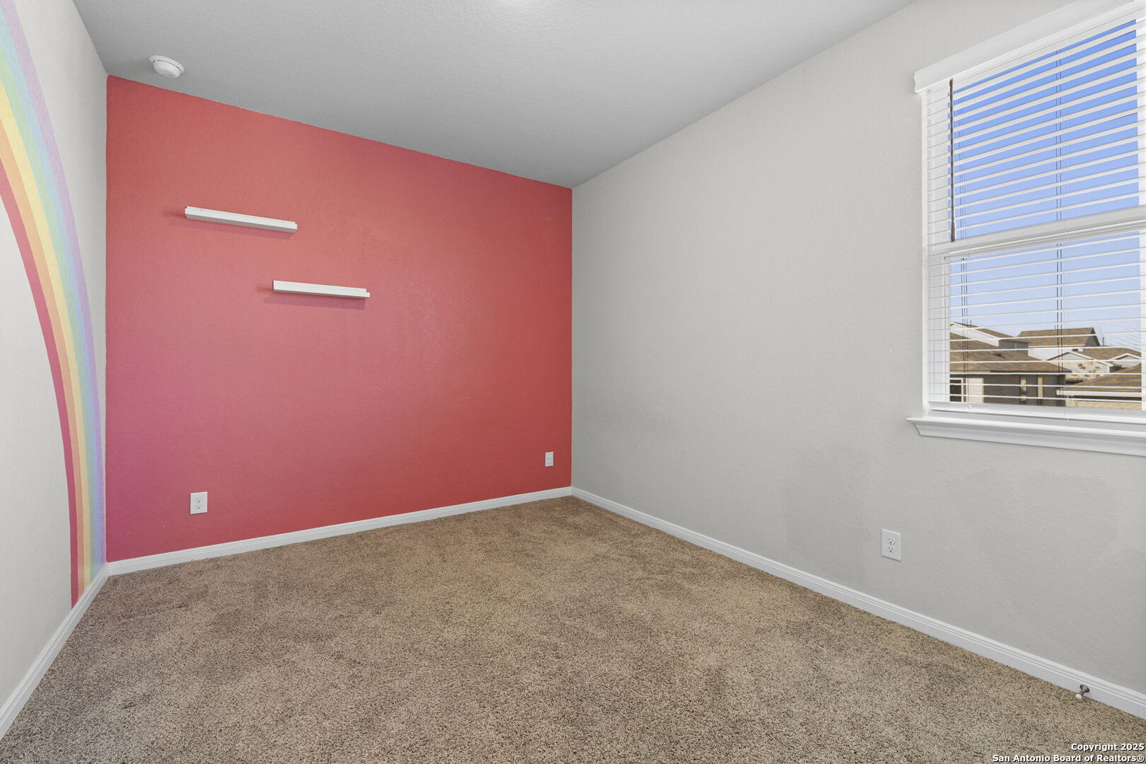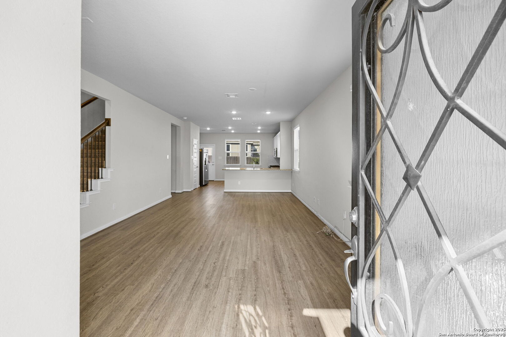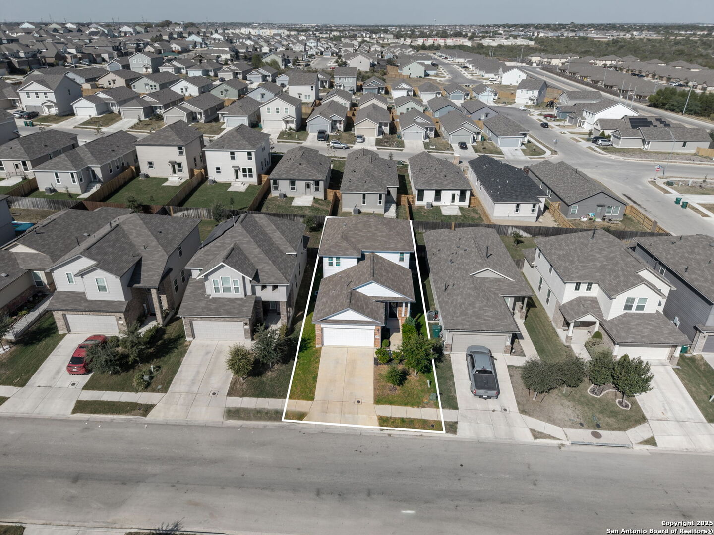 Welcome Home to Comfort, Style, and Convenience! Step into this cozy home featuring high ceilings and sleek laminate flooring throughout the main living areas, creating an open and inviting atmosphere perfect for everyday living and entertaining. The chef-inspired kitchen includes granite countertops, a striking herringbone backsplash, stainless steel appliances, and an extended breakfast bar ideal for casual dining or hosting guests. Retreat to the spacious primary suite offering an oversized shower, dual vanities, and a generous walk-in closet. Upstairs, you'll find versatile flex space and well-appointed secondary bedrooms that offer comfort and privacy for family or guests. Enjoy outdoor living on the covered back patio overlooking a flat, usable backyard great for relaxing or play. Additional upgrades include a garage door opener, water softener, irrigation system, and more! Conveniently located just minutes from Loop 1604, Randolph AFB, shopping, dining, entertainment, downtown San Antonio and community amenities this well-maintained home is ready for YOU! Please have your realtor inquire about a possible VA to VA Assumable Loan with a 2.75 interest rate.