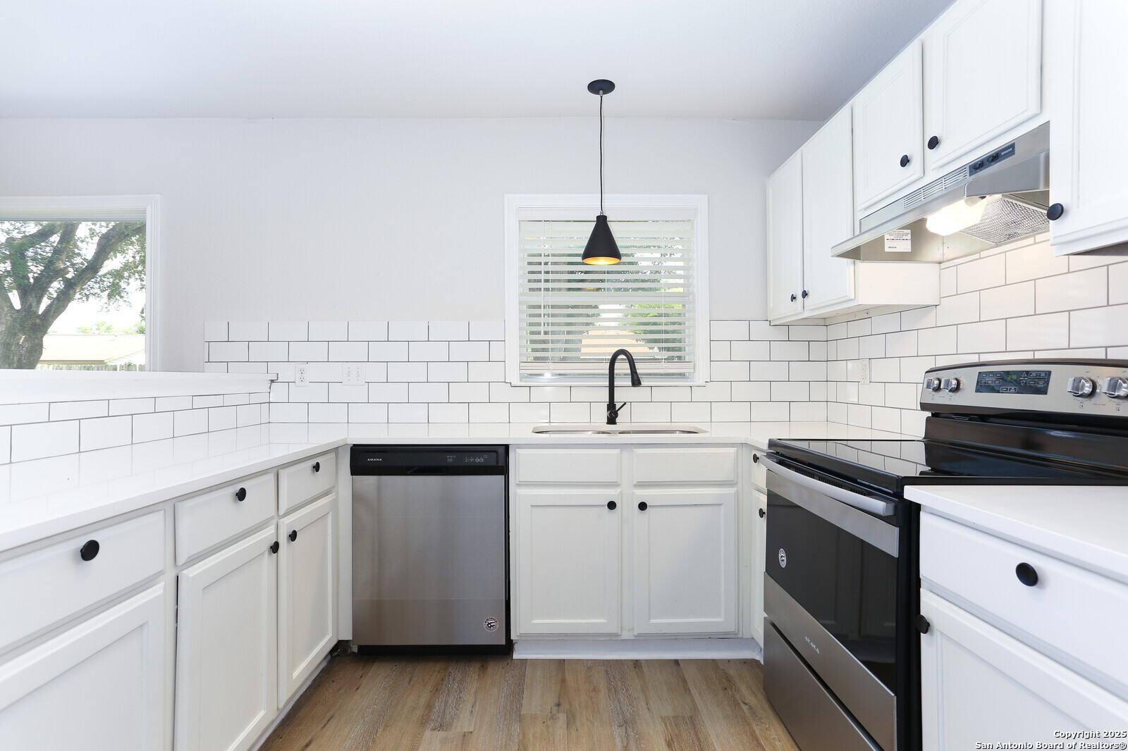 This beautifully updated 3 Bedroom 2 Bath property features vinyl plank flooring throughout no carpet anywhere! The bright, modern kitchen offers fresh white cabinets and countertops, a subway tile backsplash, and a mix of black and stainless steel appliances. Refrigerator included! The kitchen opens to the living and dining area with a convenient breakfast bar, creating an open, inviting space. Large windows and a sliding glass door fill the living room with natural light and provide easy access to the backyard for year-round enjoyment. Both full bathrooms have been tastefully updated, offering a clean and modern feel from top to bottom. Apply today!
