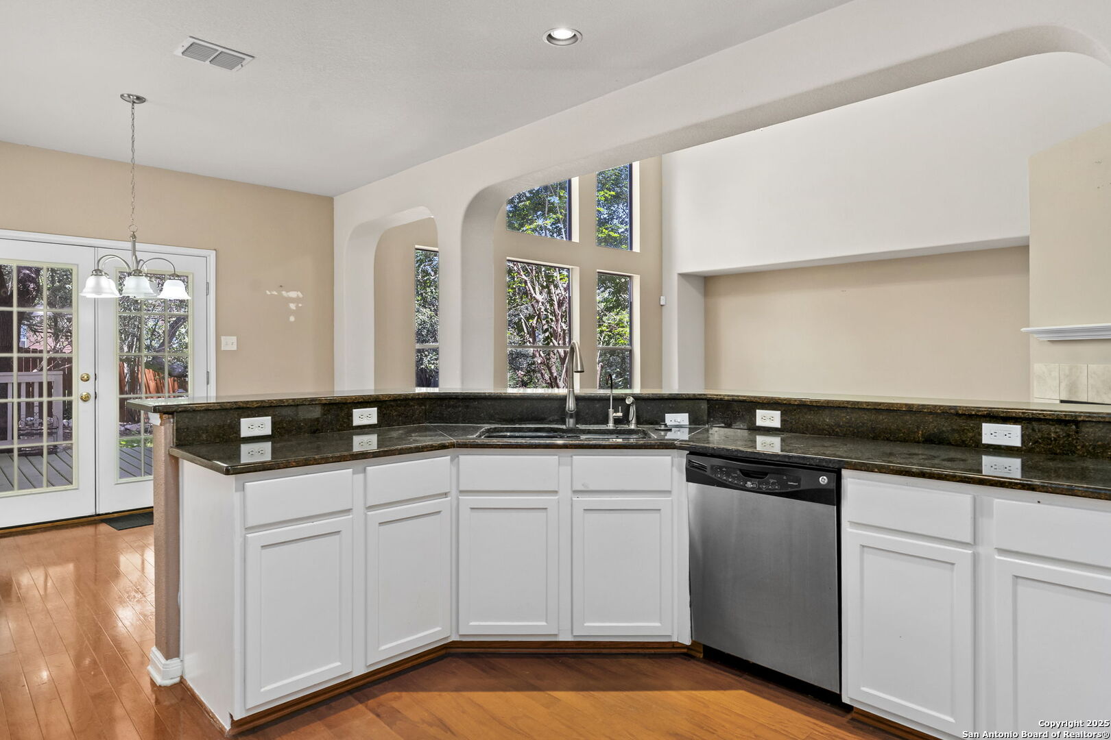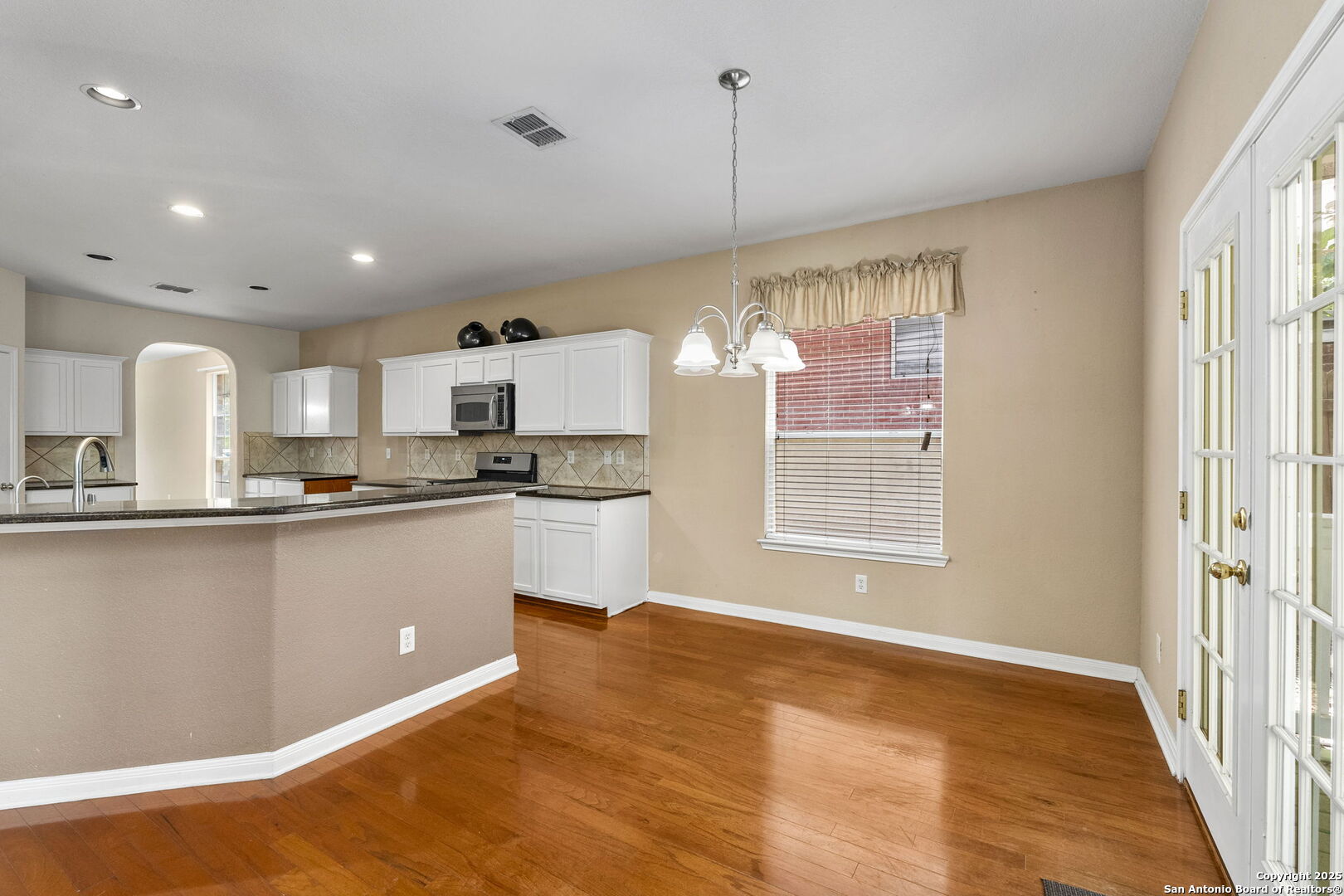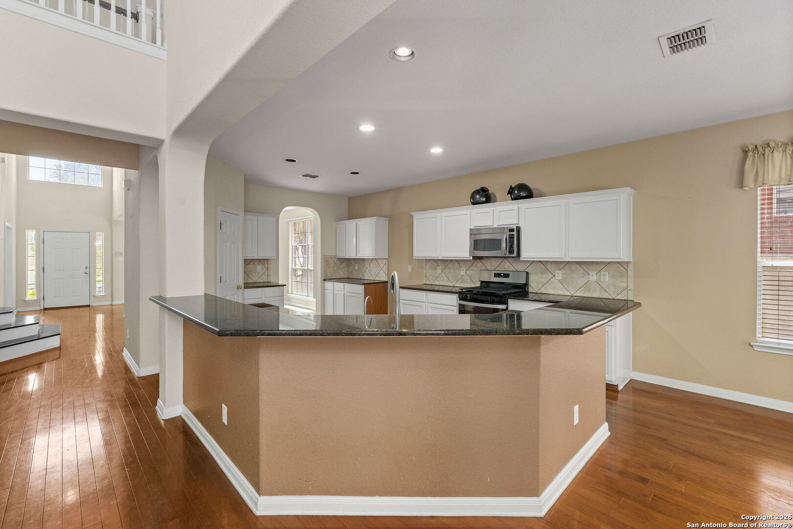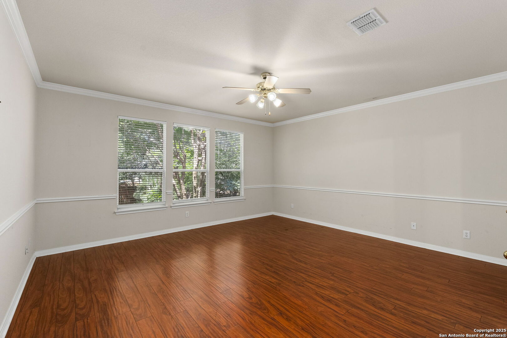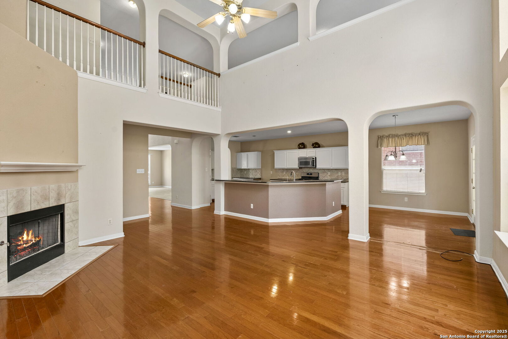 Motivated seller. Welcome home to this architecturally charming two-story gem with soaring vaulted ceilings, built by Legend Homes. Nestled in the privately gated community of The Peak at Promontory in Stone Oak, this home is surrounded by mature trees and features classic three-sided brick masonry. Ideally located just outside Loop 1604 in San Antonio's highly desirable North Side, this property offers excellent long-term investment potential and is just minutes from top-rated NEISD schools, Stone Oak amenities, shopping, dining, and major highways. Step inside and discover a bright, welcoming layout filled with natural light. You're greeted by a dedicated study and elegant formal living and dining spaces, enhanced by graceful arches and windows that bring the outdoors in. A beautifully crafted wood staircase flows into the heart of the home, a spacious, open-concept living area with soaring two-story ceilings, a dramatic wall of windows, and floors that create warmth and sophistication. The inviting living room centers around a cozy corner gas fireplace and offers serene views of the backyard, making it ideal for both relaxing evenings and entertaining guests. The adjoining chef's kitchen is thoughtfully designed with white cabinetry, granite countertops, a diamond-pattern ceramic tile backsplash, and stainless steel appliances, including a gas cooktop, oven, microwave, and dishwasher. A casual dining area, framed by archways, sits just off the kitchen, perfect for everyday meals or morning coffee. Throughout the home, tile, wood, and laminate flooring provide a clean, modern look, completely carpet-free. With five spacious bedrooms, three and a half baths, and versatile living spaces, there's room for everyone. The expansive upstairs game room is ideal for a home gym, media space, or playroom, and the dedicated media room is perfect for movie nights. The primary suite is a peaceful retreat with a spa-inspired bath featuring a walk-in shower, soaking tub, dual vanities, and a generous walk-in closet. Step outside into your own private oasis. The serene backyard offers a covered patio with charming wood accents and views of the lush, mature landscaping. Tall trees provide natural shade and a peaceful ambiance, while a spacious lawn and thoughtfully designed plant beds create the perfect setting for play, gardening, or outdoor entertaining. A stone pathway winds through the yard, adding character and convenience. Conveniently located near Loop 1604, US 281, and IH-10, you'll enjoy quick access to premier destinations like Canyon Springs Golf Club, TPC Parkway, JW Marriott Hill Country Resort, The Rim, La Cantera, and top local parks such as Eisenhower, Phil Hardberger, and McAllister. With nearby access to Camp Bullis and the airport, the location is as practical as it is beautiful. Surrounded by top-tier public and private schools and nestled in a community that feels like a retreat, this home isn't just a place to live; it's a story waiting to unfold.