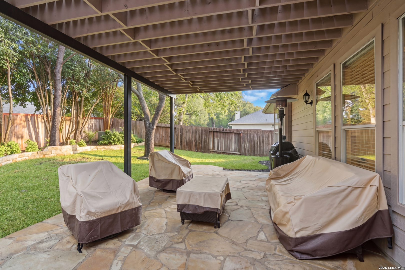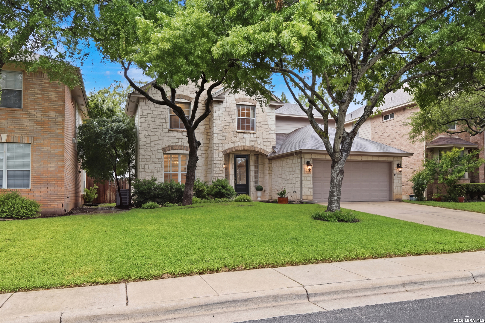 Set beneath mature trees in an established neighborhood, this spacious two-story home offers multiple living areas and a backyard designed for relaxing and entertaining. The main living room features wood flooring and a fireplace and flows into the kitchen with granite countertops, stainless steel appliances, abundant cabinetry, center island with bar seating, and a bright breakfast area overlooking the backyard. A formal dining space provides additional room for gatherings. The primary suite includes dual vanities, a soaking tub, separate shower, and walk-in closet. Upstairs offers additional bedrooms along with a large loft/game room providing flexible space for a second living area, office, or media room. Outside, the backyard features mature trees, a covered patio, and a pergola seating area, creating multiple outdoor spaces to relax or entertain. Conveniently located near Highway 281, Borgfeld Rd, Loop 1604, H-E-B, Bulverde Marketplace, Stone Oak shopping and dining, and JW Marriott Hill Country Recreat