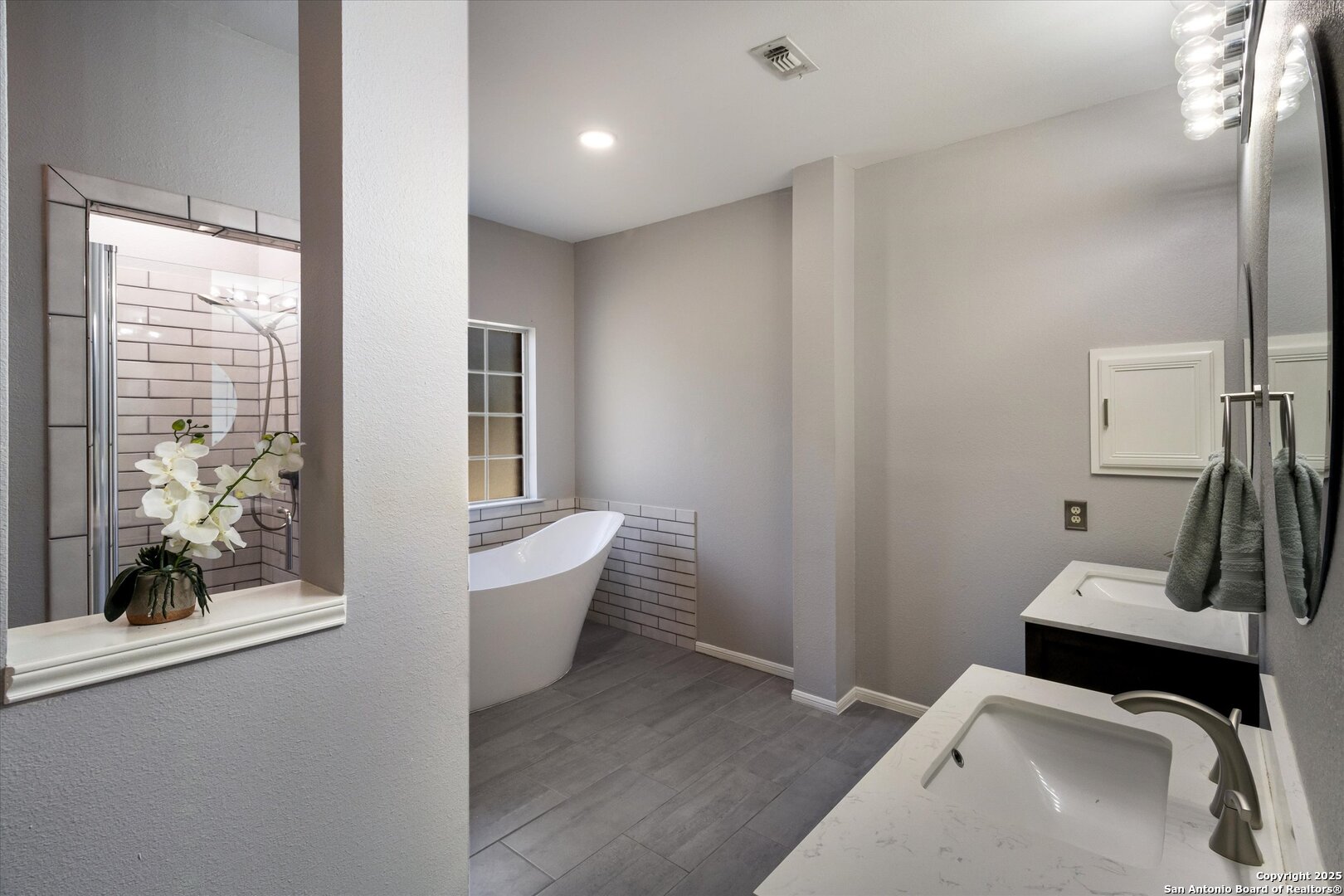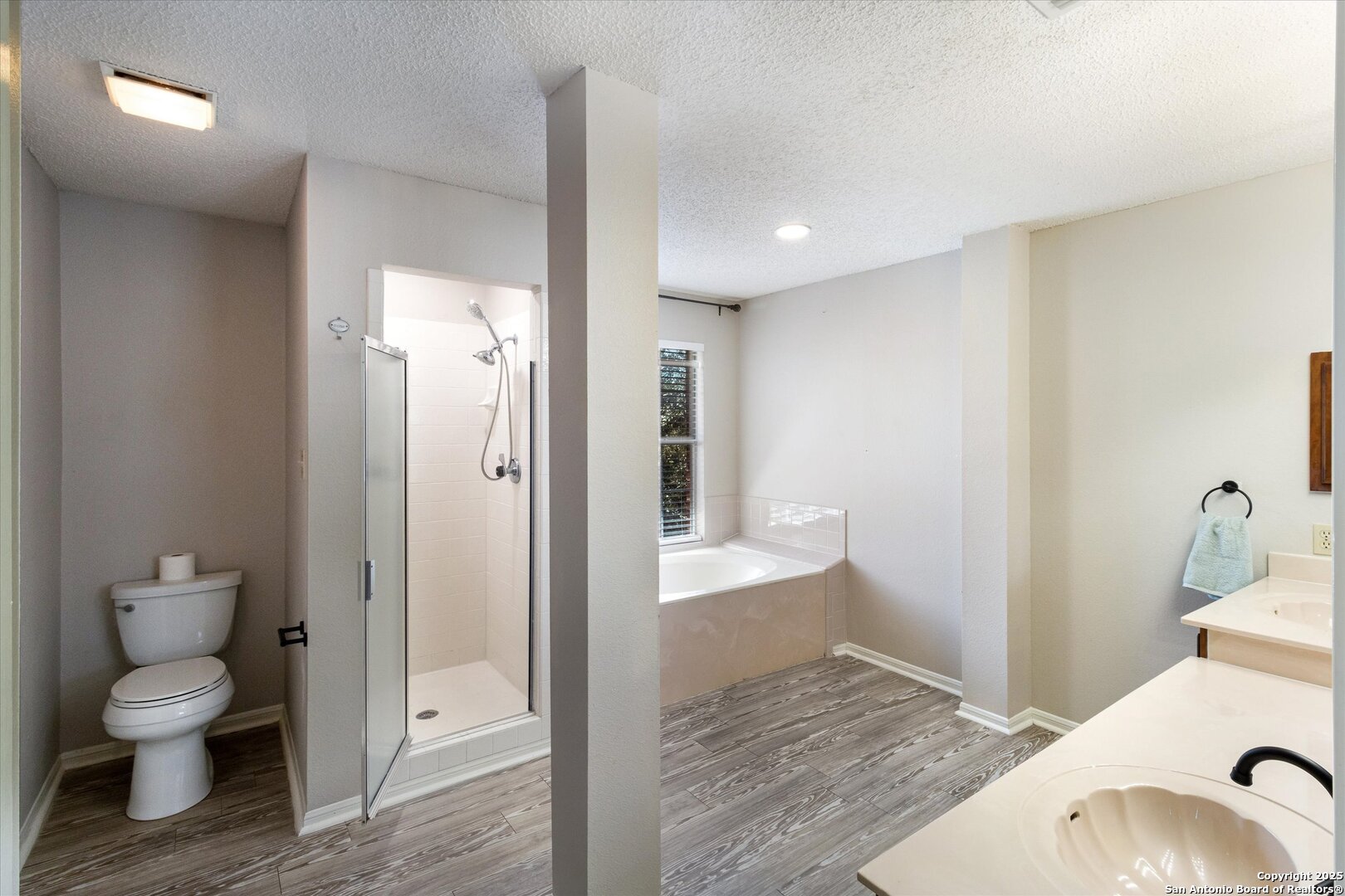 Nestled in the heart of Timberwood Park, this beautifully maintained red brick home offers the ideal combination of privacy, space, and community. Surrounded by mature trees and visited by local wildlife, it provides a peaceful retreat in a neighborhood celebrated for its scenic beauty and strong community spirit. Spanning over 4,822 square feet of living space, this residence is designed for both comfort and versatility. Step down into a spacious sunken family and dining room, perfect for entertaining or relaxing in style. The home features two oversized primary suites-one on each level-along with a third mini-suite on the first floor, offering exceptional flexibility for multi-generational living or guest accommodations. Thoughtfully designed with multiple split levels, this home includes a gentle step-down into the main living and dining area and another into the kitchen and breakfast nook. The kitchen boasts modern, updated appliances, while the first-floor primary suite features a luxurious, spa-inspired bathroom designed for ultimate relaxation.