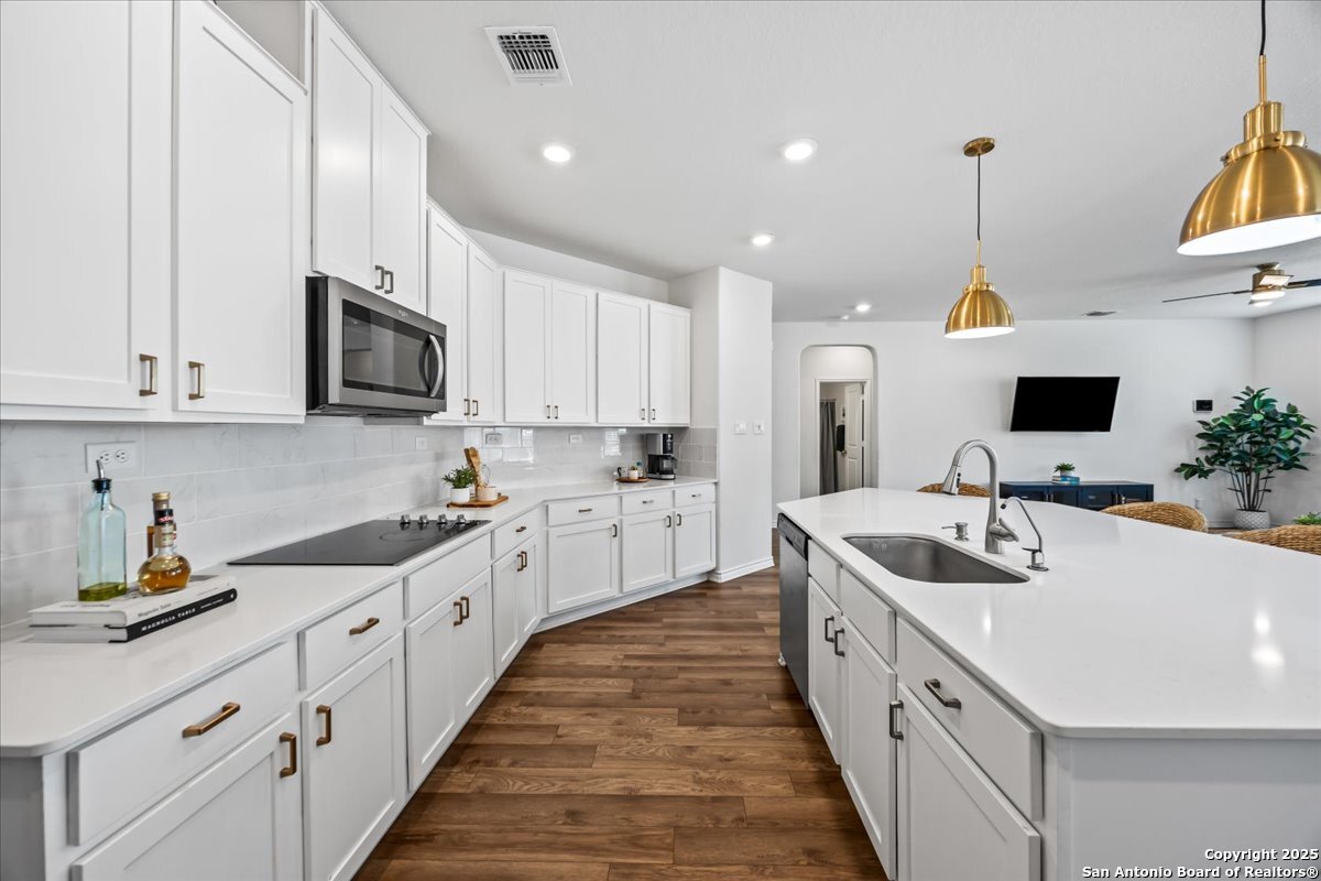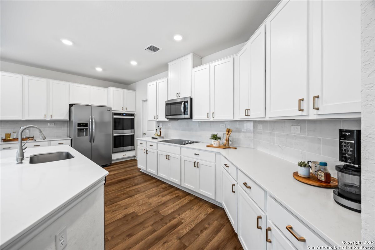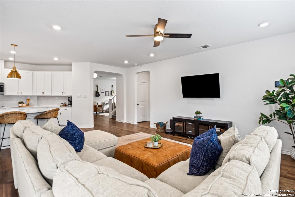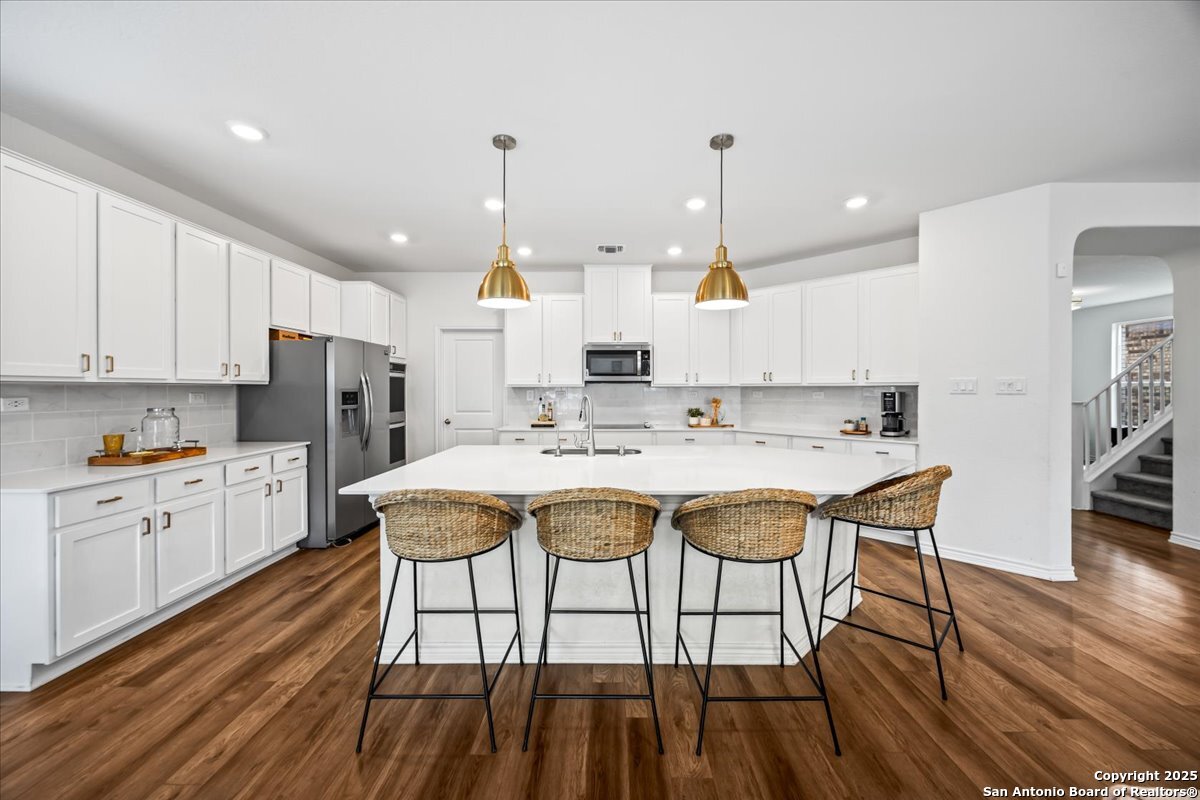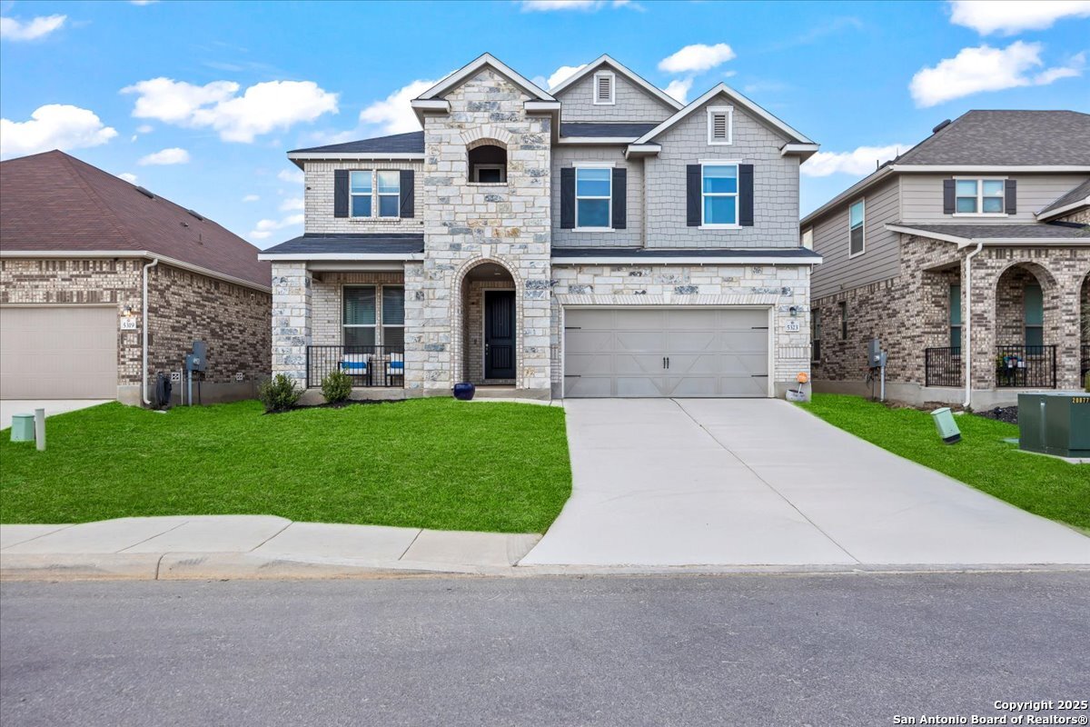 The one you've been waiting for! This stunning home shows better than a model and offers an ideal blend of luxury, comfort, and thoughtful design. The wide open floor plan provides plenty of space for everyone, perfect for both everyday living and entertaining. The designer kitchen features quartz countertops, large subway tile backsplash, stainless steel appliances, double ovens, and champagne gold hardware that adds a touch of elegance. A butler's pantry, oversized walk-in pantry (with room for all your Costco and Sam's Club finds), and a Pottery Barn Camryn glass globe linear chandelier complete this show-stopping space. Work from home in style in the designated office with glass French doors, and enjoy two spacious living areas for flexibility and flow. The first-floor bedroom with a full bath is perfect for guests or multigenerational living. Upstairs, the primary suite impresses with a spa-like ensuite bath, dual vanities, and a walk-in shower large enough for two. Additional features include garage ceiling storage, pre-plumbing for a water softener, and smart electrical upgrades-including an outlet in the garage and second-floor exterior for seasonal lights, a master closet outlet for ironing, in-wall cable kits for mounted TVs, and surround sound wiring in the upstairs loft. Truly the prettiest home in the neighborhood-this one has it all!