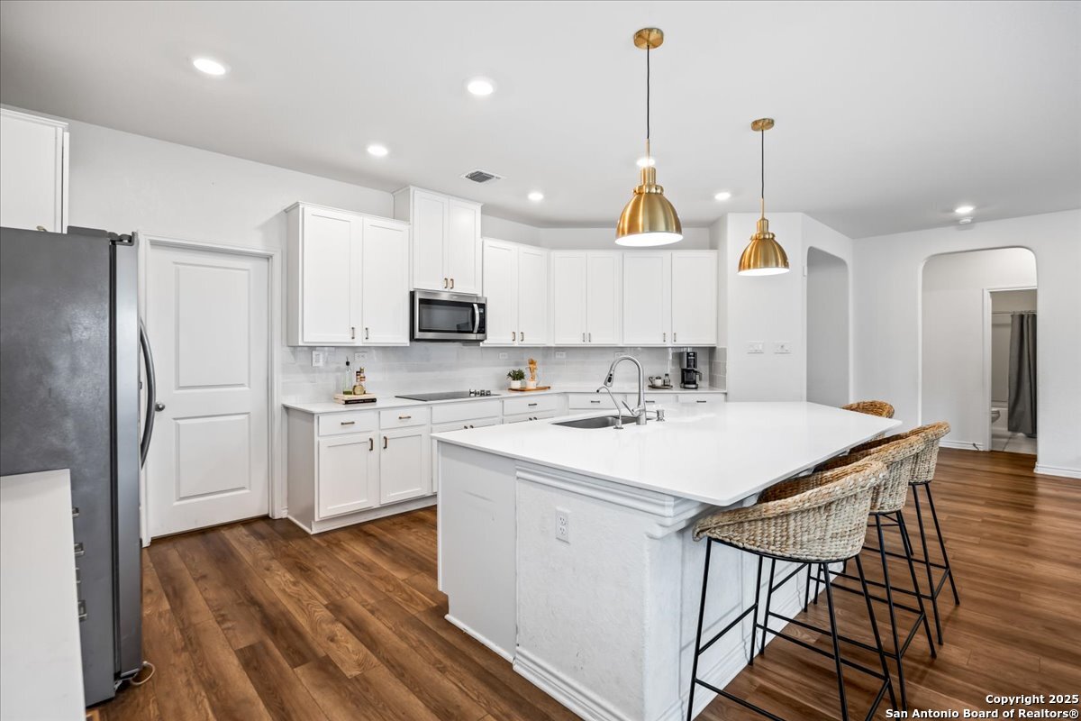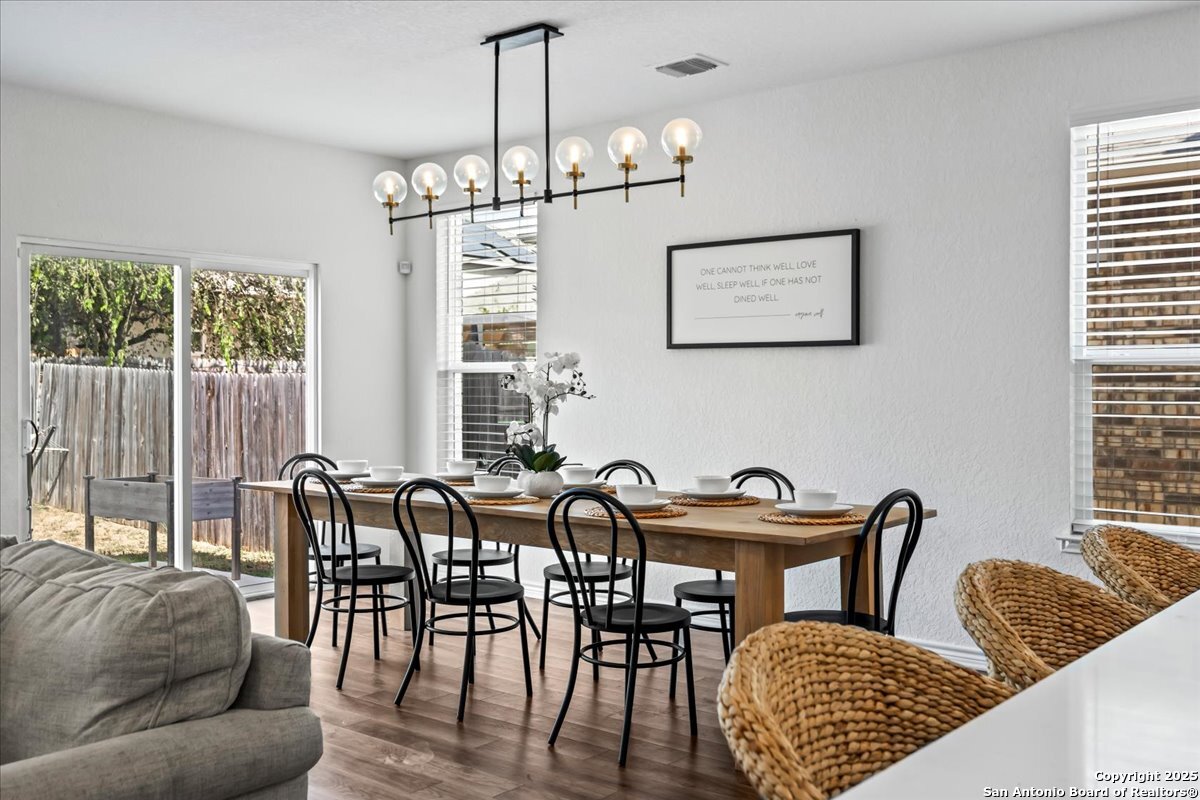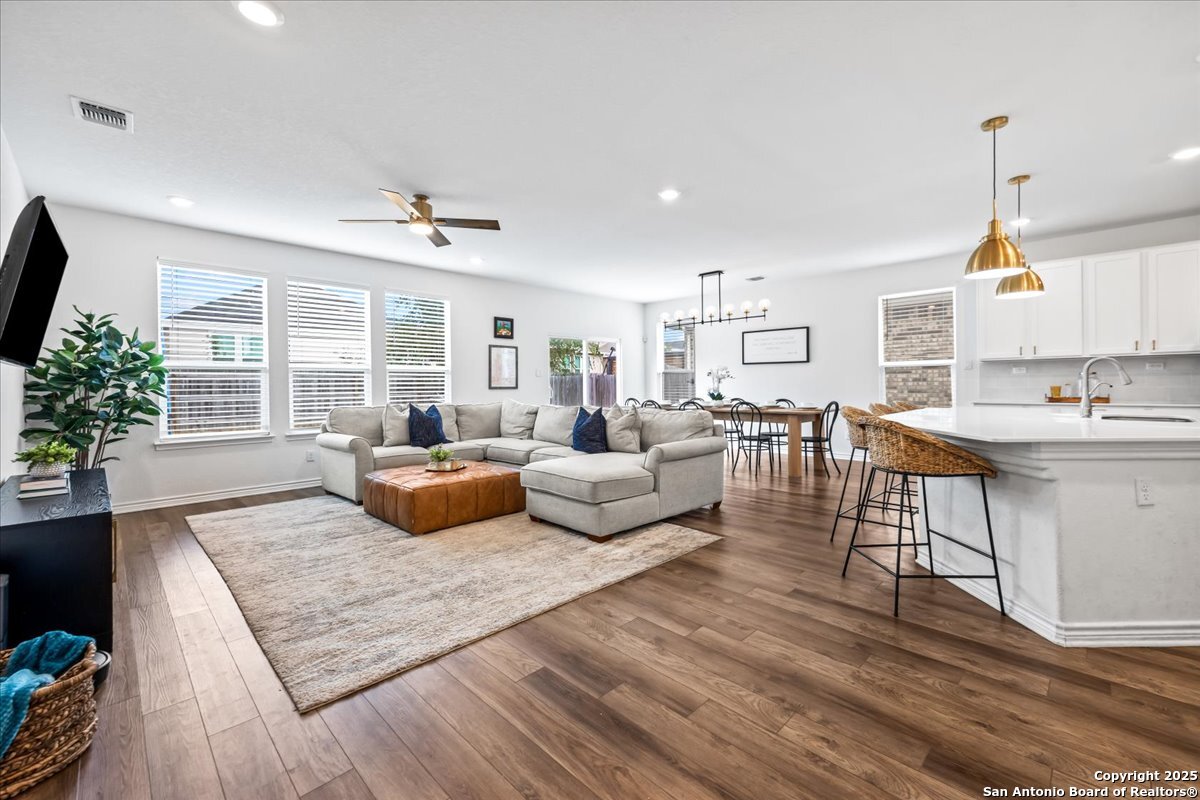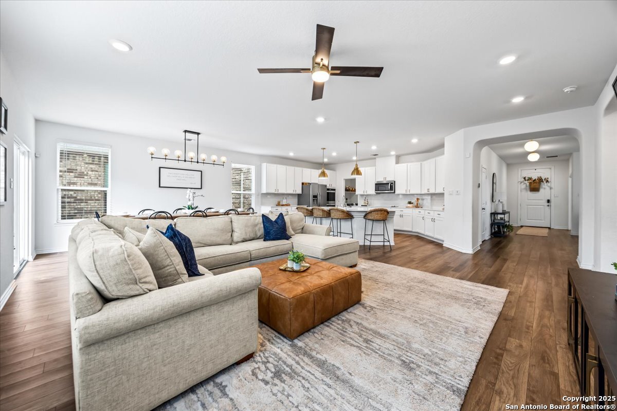 The one you've been waiting for! This stunning home shows better than a model and offers an ideal blend of luxury, comfort, and thoughtful design. The wide open floor plan provides plenty of space for everyone, perfect for both everyday living and entertaining. The designer kitchen features quartz countertops, large subway tile backsplash, stainless steel appliances, double ovens, and champagne gold hardware that adds a touch of elegance. A butler's pantry, oversized walk-in pantry (with room for all your Costco and Sam's Club finds), and a Pottery Barn Camryn glass globe linear chandelier complete this show-stopping space. Work from home in style in the designated office with glass French doors, and enjoy two spacious living areas for flexibility and flow. The first-floor bedroom with a full bath is perfect for guests or multigenerational living. Upstairs, the primary suite impresses with a spa-like ensuite bath, dual vanities, and a walk-in shower large enough for two. Additional features include garage ceiling storage, pre-plumbing for a water softener, and smart electrical upgrades-including an outlet in the garage and second-floor exterior for seasonal lights, a master closet outlet for ironing, in-wall cable kits for mounted TVs, and surround sound wiring in the upstairs loft. Truly the prettiest home in the neighborhood-this one has it all!