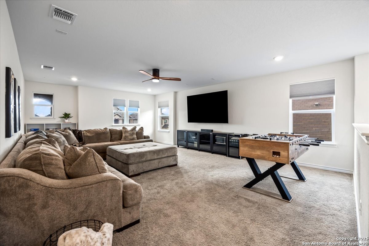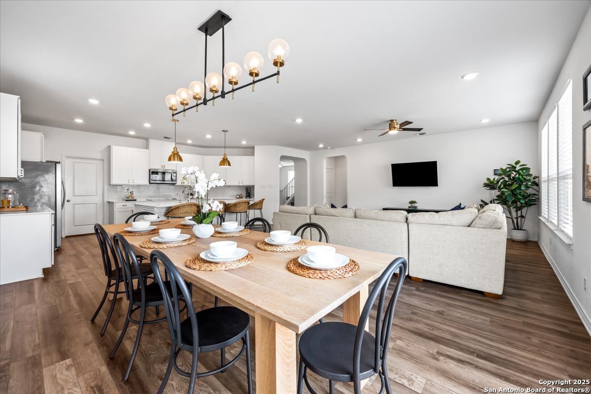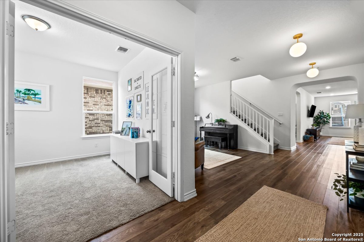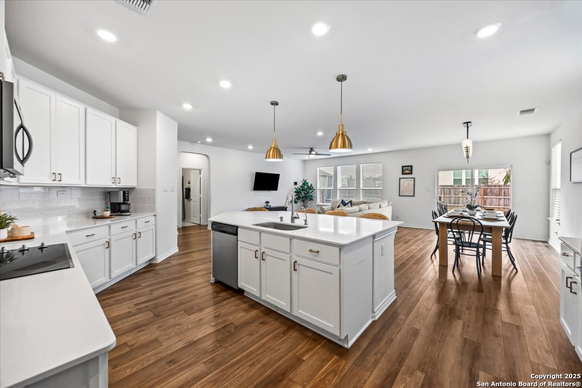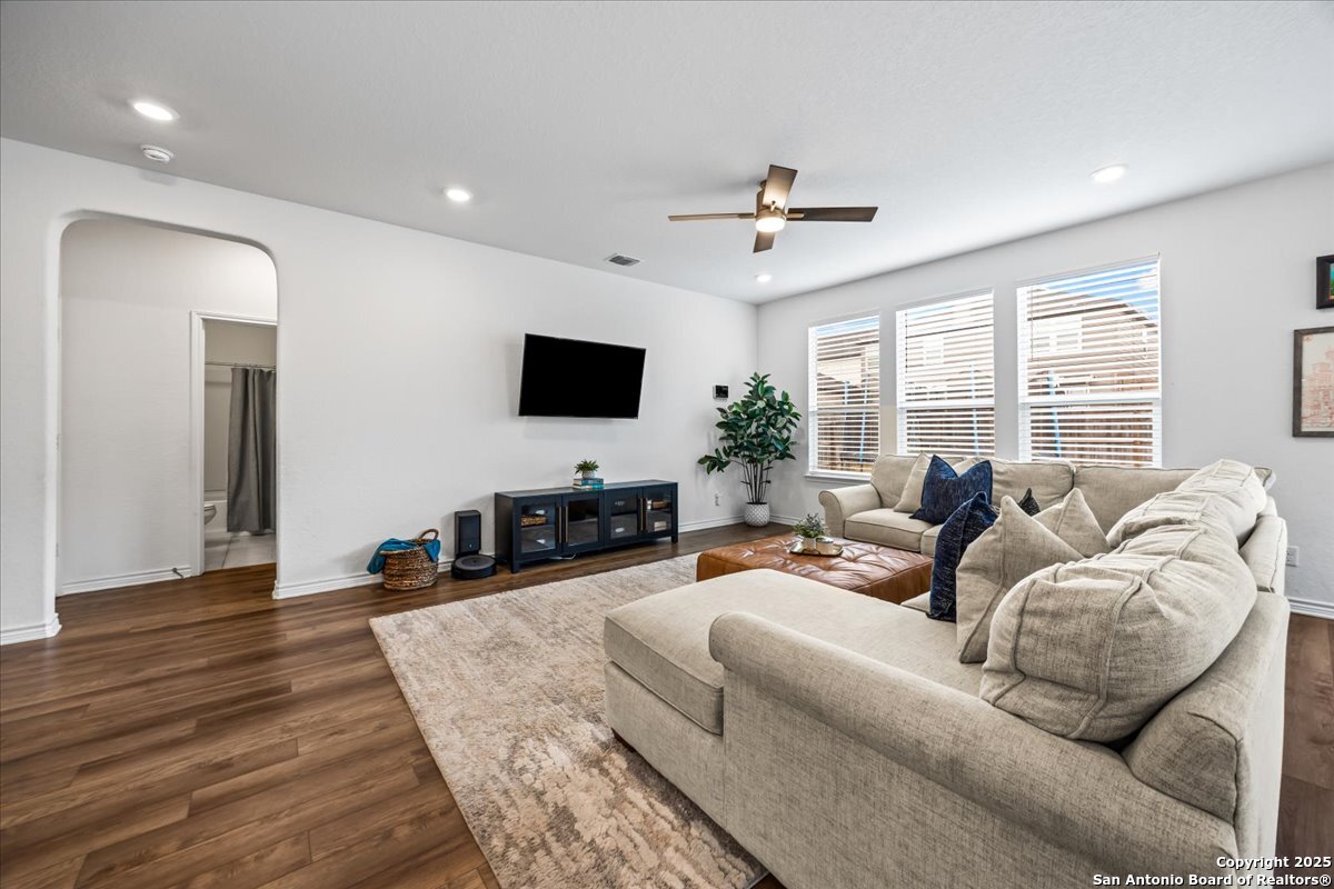 The one you've been waiting for! This stunning home shows better than a model and offers an ideal blend of luxury, comfort, and thoughtful design. The wide open floor plan provides plenty of space for everyone, perfect for both everyday living and entertaining. The designer kitchen features quartz countertops, large subway tile backsplash, stainless steel appliances, double ovens, and champagne gold hardware that adds a touch of elegance. A butler's pantry, oversized walk-in pantry (with room for all your Costco and Sam's Club finds), and a Pottery Barn Camryn glass globe linear chandelier complete this show-stopping space. Work from home in style in the designated office with glass French doors, and enjoy two spacious living areas for flexibility and flow. The first-floor bedroom with a full bath is perfect for guests or multigenerational living. Upstairs, the primary suite impresses with a spa-like ensuite bath, dual vanities, and a walk-in shower large enough for two. Additional features include garage ceiling storage, pre-plumbing for a water softener, and smart electrical upgrades-including an outlet in the garage and second-floor exterior for seasonal lights, a master closet outlet for ironing, in-wall cable kits for mounted TVs, and surround sound wiring in the upstairs loft. Truly the prettiest home in the neighborhood-this one has it all!